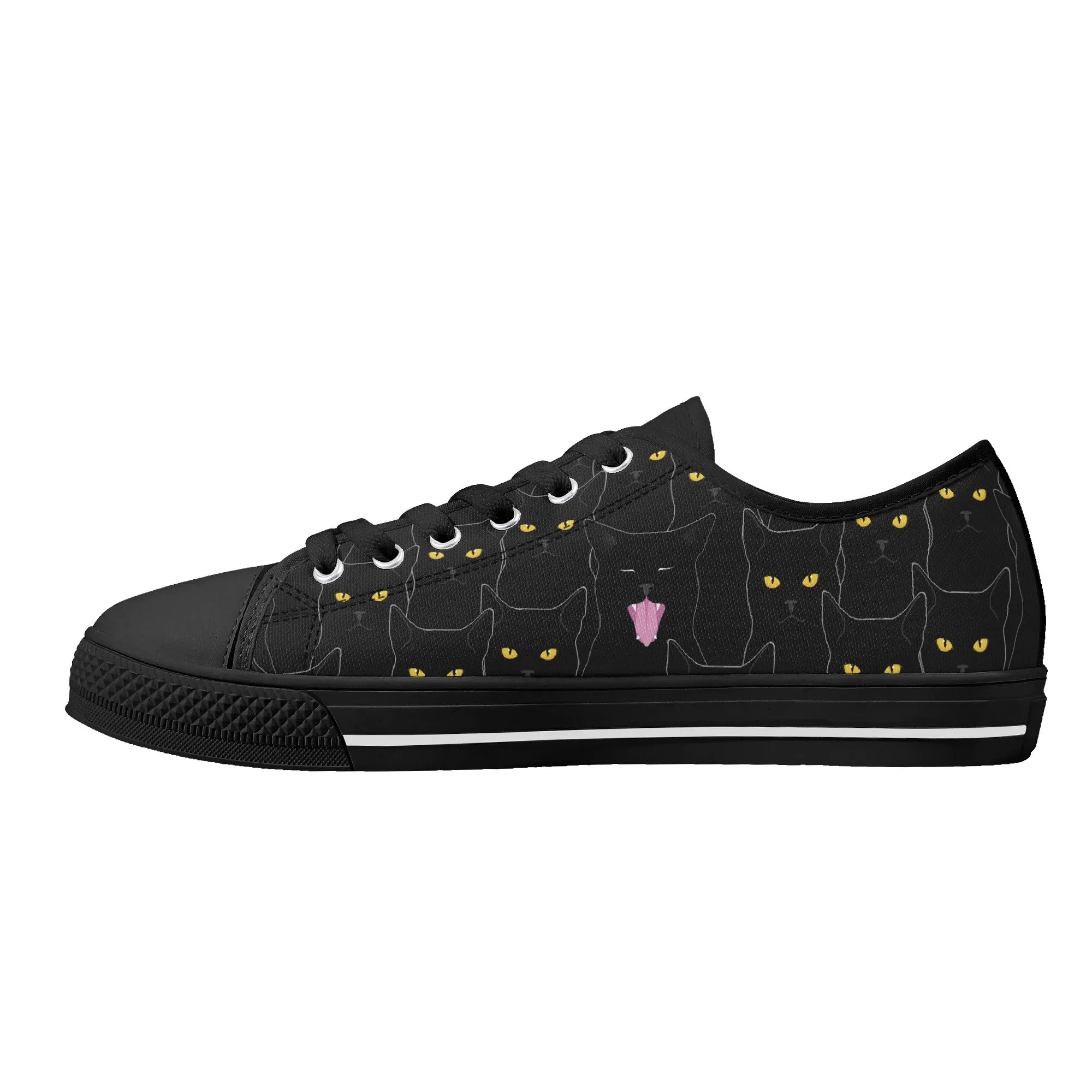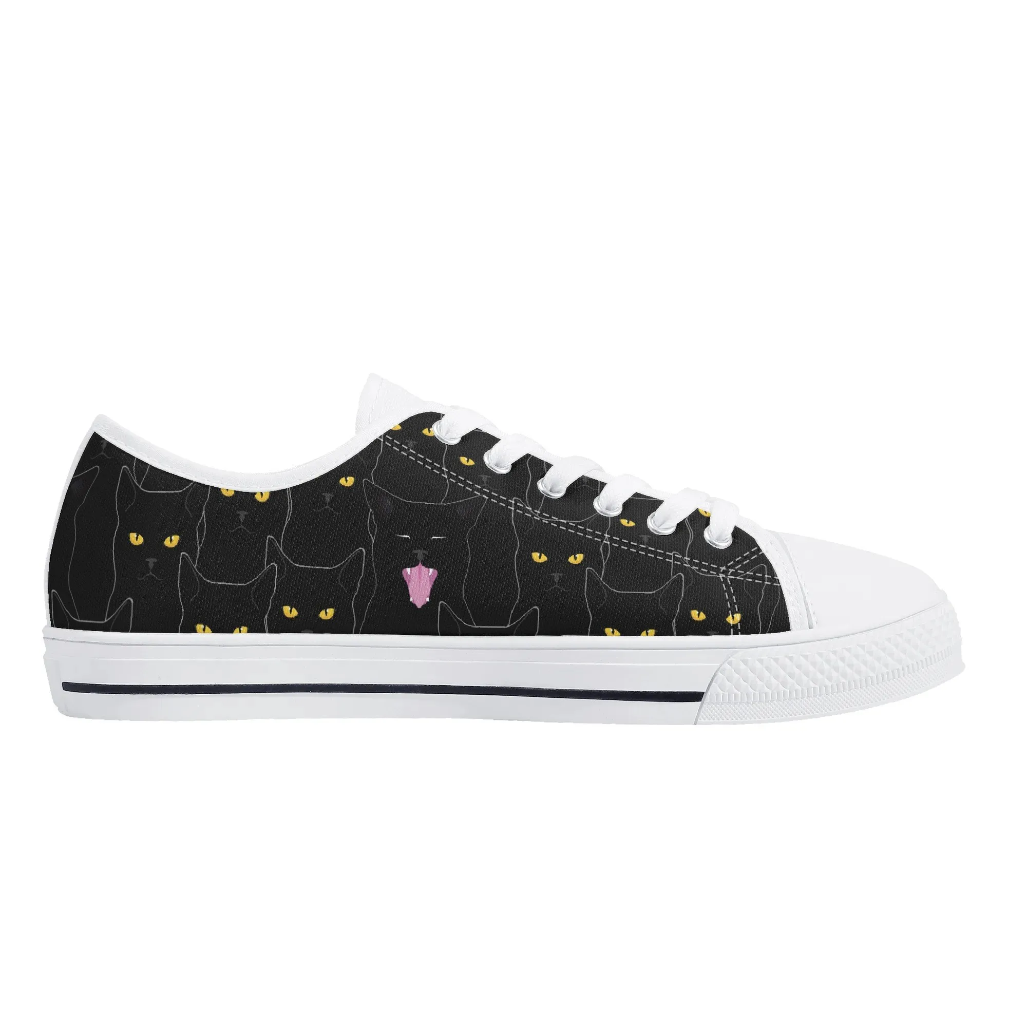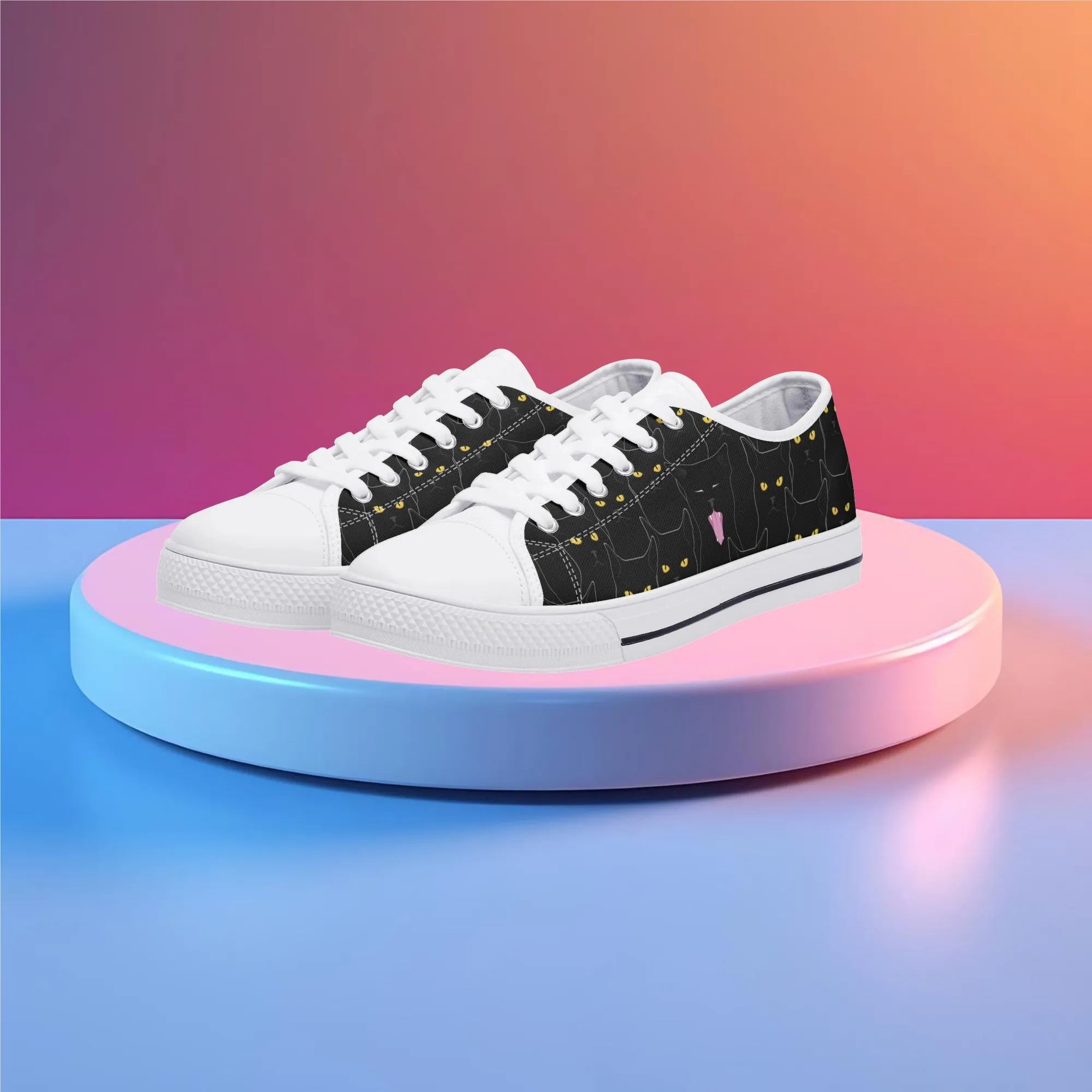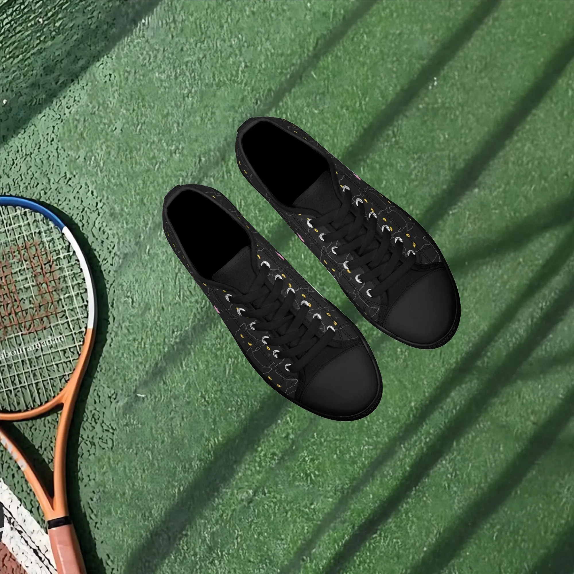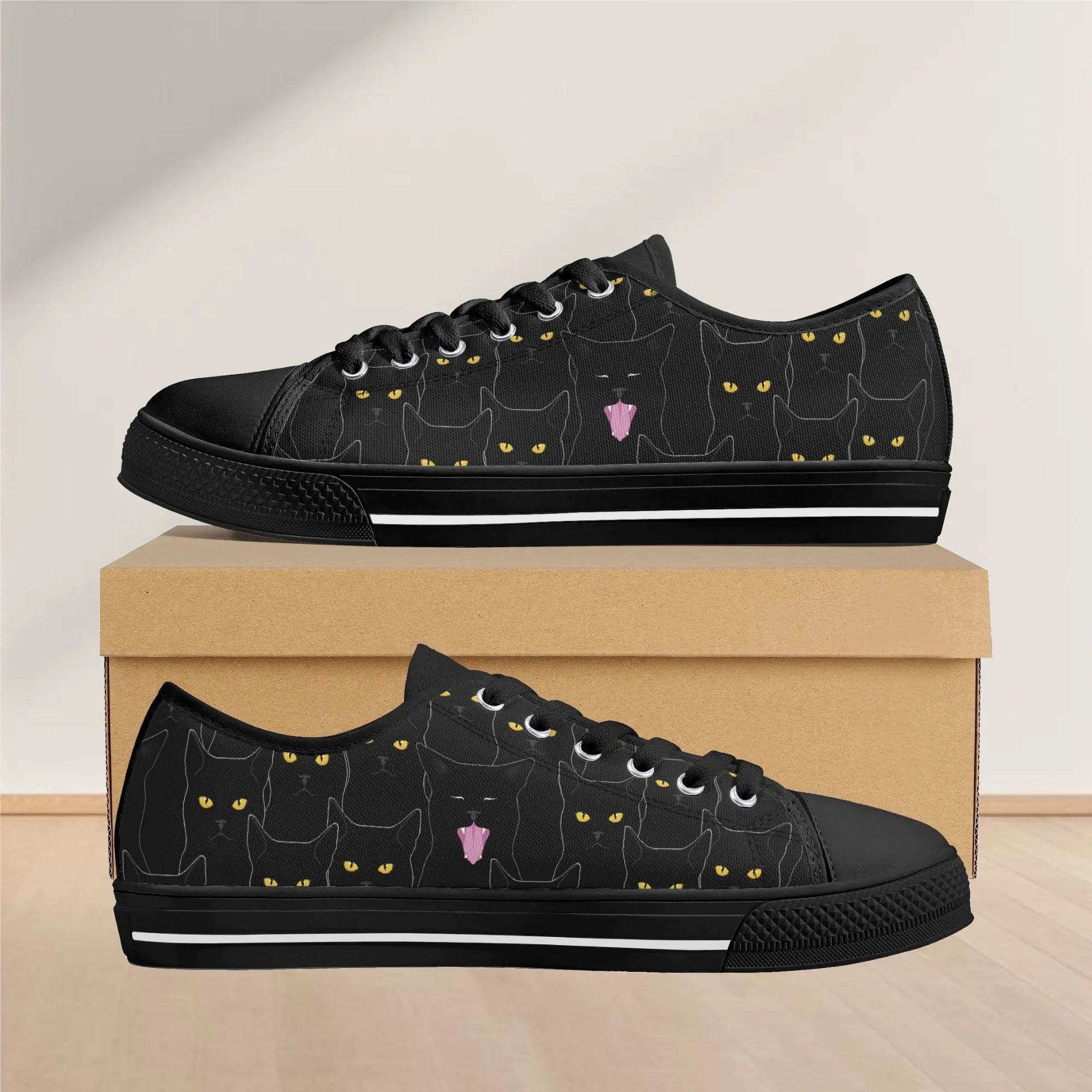 Black Cat Low Top Canvas Sneakers, Spooky Yellow Eyes Shoes for Women, Halloween Trainer, Witchy Pet Lover Gift, Gothic Kitty Footwear