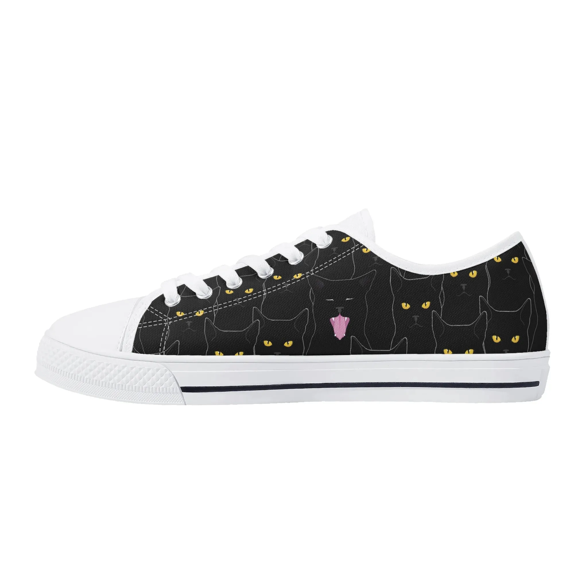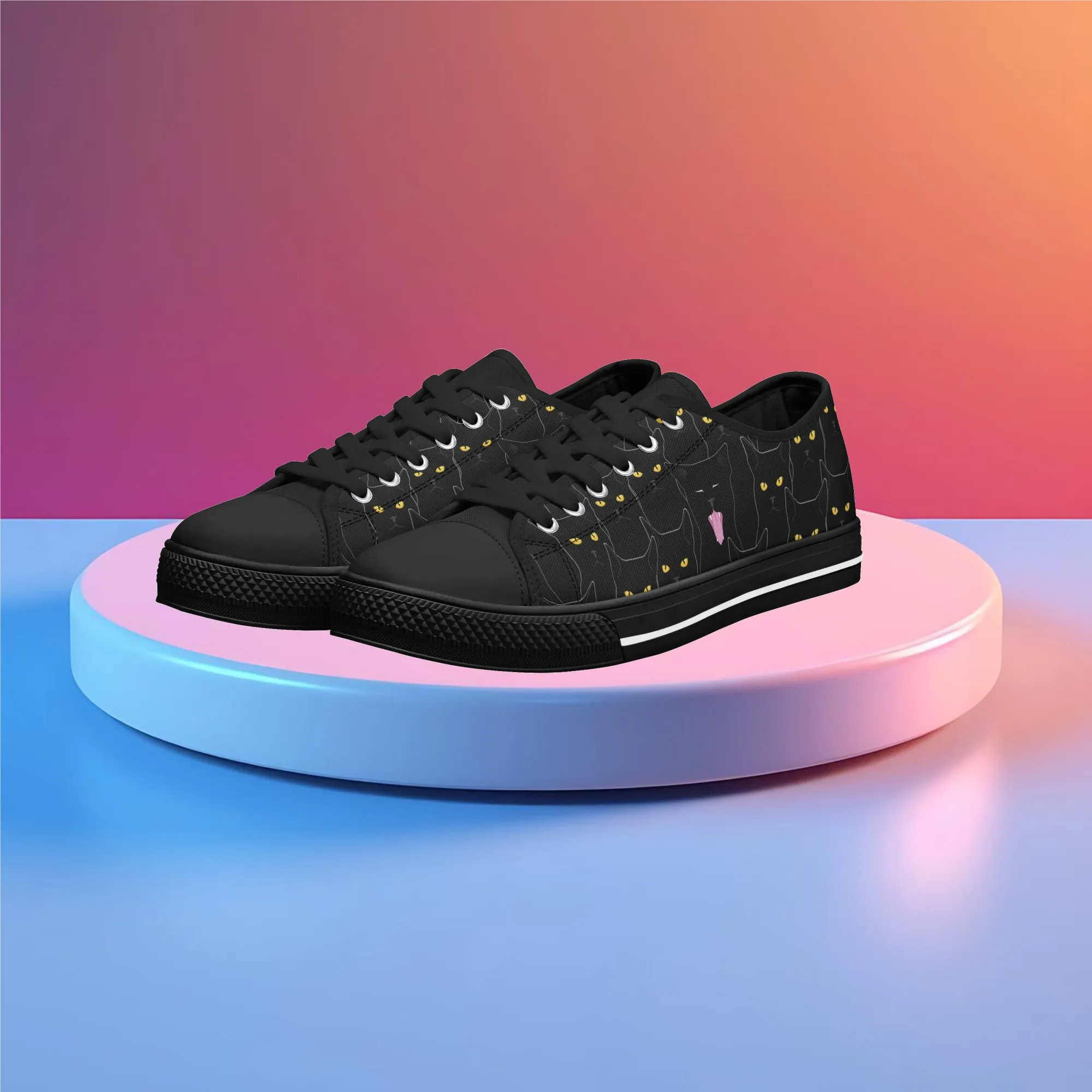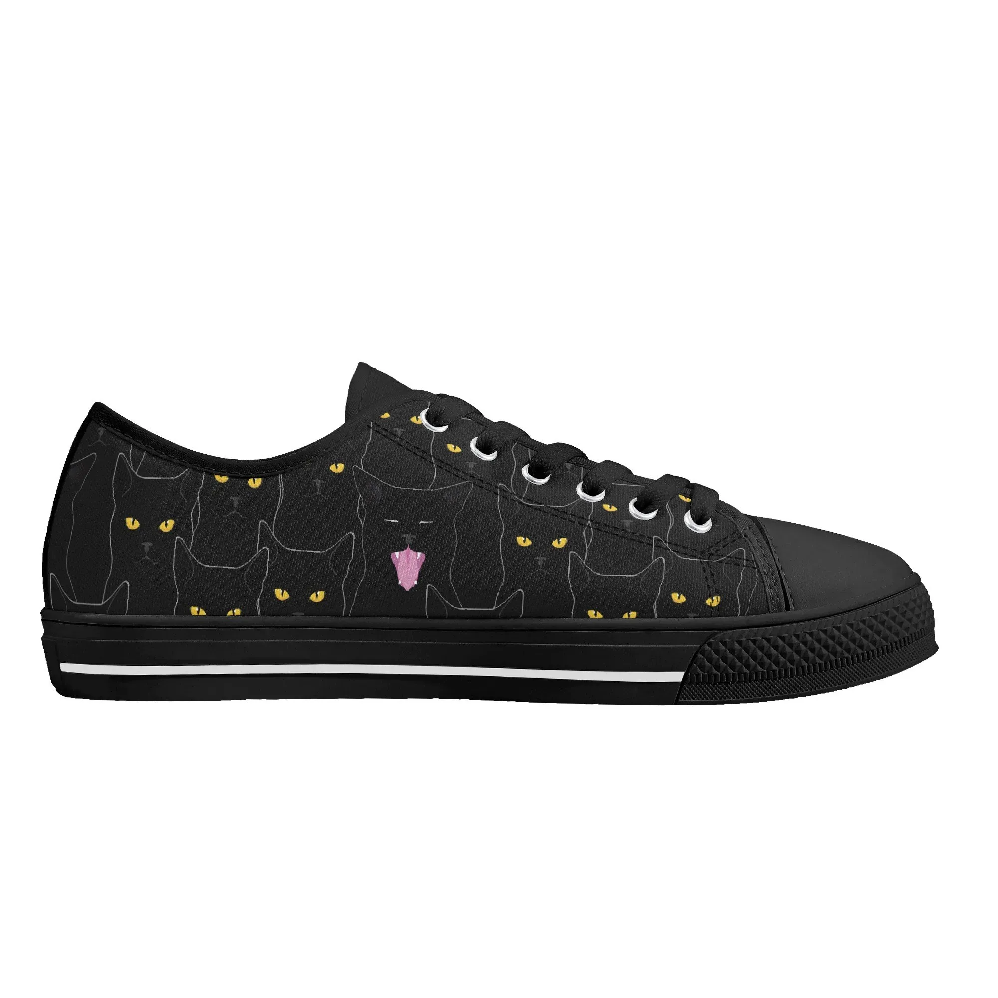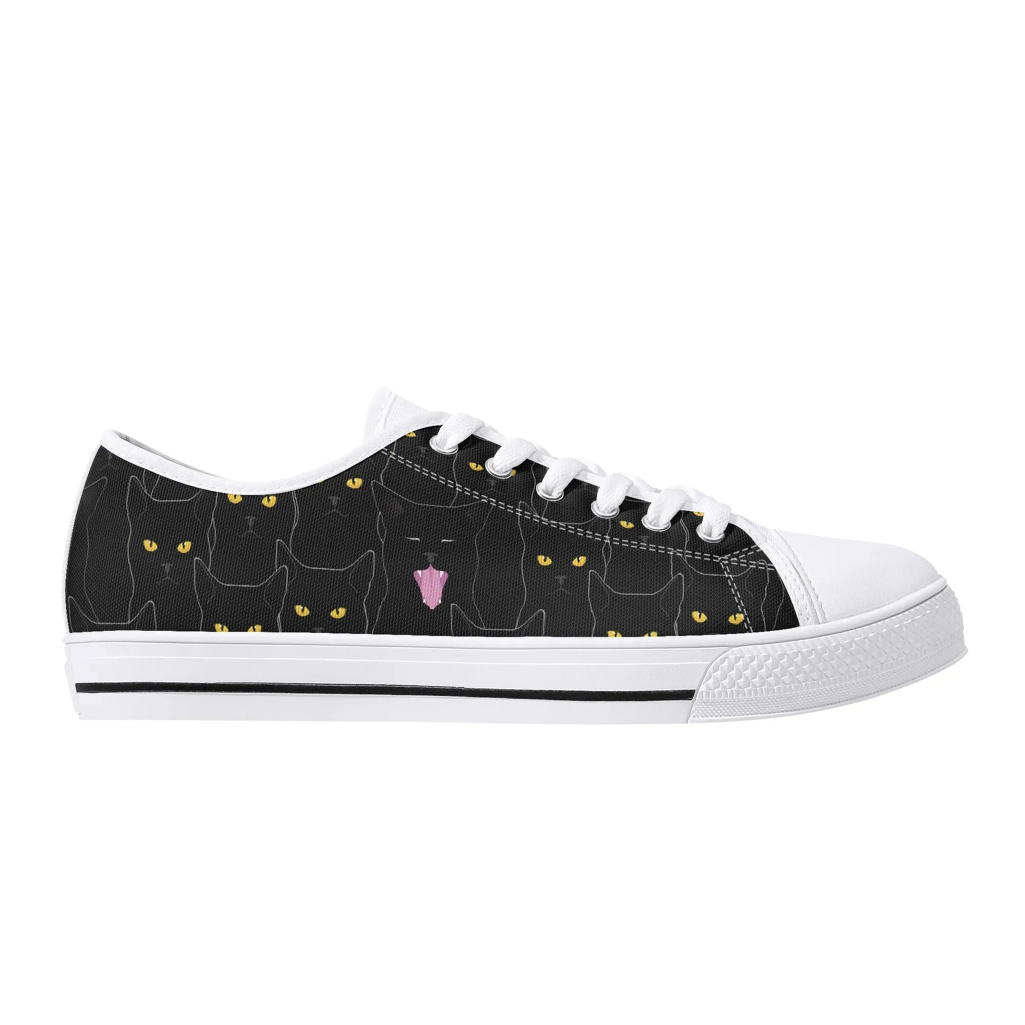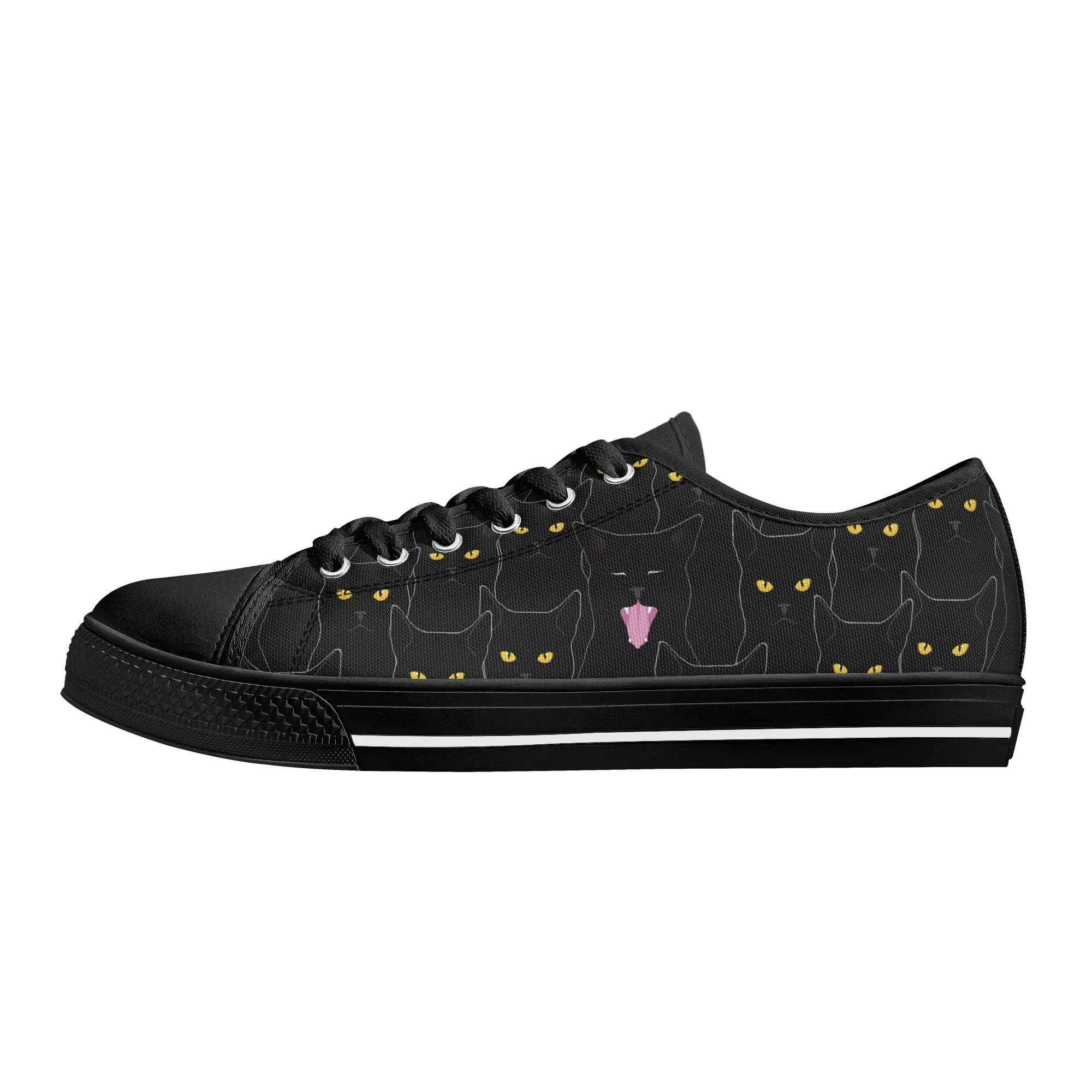 Black Cat Low Top Canvas Sneakers, Spooky Yellow Eyes Shoes for Women, Halloween Trainer, Witchy Pet Lover Gift, Gothic Kitty Footwear
