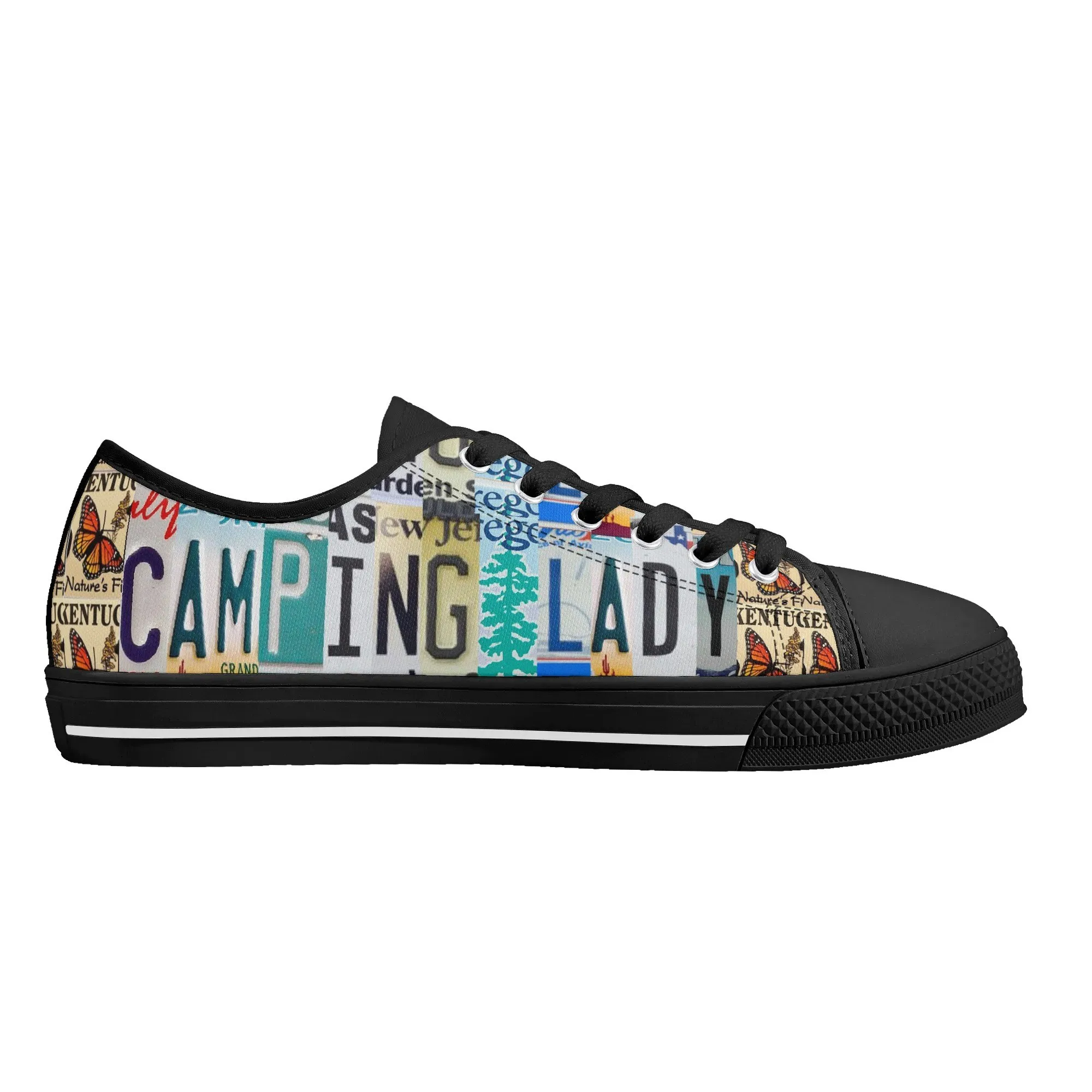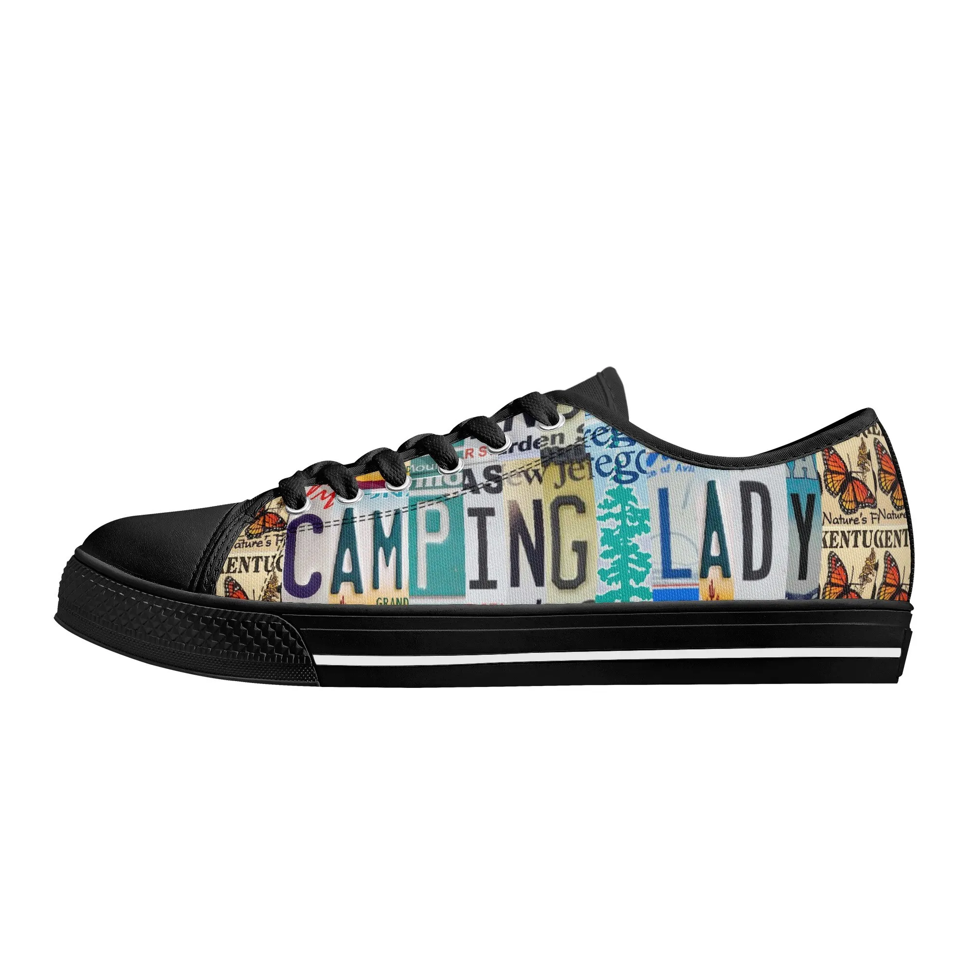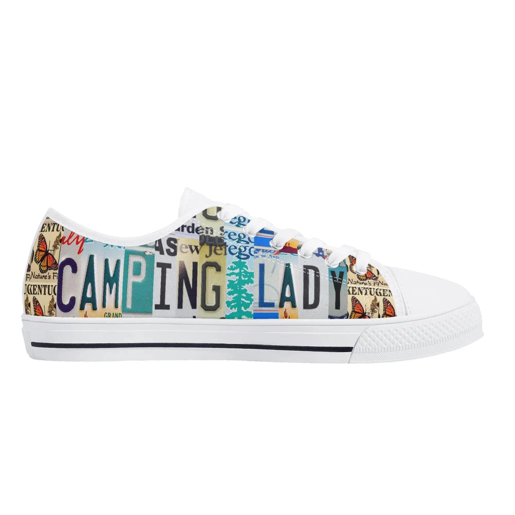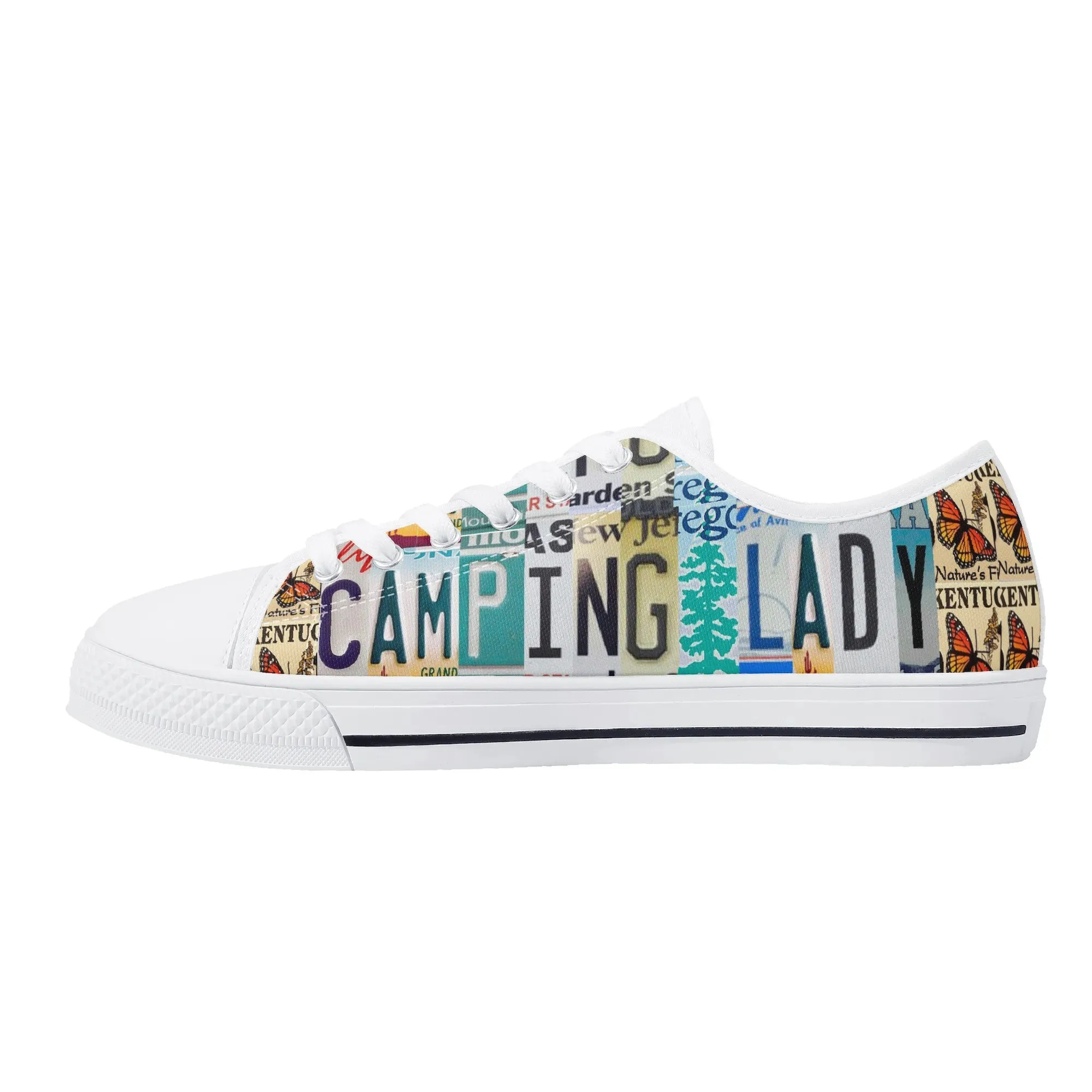Lace up for the great outdoors with these adventurous “CAMPING LADY” Low Top Canvas Shoes! Featuring a unique, colorful license plate art graphic with nature accents like butterflies and pine trees, these sneakers are the perfect expression for any outdoor enthusiast. Designed for comfortable wear around the campfire or on light trails, they are the ideal piece to complete your outfit, making them a fantastic and thoughtful gift for any woman who loves camping, hiking, and the wilderness.
