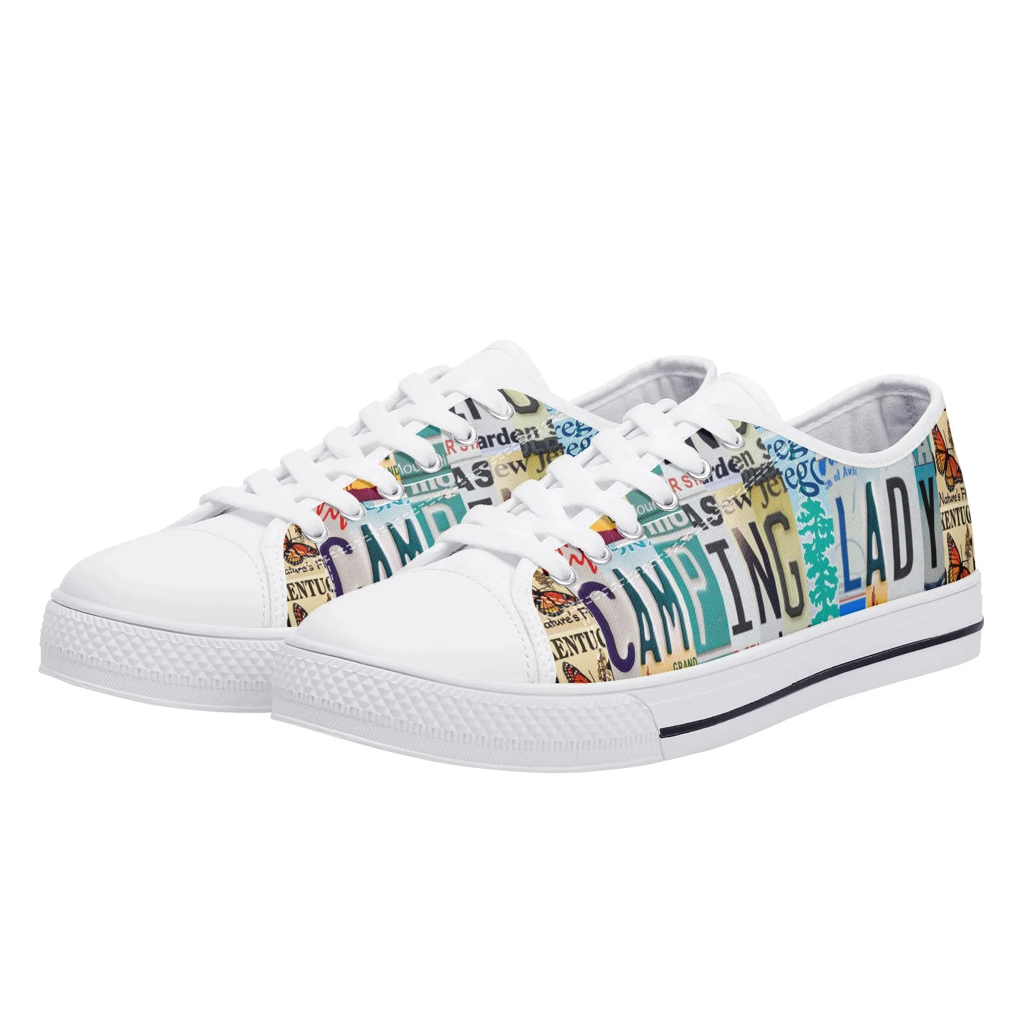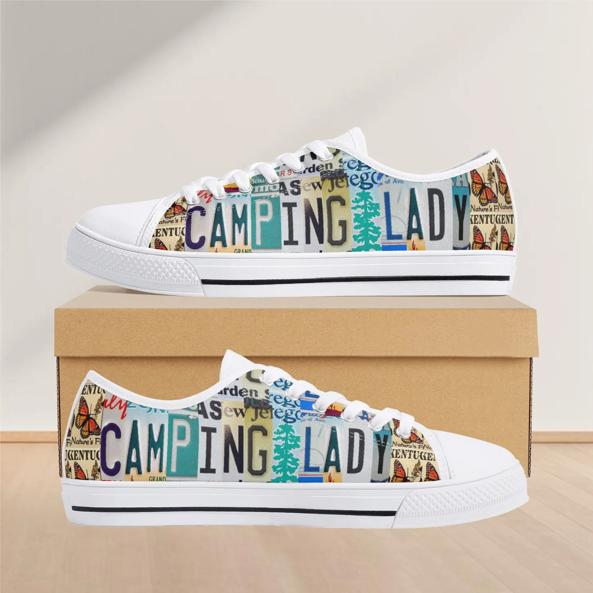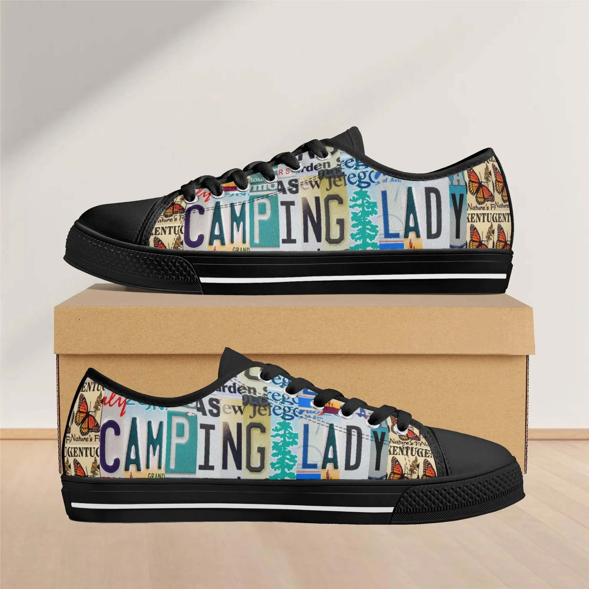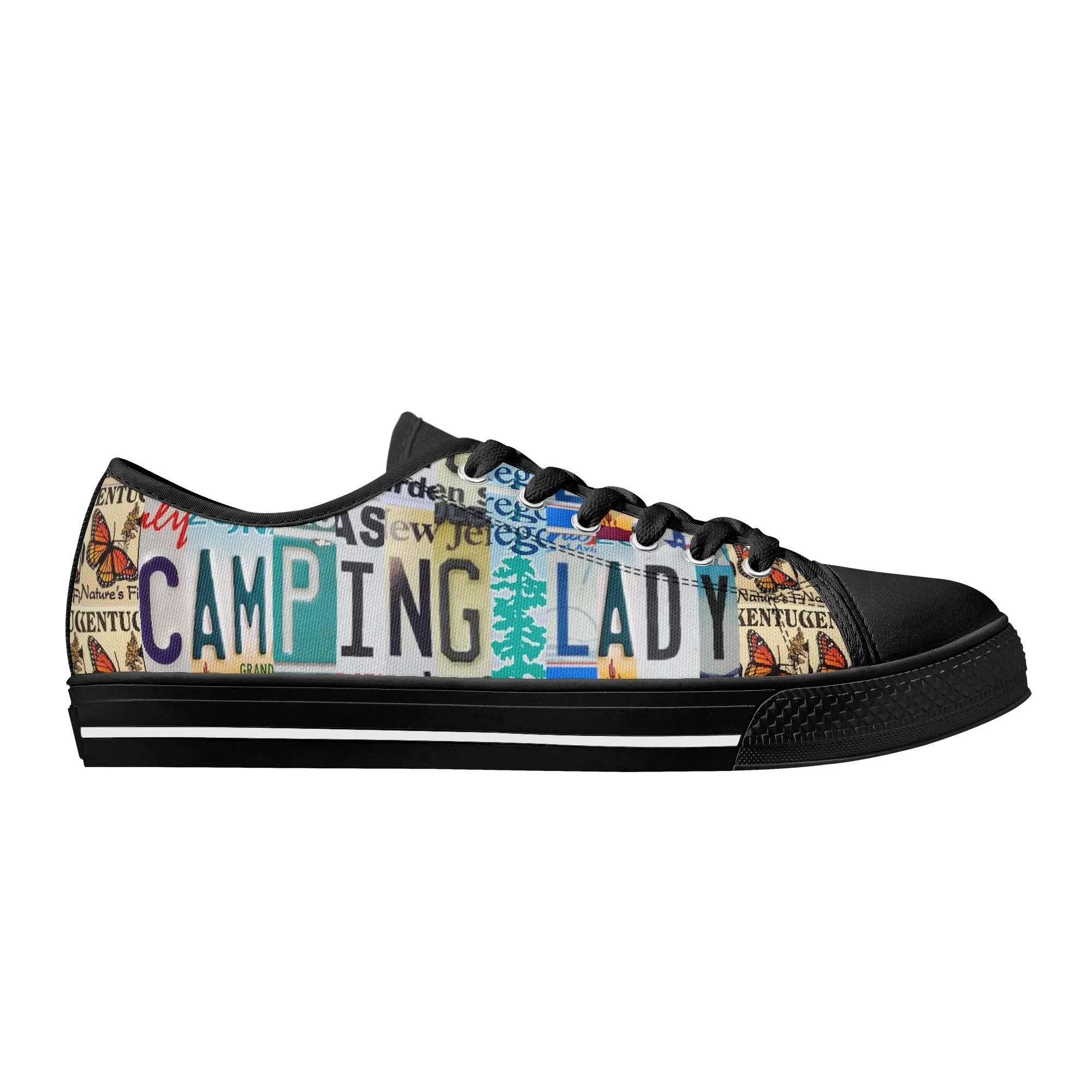 Lace up for the great outdoors with these adventurous “CAMPING LADY” Low Top Canvas Shoes! Featuring a unique, colorful license plate art graphic with nature accents like butterflies and pine trees, these sneakers are the perfect expression for any outdoor enthusiast. Designed for comfortable wear around the campfire or on light trails, they are the ideal piece to complete your outfit, making them a fantastic and thoughtful gift for any woman who loves camping, hiking, and the wilderness.