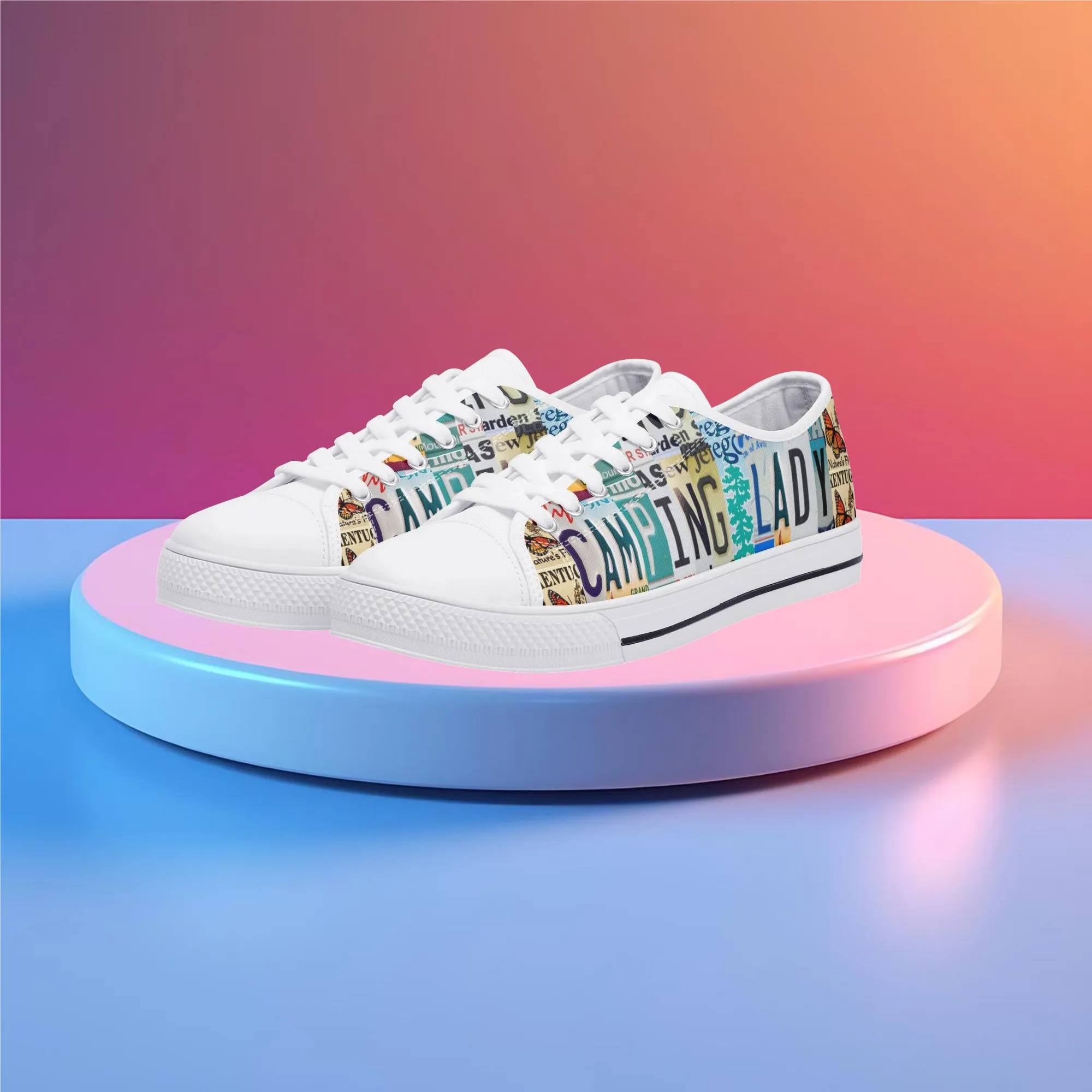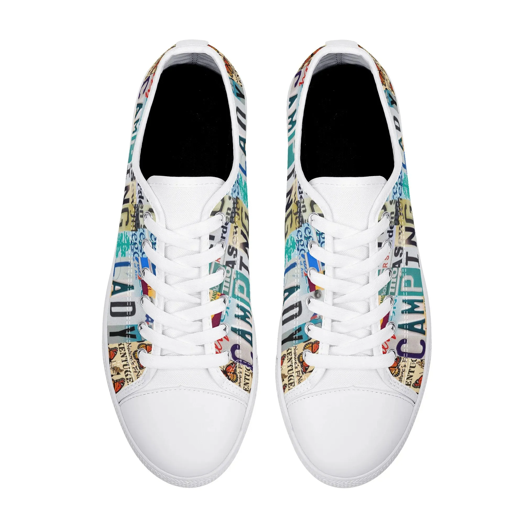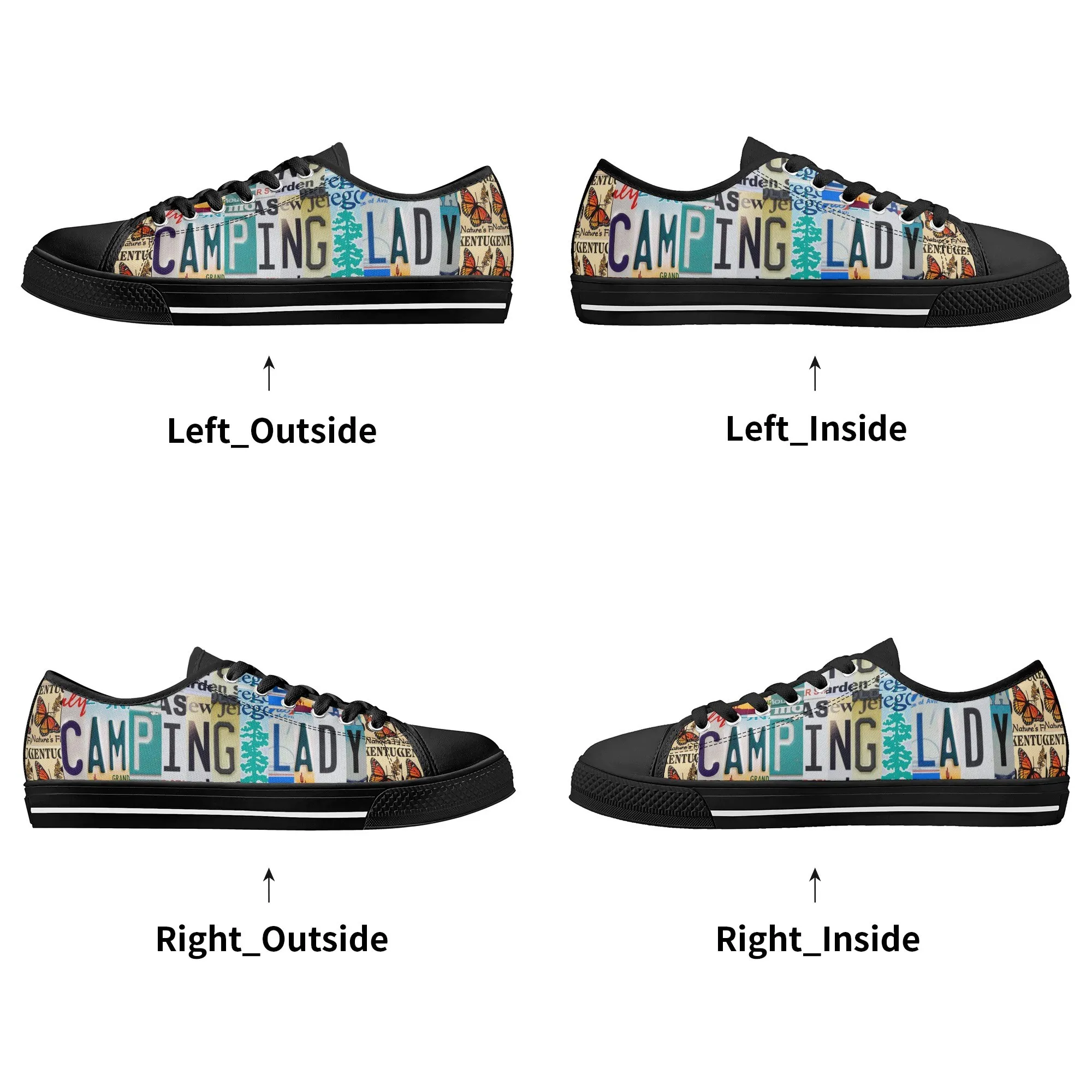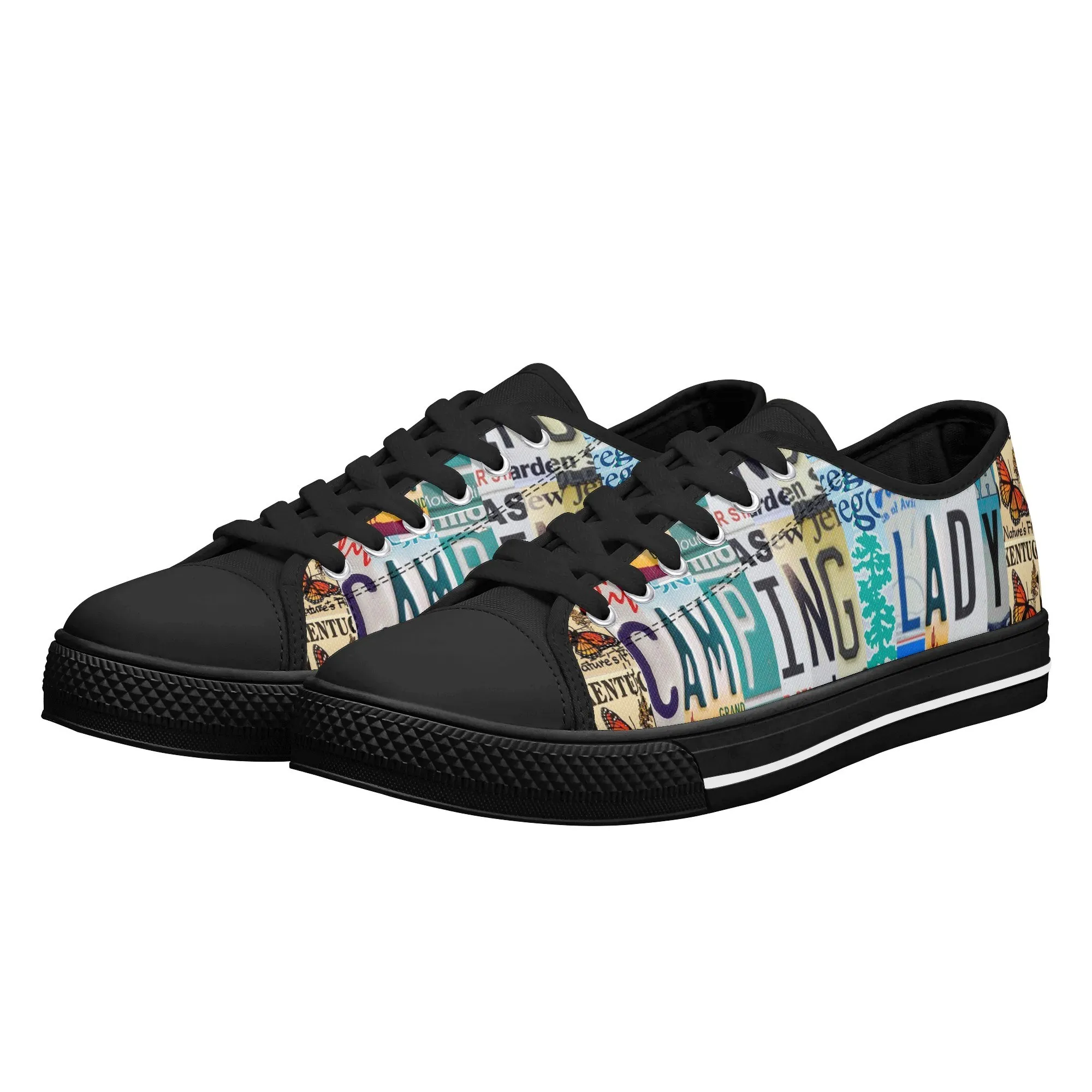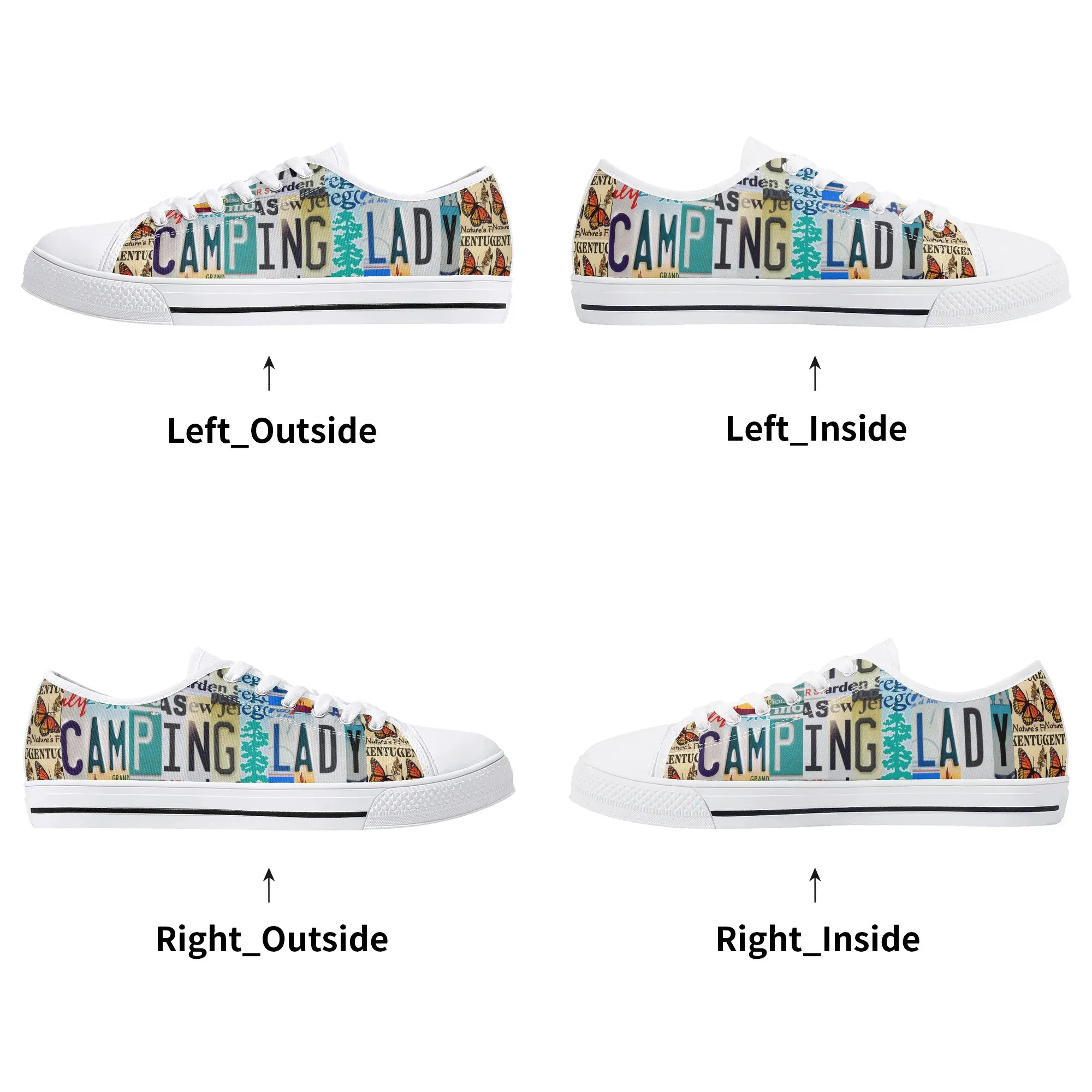 Lace up for the great outdoors with these adventurous “CAMPING LADY” Low Top Canvas Shoes! Featuring a unique, colorful license plate art graphic with nature accents like butterflies and pine trees, these sneakers are the perfect expression for any outdoor enthusiast. Designed for comfortable wear around the campfire or on light trails, they are the ideal piece to complete your outfit, making them a fantastic and thoughtful gift for any woman who loves camping, hiking, and the wilderness.