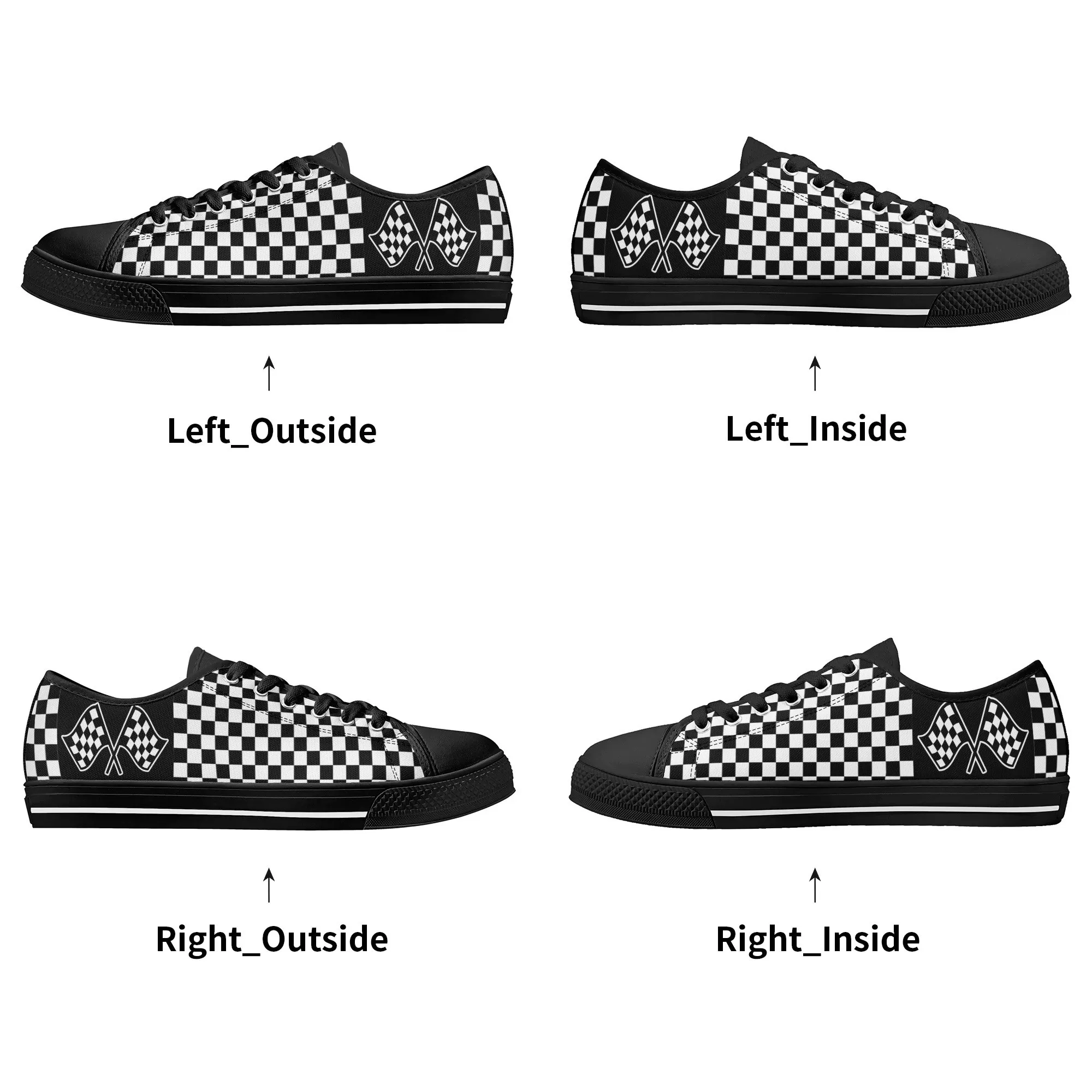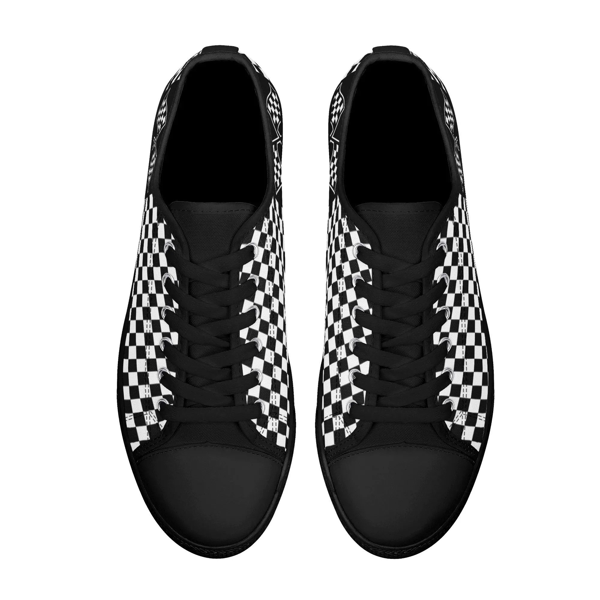 Accelerate your style with these bold low-top canvas shoes, featuring a high-contrast black and white checkerboard pattern and iconic crossed racing flags. These sneakers are the perfect statement piece for motorsport fans, car enthusiasts, or anyone who loves a classic, edgy skater aesthetic. Built for comfort and daily wear, these trainers offer excellent grip and support whether you’re at the track, the garage, or just cruising around town.