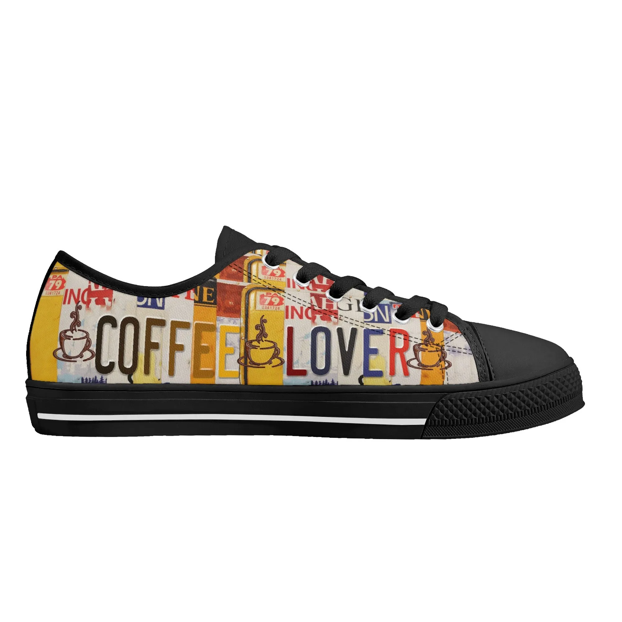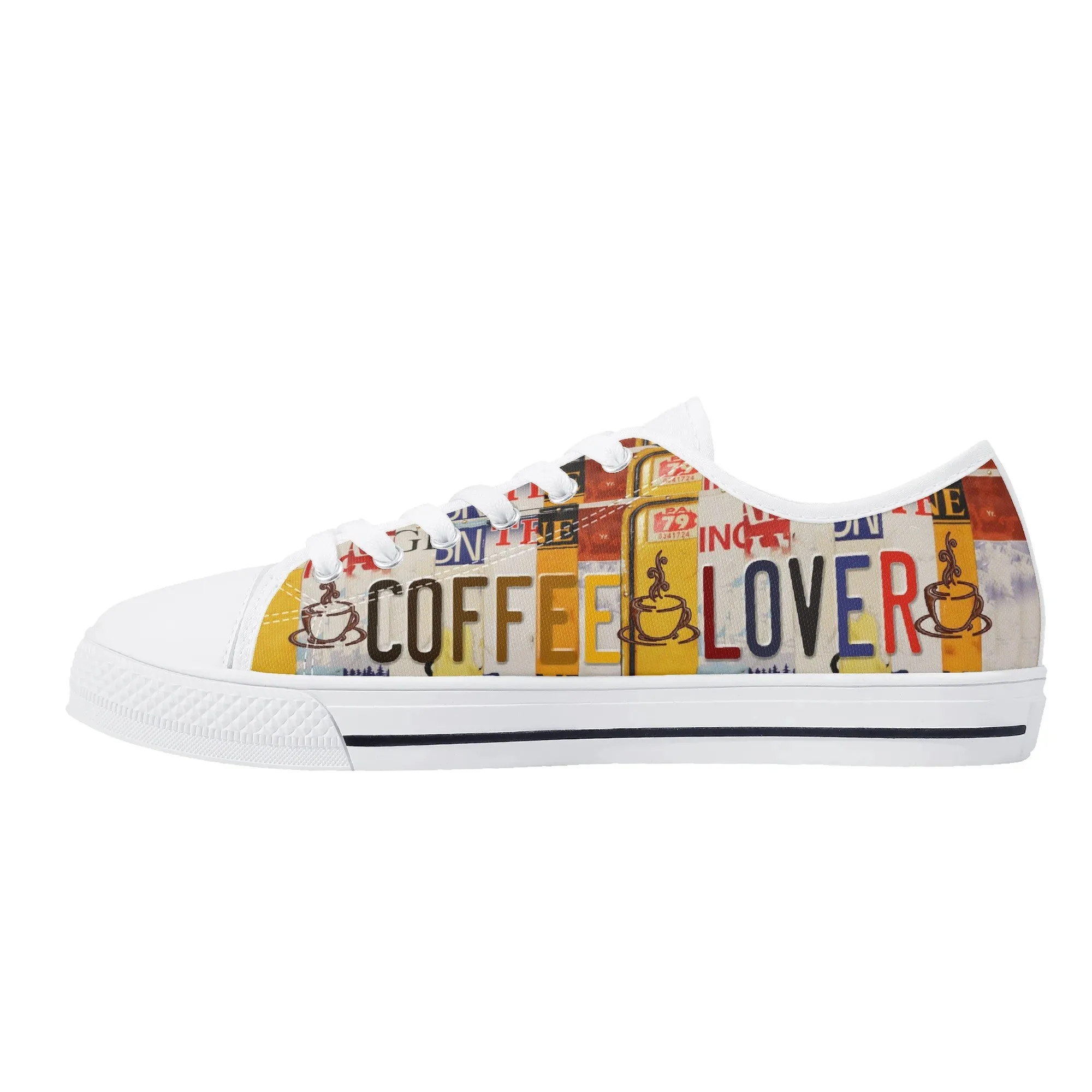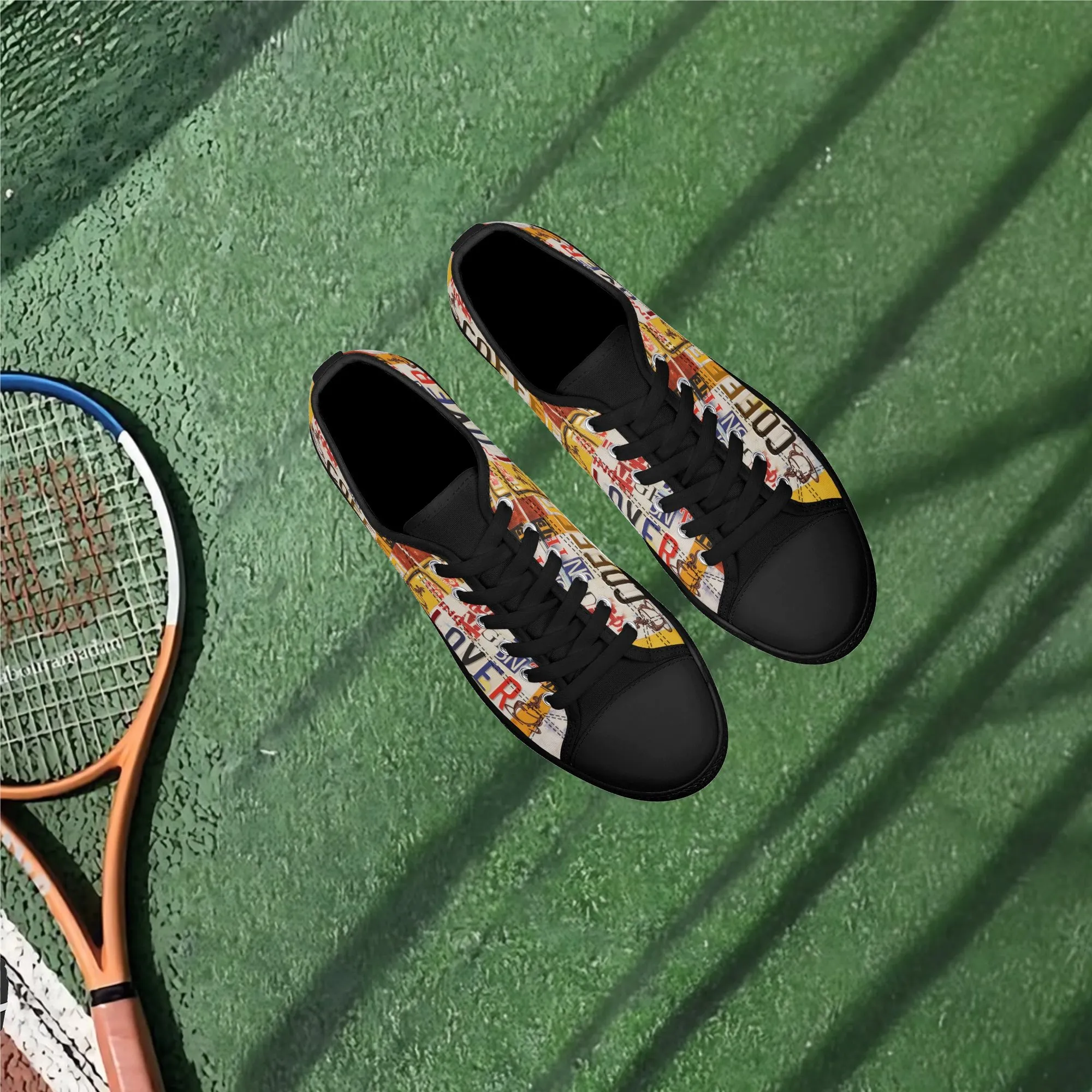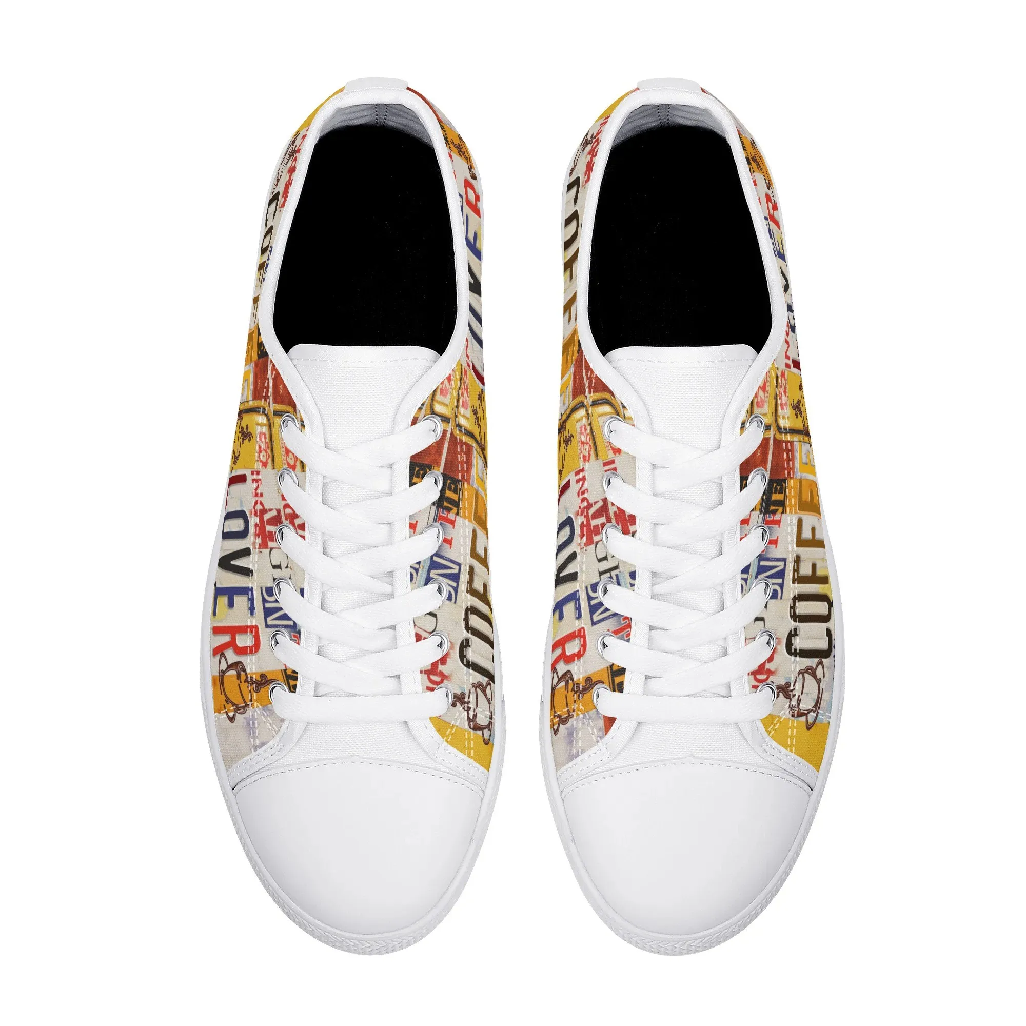 ☕ Kickstart your day with these fun Coffee Lover Low Top Canvas Shoes! Featuring the bold phrase “COFFEE LOVER” across a vibrant background of multicolored, grunge-style license plates, and accented with cute coffee cups, these sneakers are the perfect expression of your caffeine obsession. The bright, expressive design and comfortable platform sole make them a unique, fun, and ideal piece of casual footwear for running to your favorite coffee shop or tackling daily tasks with energy.