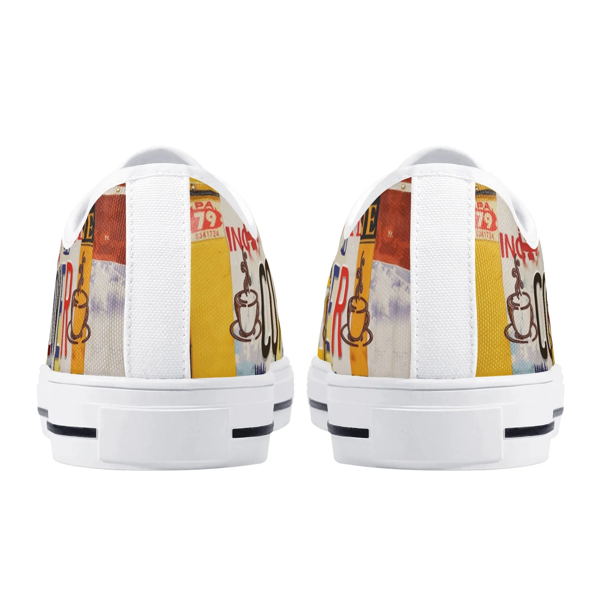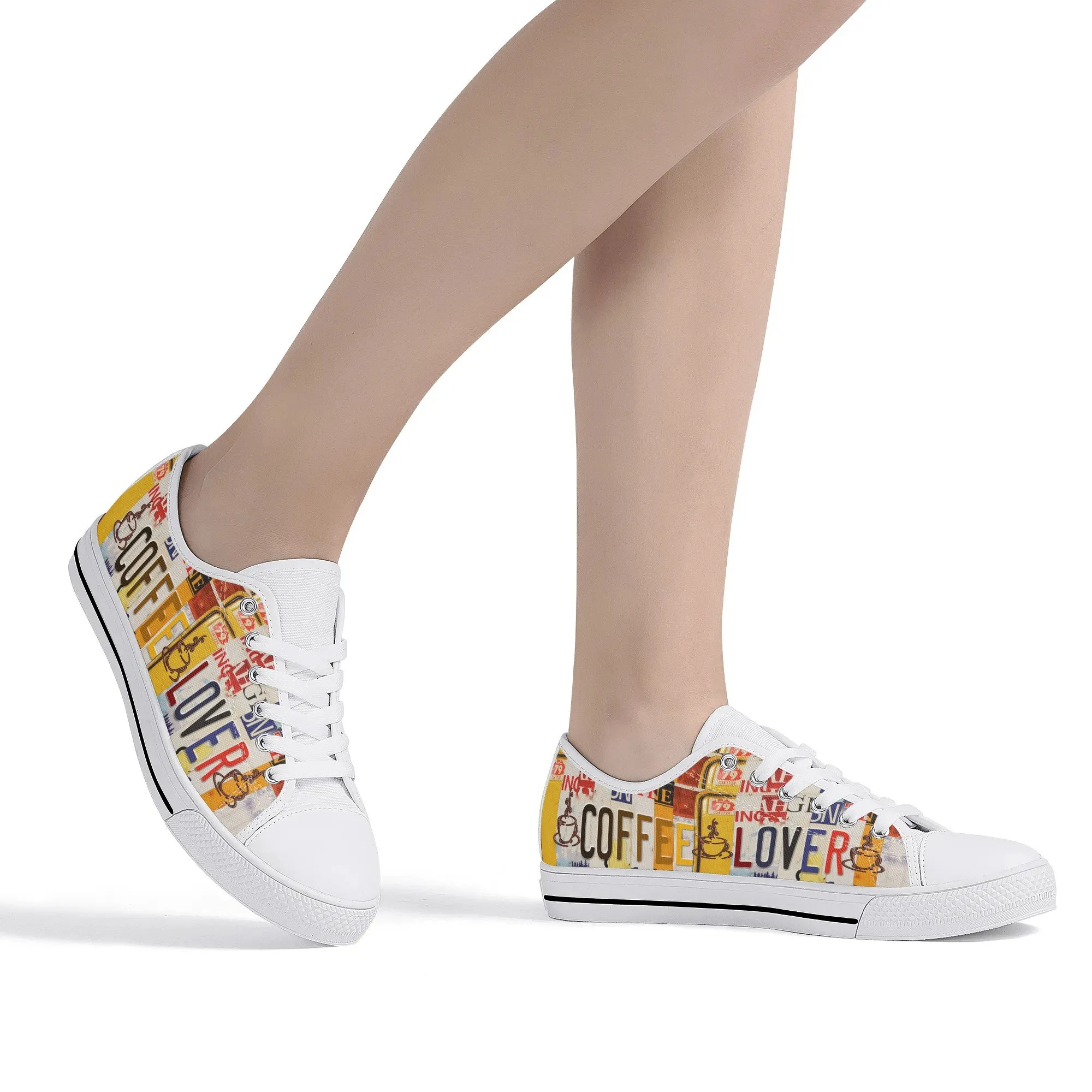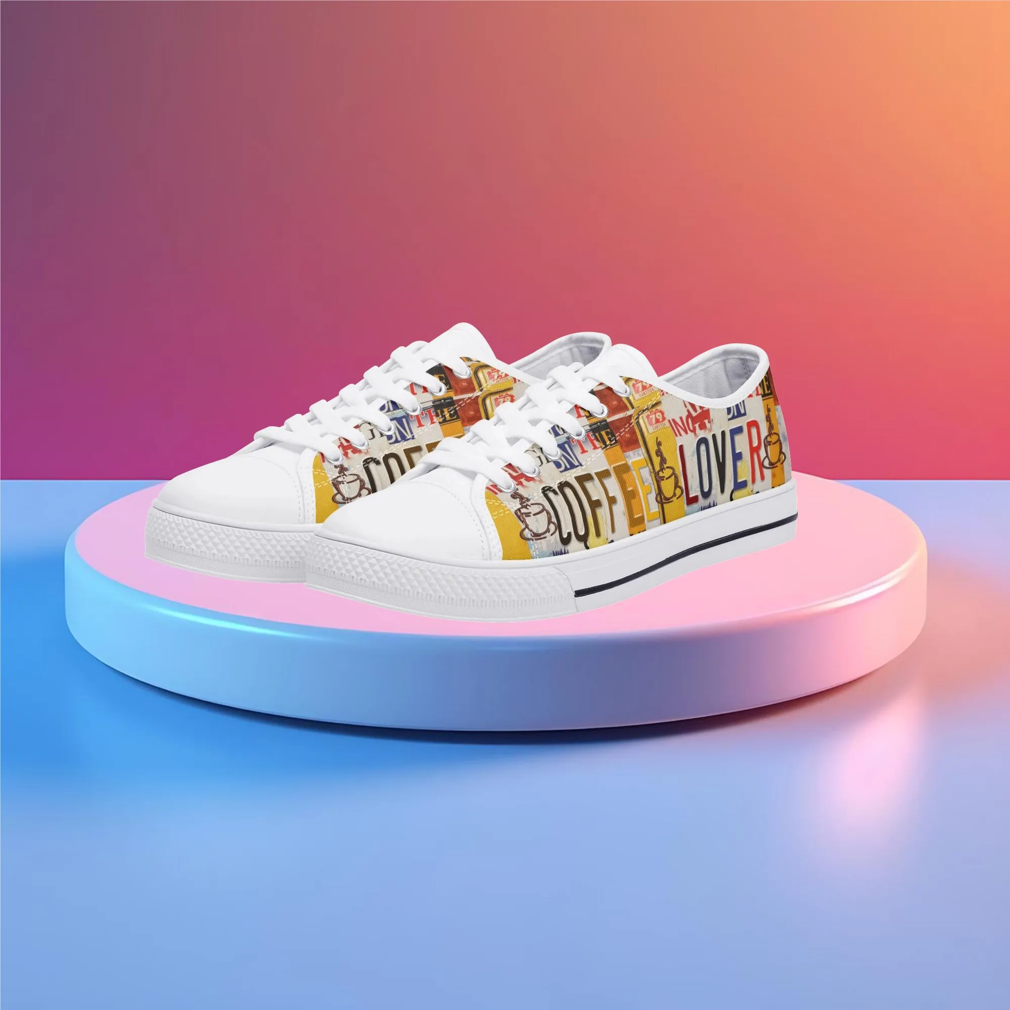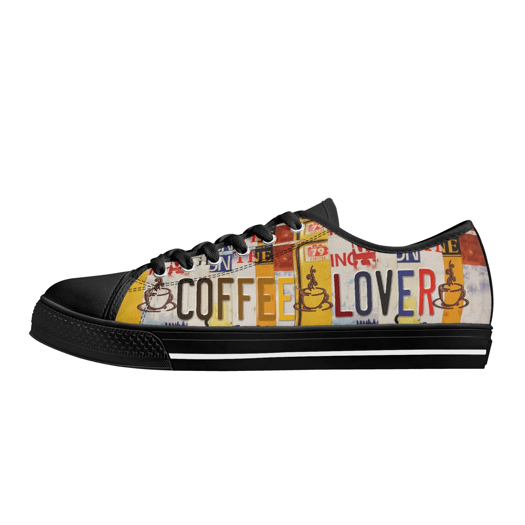 ☕ Kickstart your day with these fun Coffee Lover Low Top Canvas Shoes! Featuring the bold phrase “COFFEE LOVER” across a vibrant background of multicolored, grunge-style license plates, and accented with cute coffee cups, these sneakers are the perfect expression of your caffeine obsession. The bright, expressive design and comfortable platform sole make them a unique, fun, and ideal piece of casual footwear for running to your favorite coffee shop or tackling daily tasks with energy.