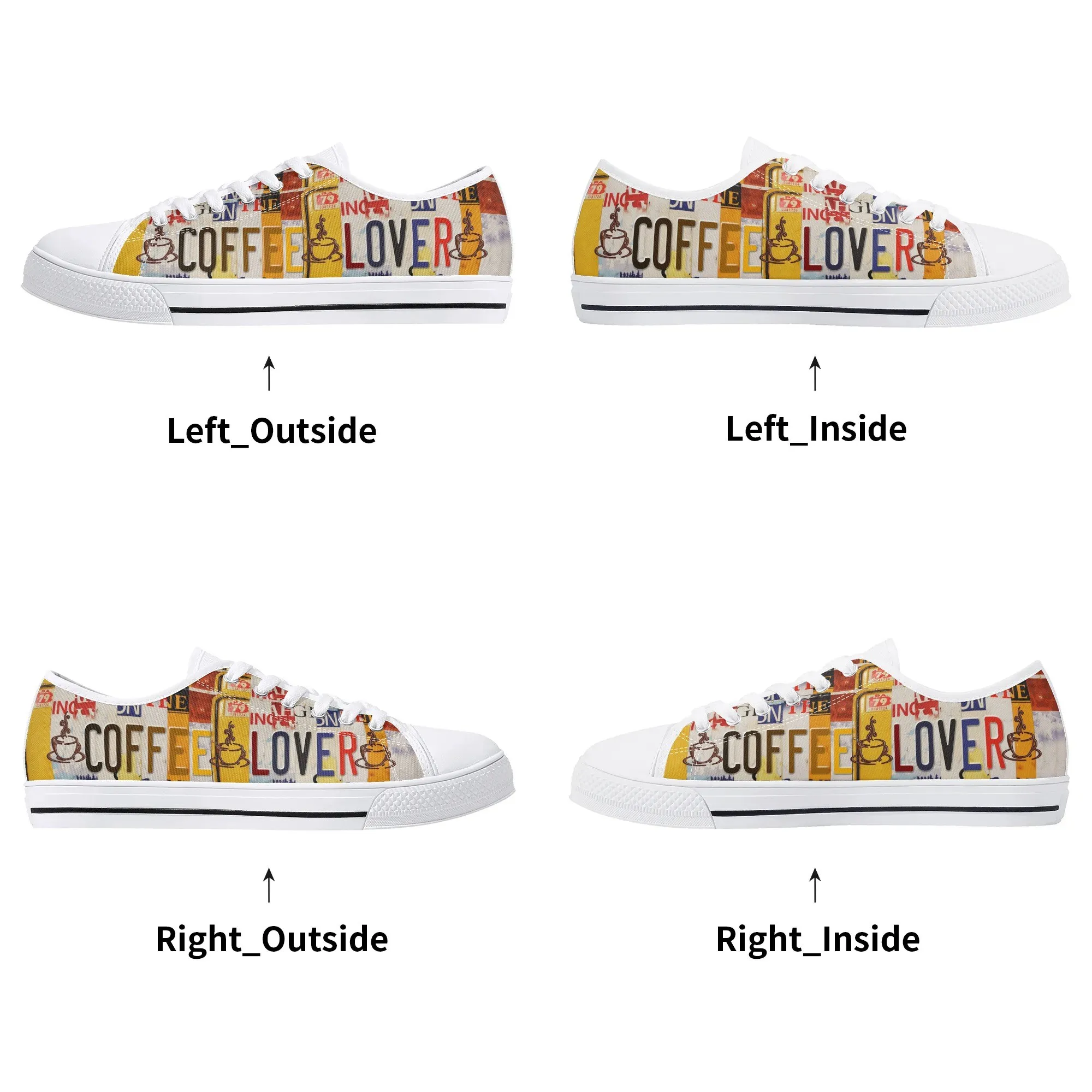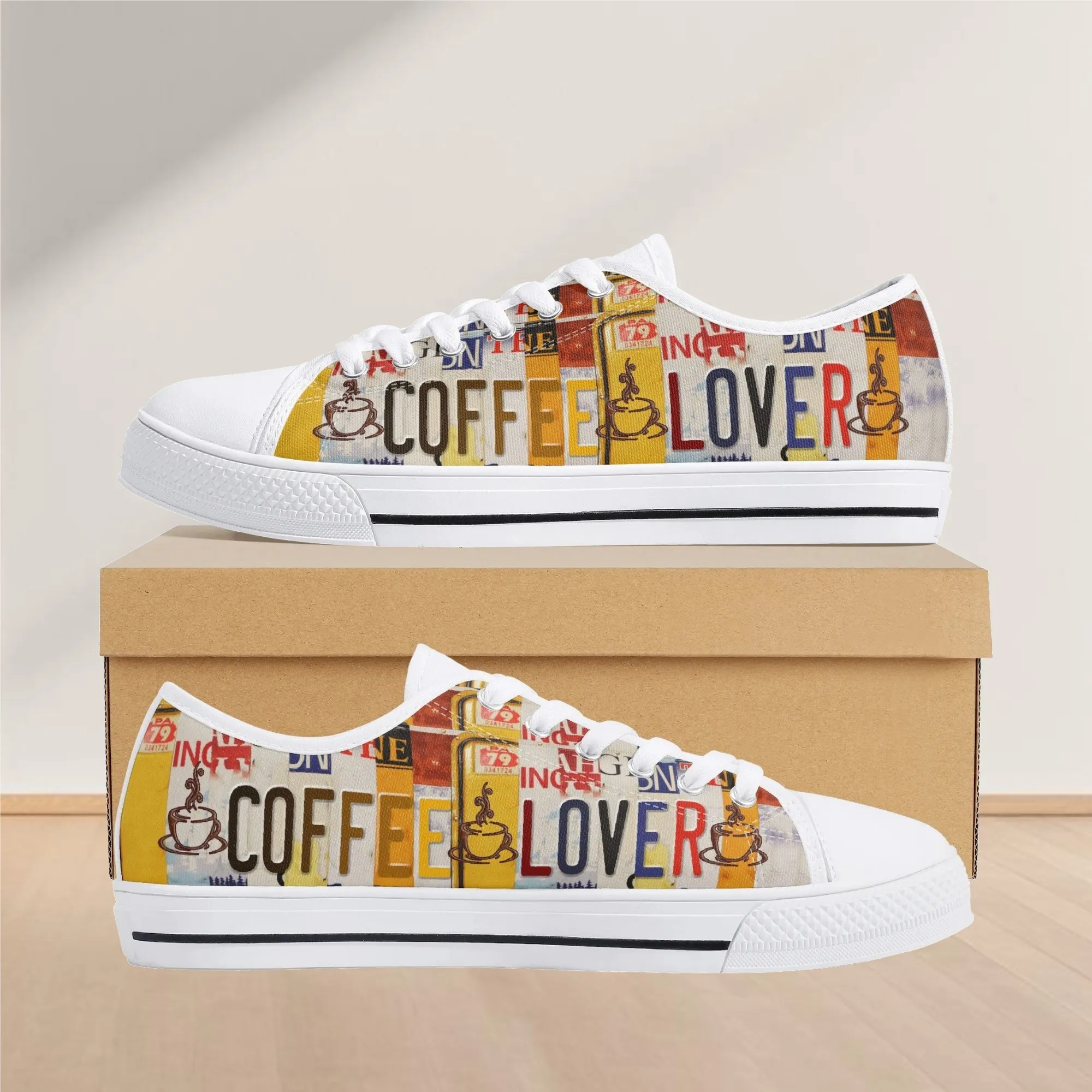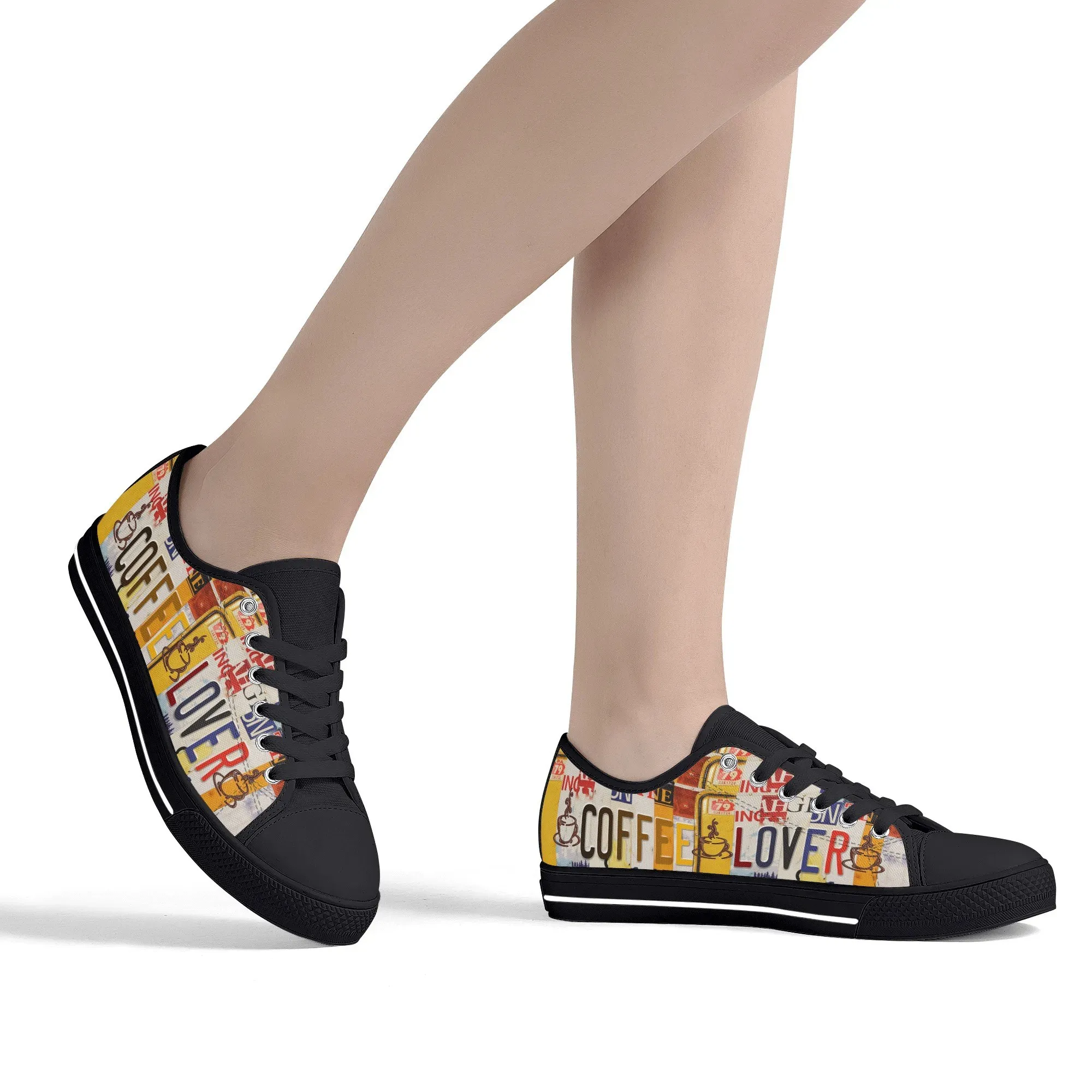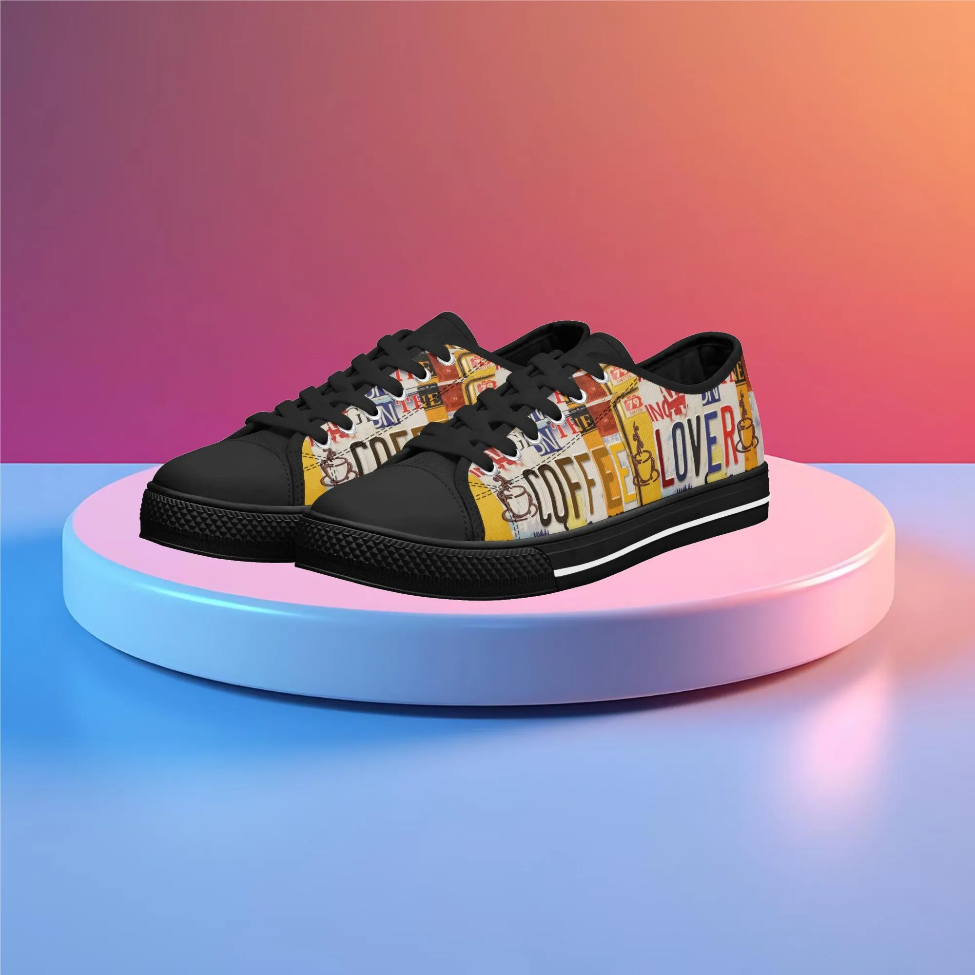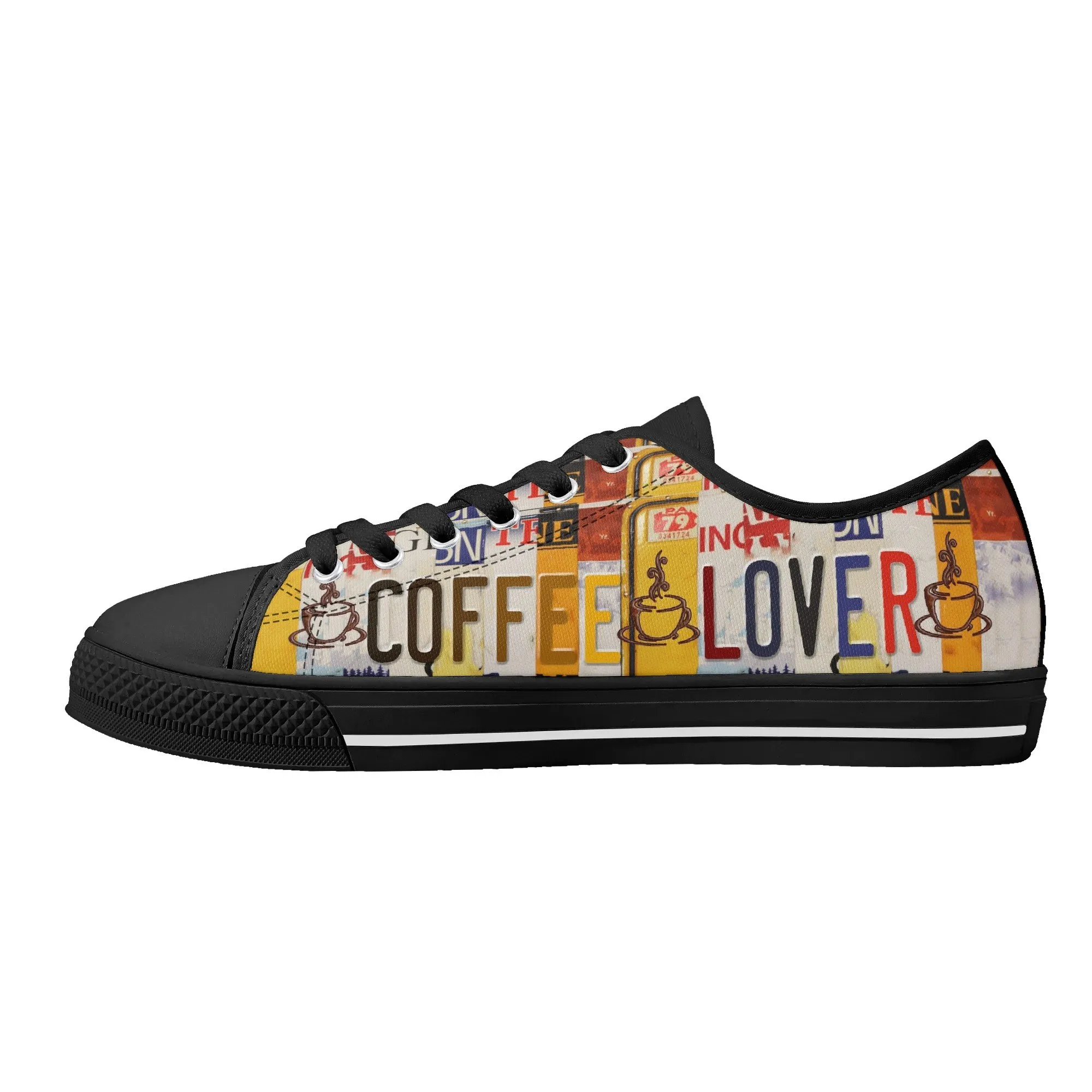 ☕ Kickstart your day with these fun Coffee Lover Low Top Canvas Shoes! Featuring the bold phrase “COFFEE LOVER” across a vibrant background of multicolored, grunge-style license plates, and accented with cute coffee cups, these sneakers are the perfect expression of your caffeine obsession. The bright, expressive design and comfortable platform sole make them a unique, fun, and ideal piece of casual footwear for running to your favorite coffee shop or tackling daily tasks with energy.