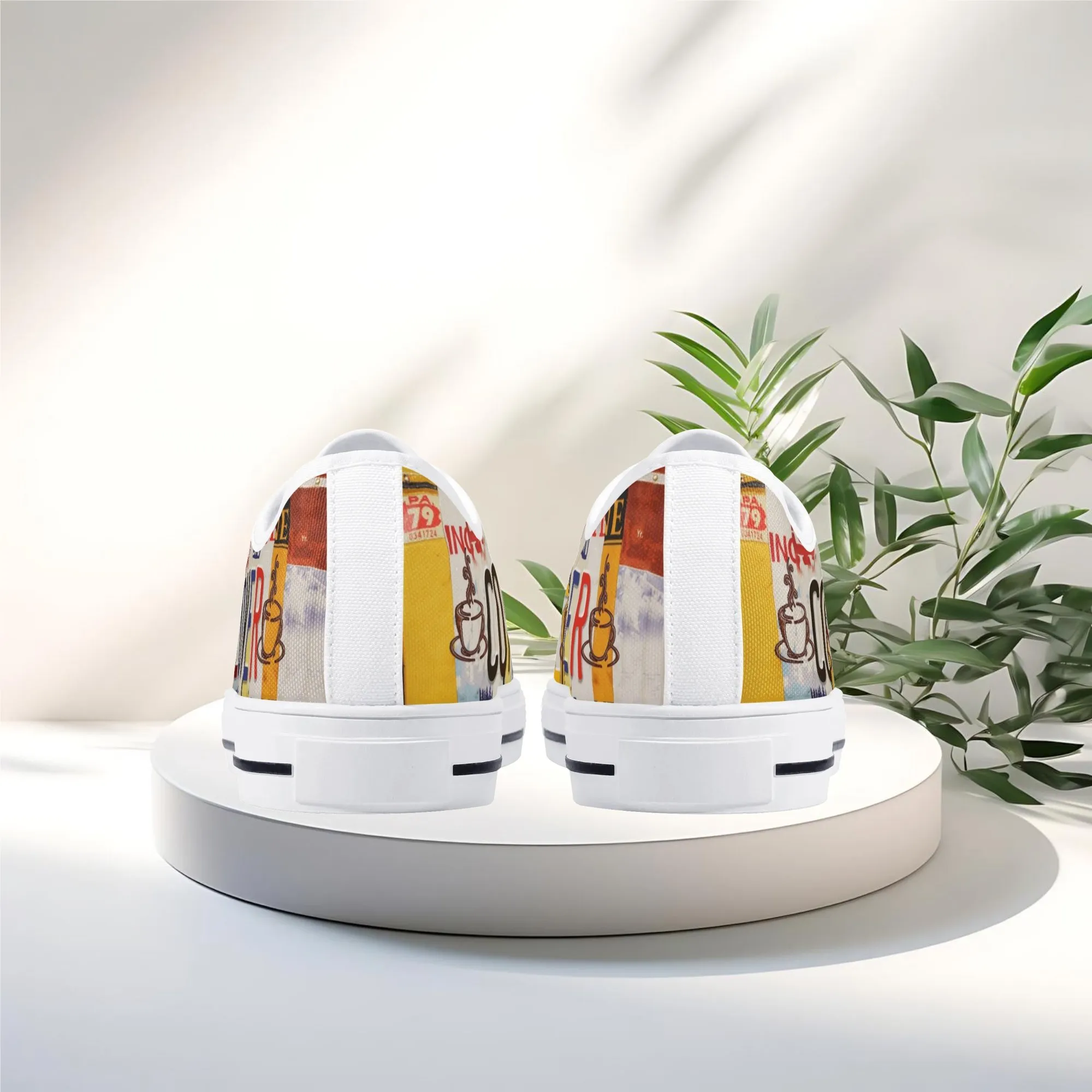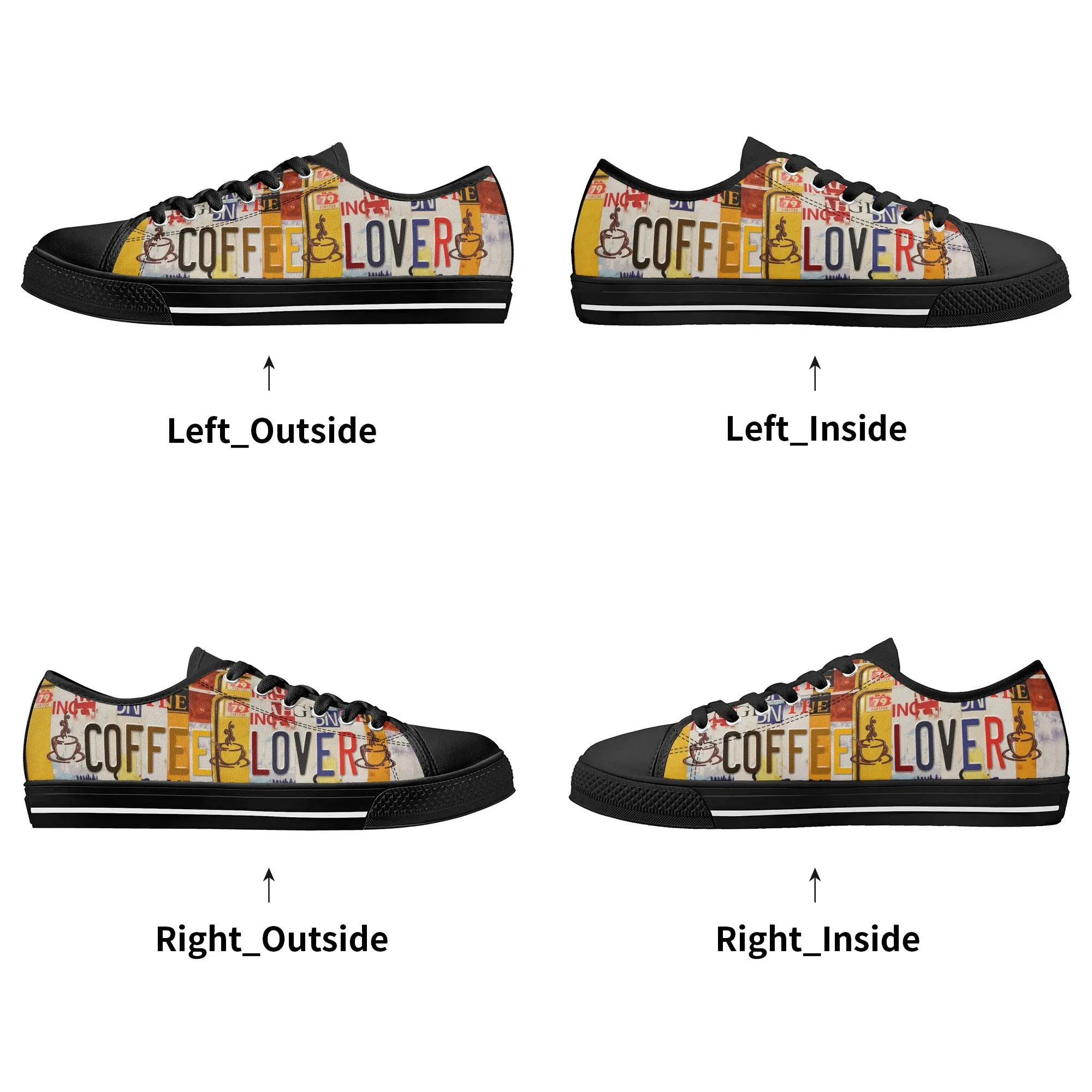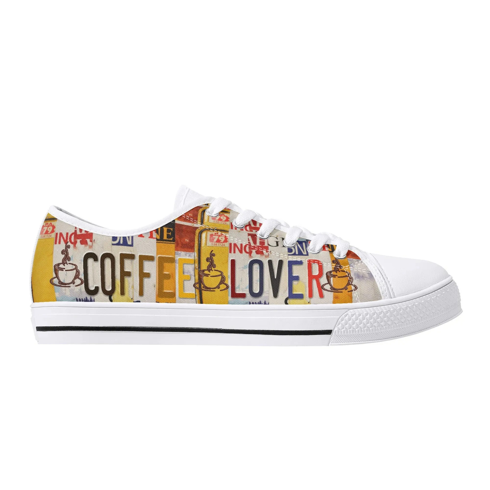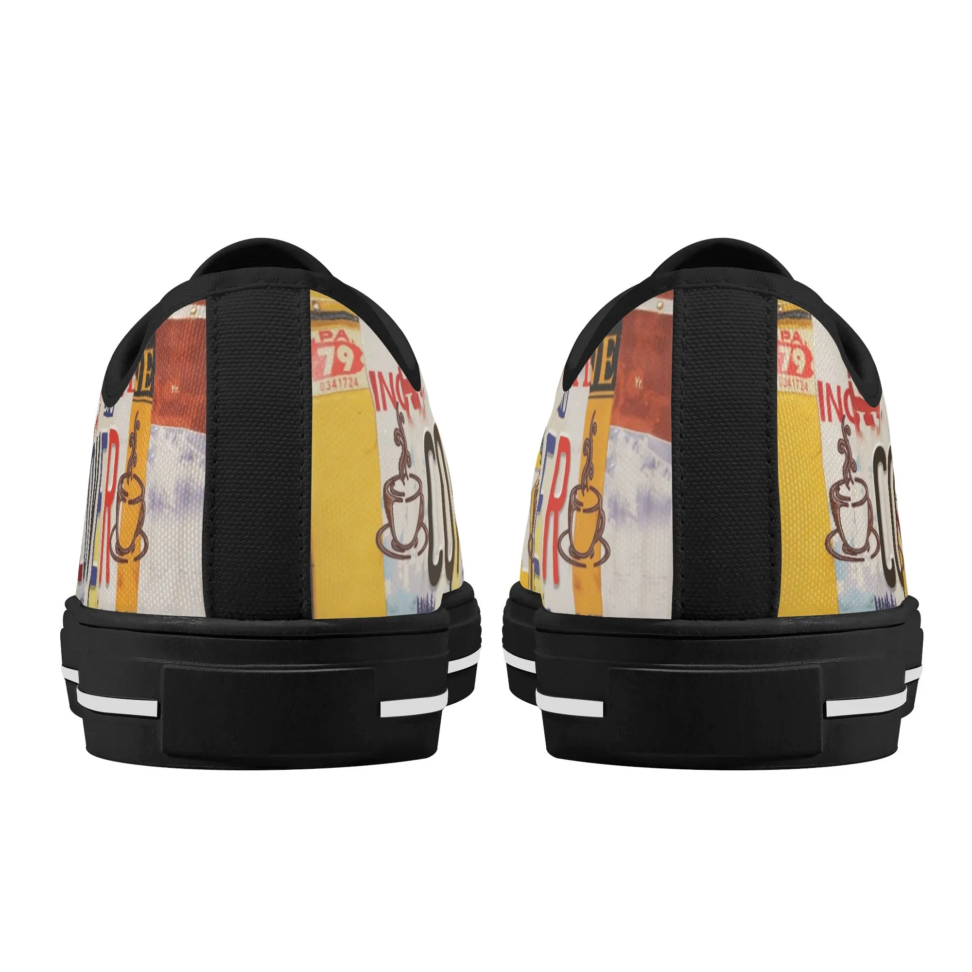 ☕ Kickstart your day with these fun Coffee Lover Low Top Canvas Shoes! Featuring the bold phrase “COFFEE LOVER” across a vibrant background of multicolored, grunge-style license plates, and accented with cute coffee cups, these sneakers are the perfect expression of your caffeine obsession. The bright, expressive design and comfortable platform sole make them a unique, fun, and ideal piece of casual footwear for running to your favorite coffee shop or tackling daily tasks with energy.