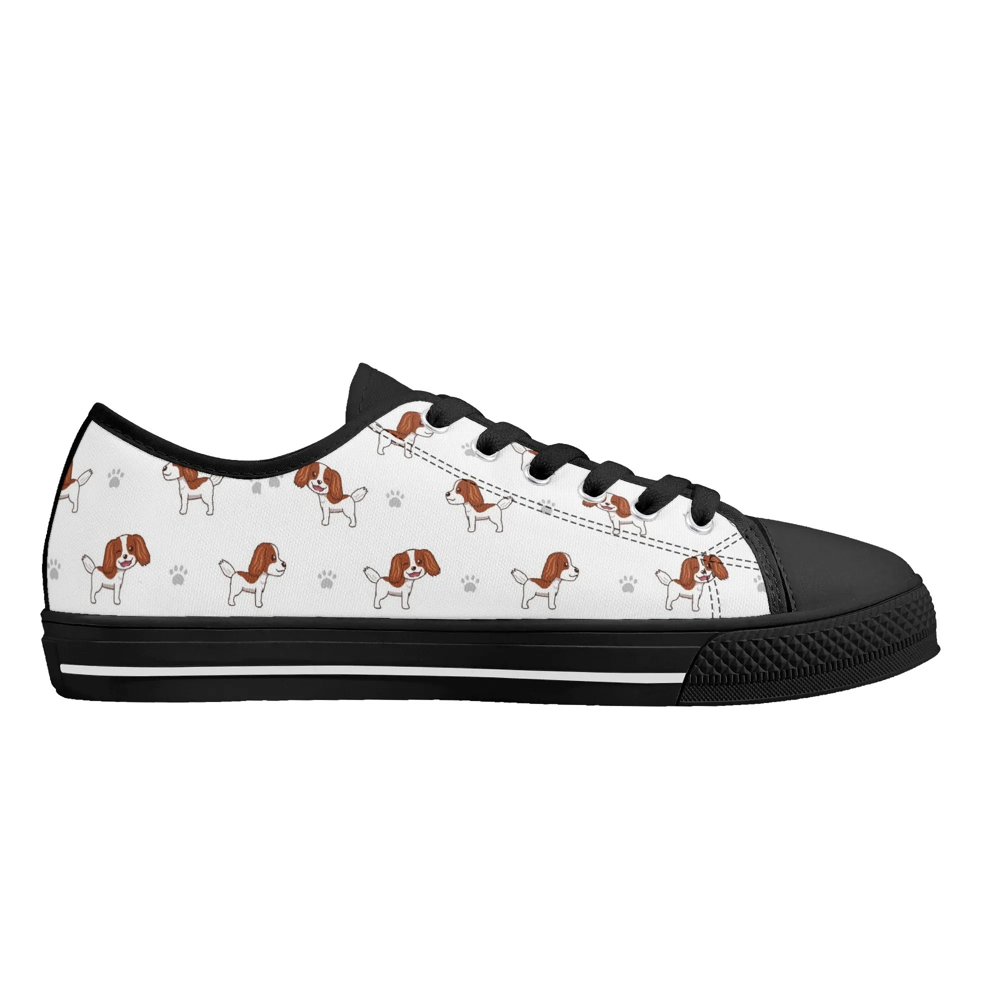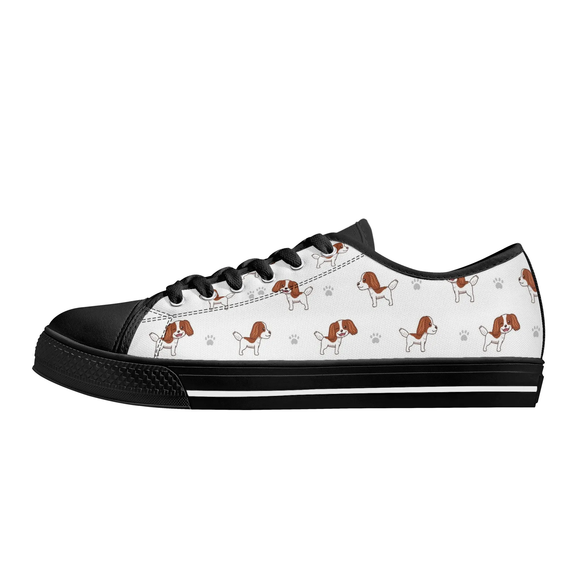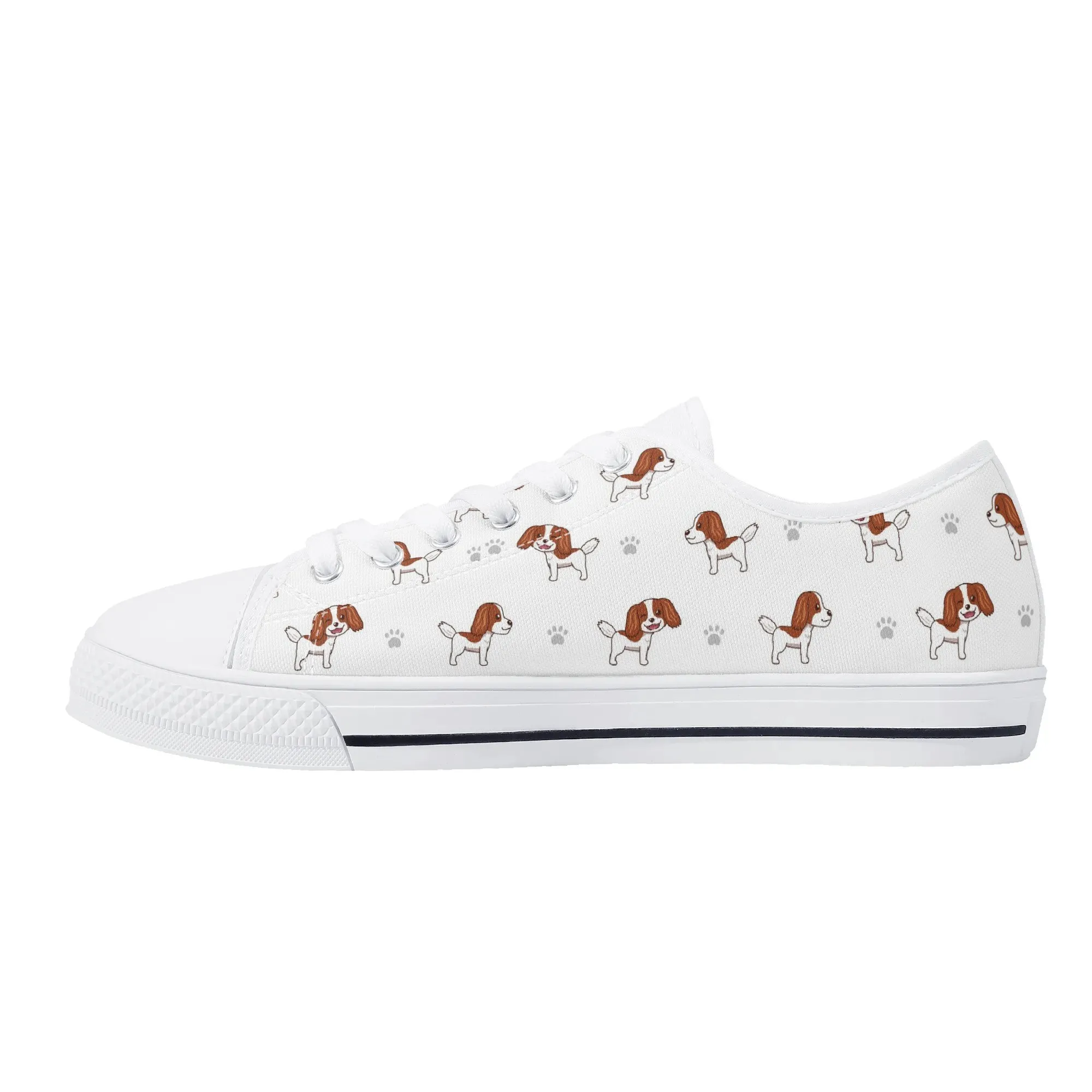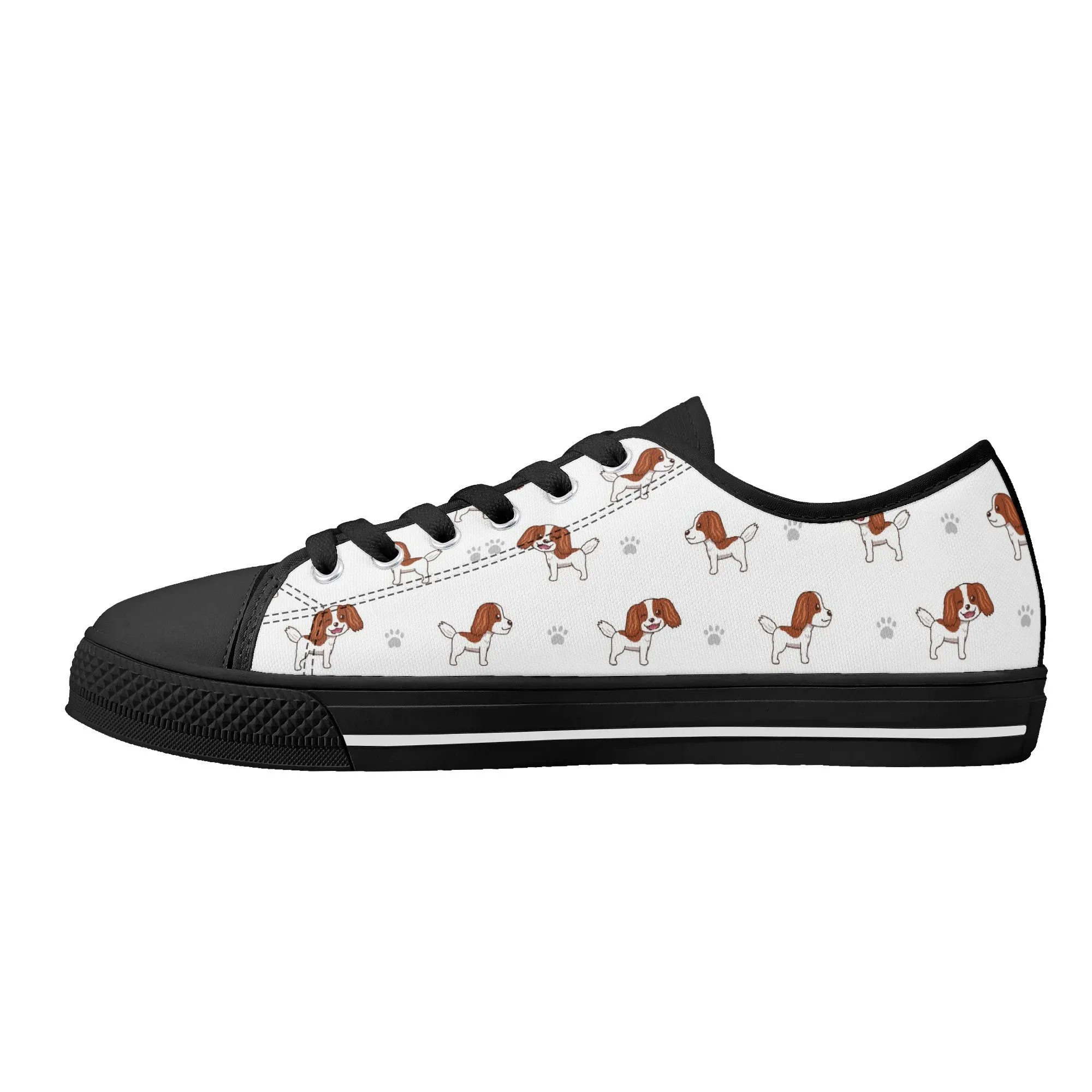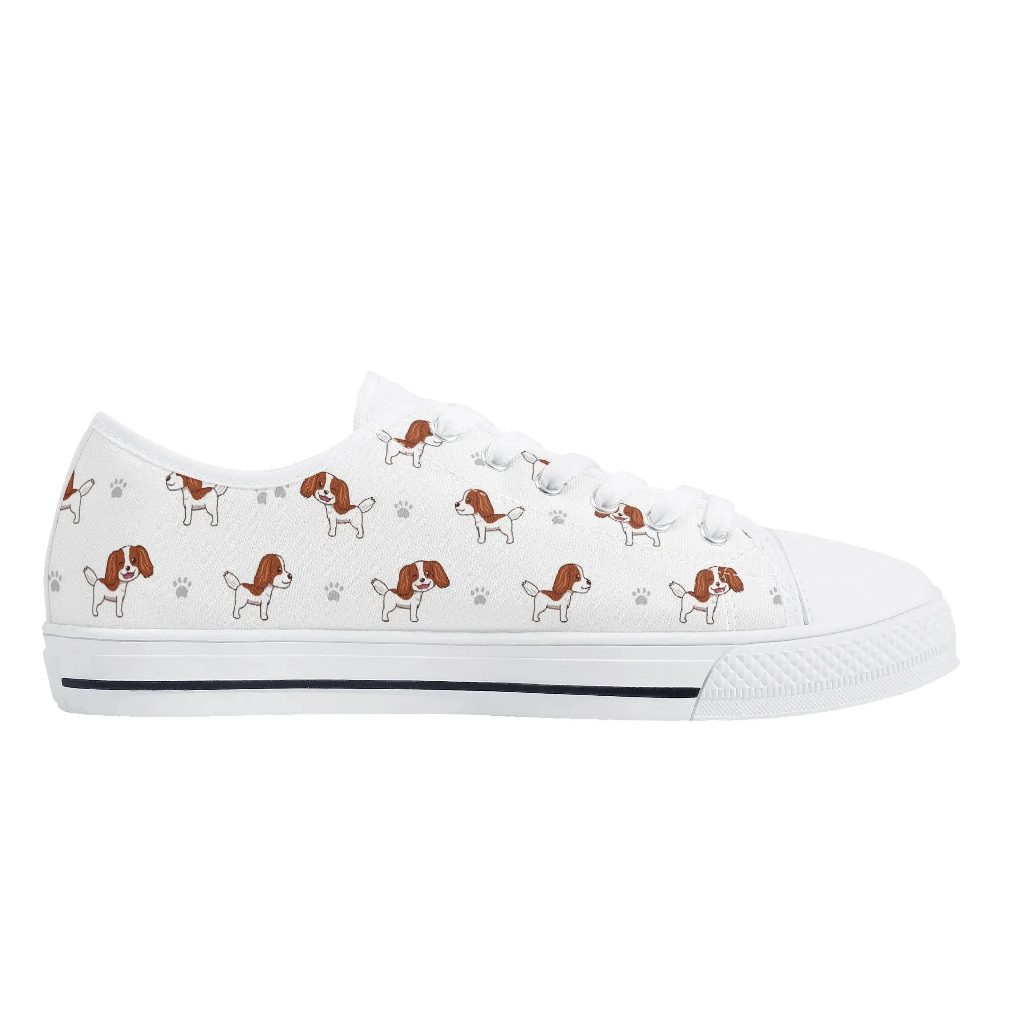 👑 Show off your royal affection with these beautiful low-top canvas shoes featuring an adorable, all-over pattern of the sweet Cavalier King Charles Spaniel (Blenheim pattern). This charming design is a must-have for Cavalier owners and those who adore this gentle breed. These unisex sneakers are constructed for ultimate comfort and durability, making them the perfect footwear for strolls, errands, and any occasion where you want to celebrate your favorite furry friend. Bring a little royalty to your everyday step!