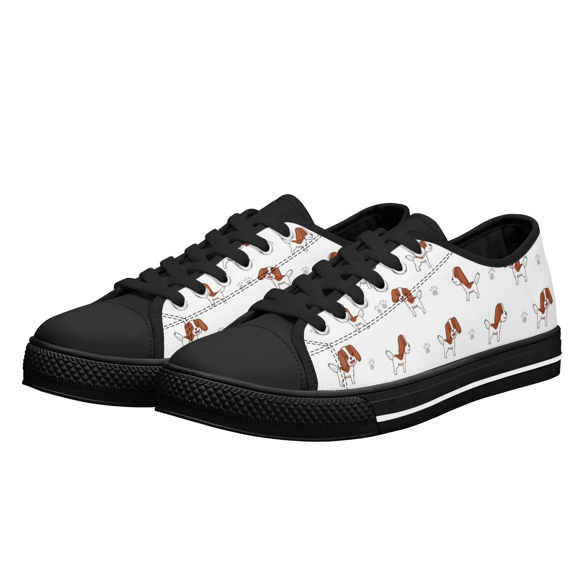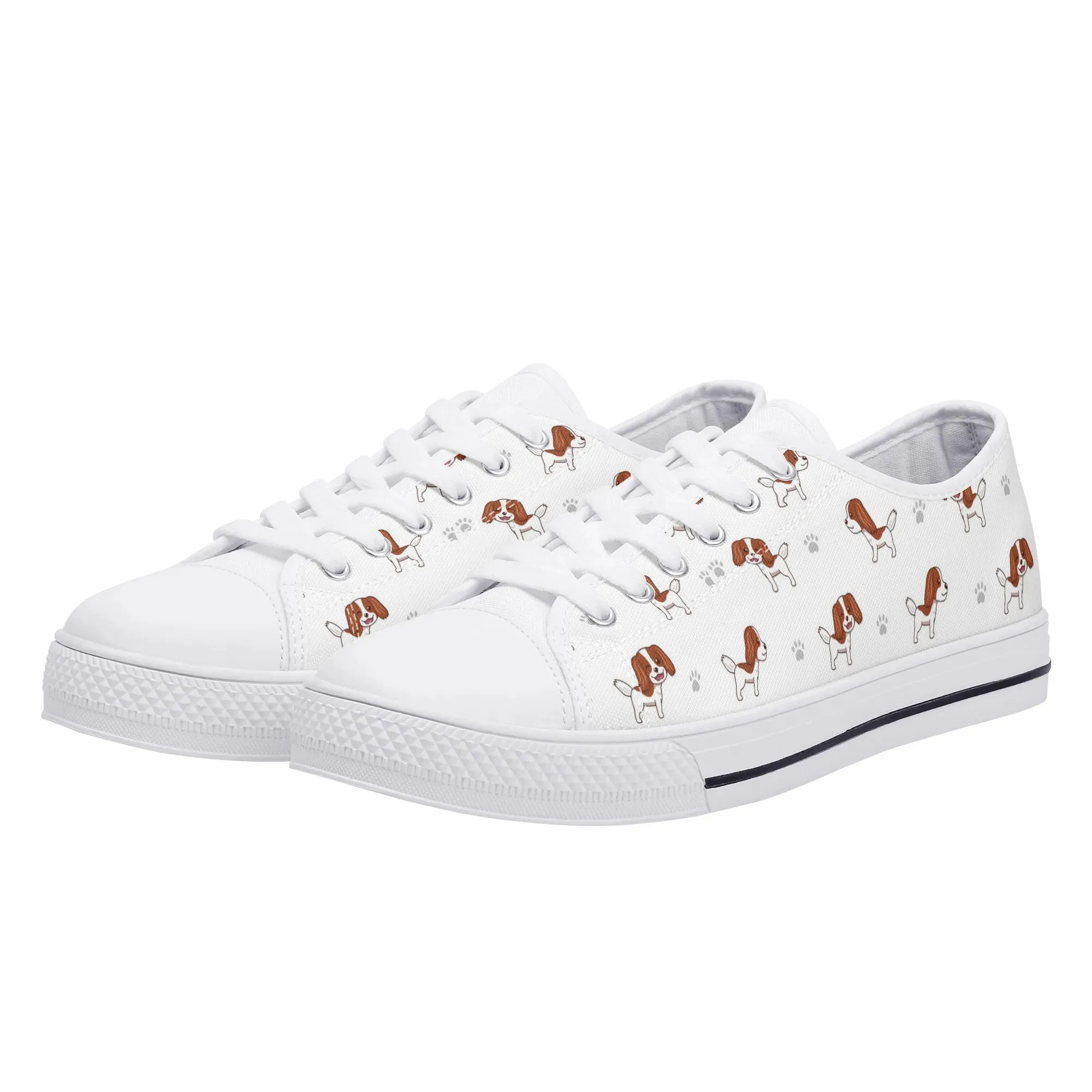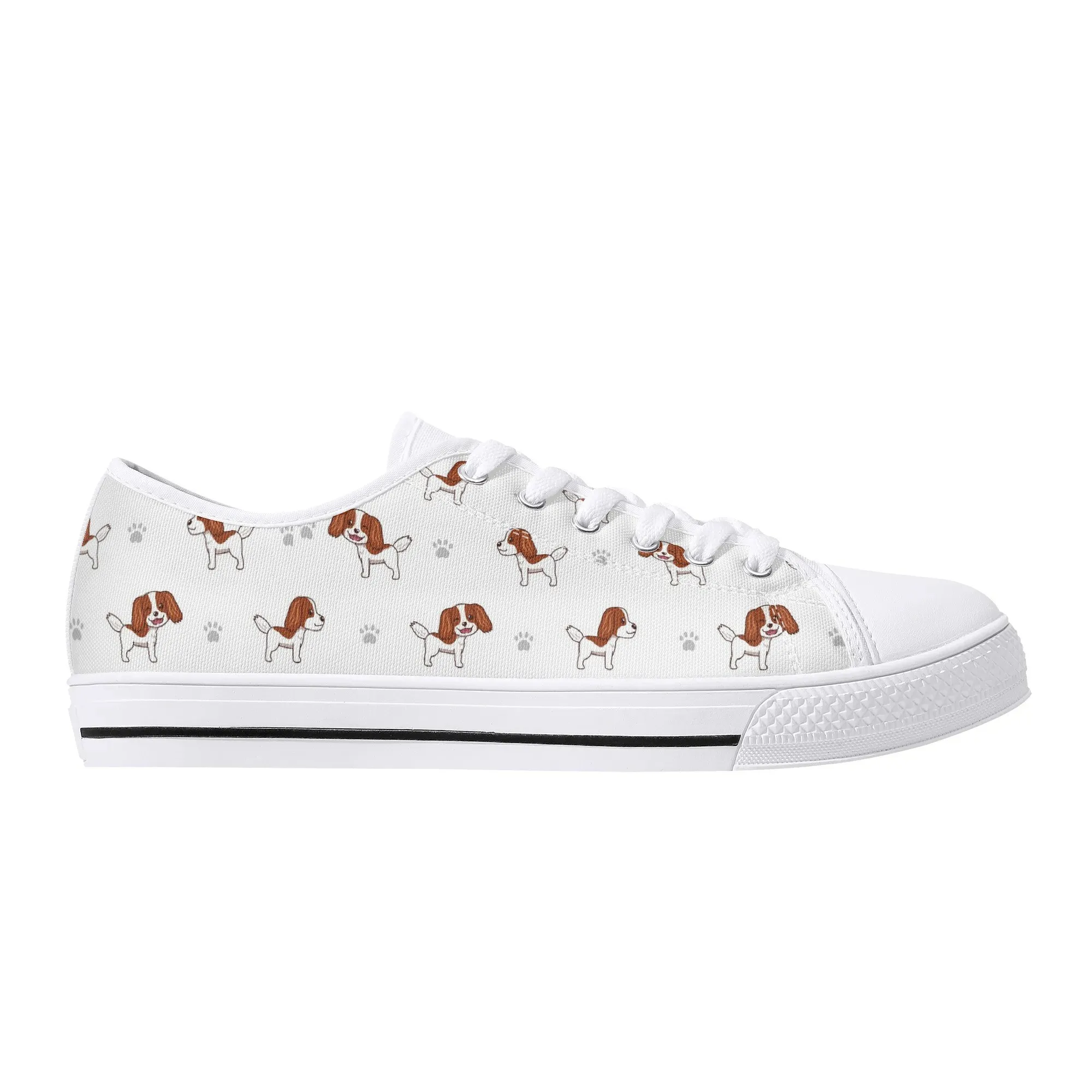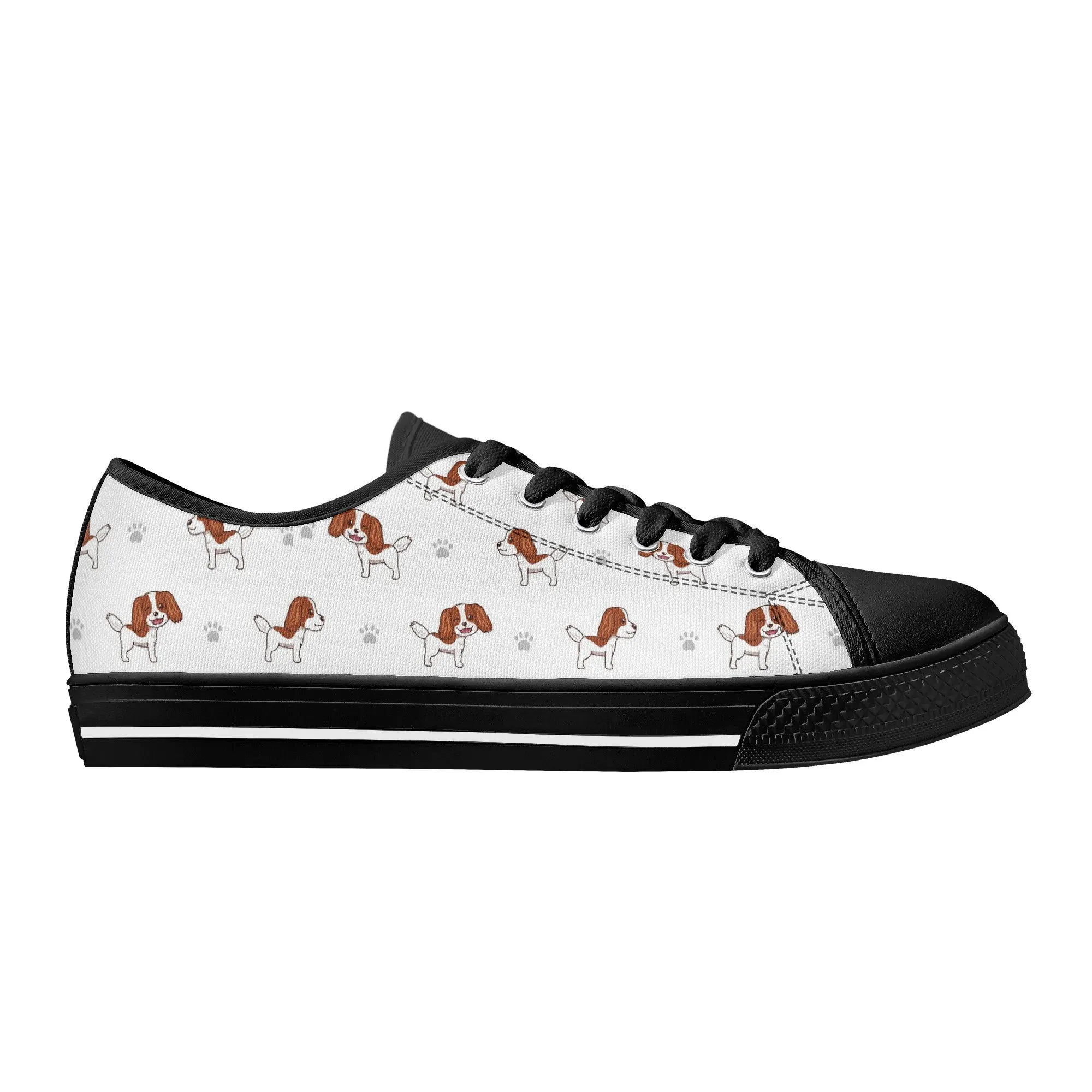 👑 Show off your royal affection with these beautiful low-top canvas shoes featuring an adorable, all-over pattern of the sweet Cavalier King Charles Spaniel (Blenheim pattern). This charming design is a must-have for Cavalier owners and those who adore this gentle breed. These unisex sneakers are constructed for ultimate comfort and durability, making them the perfect footwear for strolls, errands, and any occasion where you want to celebrate your favorite furry friend. Bring a little royalty to your everyday step!