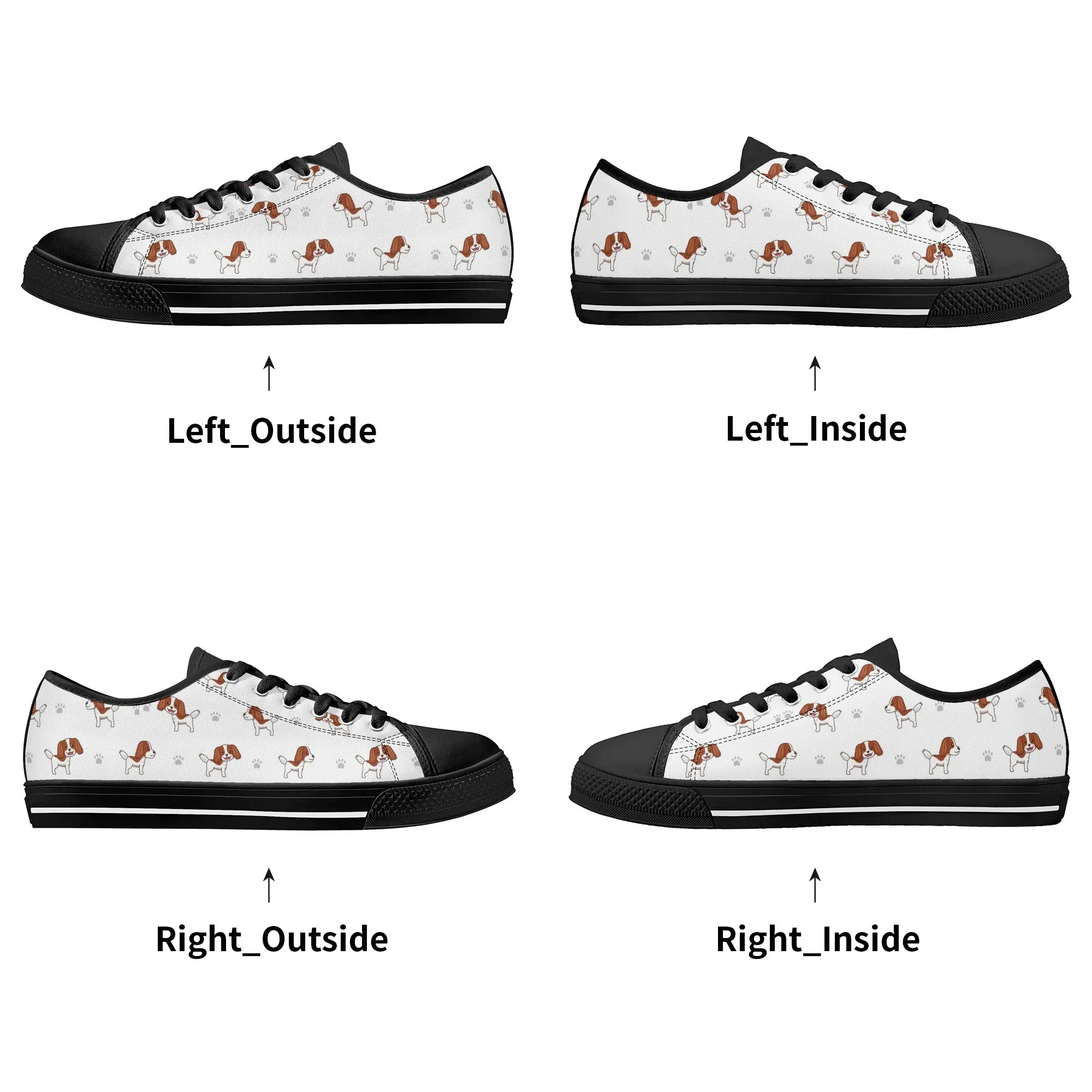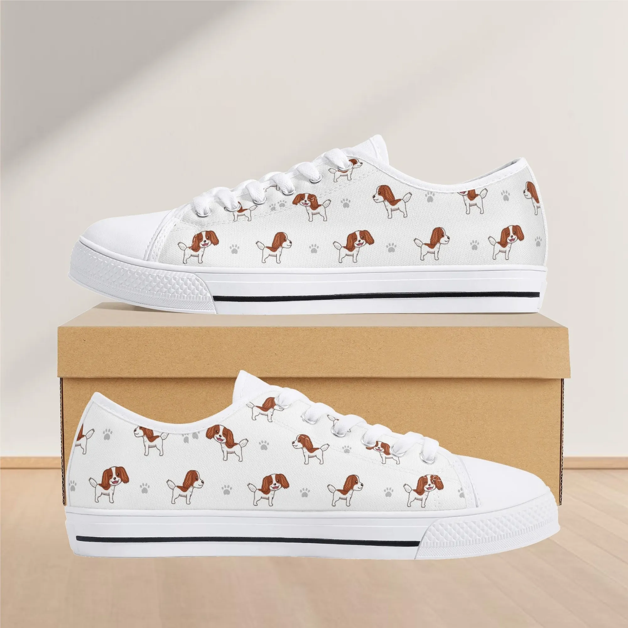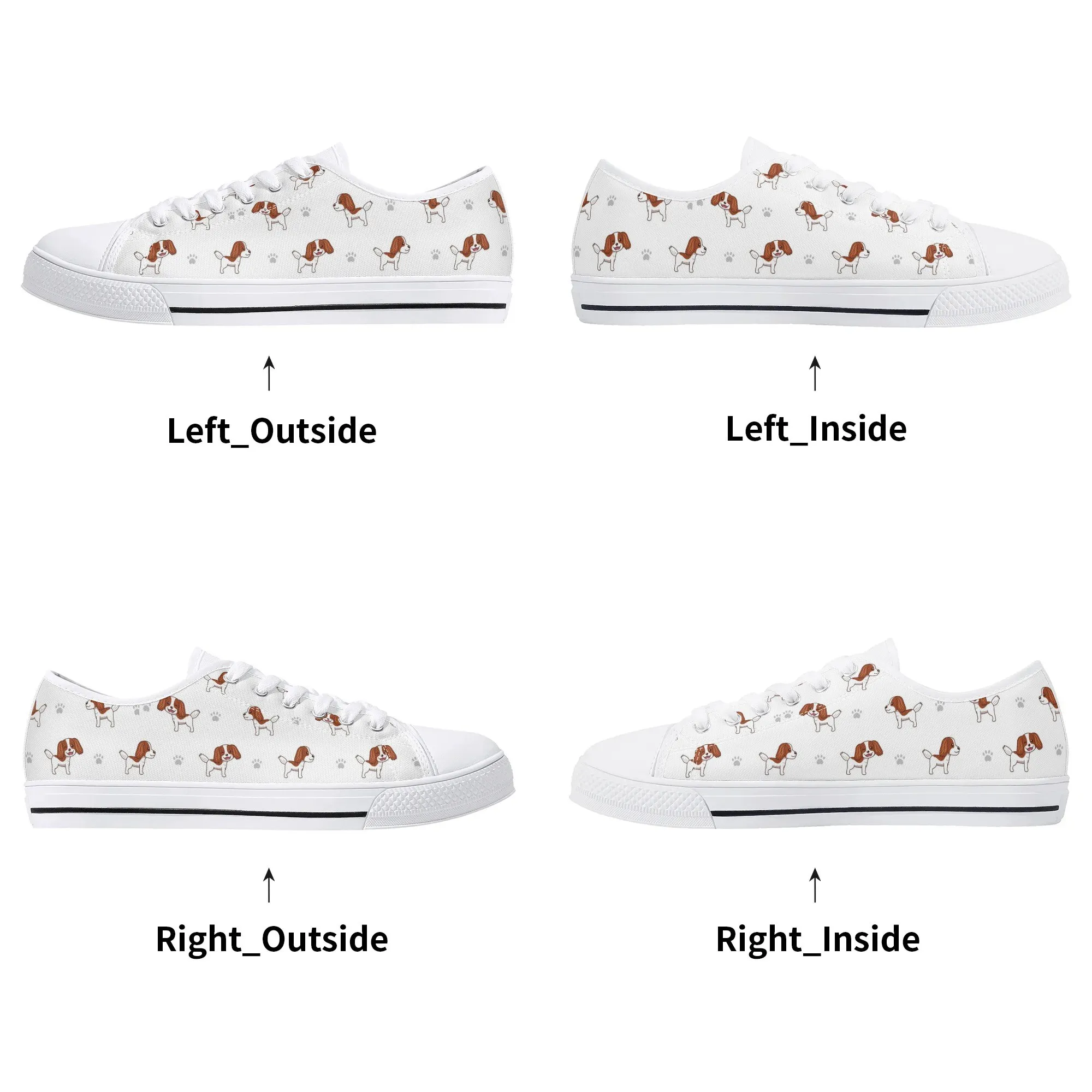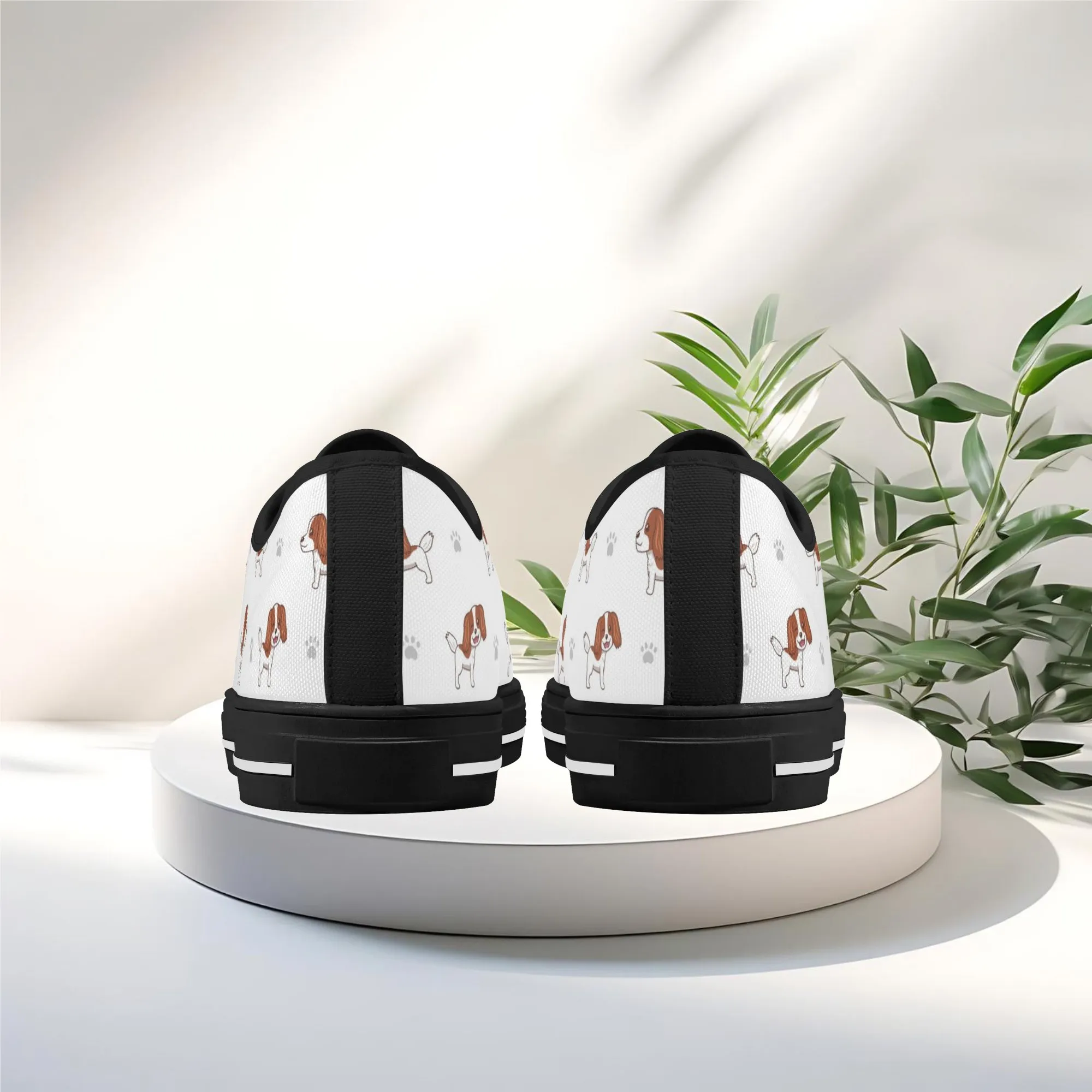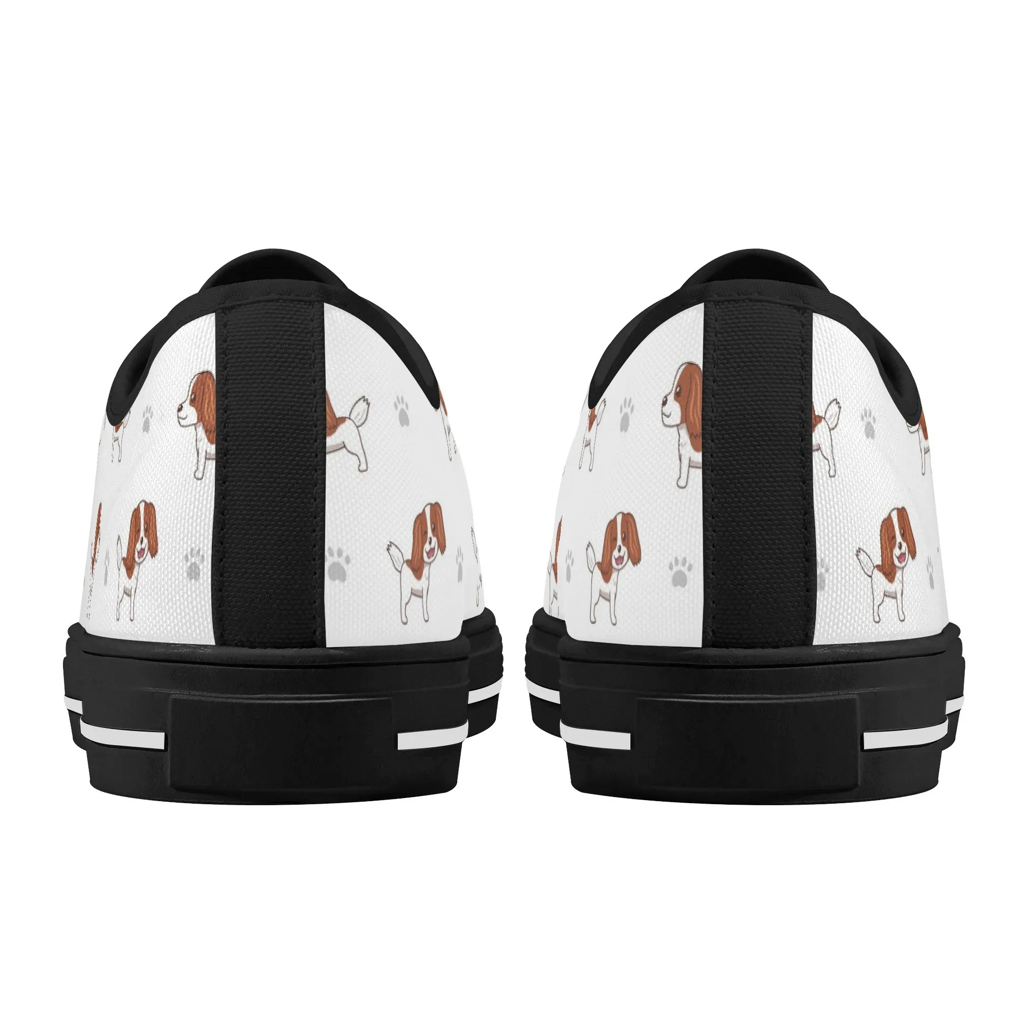 👑 Show off your royal affection with these beautiful low-top canvas shoes featuring an adorable, all-over pattern of the sweet Cavalier King Charles Spaniel (Blenheim pattern). This charming design is a must-have for Cavalier owners and those who adore this gentle breed. These unisex sneakers are constructed for ultimate comfort and durability, making them the perfect footwear for strolls, errands, and any occasion where you want to celebrate your favorite furry friend. Bring a little royalty to your everyday step!