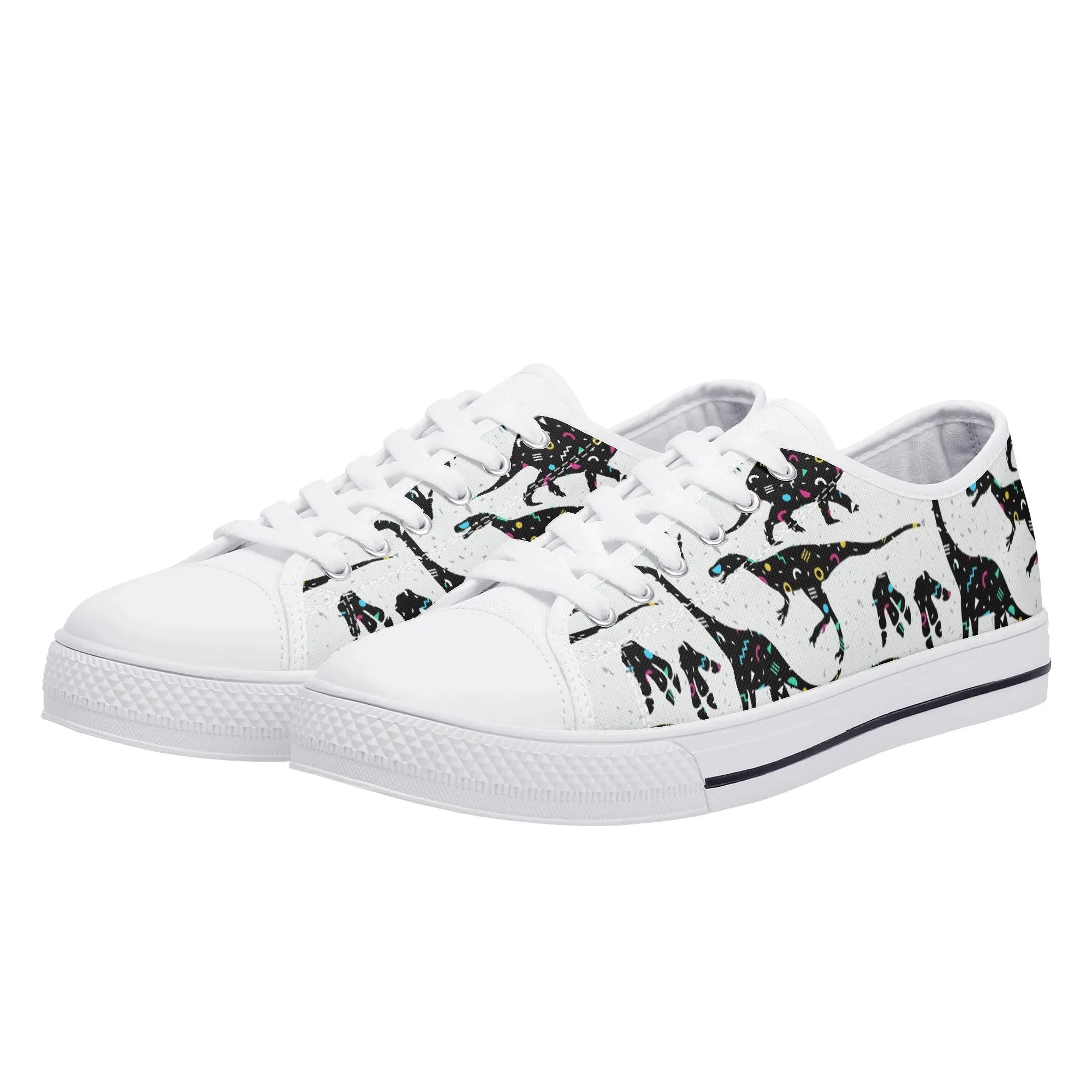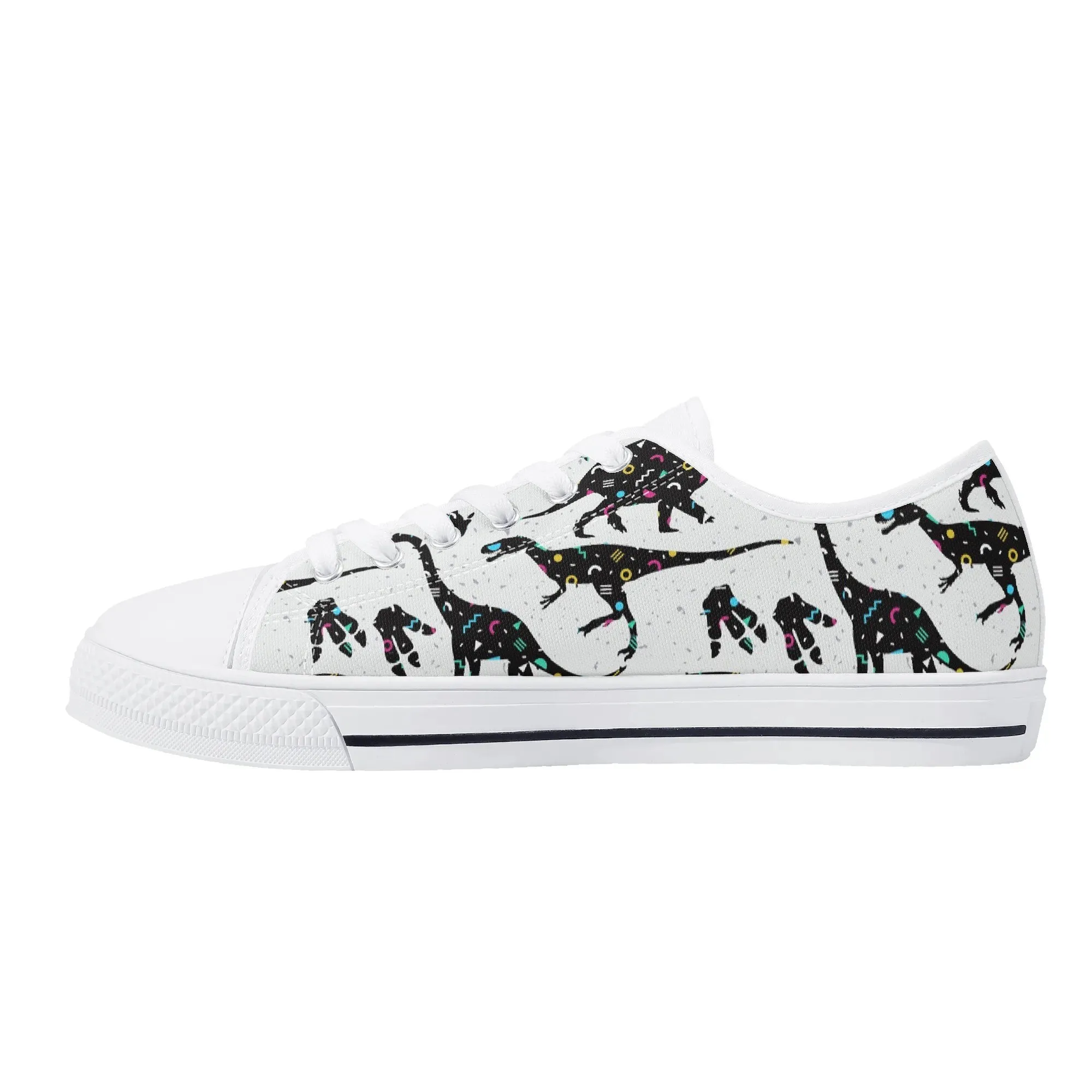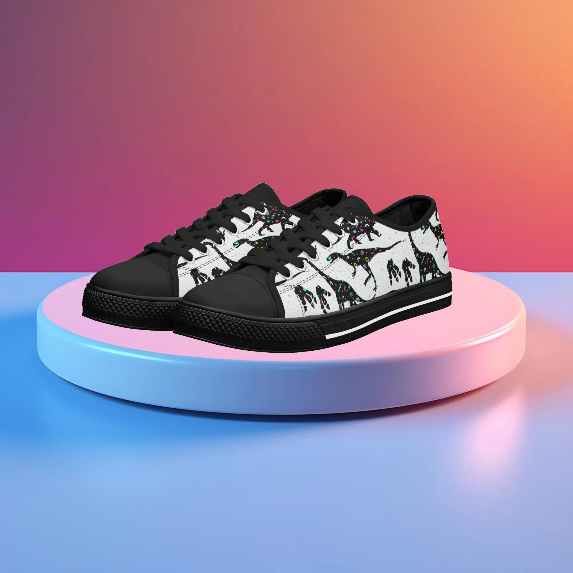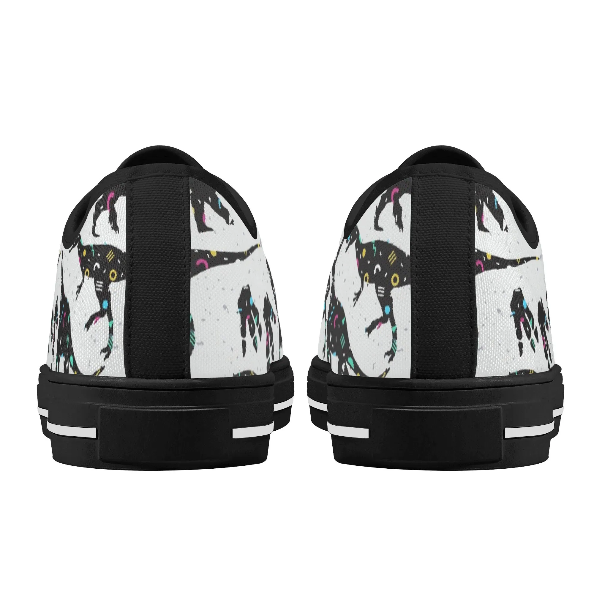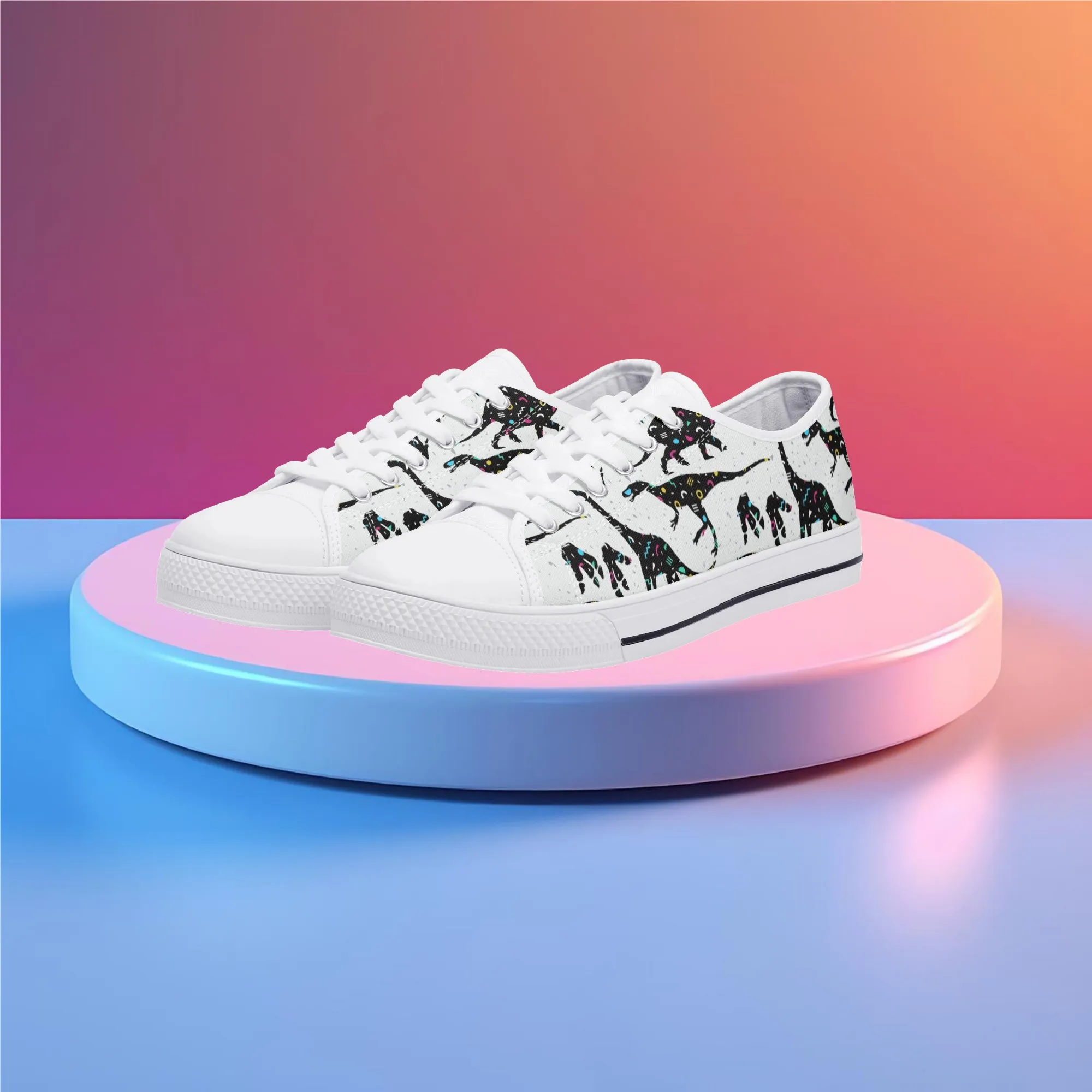 🌌 Take a cosmic journey back in time with these Galaxy Dinosaur Low Top Canvas Shoes! Featuring bold, black dinosaur silhouettes filled with a magical, colorful moon and star pattern, these sneakers are a captivating mix of prehistoric wonder and celestial aesthetic. The unique, eye-catching design paired with the comfortable platform sole makes them an ideal statement piece for everyday wear, perfect for stargazers, science lovers, and anyone with a love for bold, artistic footwear.
