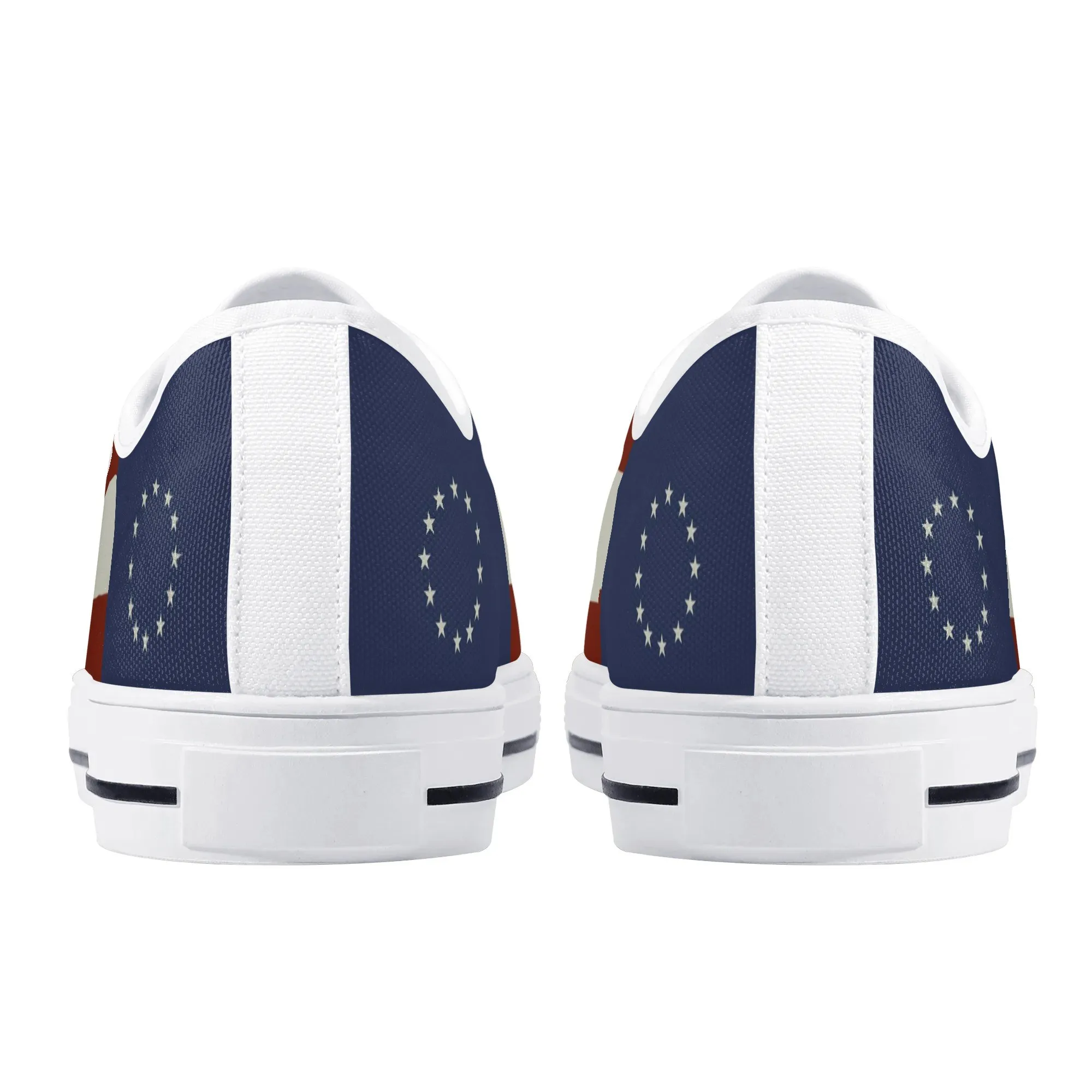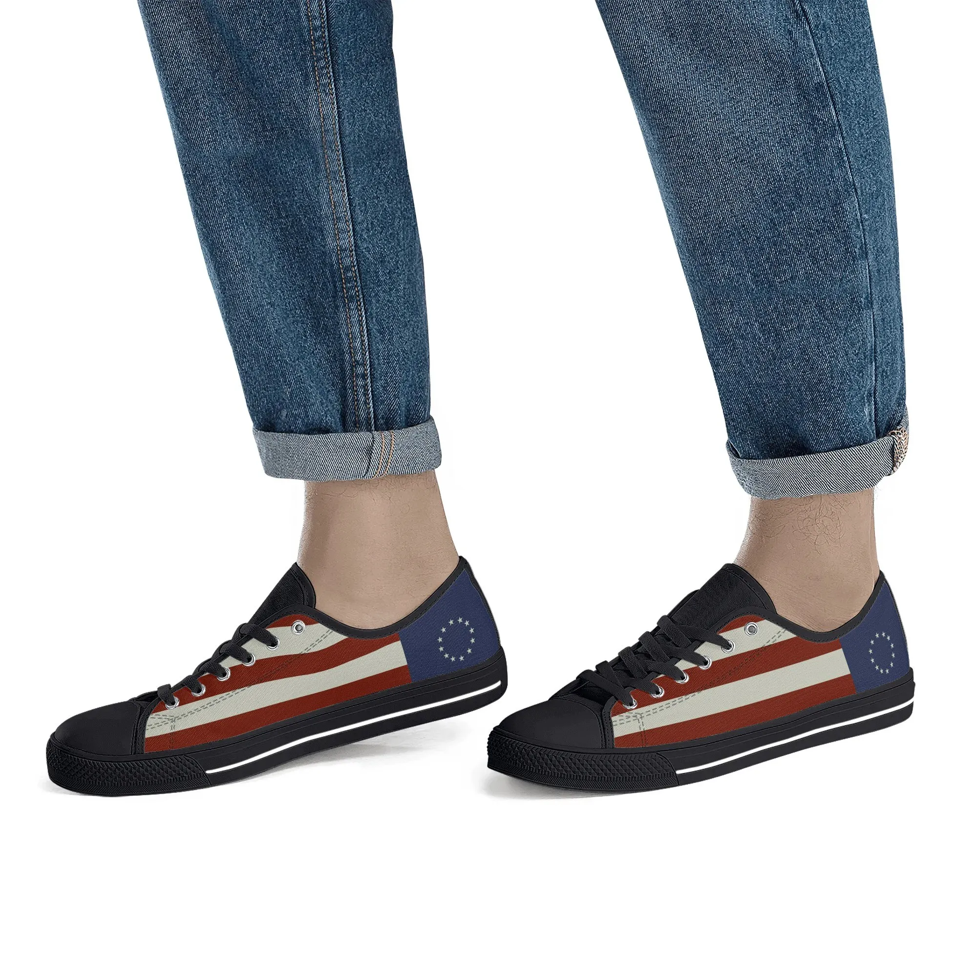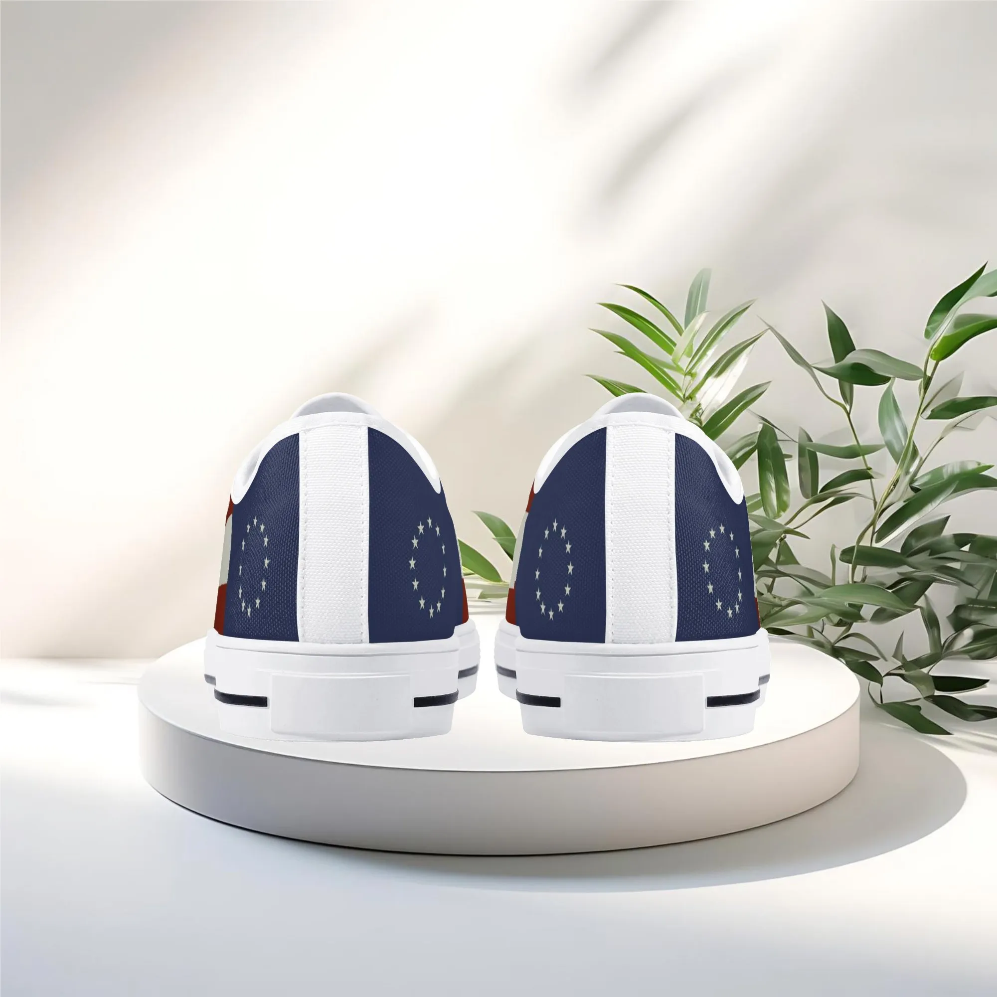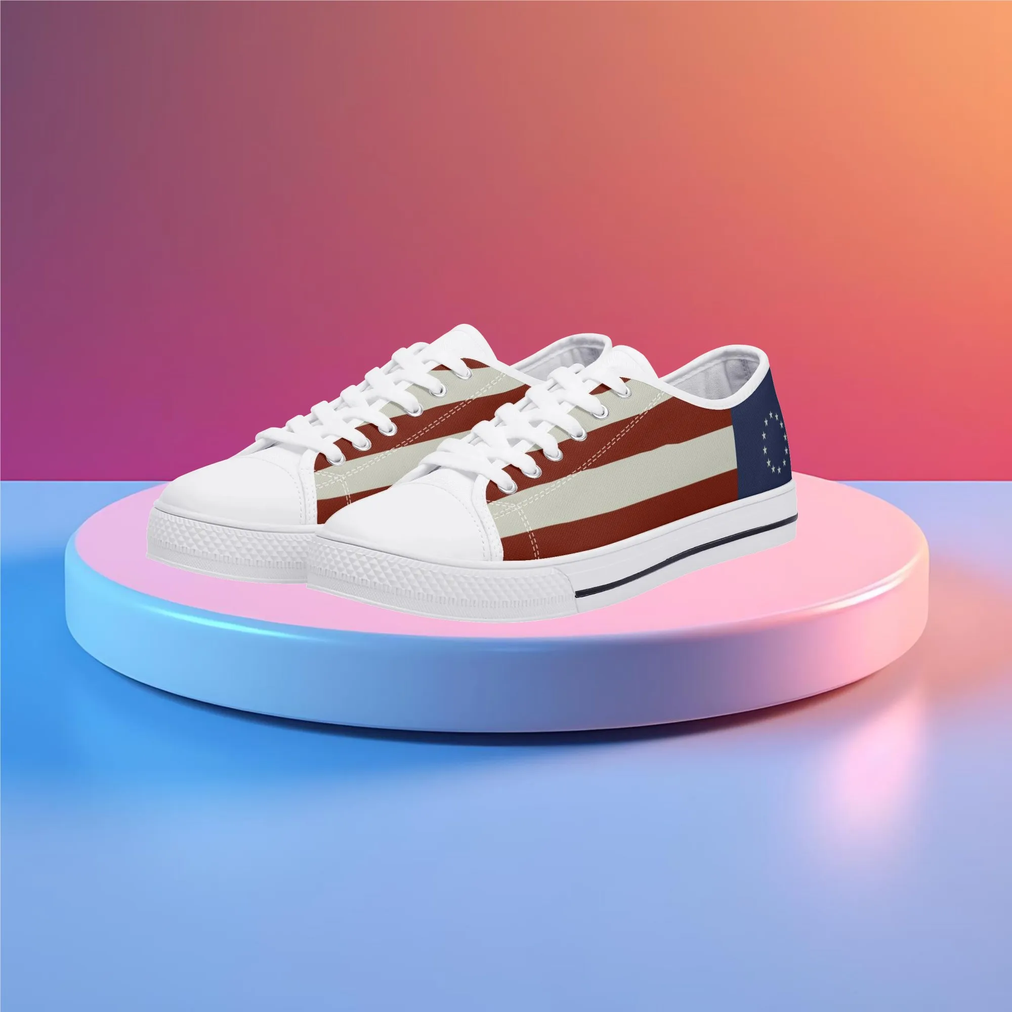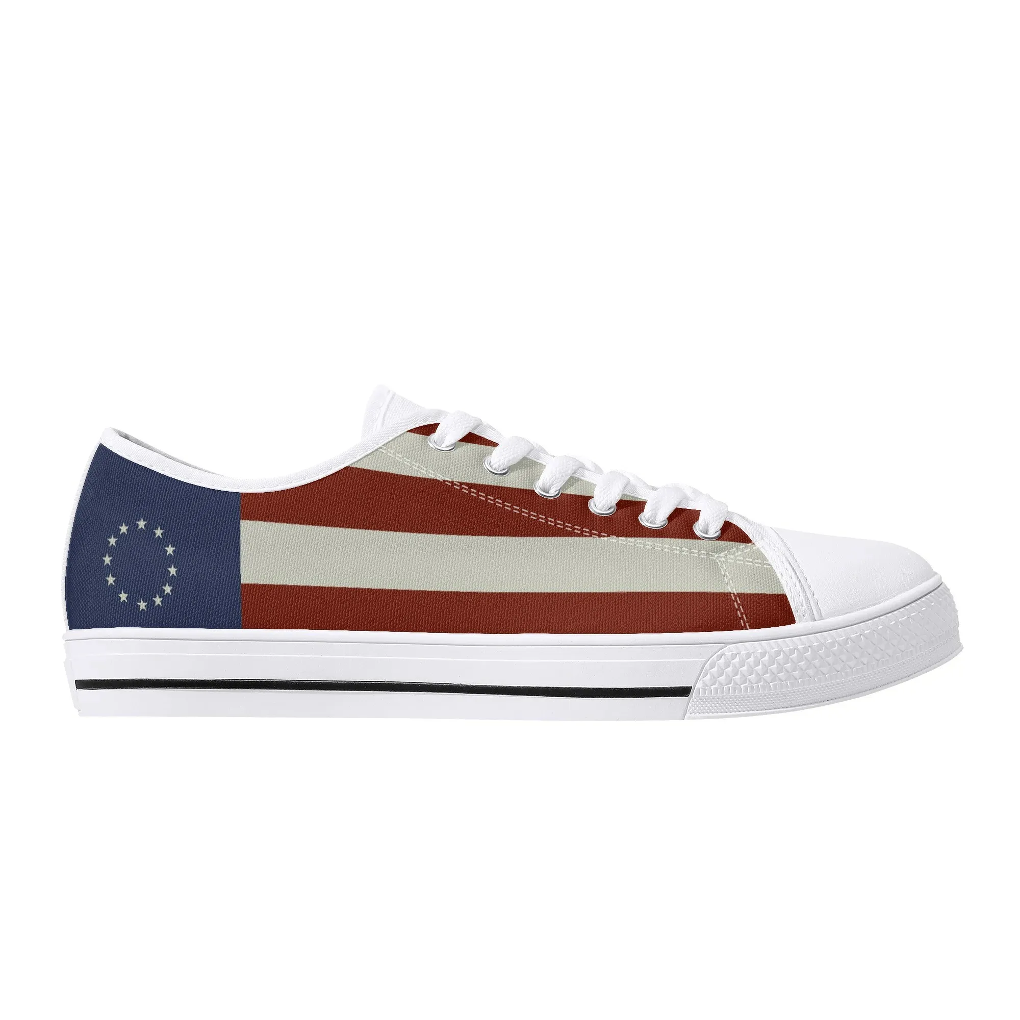Show your reverence for American history with these unique Vintage Betsy Ross Flag Low Top Canvas Shoes! Featuring the iconic distressed 13-star circle design from the early United States, these sneakers are perfect for history buffs, patriotic holidays, and anyone who appreciates the nation’s heritage. They are comfortable, durable, and a timeless way to showcase your pride. For a truly special statement, customize these shoes with your name, a patriotic phrase, or a significant date!