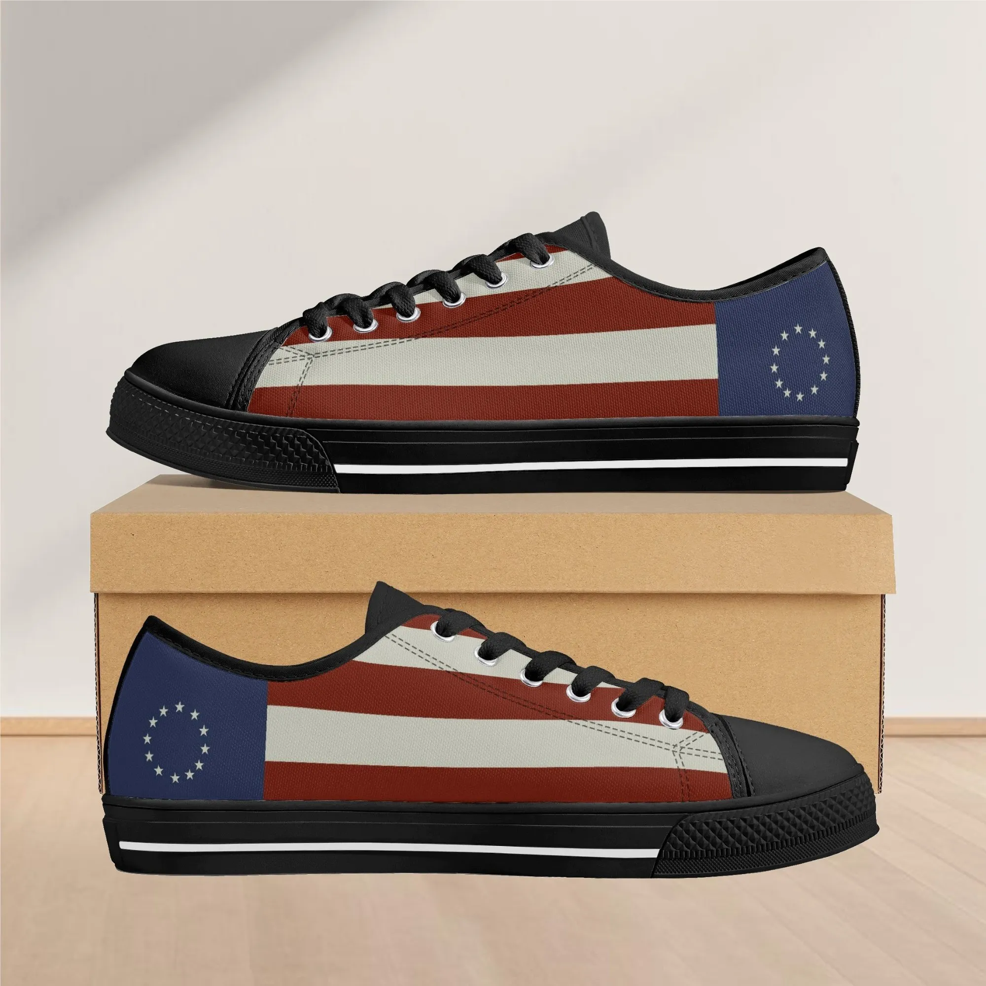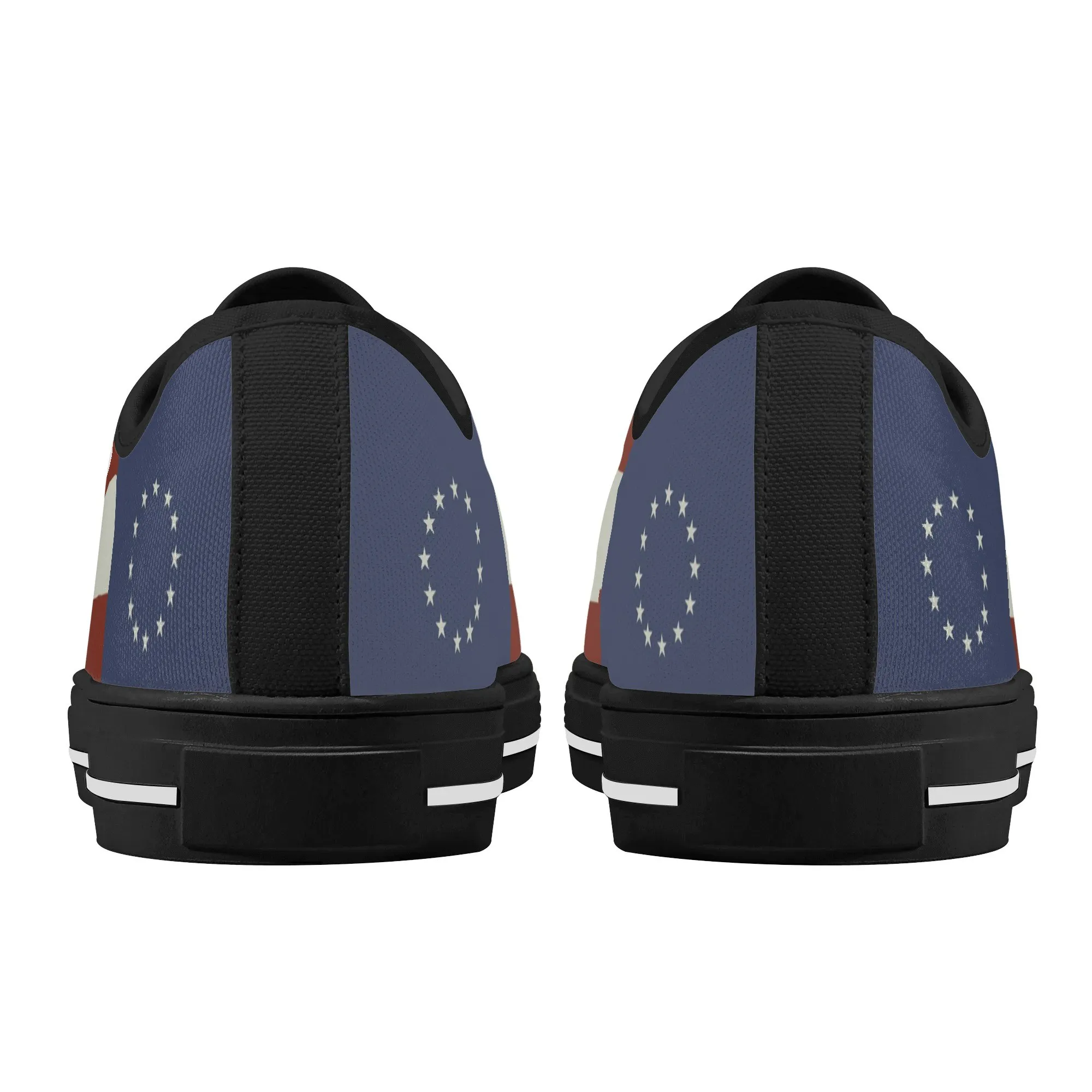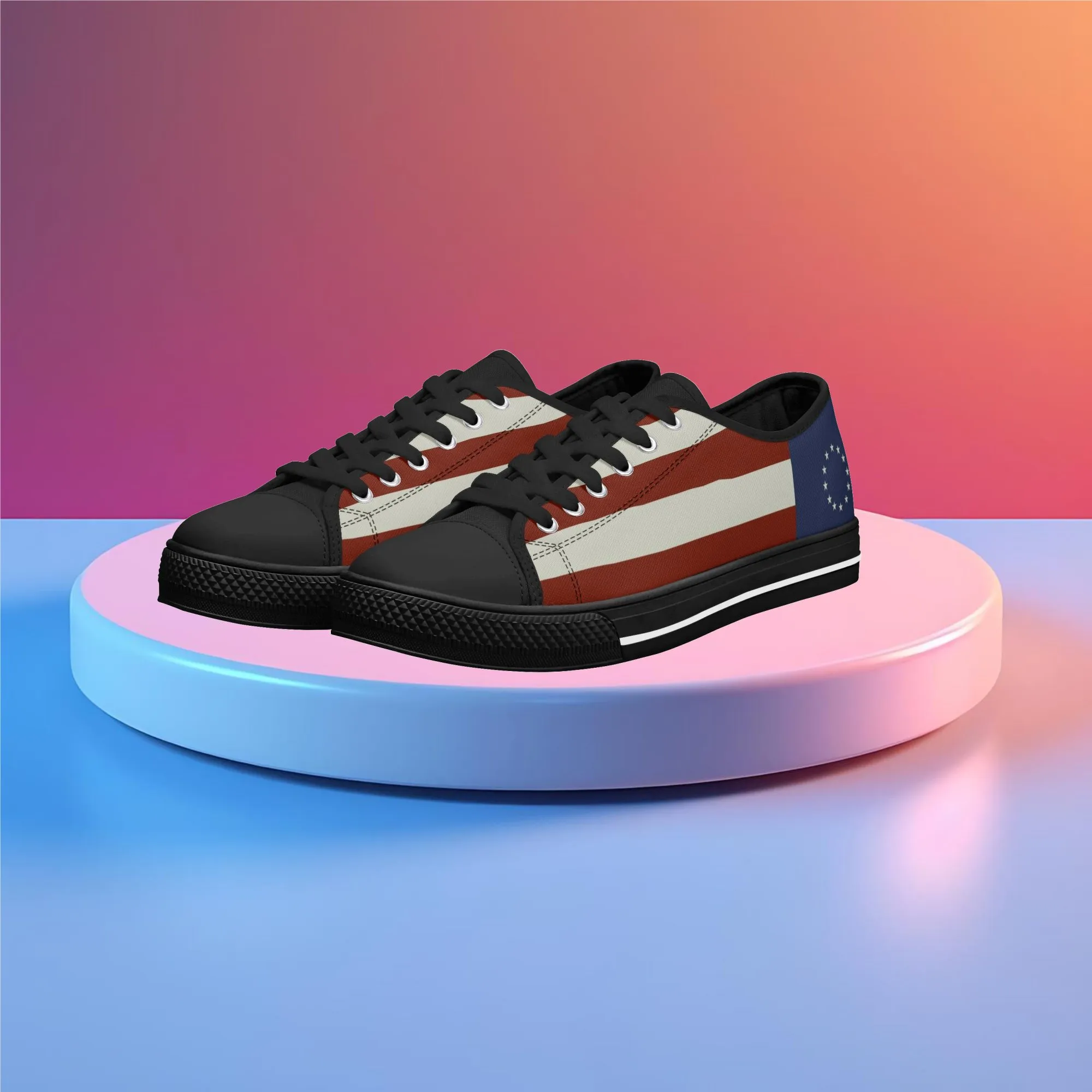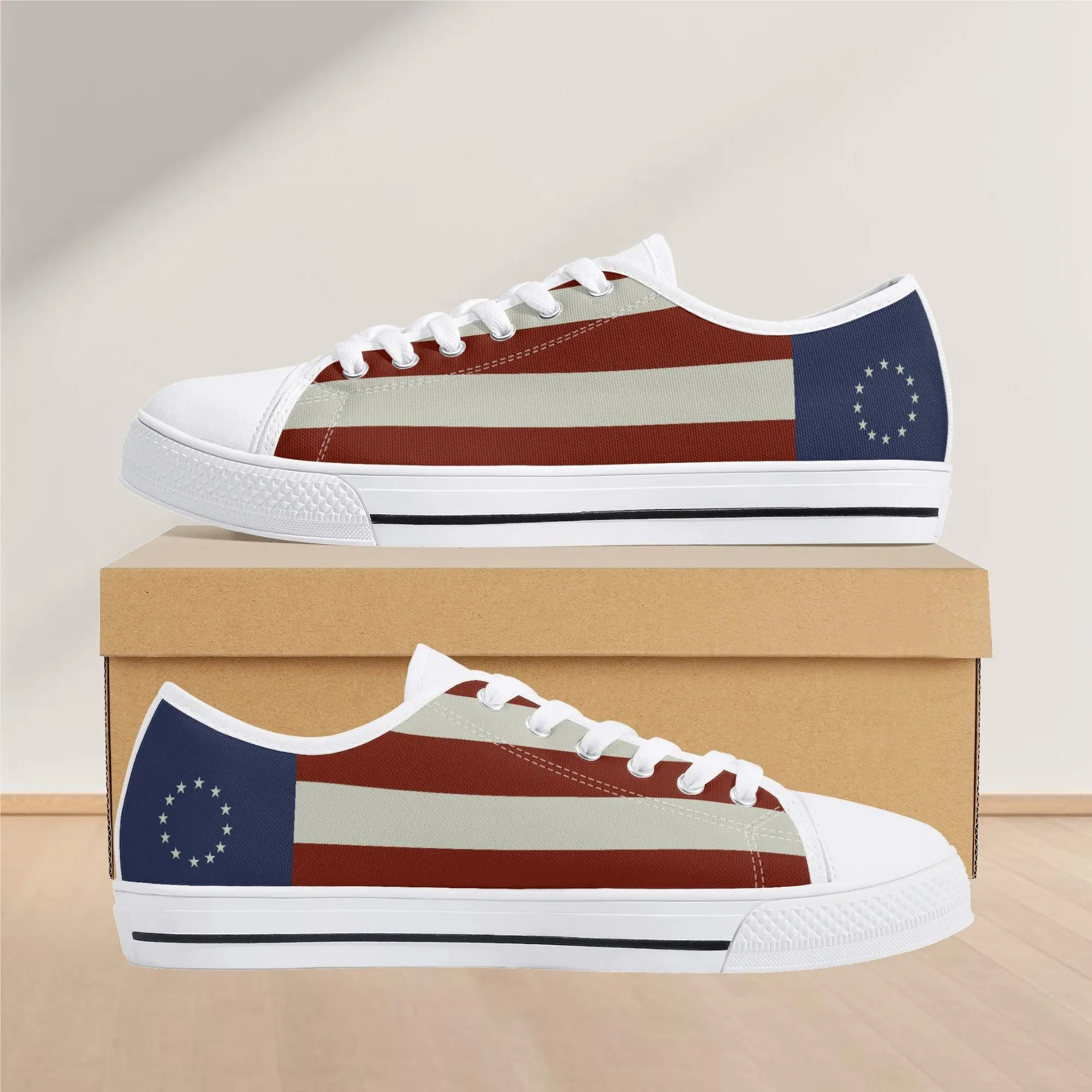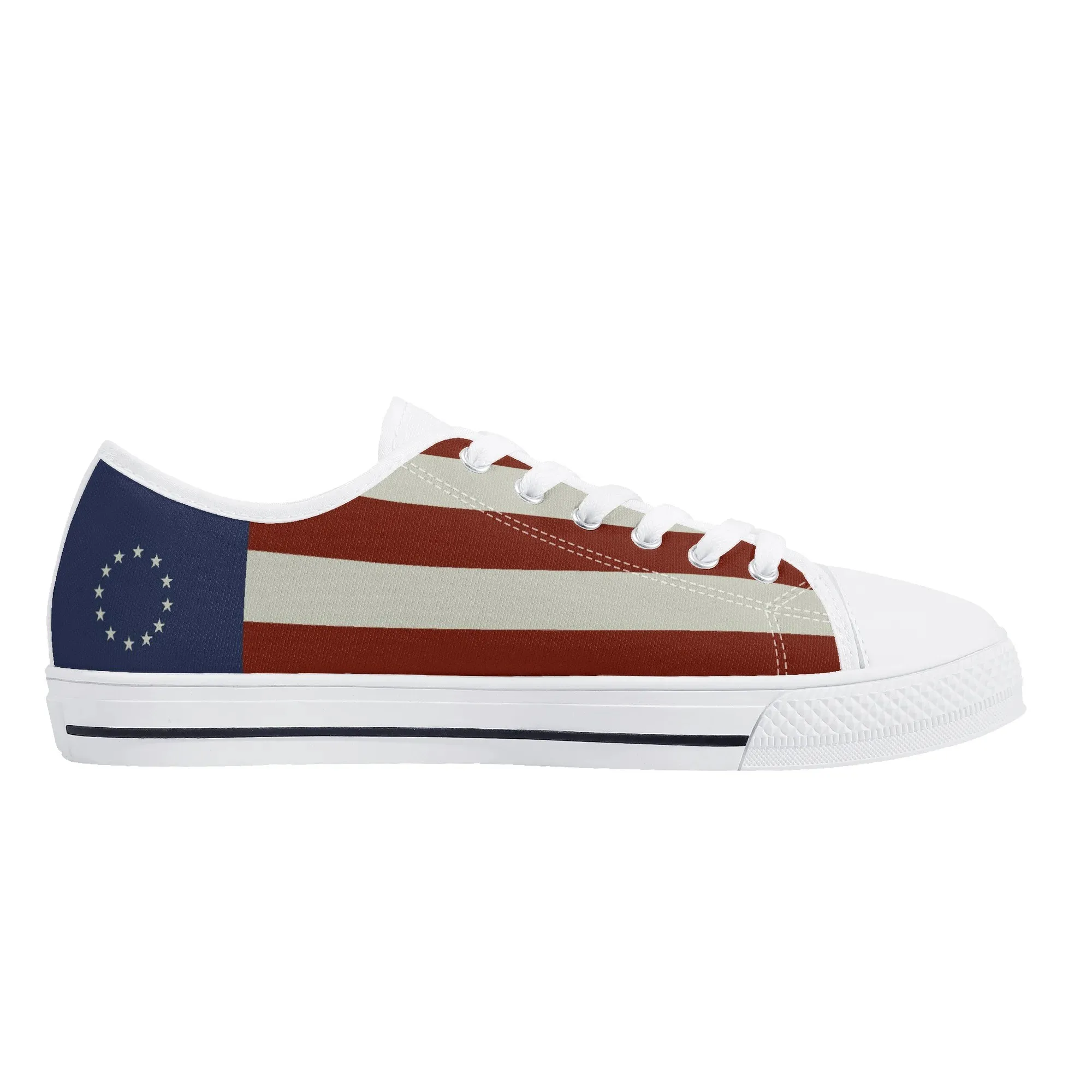 Show your reverence for American history with these unique Vintage Betsy Ross Flag Low Top Canvas Shoes! Featuring the iconic distressed 13-star circle design from the early United States, these sneakers are perfect for history buffs, patriotic holidays, and anyone who appreciates the nation’s heritage. They are comfortable, durable, and a timeless way to showcase your pride. For a truly special statement, customize these shoes with your name, a patriotic phrase, or a significant date!