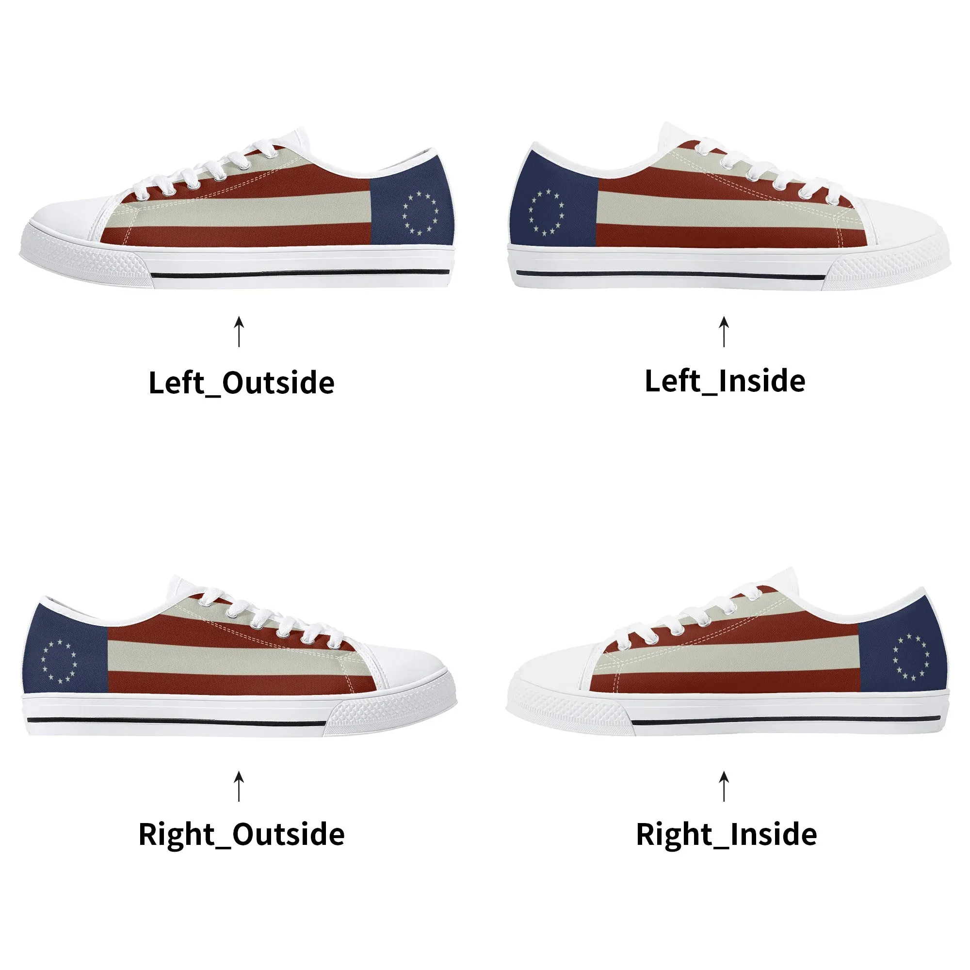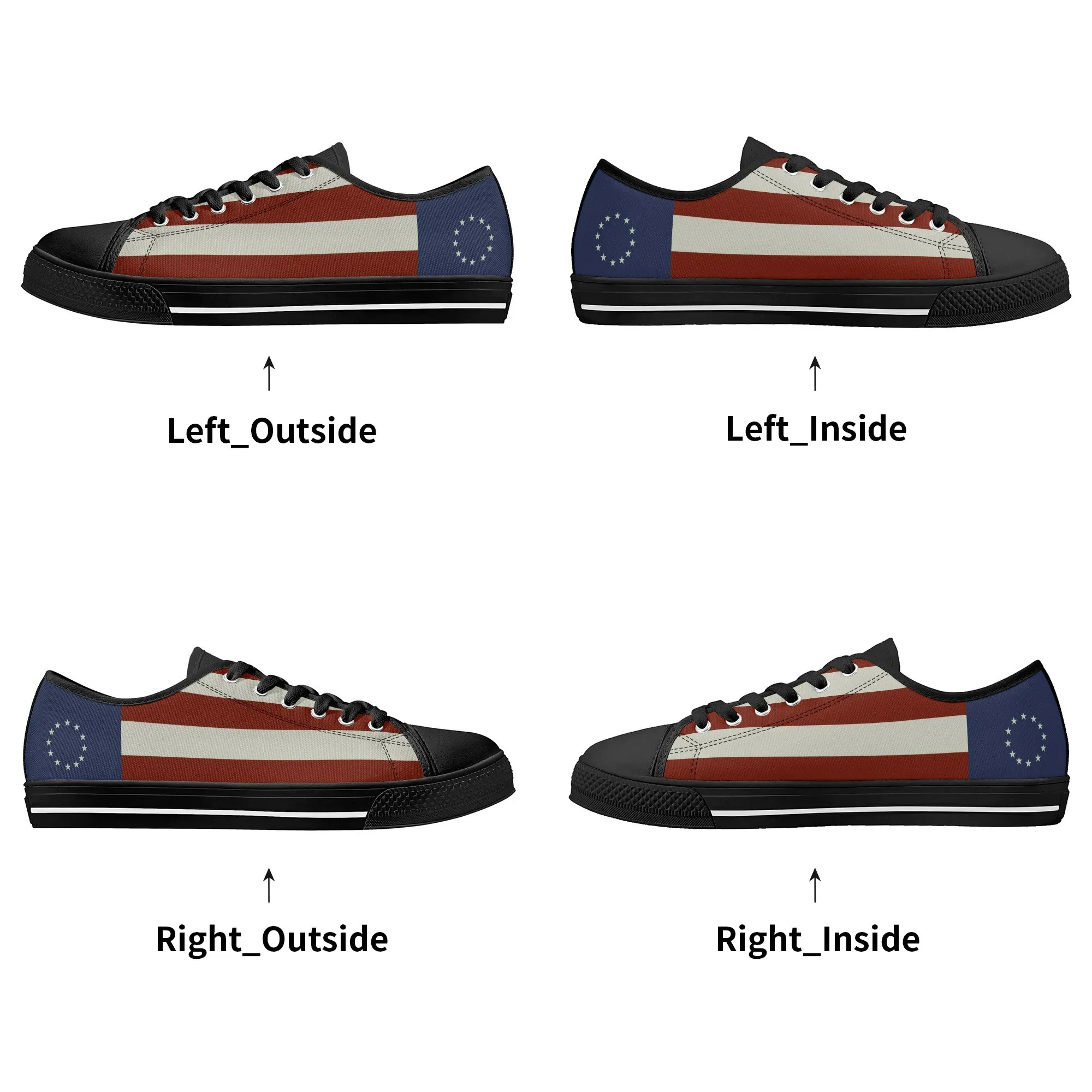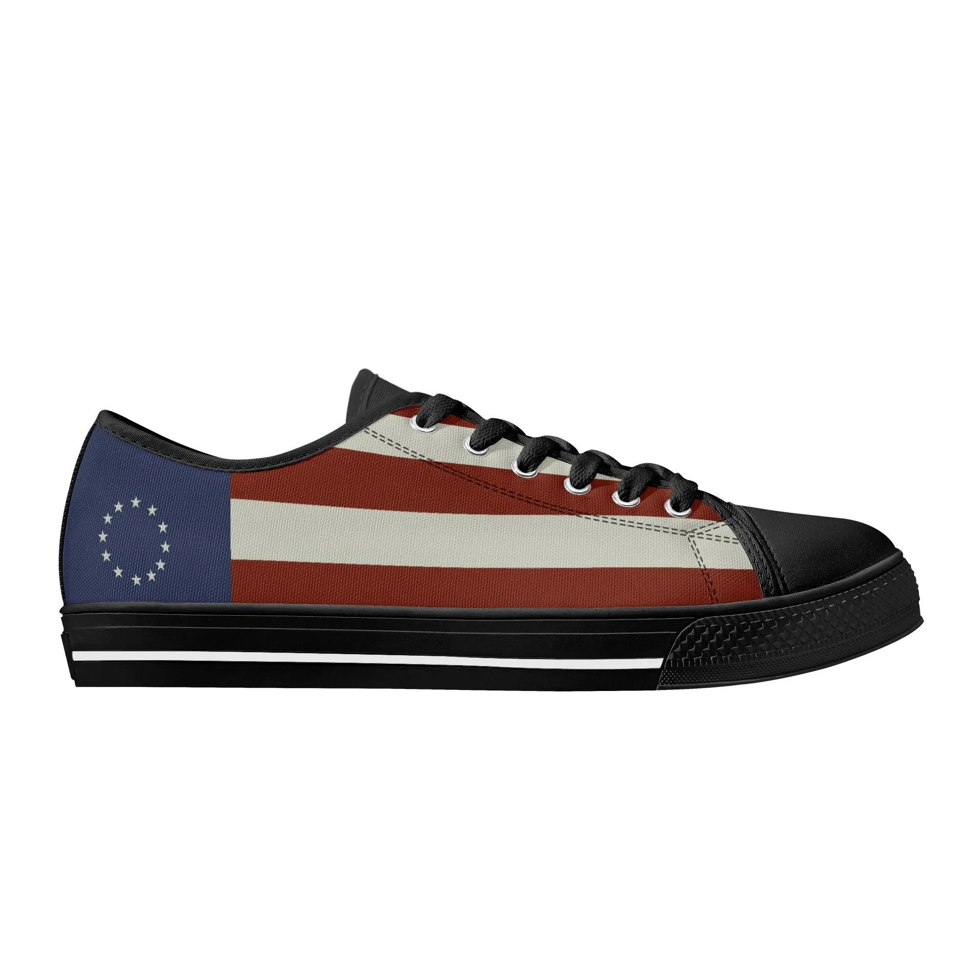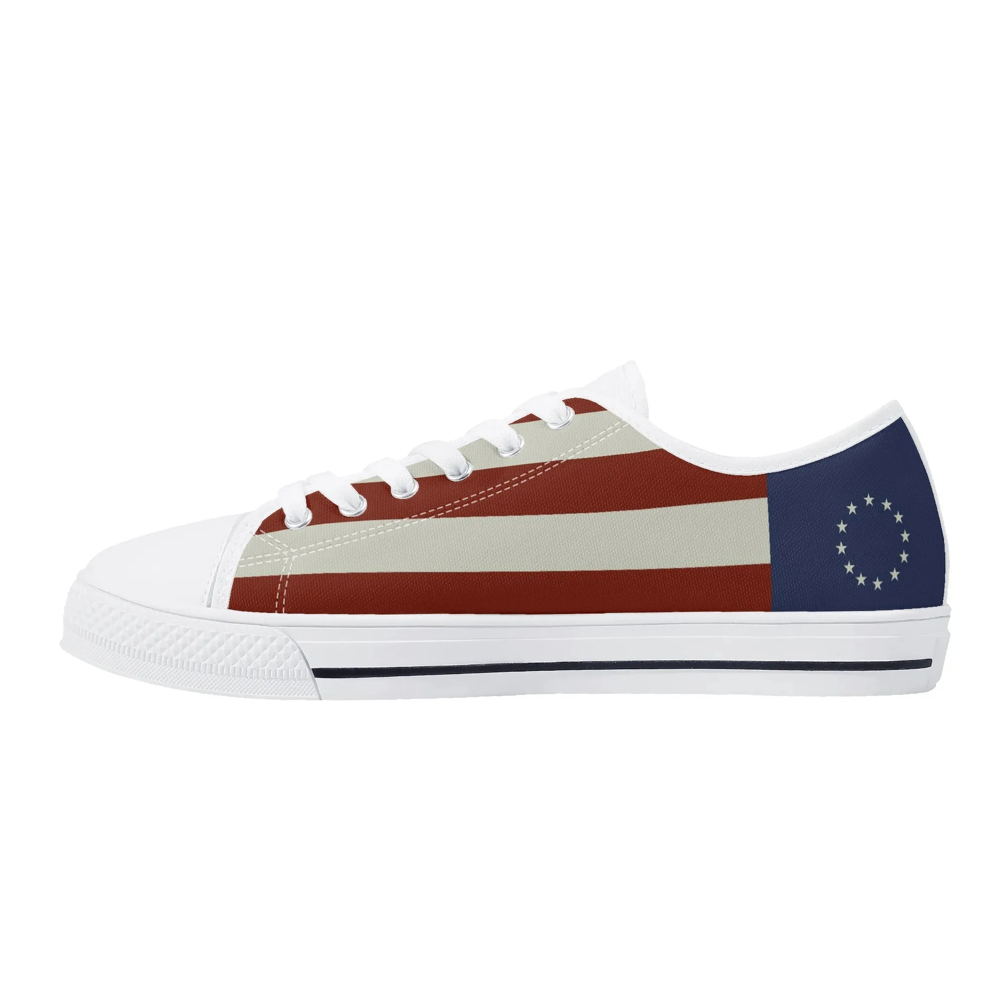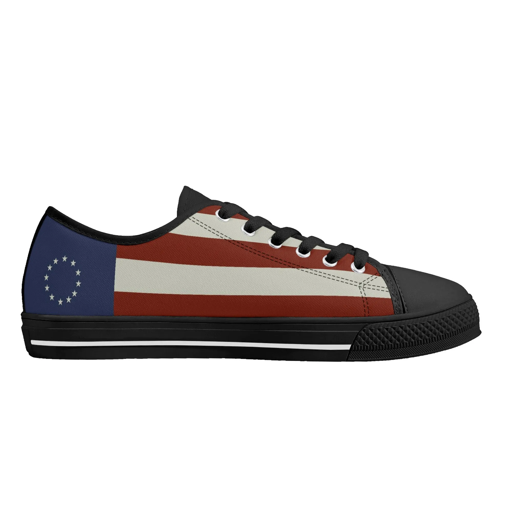 Show your reverence for American history with these unique Vintage Betsy Ross Flag Low Top Canvas Shoes! Featuring the iconic distressed 13-star circle design from the early United States, these sneakers are perfect for history buffs, patriotic holidays, and anyone who appreciates the nation’s heritage. They are comfortable, durable, and a timeless way to showcase your pride. For a truly special statement, customize these shoes with your name, a patriotic phrase, or a significant date!
