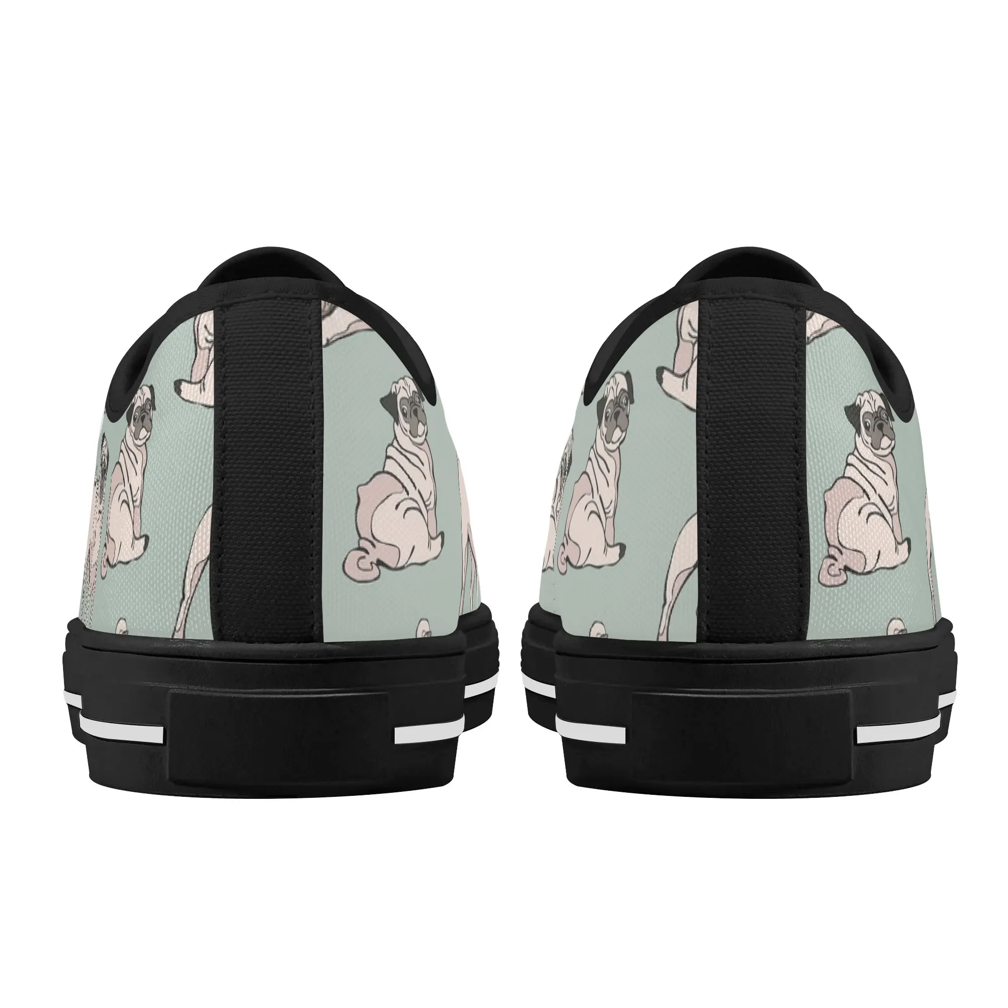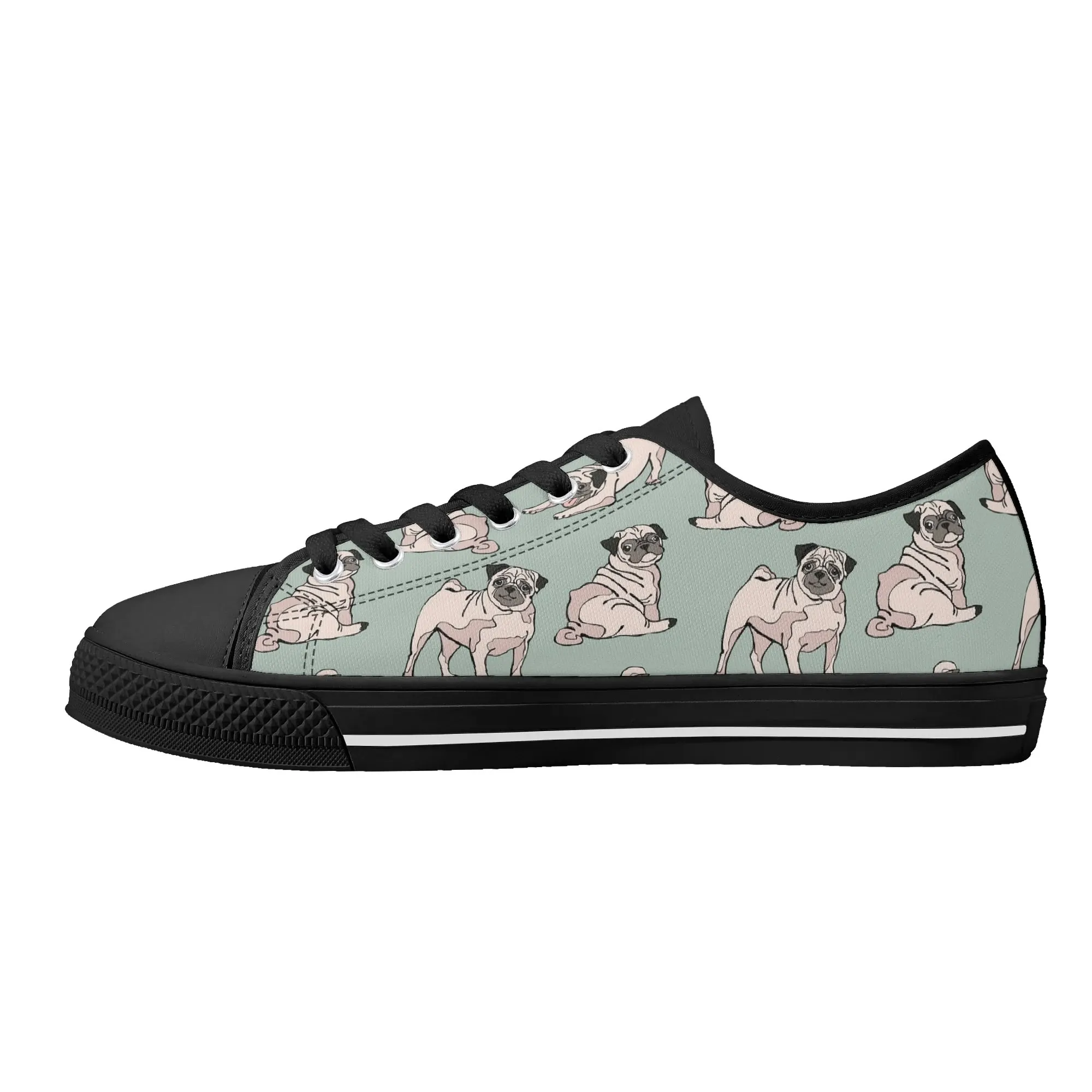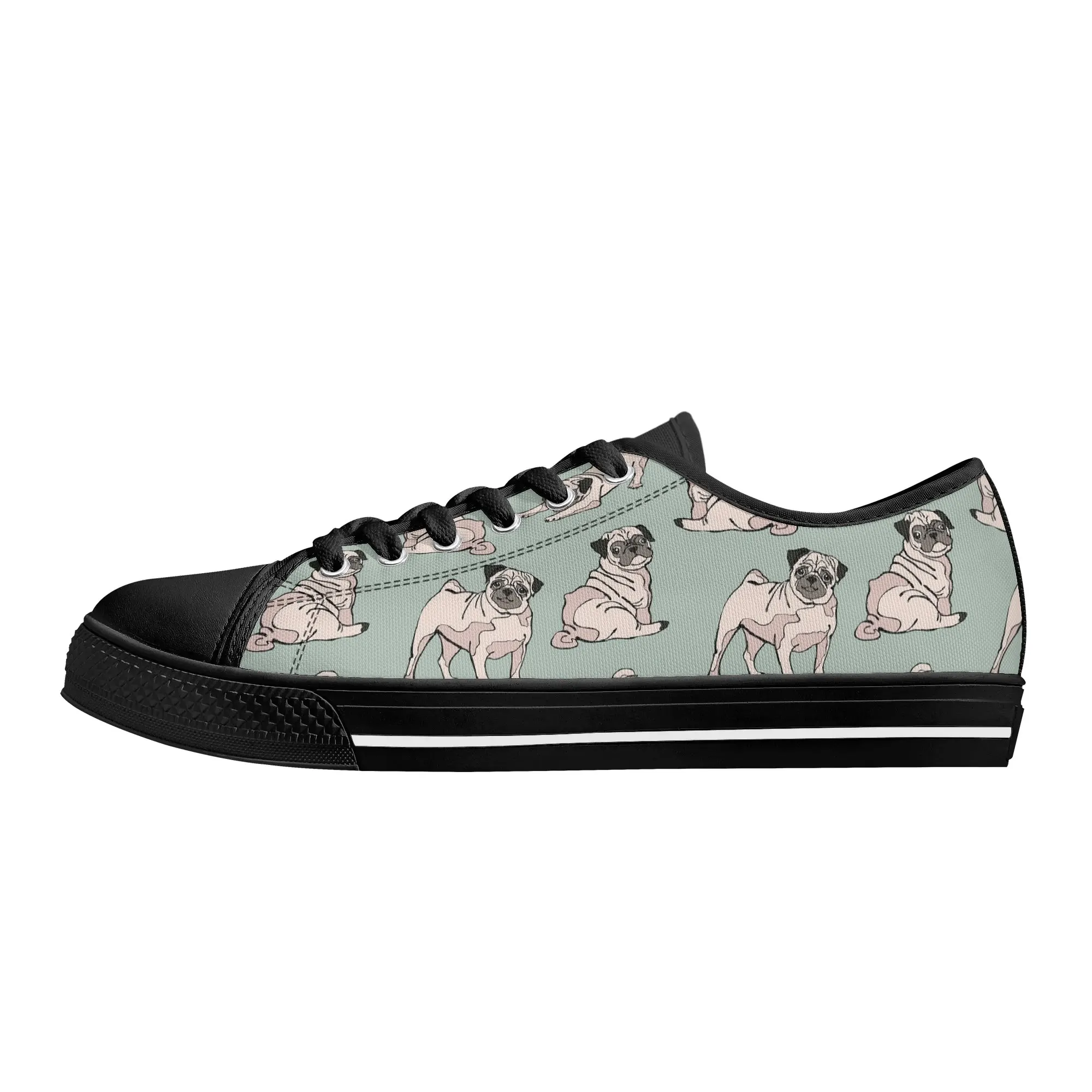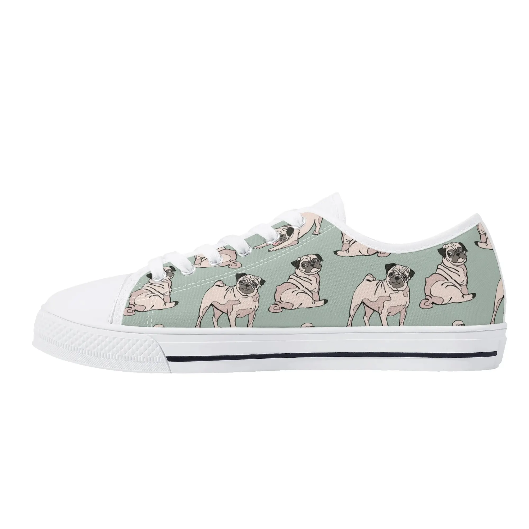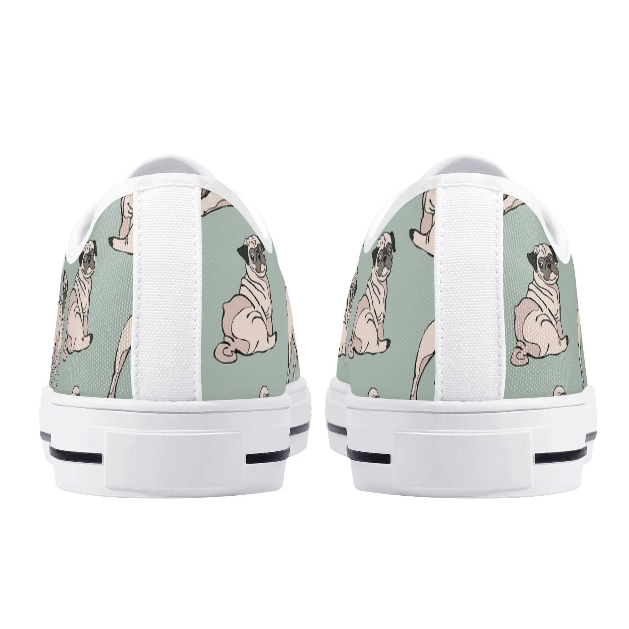 Snuggle up to style with these adorable Pug Dog Pattern Low Top Canvas Shoes! Featuring a repeating pattern of sweet, fawn-colored Pugs with their signature smushed faces on a calming light sage green background, these sneakers are the perfect footwear for Pug owners, dog moms, and anyone who loves this charming breed. They are comfortable, durable, and bring a smile to everyone you pass. For the ultimate personalized pet tribute, customize these shoes with your name, your Pug’s name, or a funny “Pug Life” phrase!