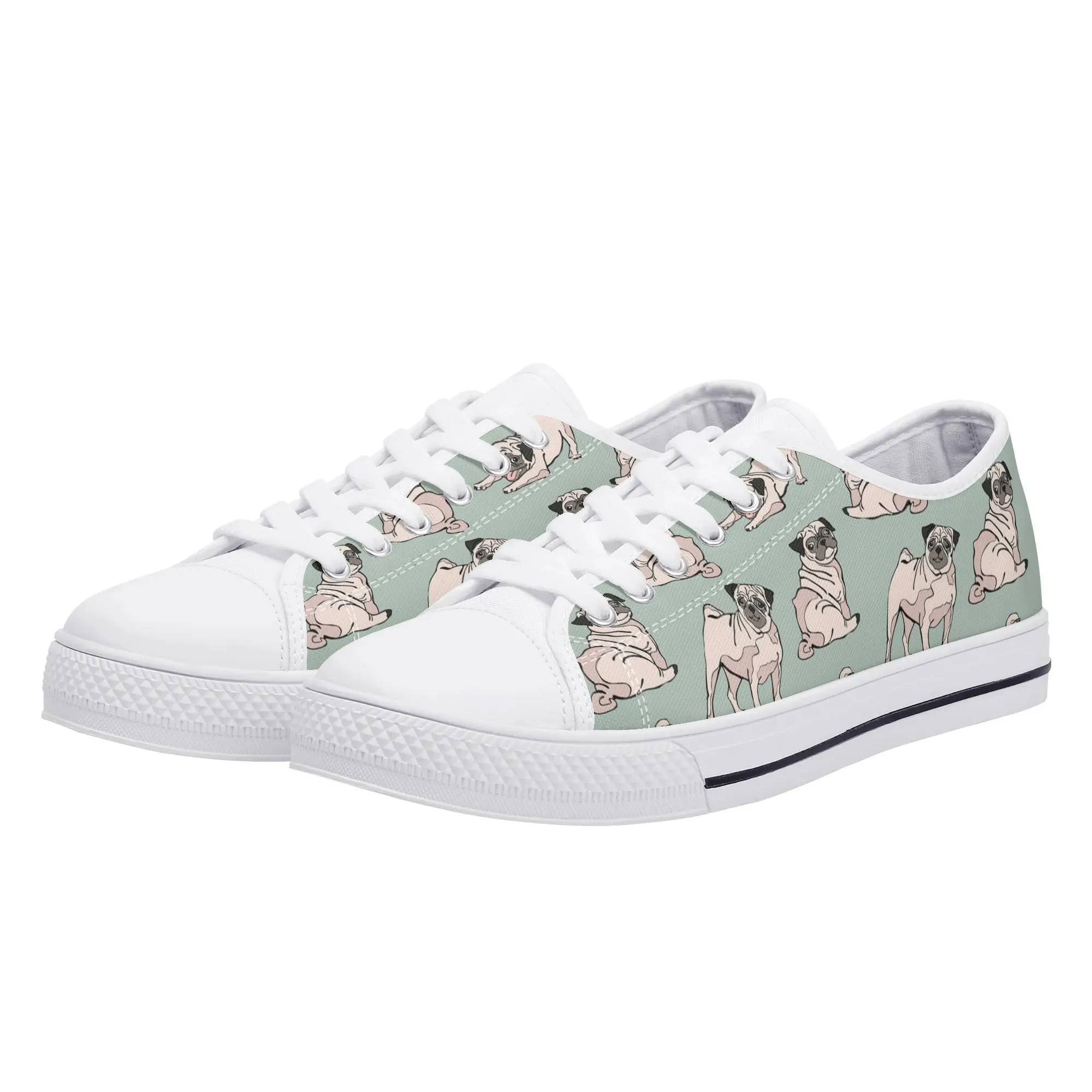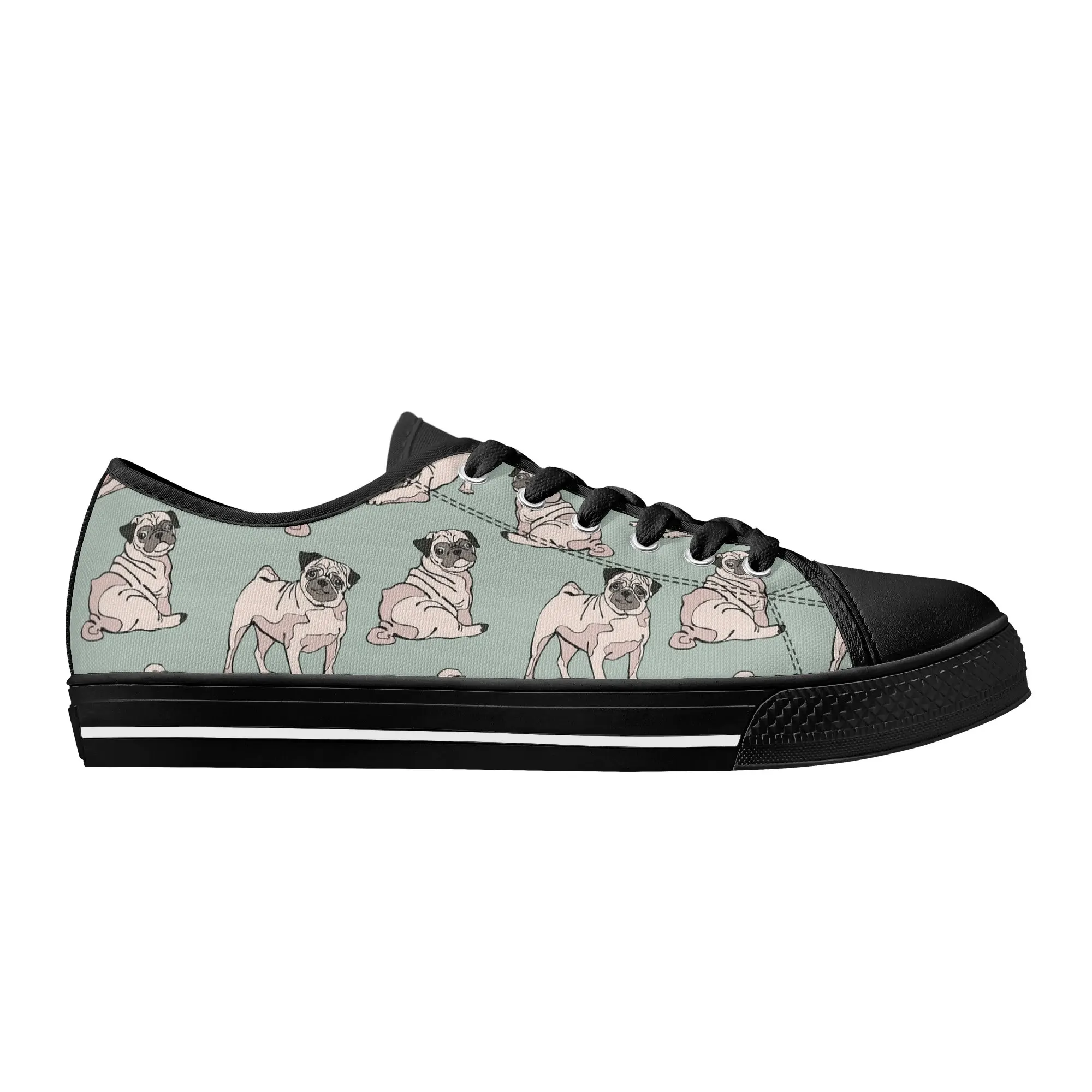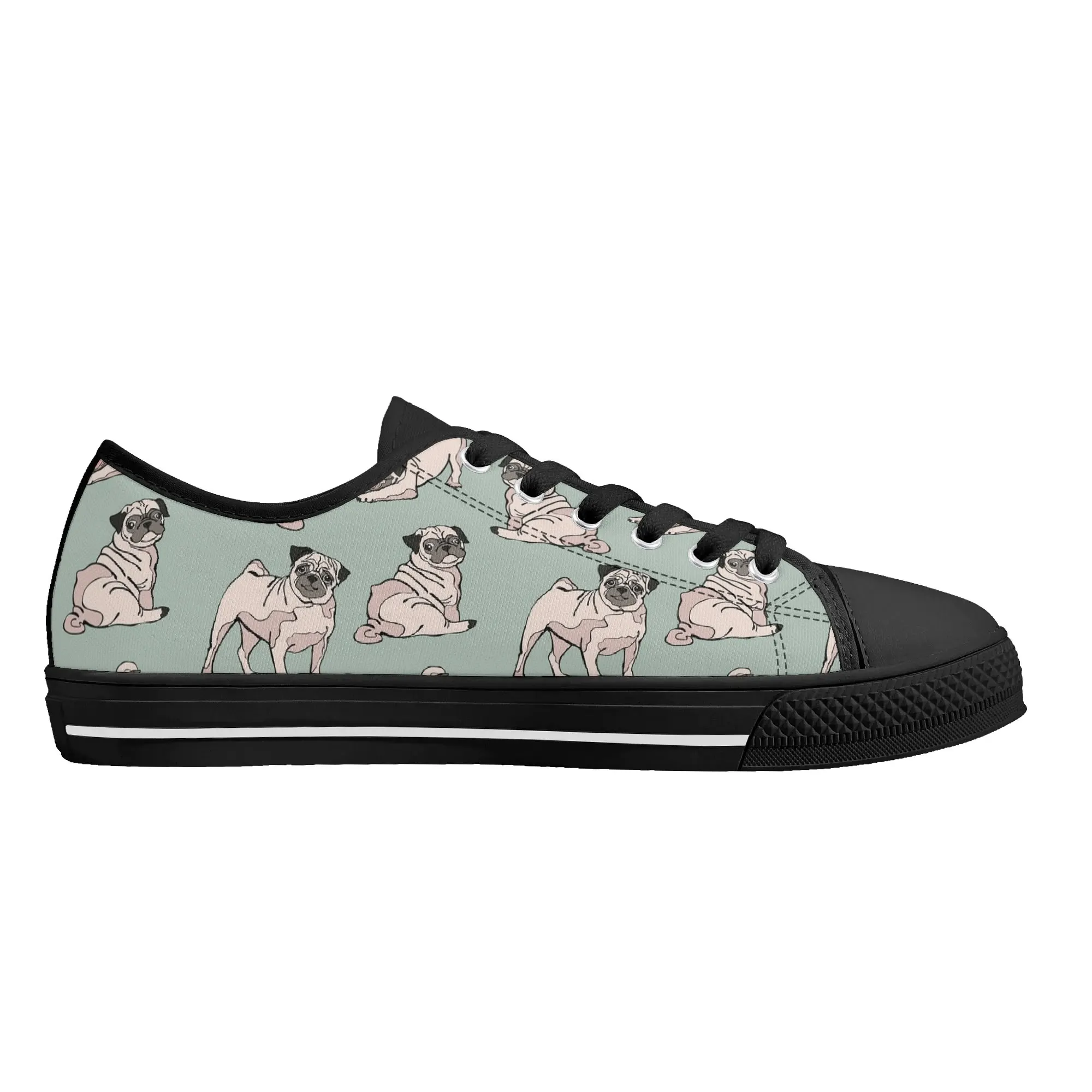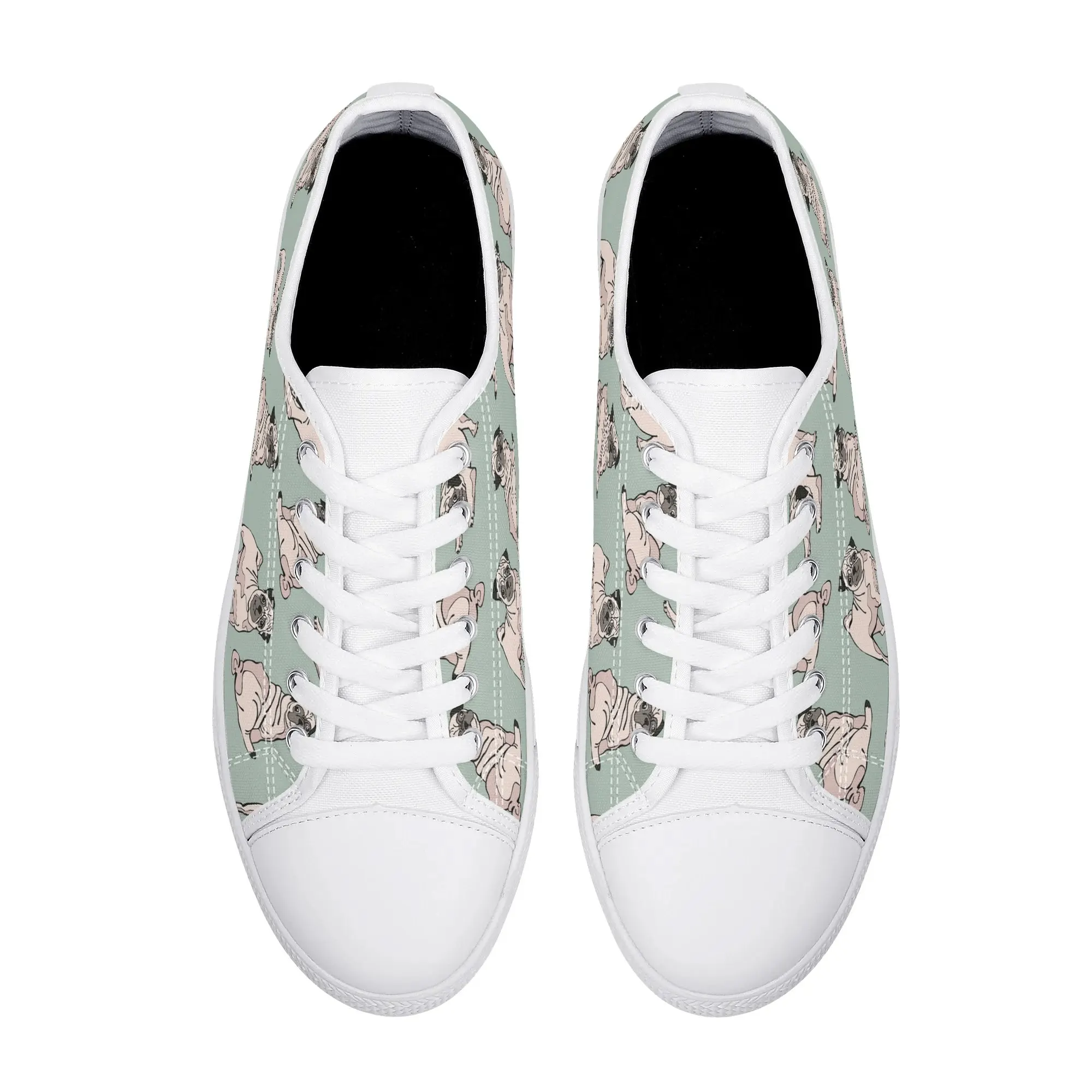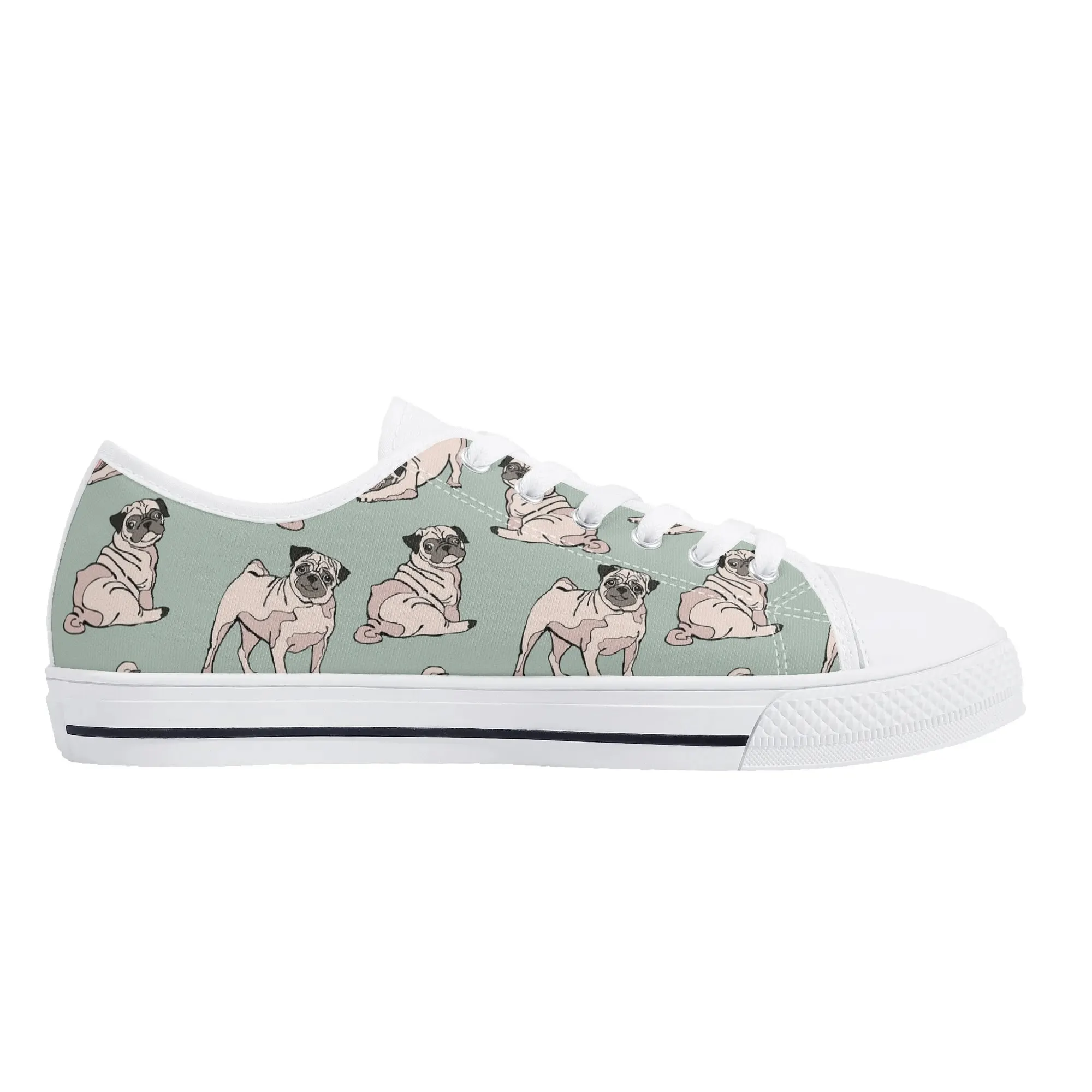 Snuggle up to style with these adorable Pug Dog Pattern Low Top Canvas Shoes! Featuring a repeating pattern of sweet, fawn-colored Pugs with their signature smushed faces on a calming light sage green background, these sneakers are the perfect footwear for Pug owners, dog moms, and anyone who loves this charming breed. They are comfortable, durable, and bring a smile to everyone you pass. For the ultimate personalized pet tribute, customize these shoes with your name, your Pug’s name, or a funny “Pug Life” phrase!