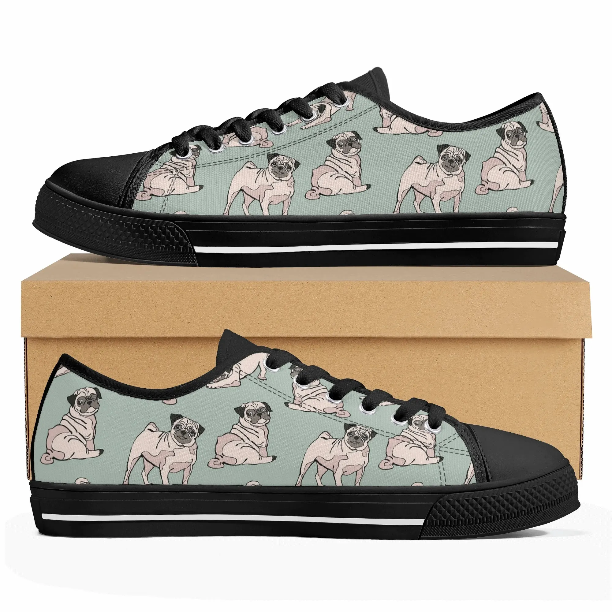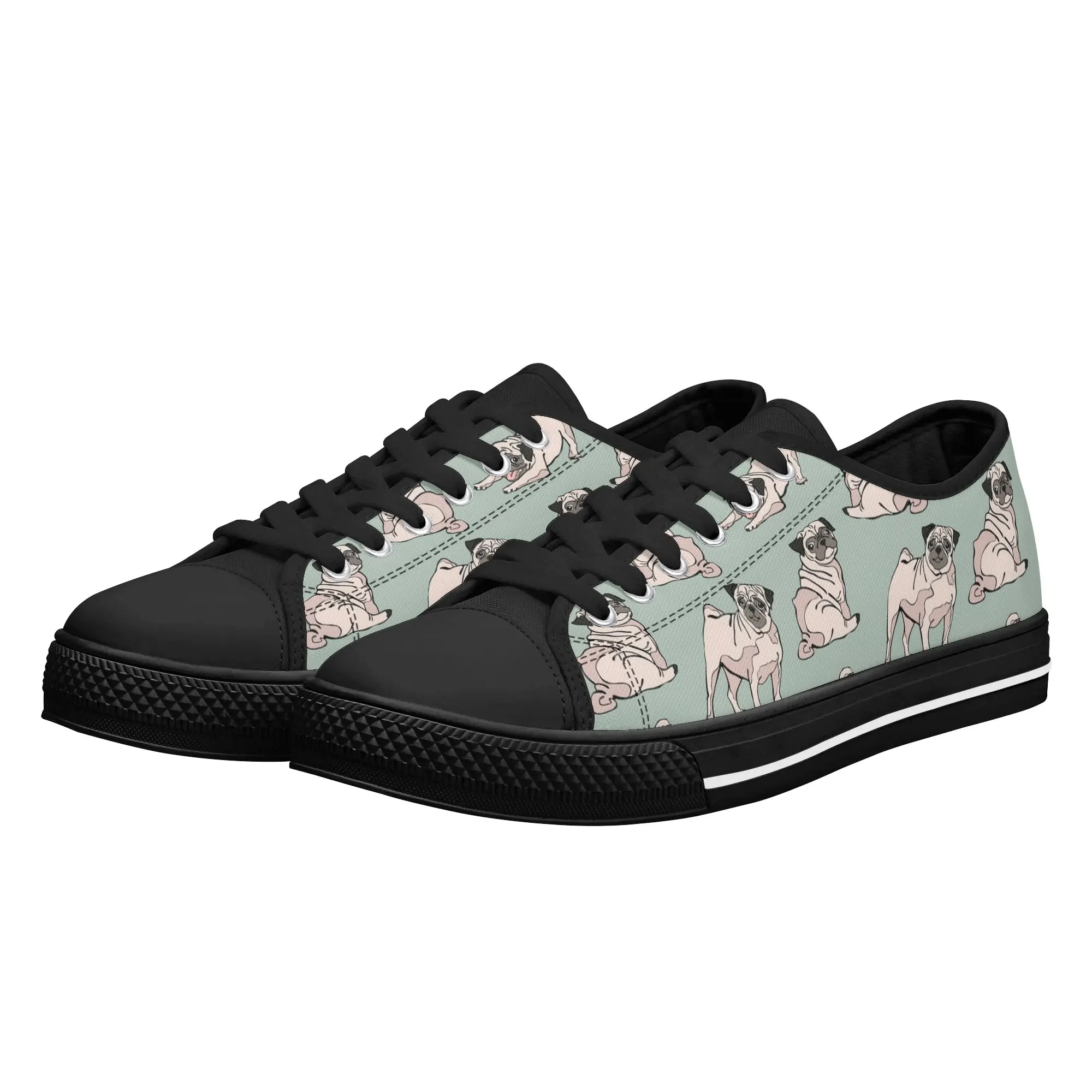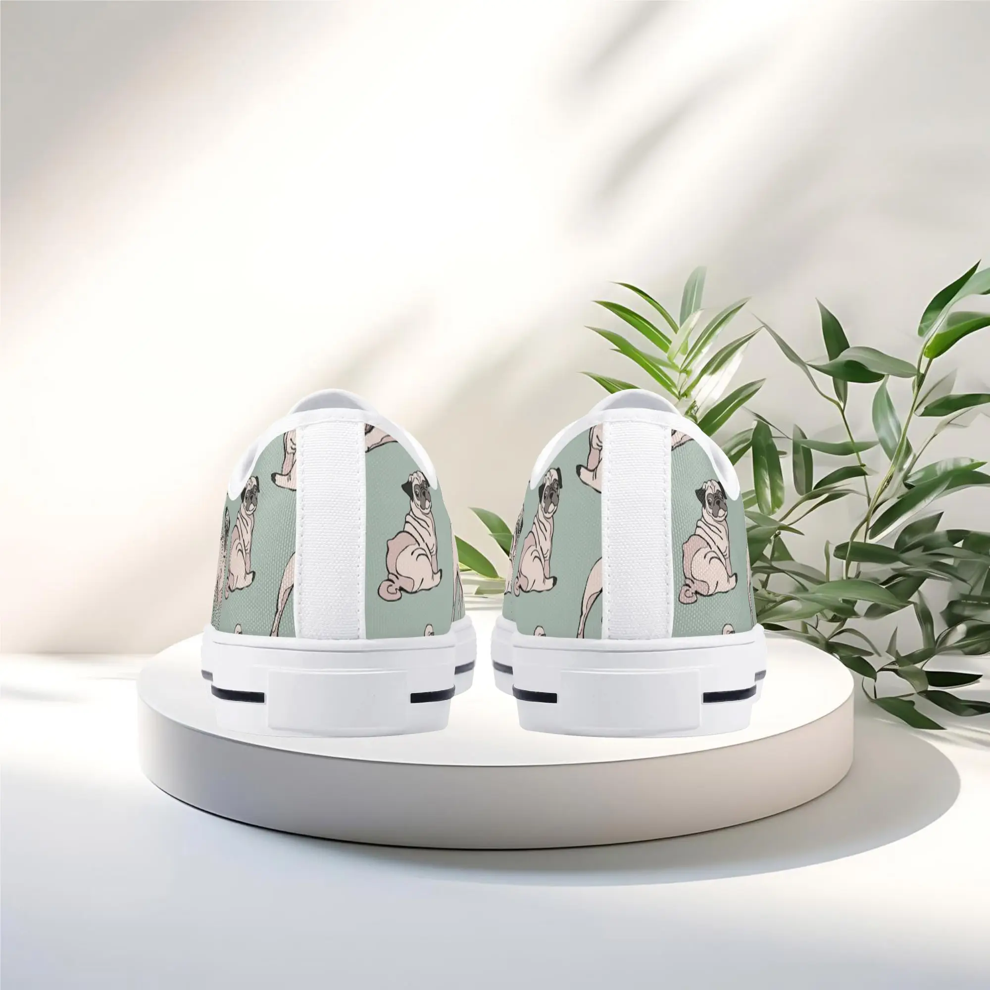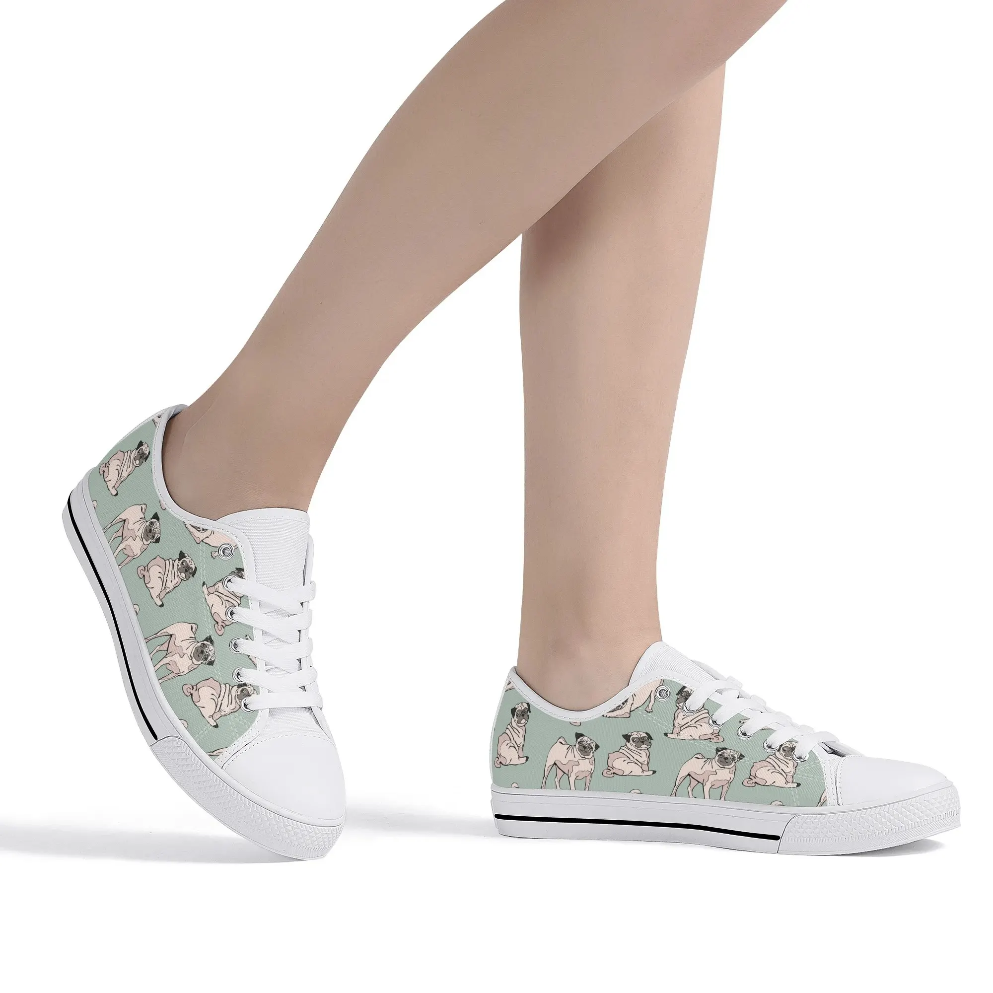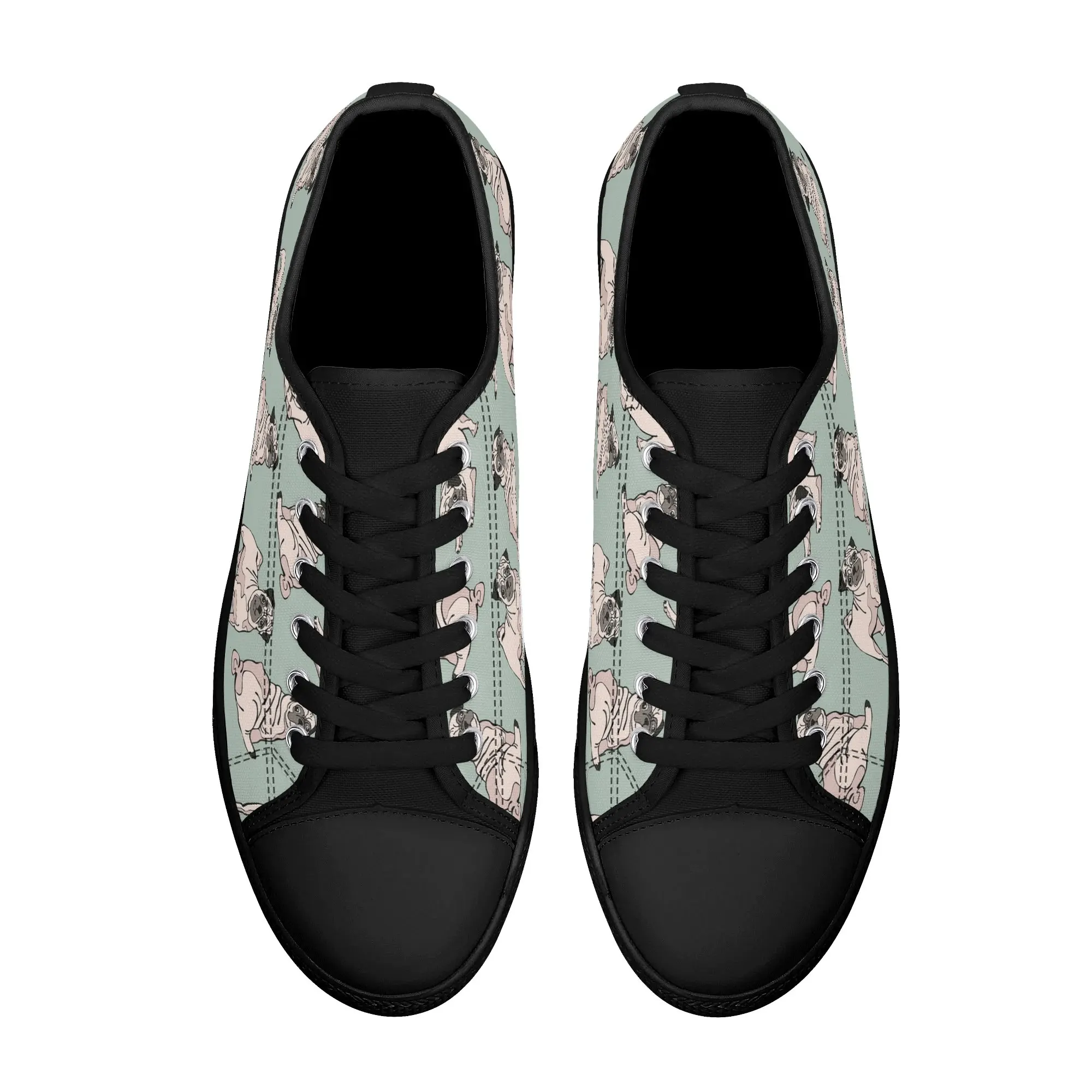 Snuggle up to style with these adorable Pug Dog Pattern Low Top Canvas Shoes! Featuring a repeating pattern of sweet, fawn-colored Pugs with their signature smushed faces on a calming light sage green background, these sneakers are the perfect footwear for Pug owners, dog moms, and anyone who loves this charming breed. They are comfortable, durable, and bring a smile to everyone you pass. For the ultimate personalized pet tribute, customize these shoes with your name, your Pug’s name, or a funny “Pug Life” phrase!