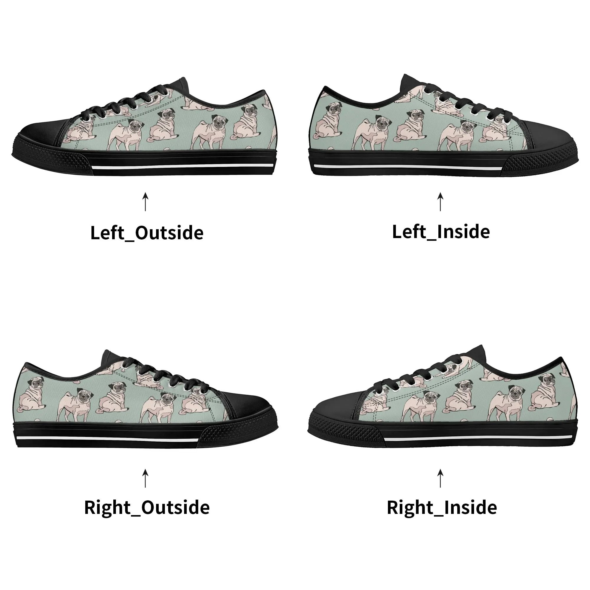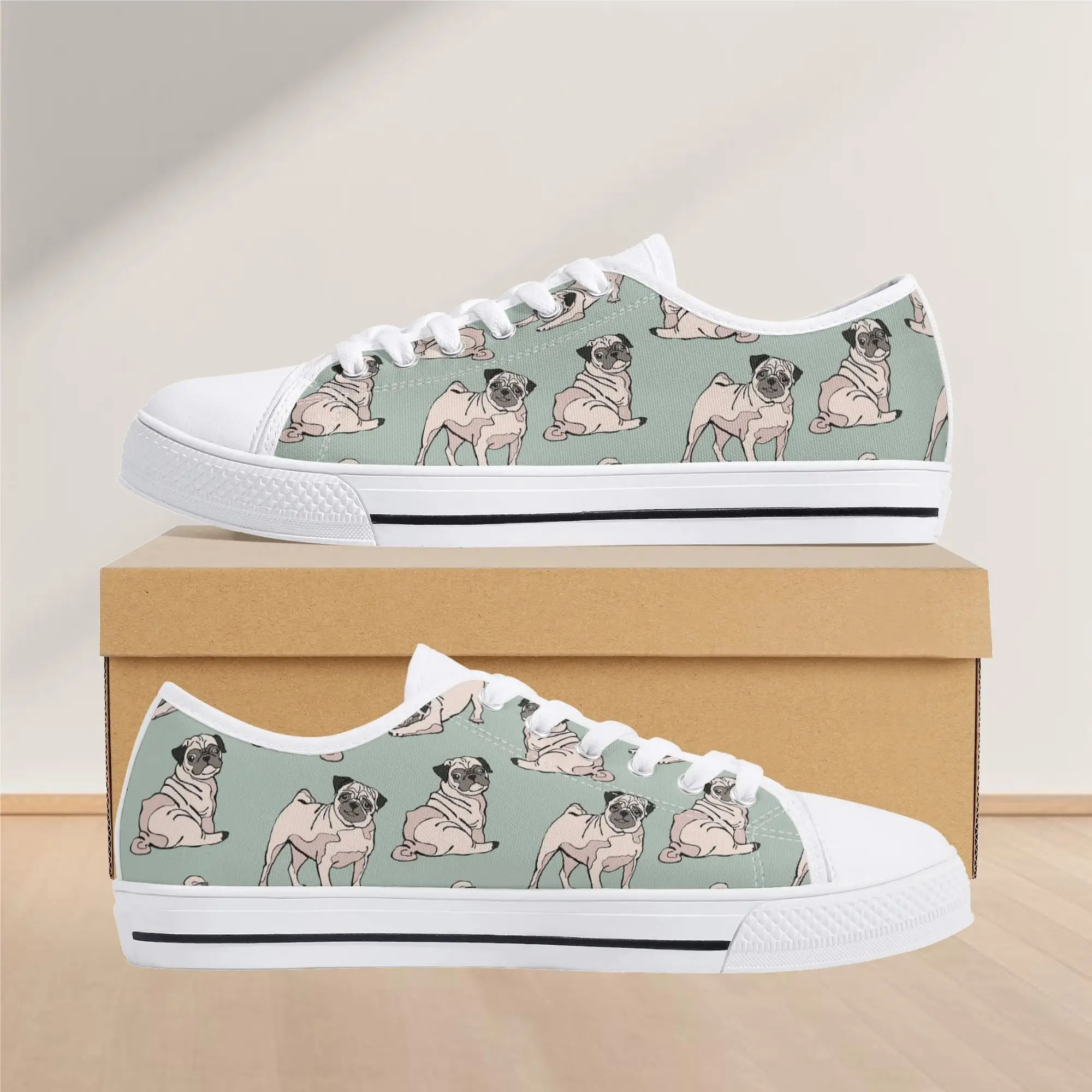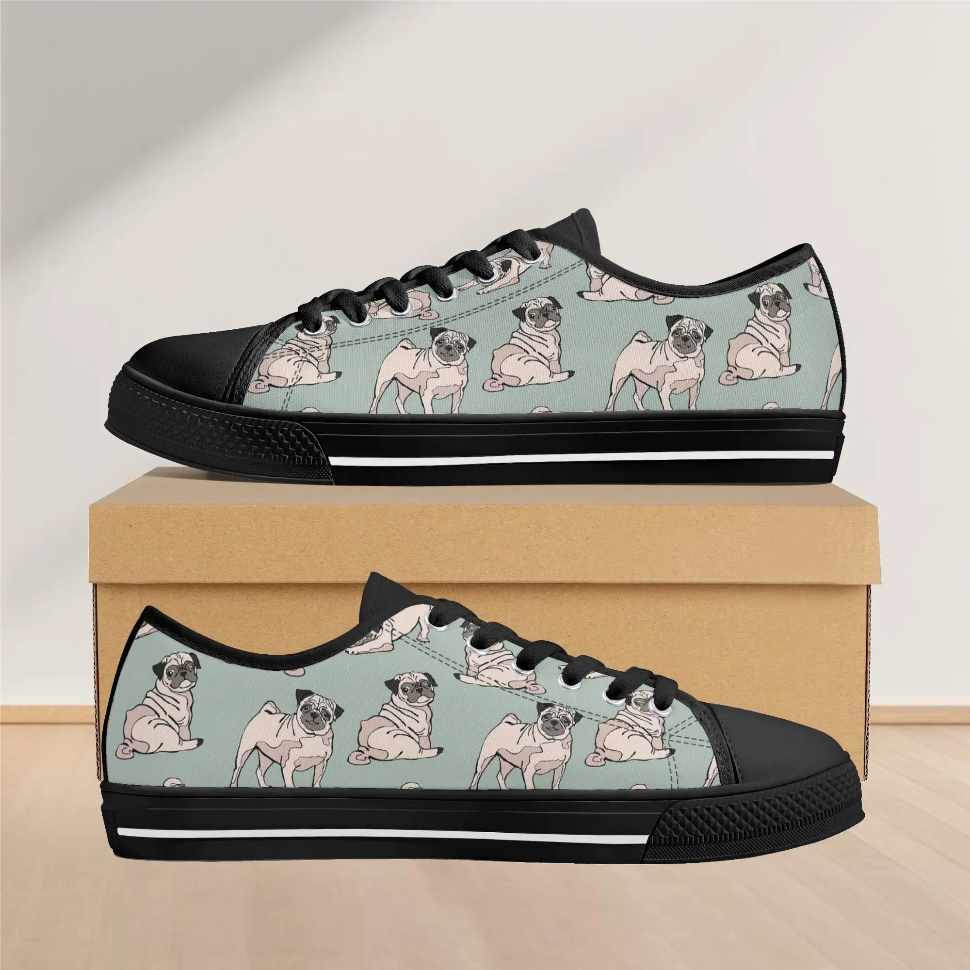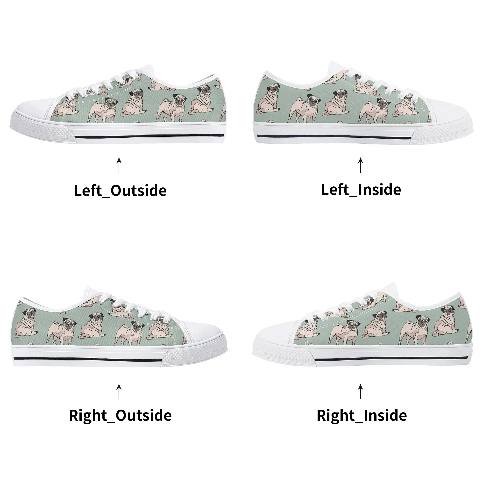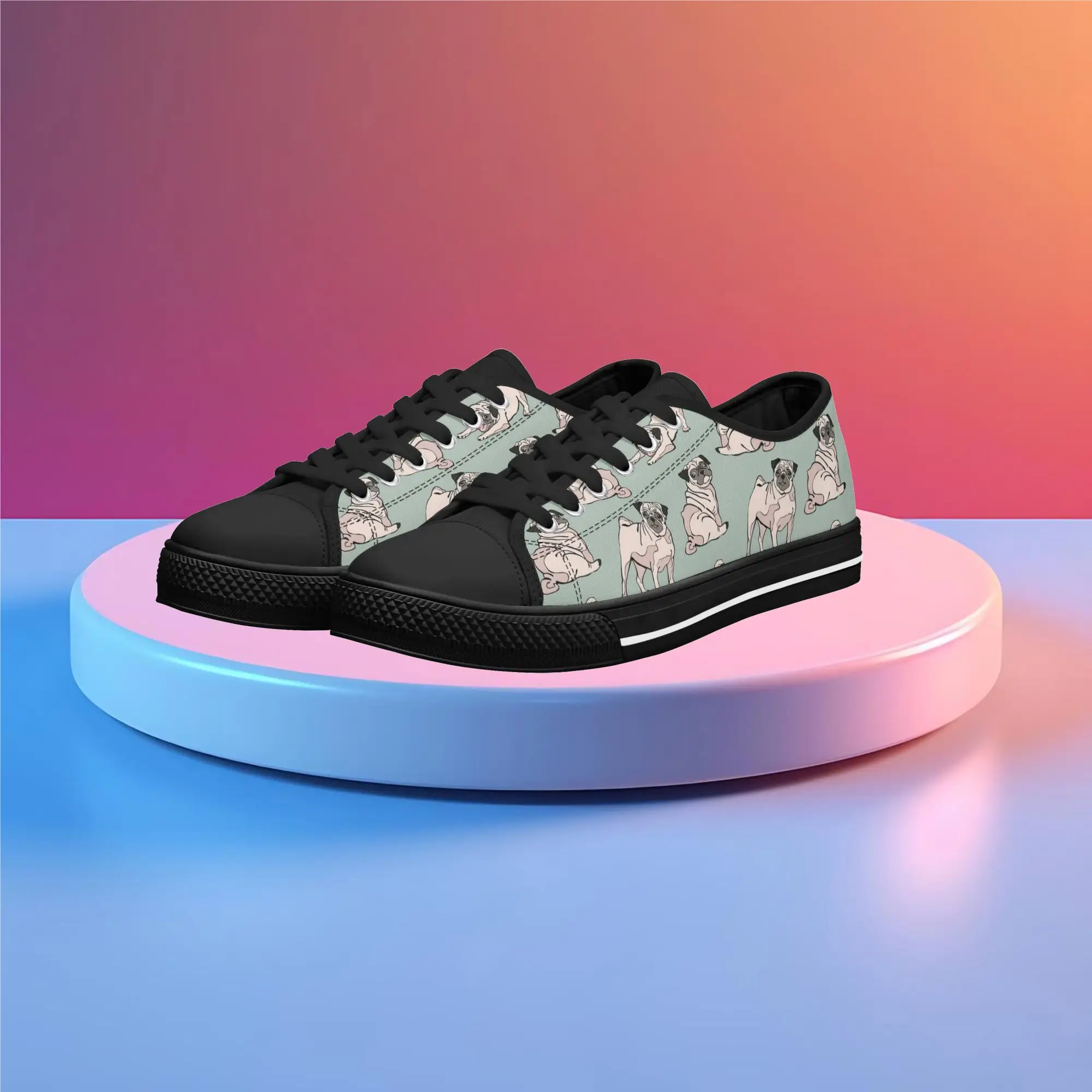 Snuggle up to style with these adorable Pug Dog Pattern Low Top Canvas Shoes! Featuring a repeating pattern of sweet, fawn-colored Pugs with their signature smushed faces on a calming light sage green background, these sneakers are the perfect footwear for Pug owners, dog moms, and anyone who loves this charming breed. They are comfortable, durable, and bring a smile to everyone you pass. For the ultimate personalized pet tribute, customize these shoes with your name, your Pug’s name, or a funny “Pug Life” phrase!
