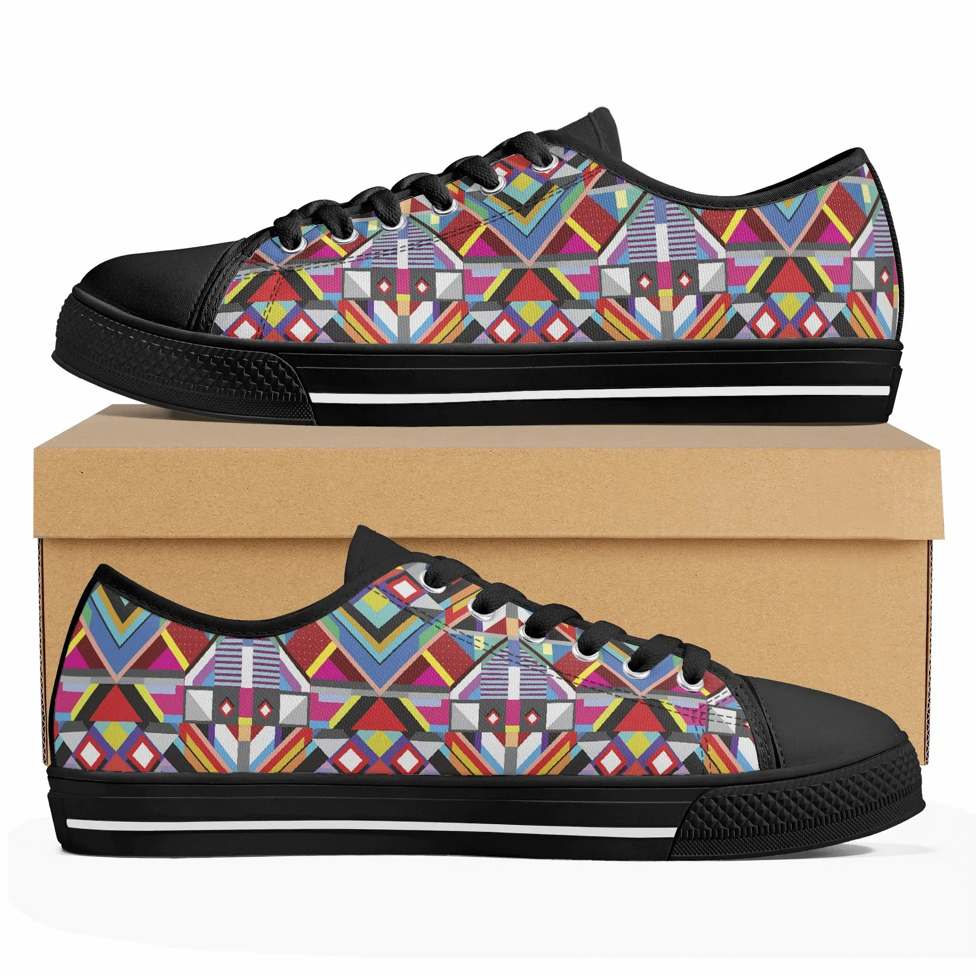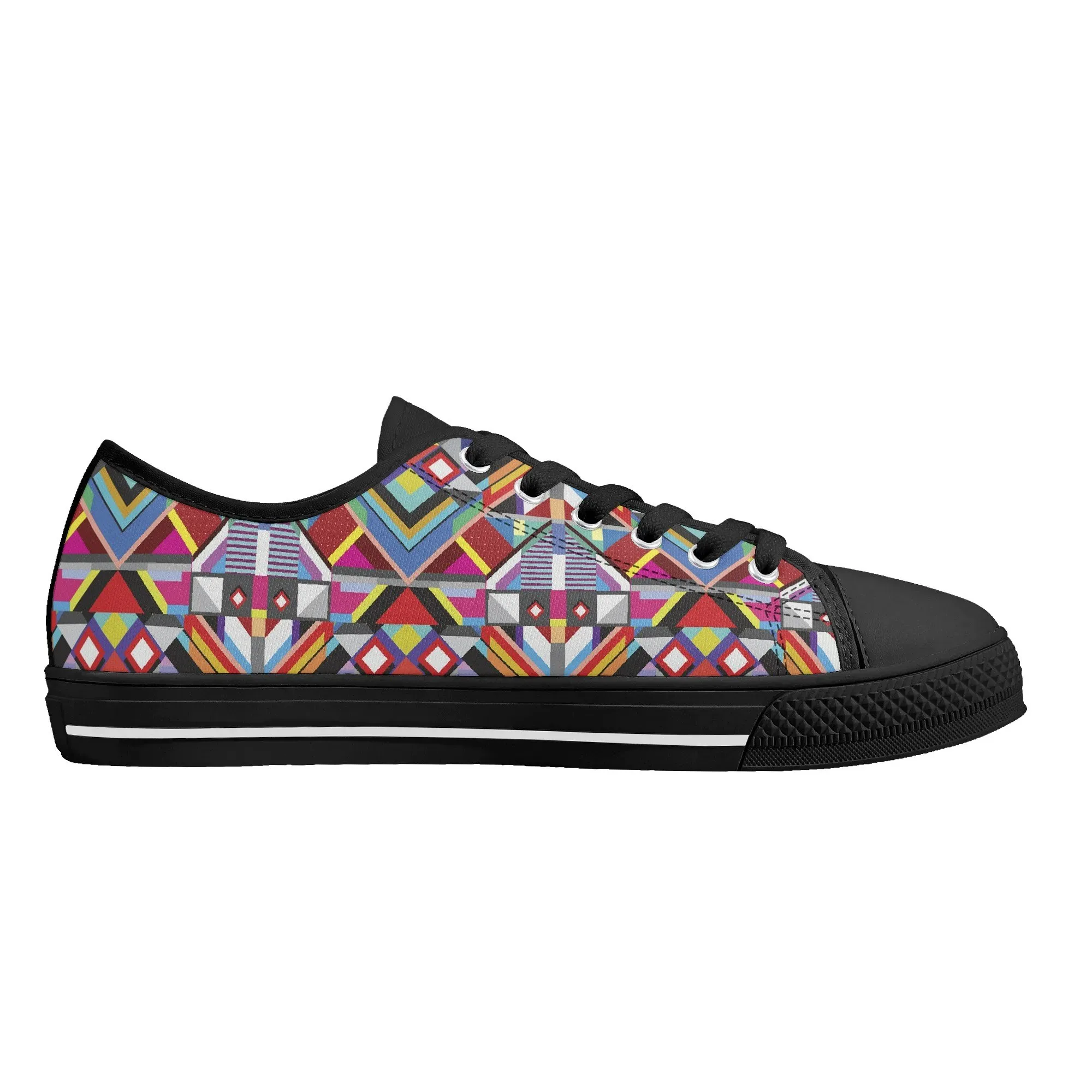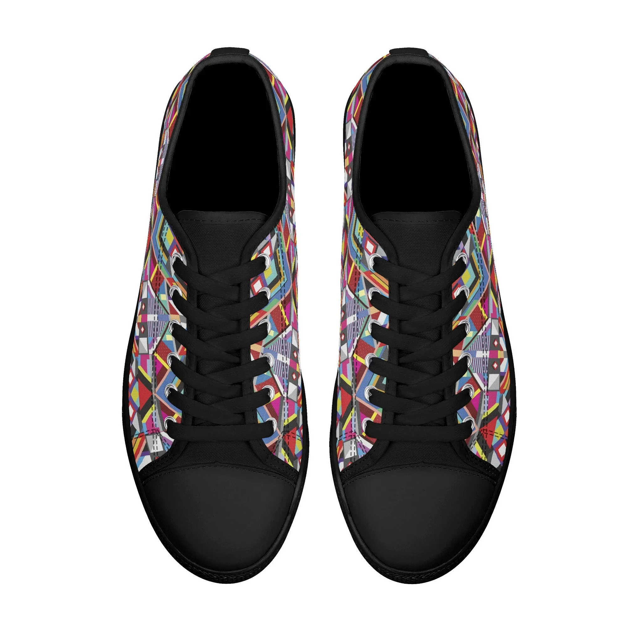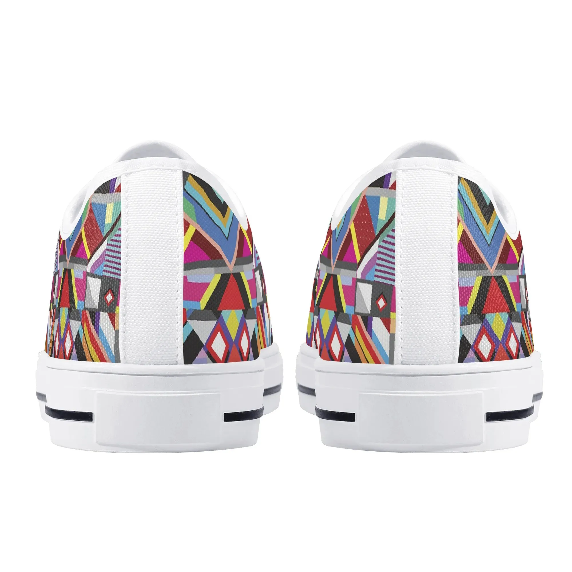 Make a striking, artistic impression with these vibrant Geometric Pattern Low Top Canvas Shoes! Featuring a mesmerizing all-over print of colorful, intersecting triangles, diamonds, and bold lines reminiscent of modern abstract or tribal textile art, these sneakers are a true statement piece. Perfect for art lovers, fashion enthusiasts, and anyone who appreciates unique, culturally inspired design. For an even more customized look, personalize these shoes with a name, initials, or a short phrase, creating a wearable piece of personalized art!