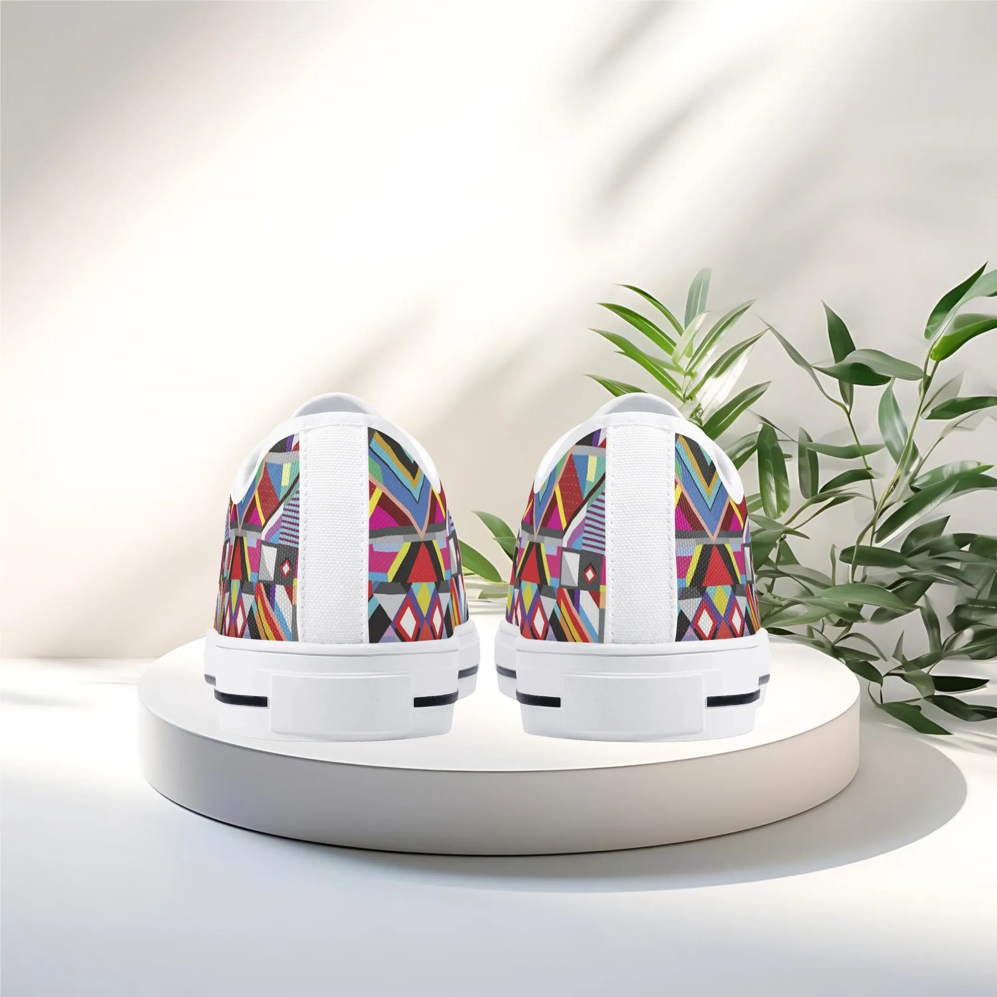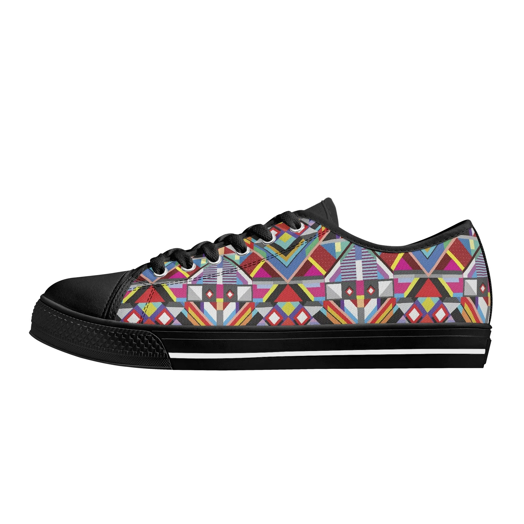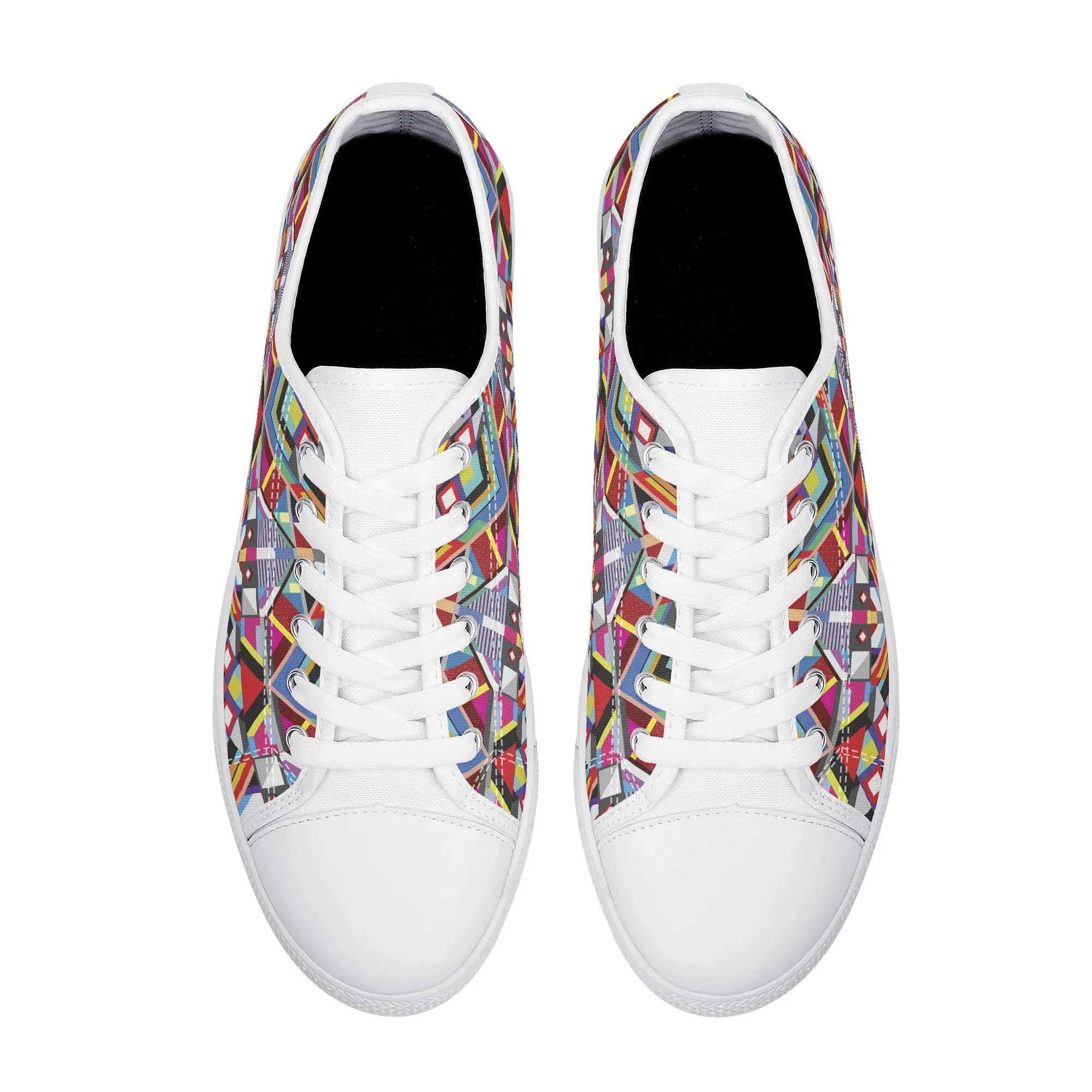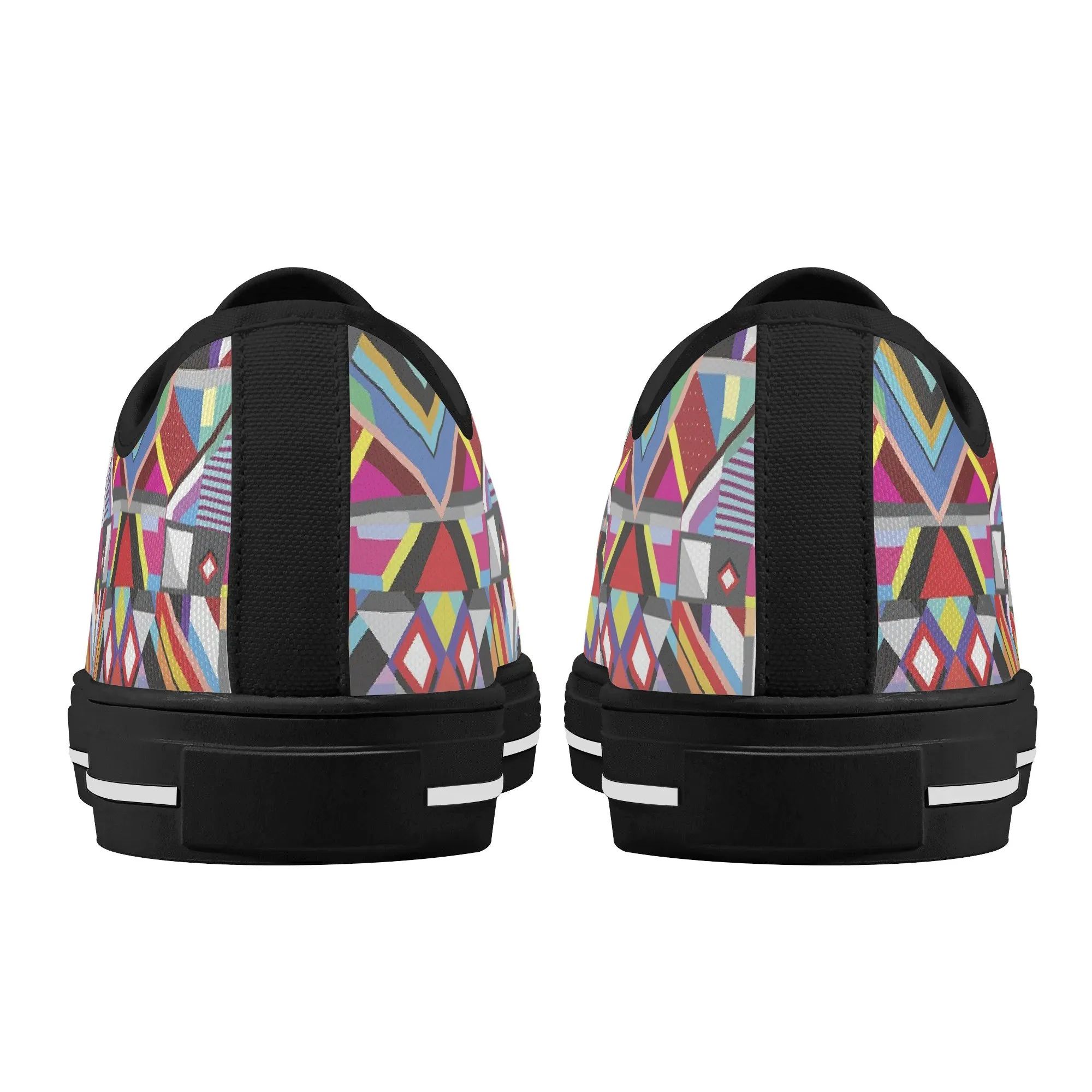 Make a striking, artistic impression with these vibrant Geometric Pattern Low Top Canvas Shoes! Featuring a mesmerizing all-over print of colorful, intersecting triangles, diamonds, and bold lines reminiscent of modern abstract or tribal textile art, these sneakers are a true statement piece. Perfect for art lovers, fashion enthusiasts, and anyone who appreciates unique, culturally inspired design. For an even more customized look, personalize these shoes with a name, initials, or a short phrase, creating a wearable piece of personalized art!