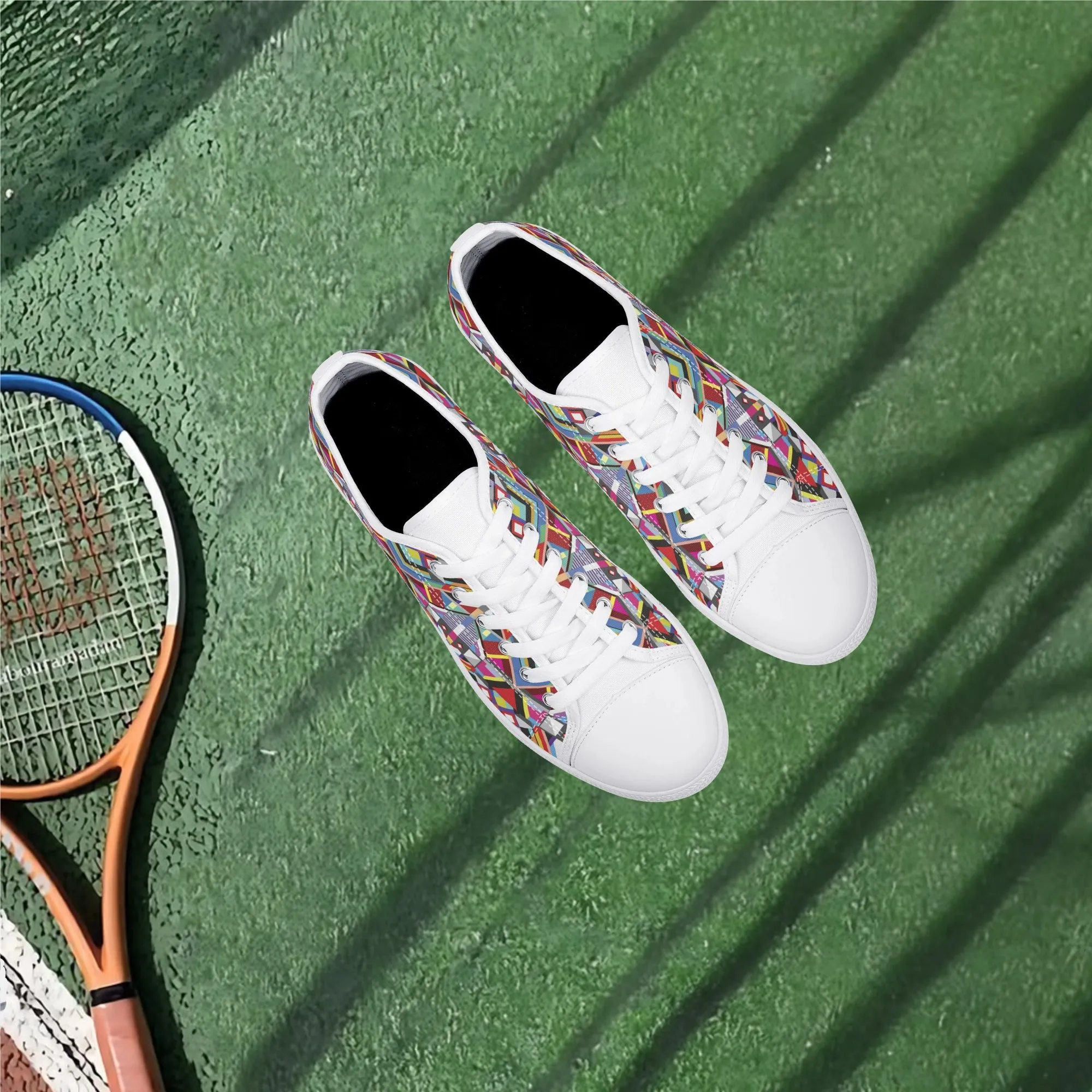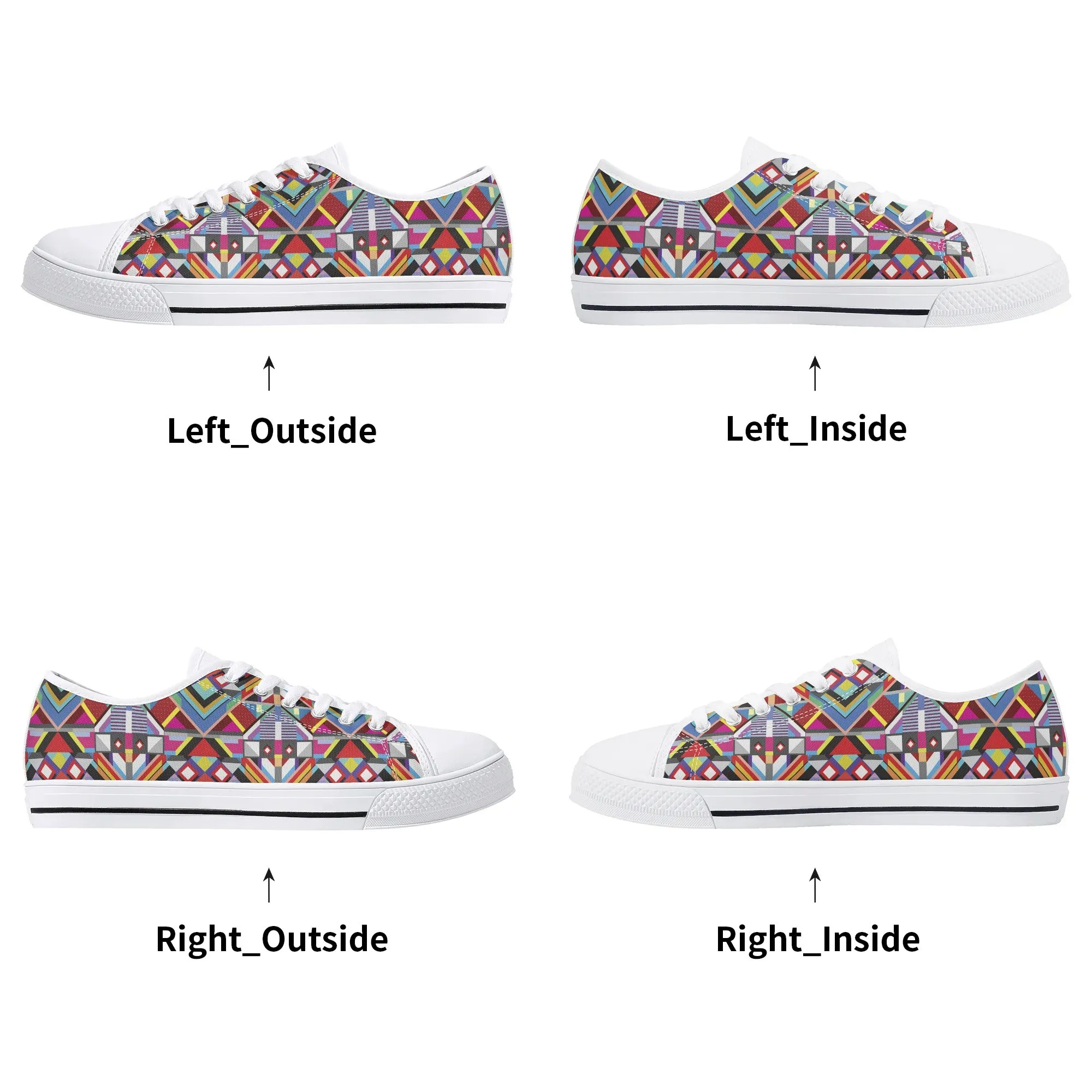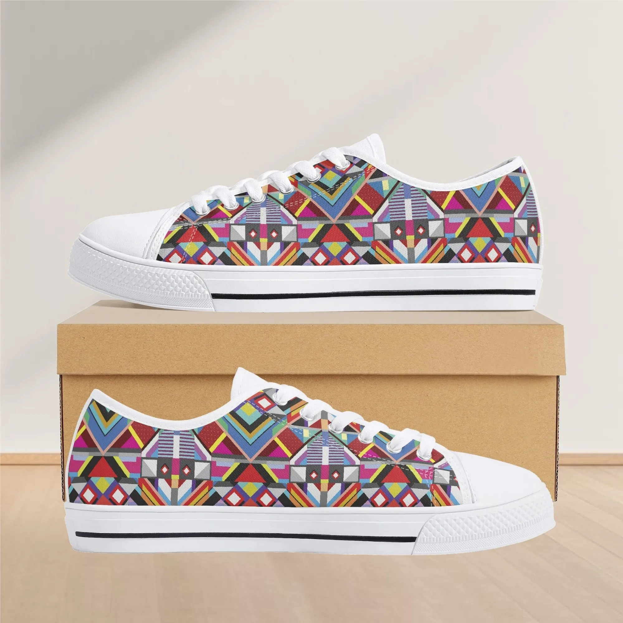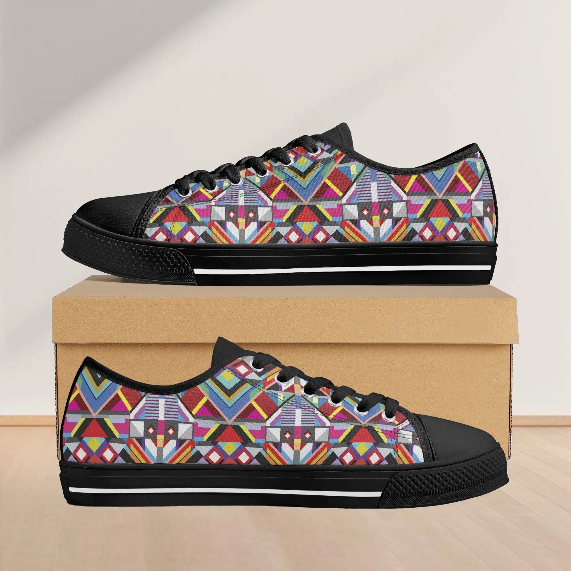 Make a striking, artistic impression with these vibrant Geometric Pattern Low Top Canvas Shoes! Featuring a mesmerizing all-over print of colorful, intersecting triangles, diamonds, and bold lines reminiscent of modern abstract or tribal textile art, these sneakers are a true statement piece. Perfect for art lovers, fashion enthusiasts, and anyone who appreciates unique, culturally inspired design. For an even more customized look, personalize these shoes with a name, initials, or a short phrase, creating a wearable piece of personalized art!