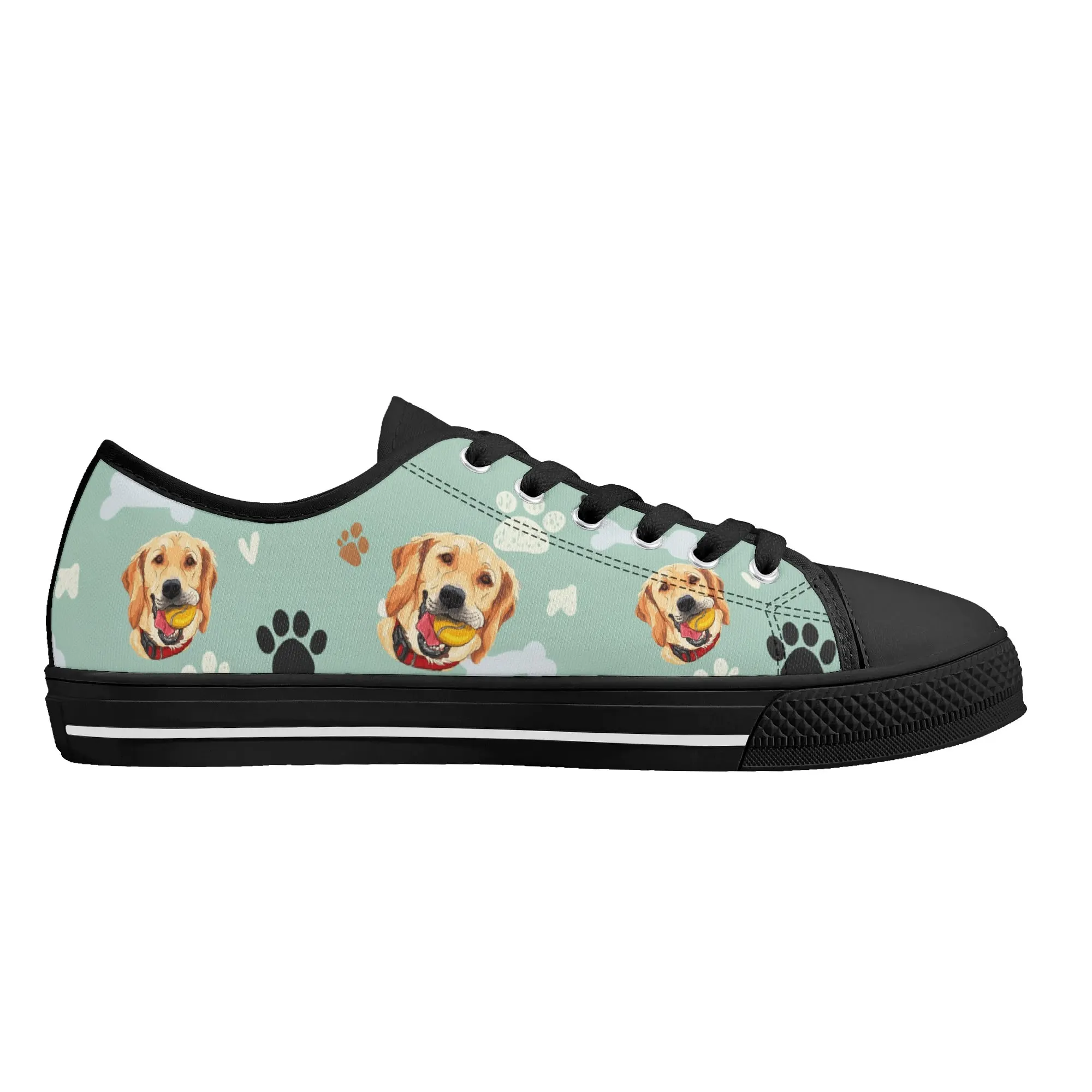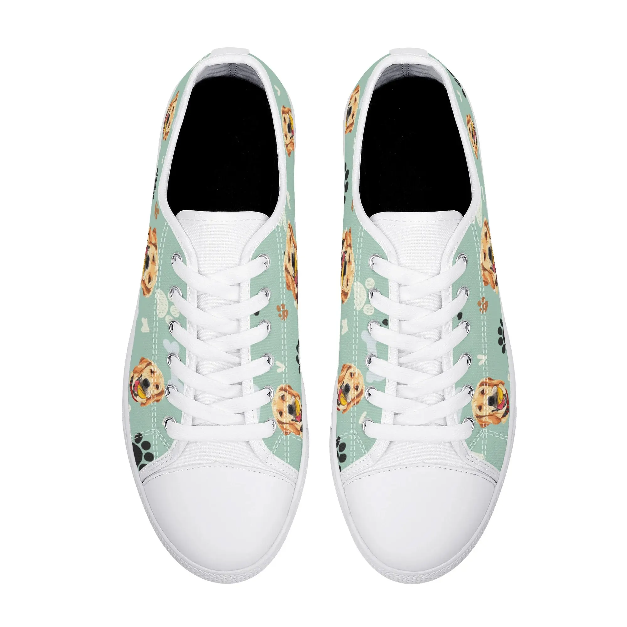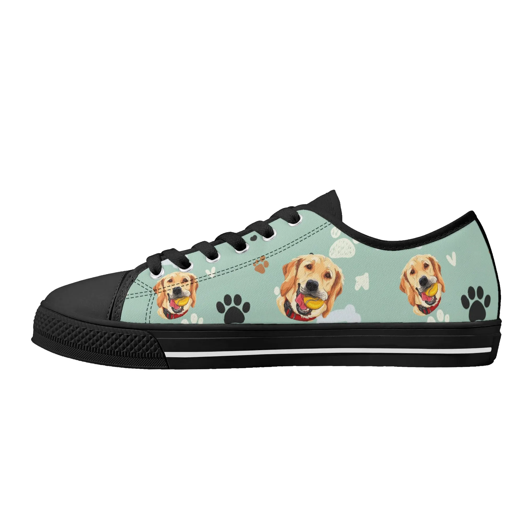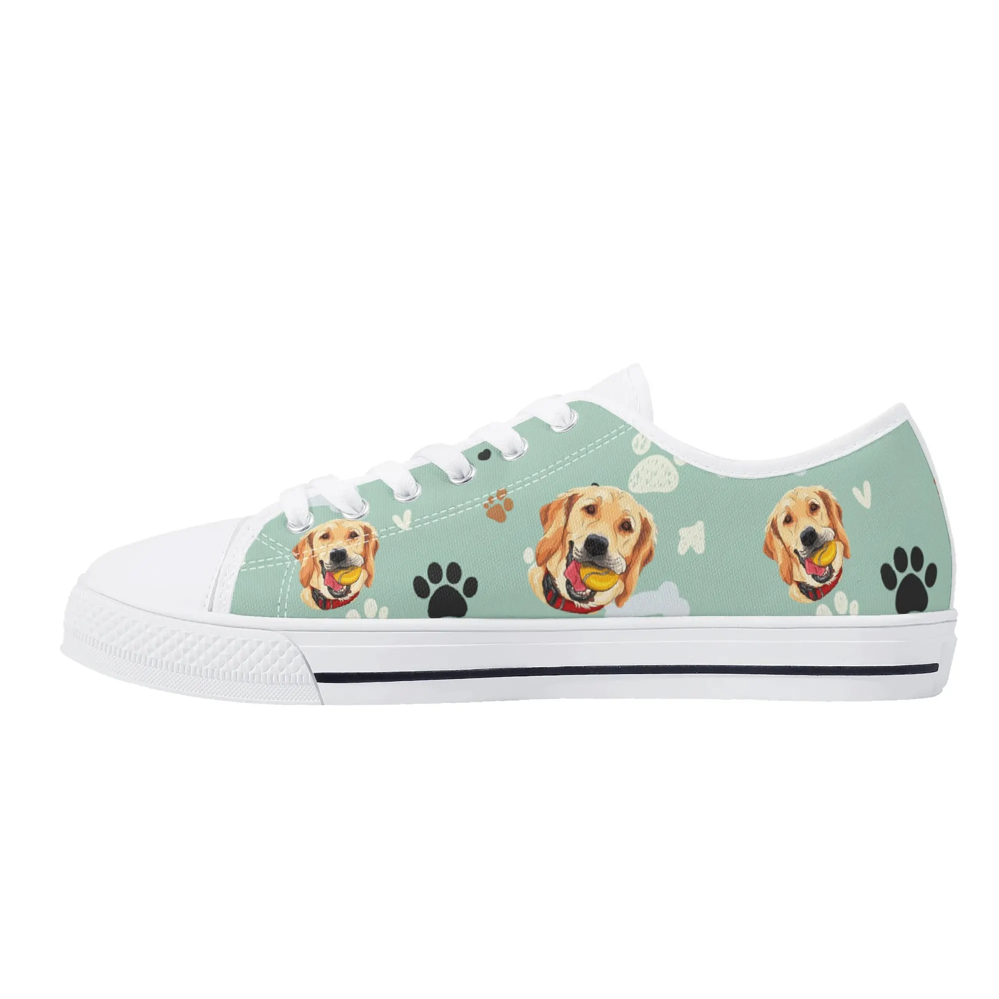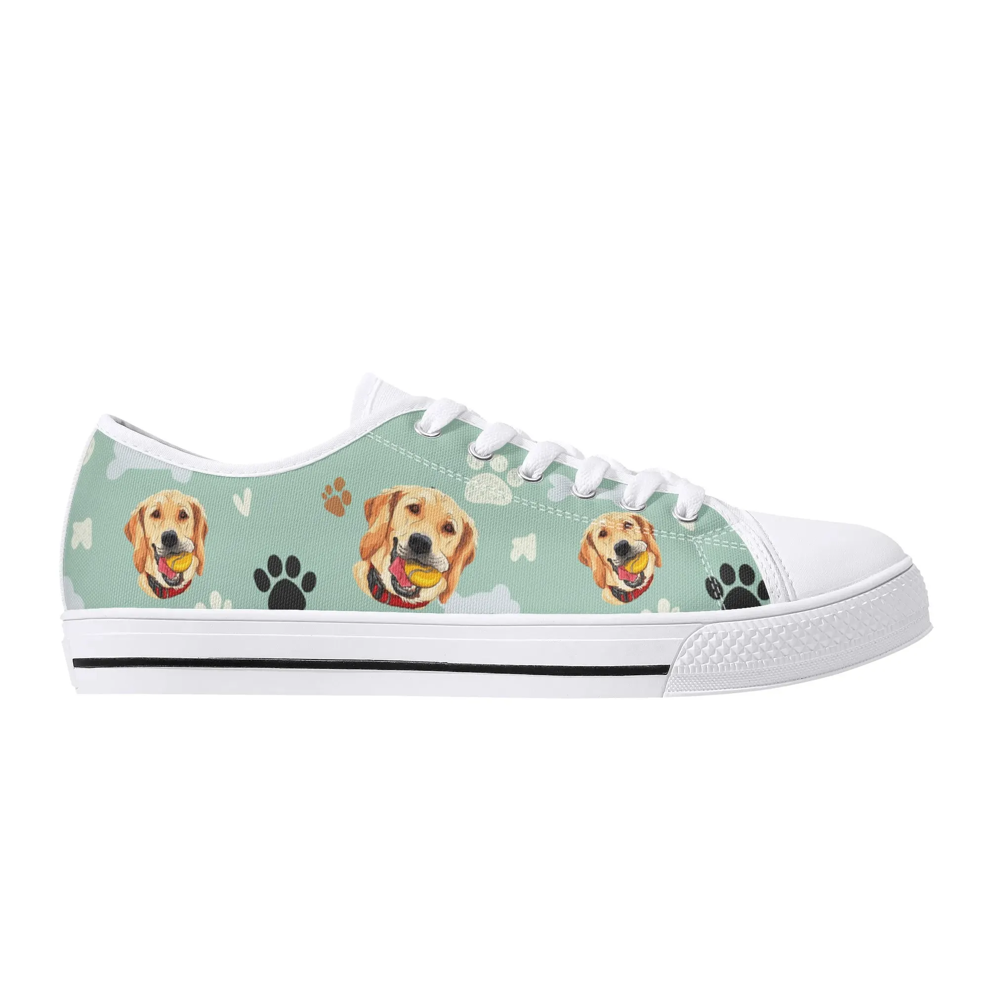 Walk the dog park in style with these cheerful Golden Retriever Low Top Canvas Shoes! Featuring a repeating pattern of happy Golden Retriever faces holding yellow balls, accented with paw prints and cute clouds on a light mint green background. These sneakers are the perfect gift for Golden owners, dog moms, dog dads, and anyone who adores this friendly, playful breed. They are comfortable, durable, and guaranteed to fetch compliments! For the ultimate personalized pet tribute, customize these shoes with your name, your dog’s name, or a heartwarming phrase like “Best Boy”!