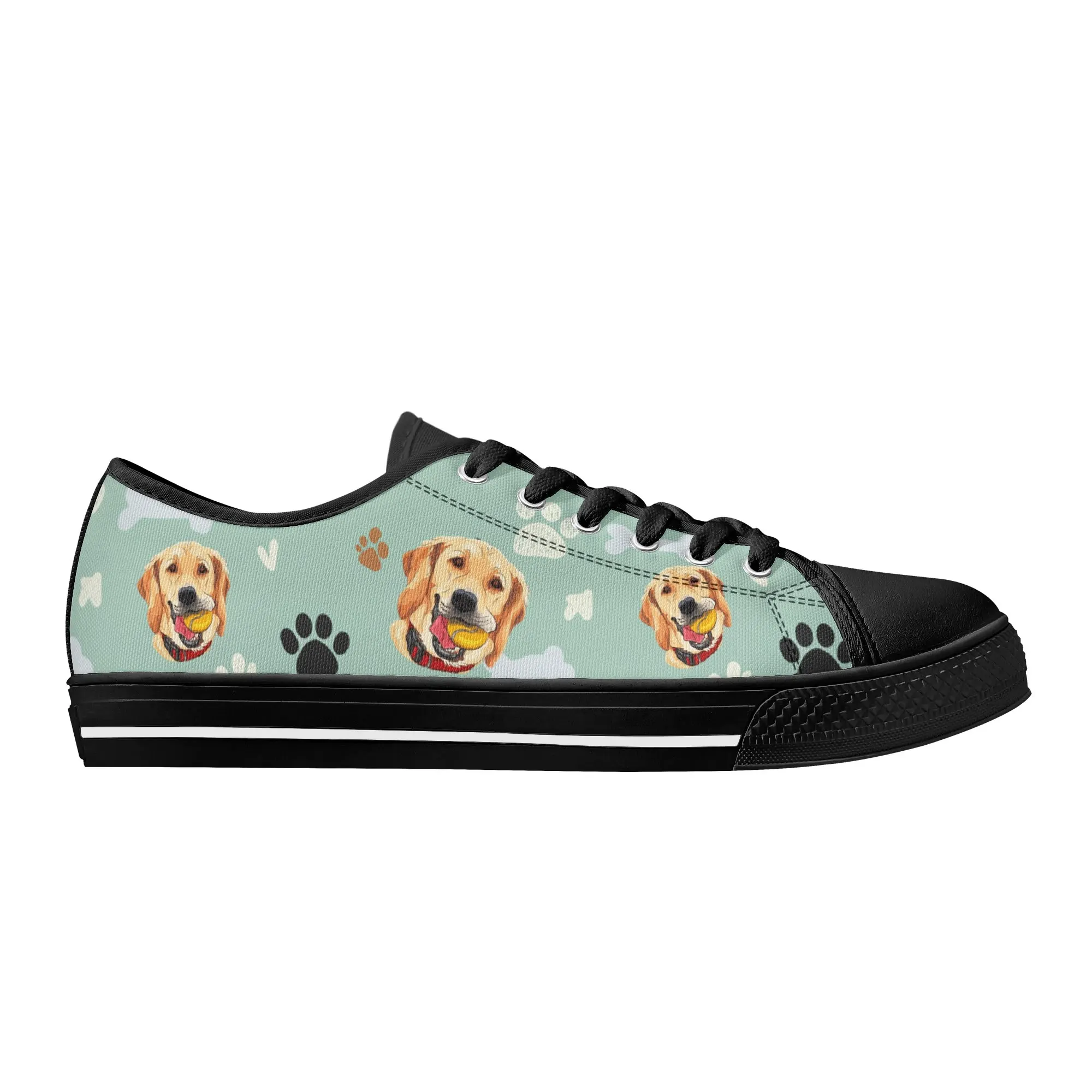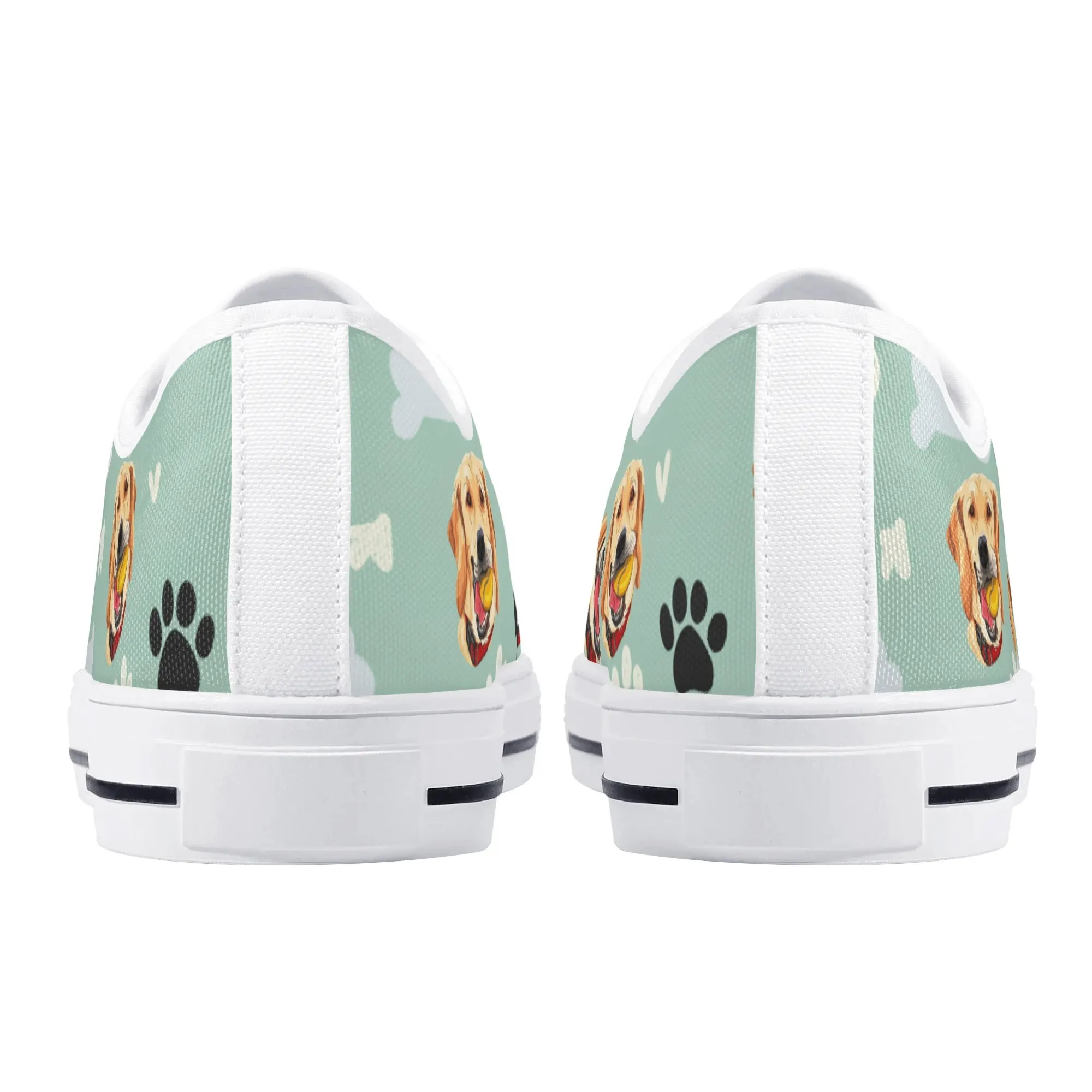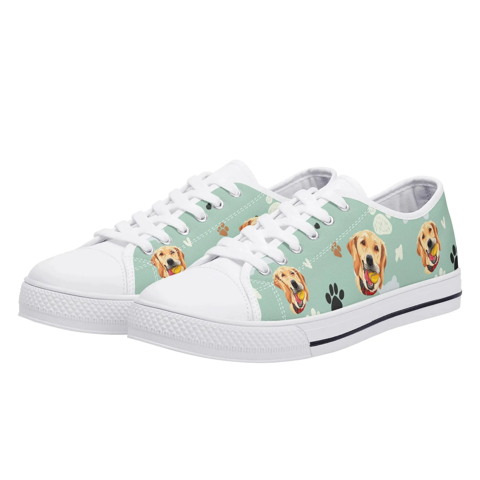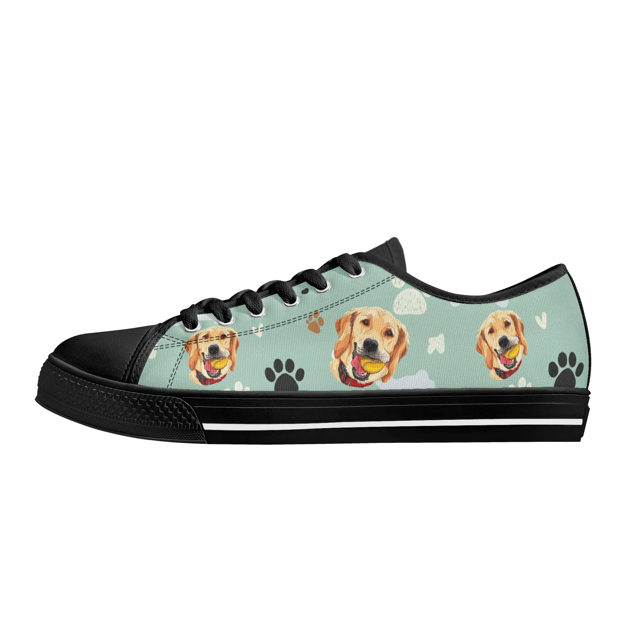 Walk the dog park in style with these cheerful Golden Retriever Low Top Canvas Shoes! Featuring a repeating pattern of happy Golden Retriever faces holding yellow balls, accented with paw prints and cute clouds on a light mint green background. These sneakers are the perfect gift for Golden owners, dog moms, dog dads, and anyone who adores this friendly, playful breed. They are comfortable, durable, and guaranteed to fetch compliments! For the ultimate personalized pet tribute, customize these shoes with your name, your dog’s name, or a heartwarming phrase like “Best Boy”!