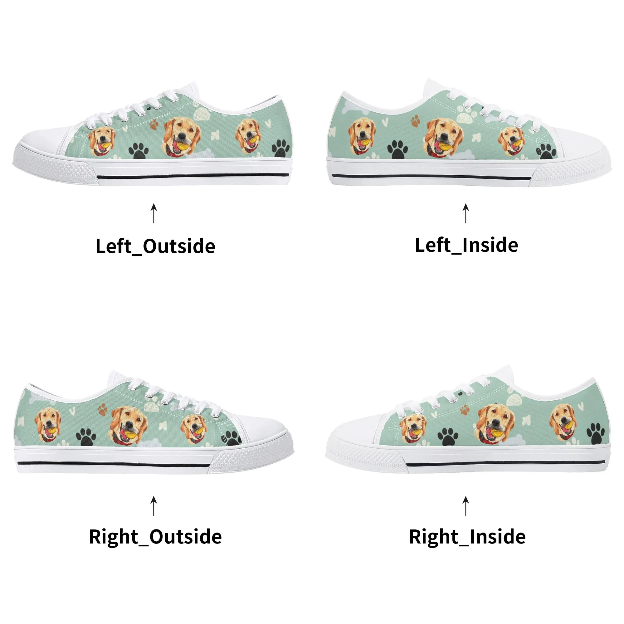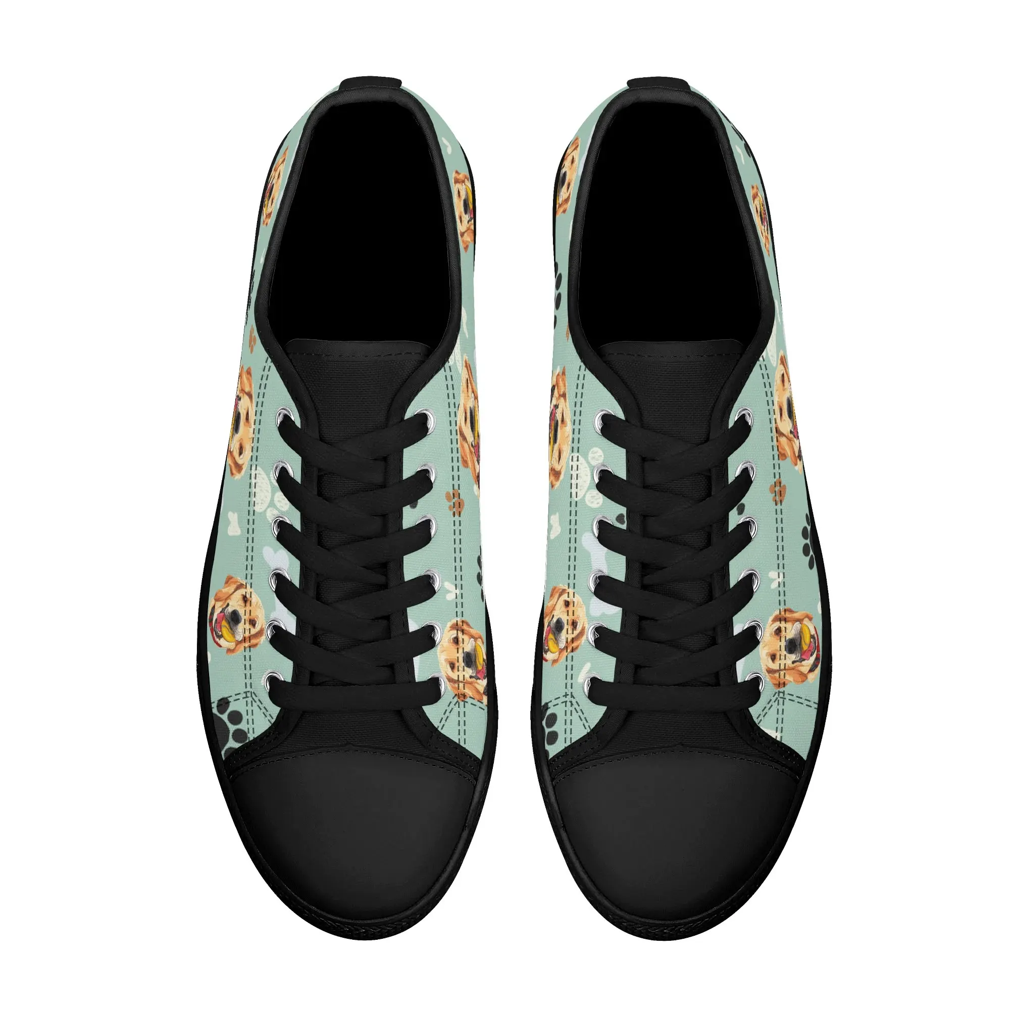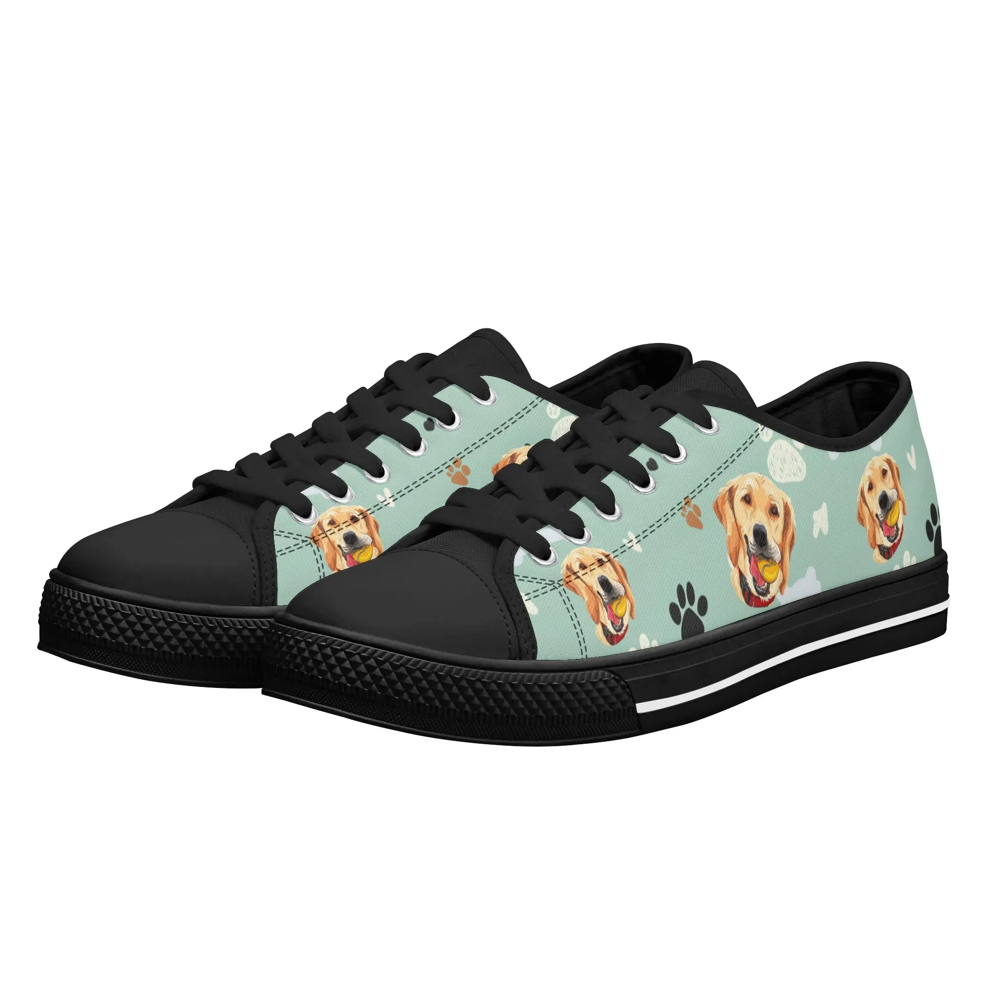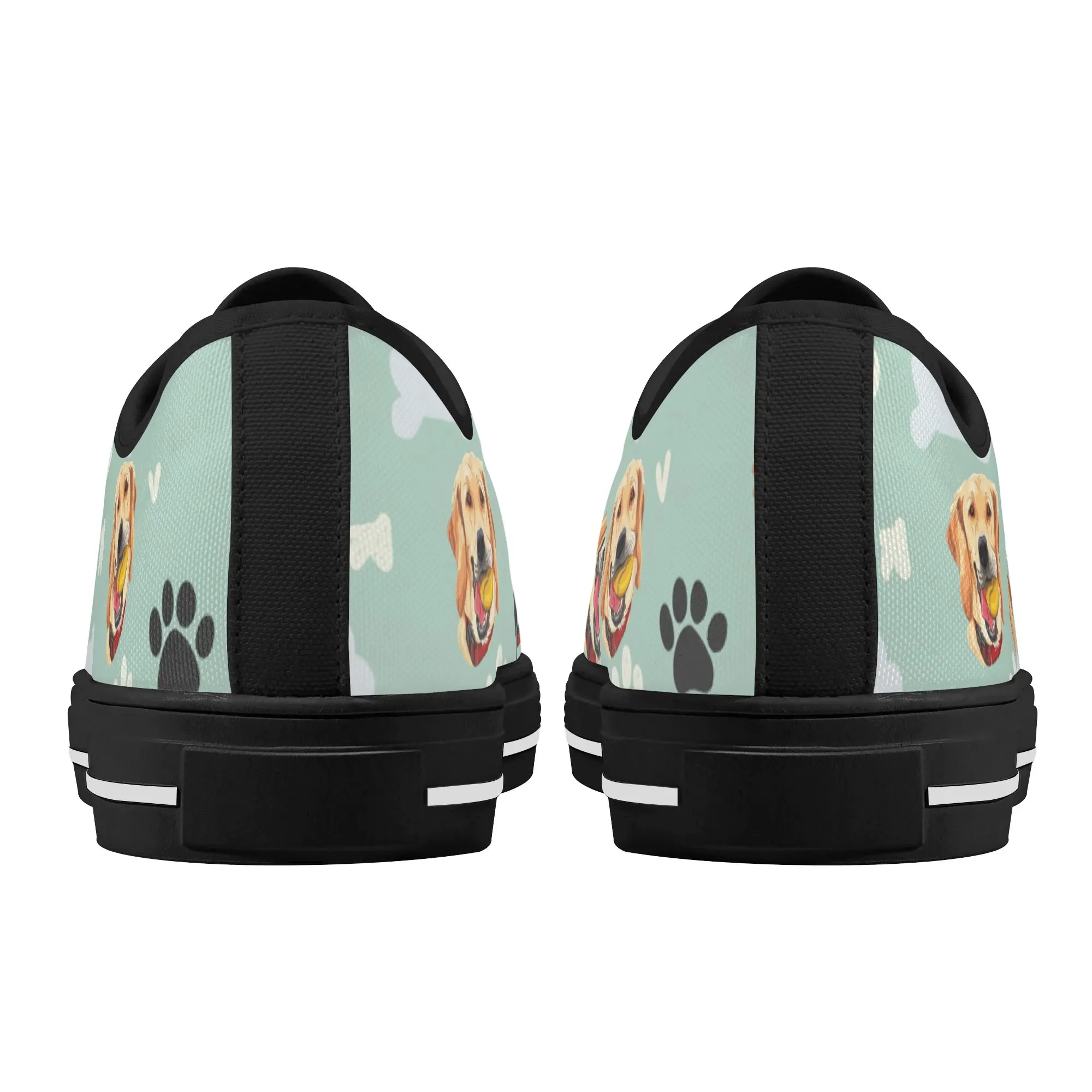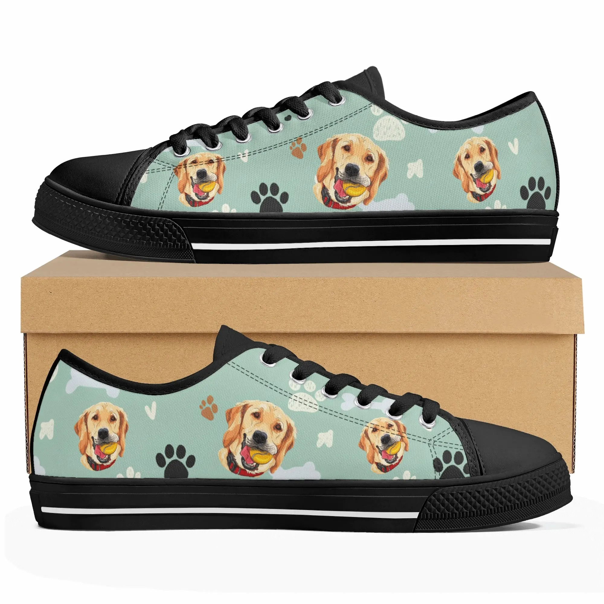 Walk the dog park in style with these cheerful Golden Retriever Low Top Canvas Shoes! Featuring a repeating pattern of happy Golden Retriever faces holding yellow balls, accented with paw prints and cute clouds on a light mint green background. These sneakers are the perfect gift for Golden owners, dog moms, dog dads, and anyone who adores this friendly, playful breed. They are comfortable, durable, and guaranteed to fetch compliments! For the ultimate personalized pet tribute, customize these shoes with your name, your dog’s name, or a heartwarming phrase like “Best Boy”!