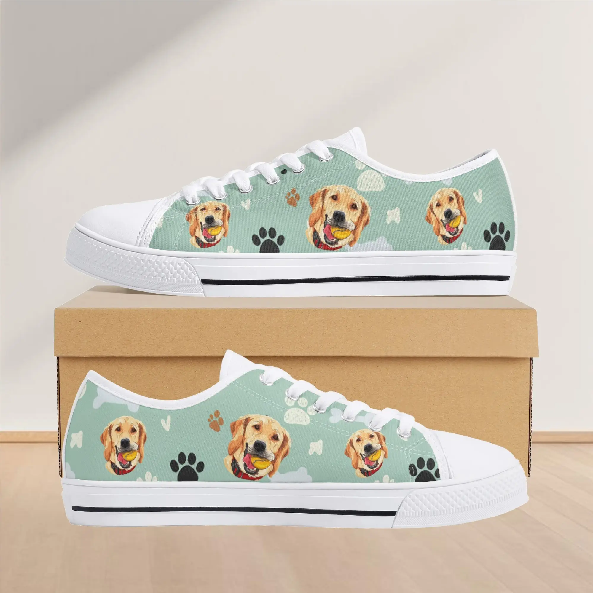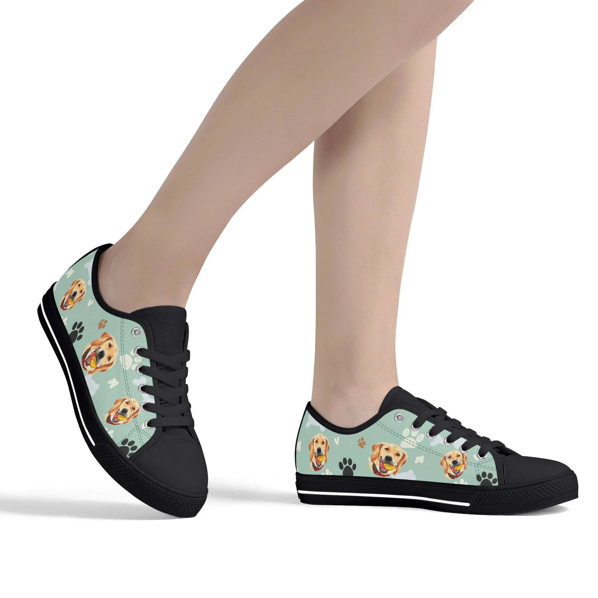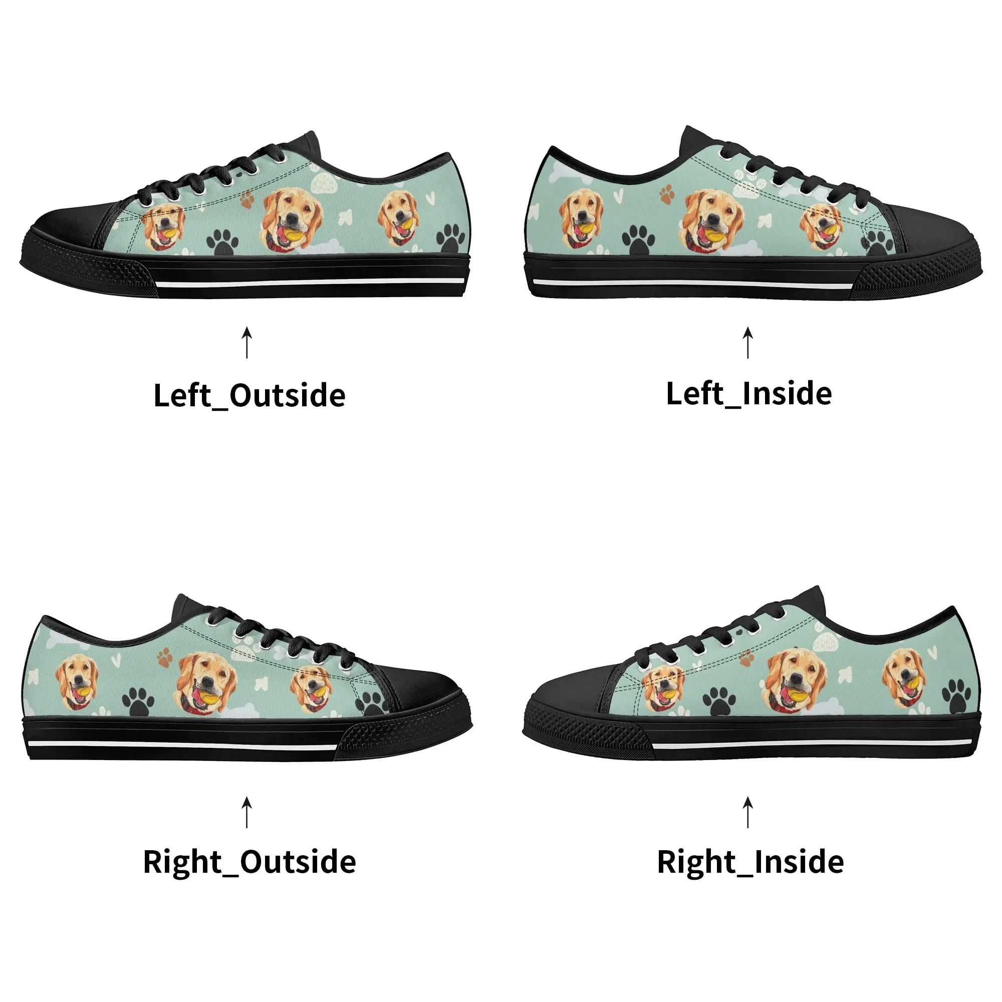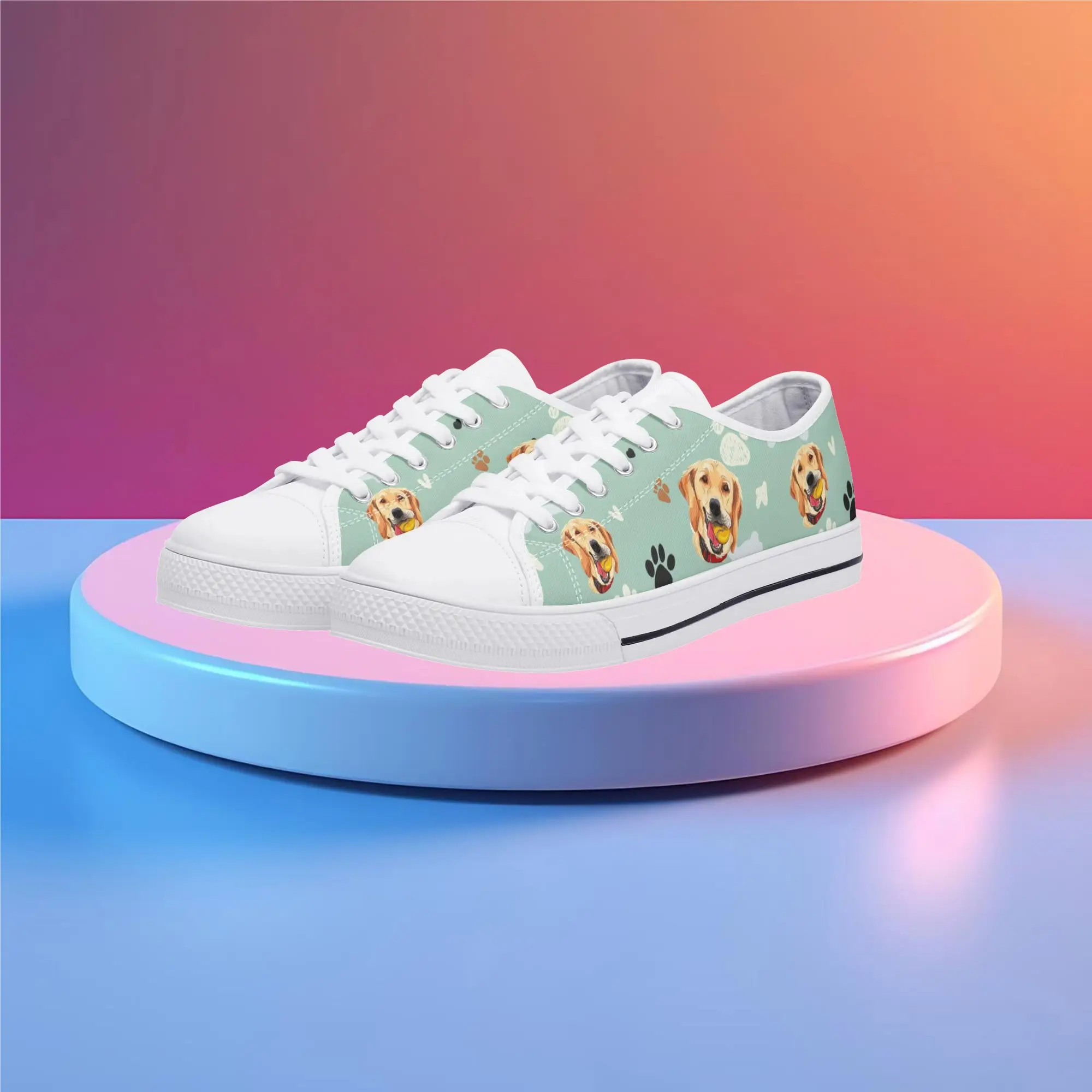 Walk the dog park in style with these cheerful Golden Retriever Low Top Canvas Shoes! Featuring a repeating pattern of happy Golden Retriever faces holding yellow balls, accented with paw prints and cute clouds on a light mint green background. These sneakers are the perfect gift for Golden owners, dog moms, dog dads, and anyone who adores this friendly, playful breed. They are comfortable, durable, and guaranteed to fetch compliments! For the ultimate personalized pet tribute, customize these shoes with your name, your dog’s name, or a heartwarming phrase like “Best Boy”!