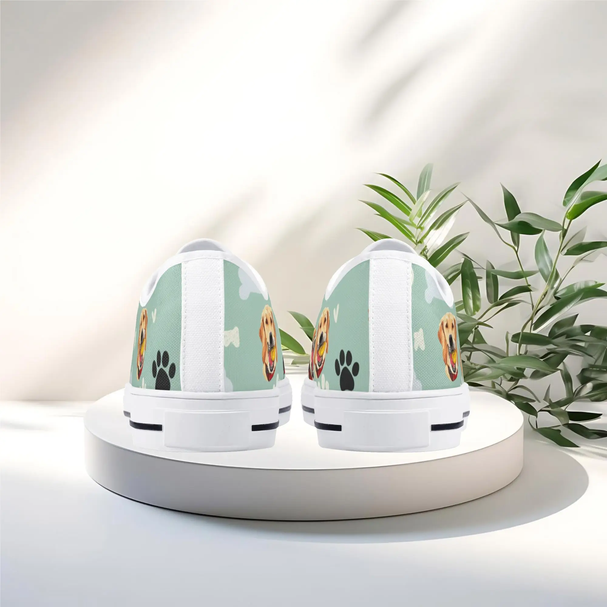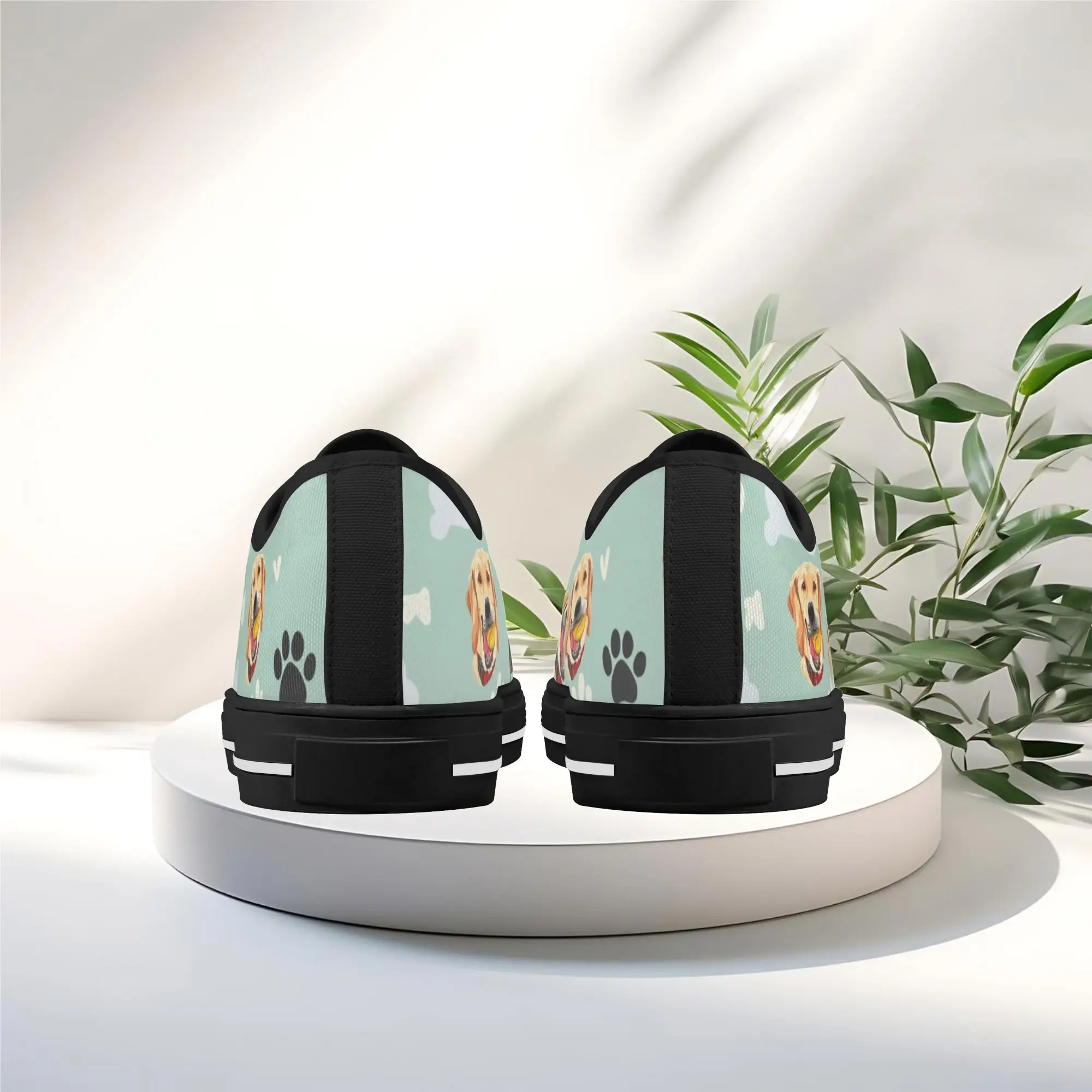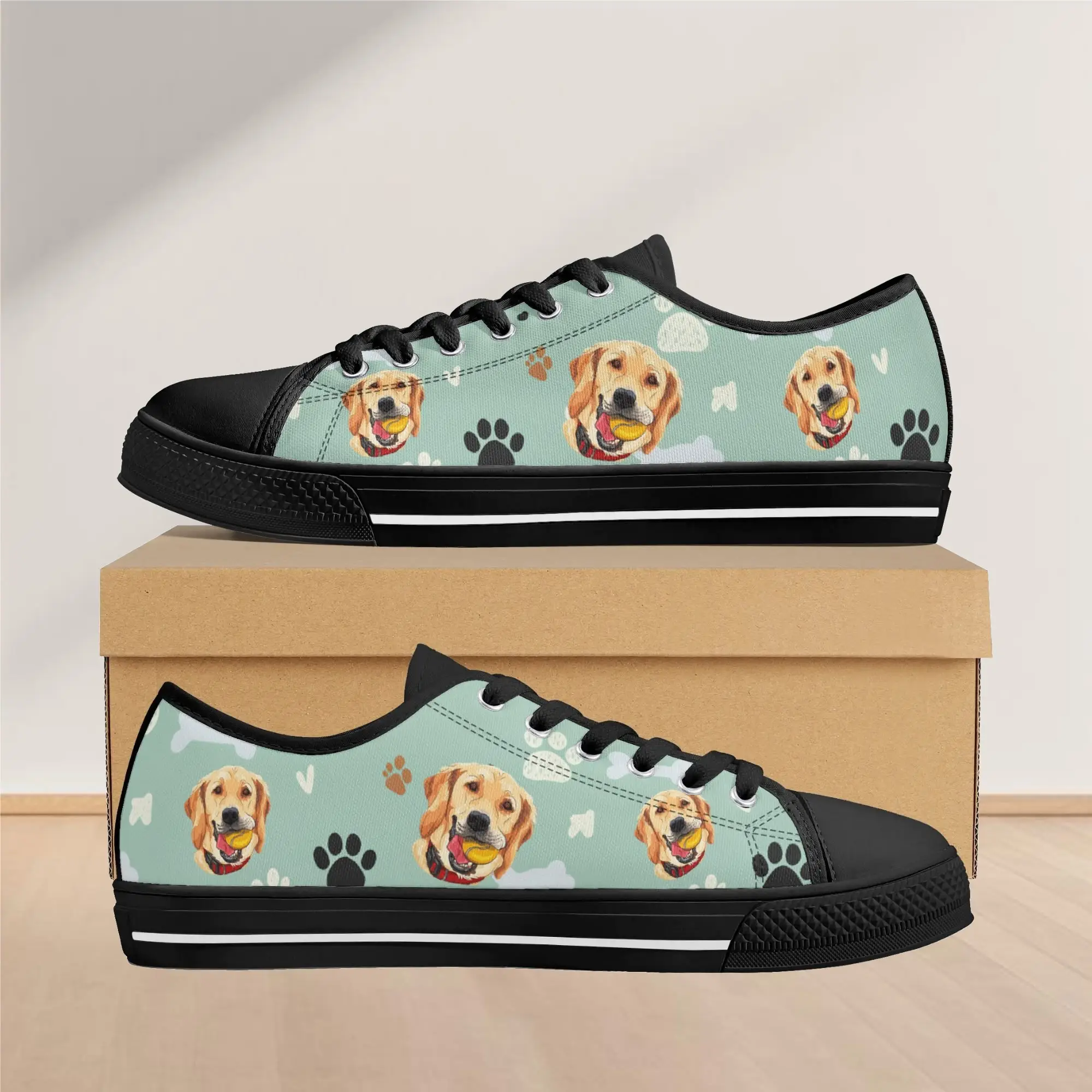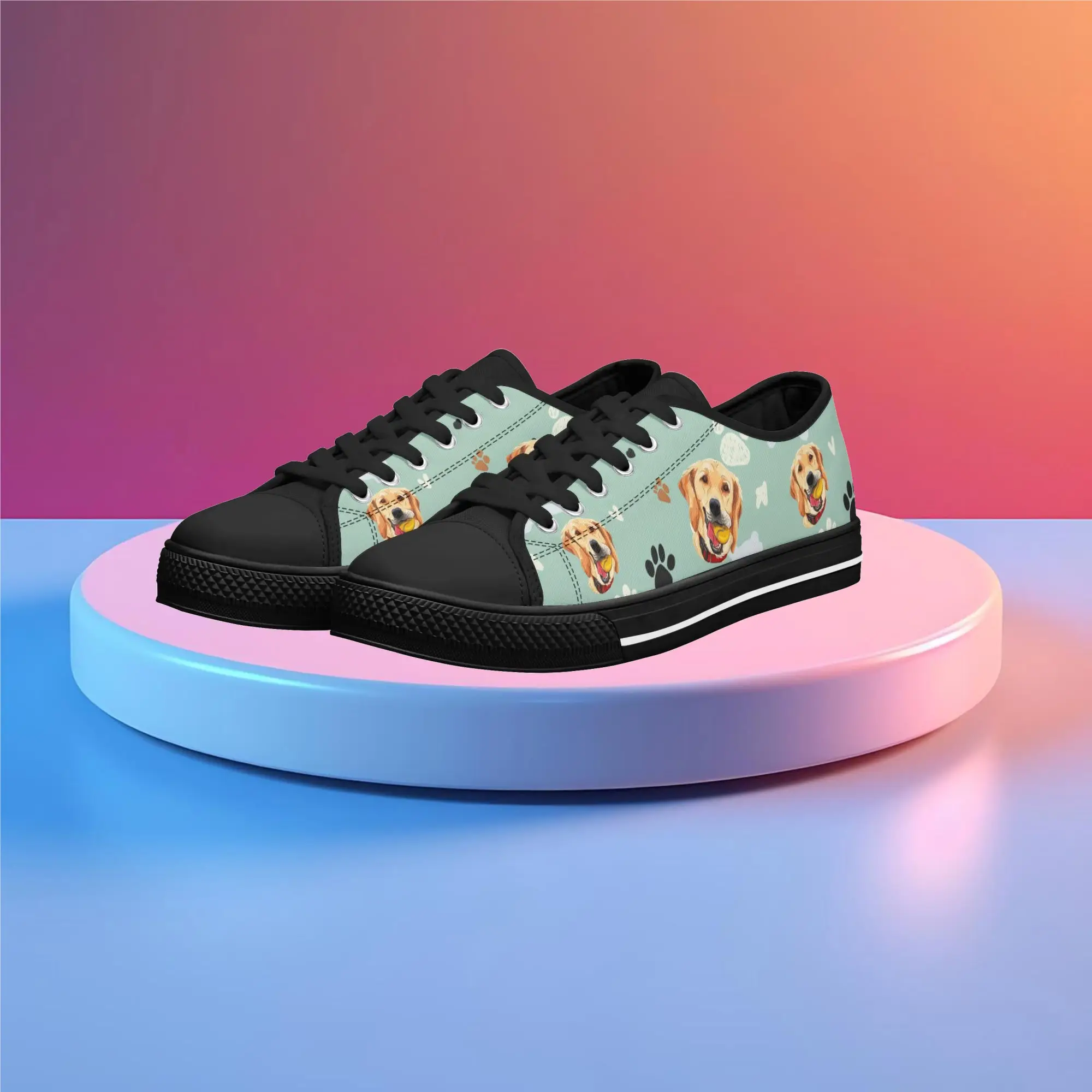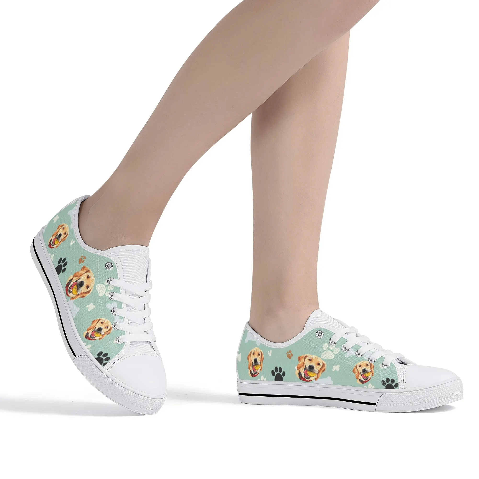 Walk the dog park in style with these cheerful Golden Retriever Low Top Canvas Shoes! Featuring a repeating pattern of happy Golden Retriever faces holding yellow balls, accented with paw prints and cute clouds on a light mint green background. These sneakers are the perfect gift for Golden owners, dog moms, dog dads, and anyone who adores this friendly, playful breed. They are comfortable, durable, and guaranteed to fetch compliments! For the ultimate personalized pet tribute, customize these shoes with your name, your dog’s name, or a heartwarming phrase like “Best Boy”!