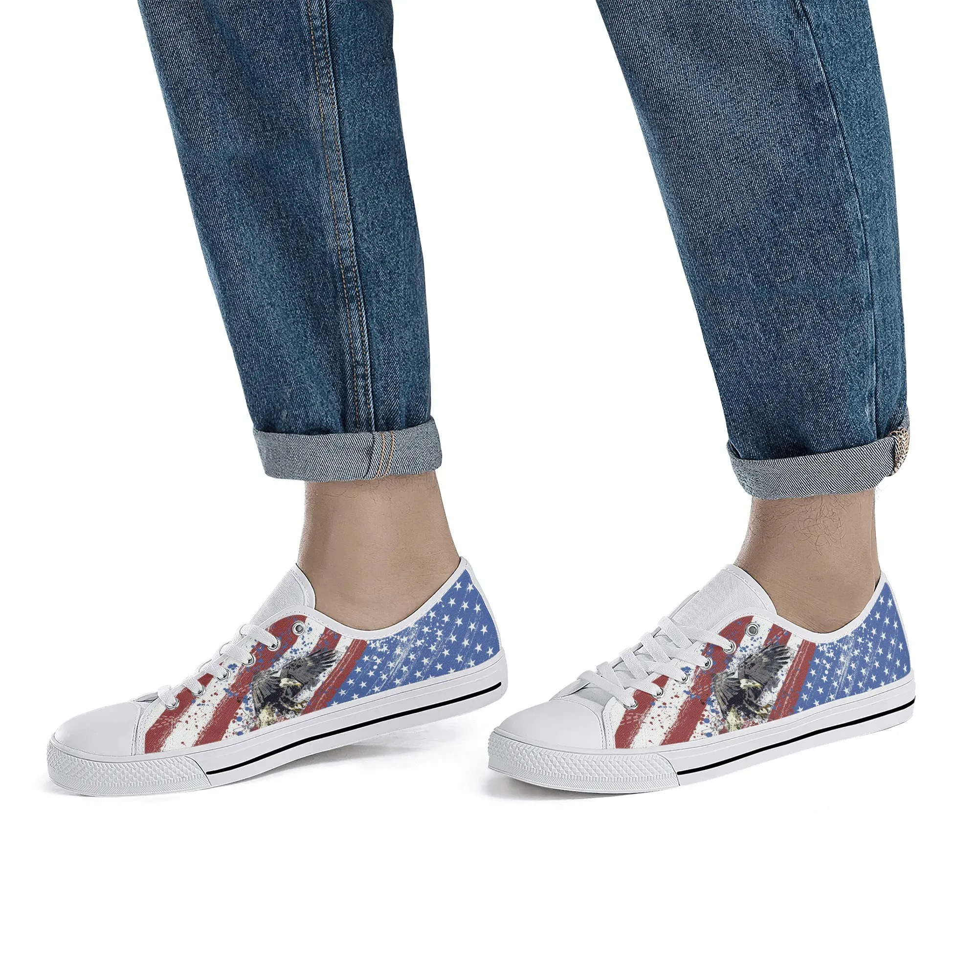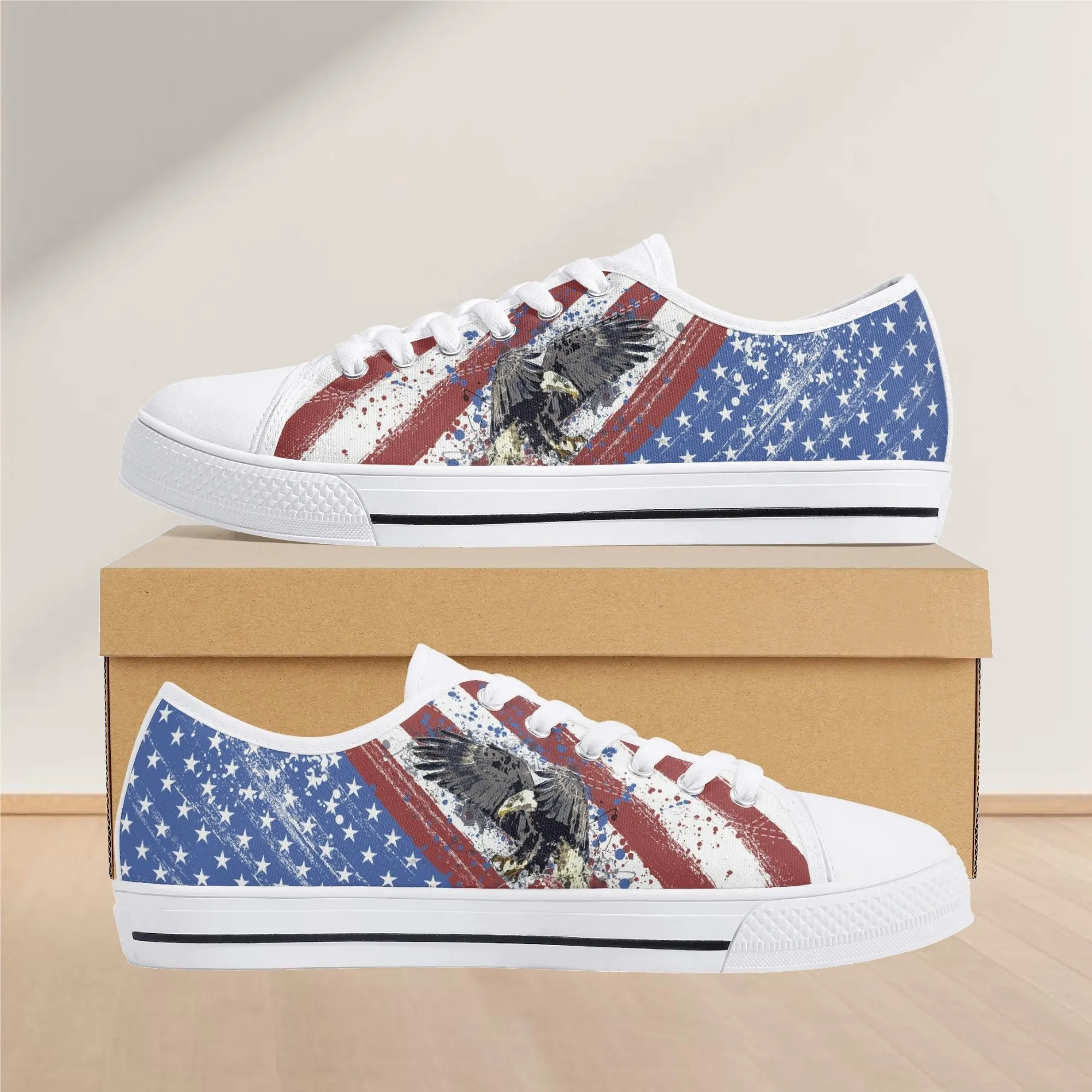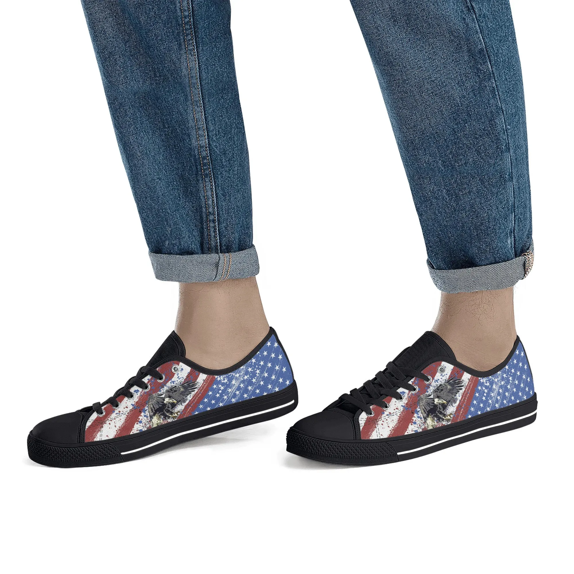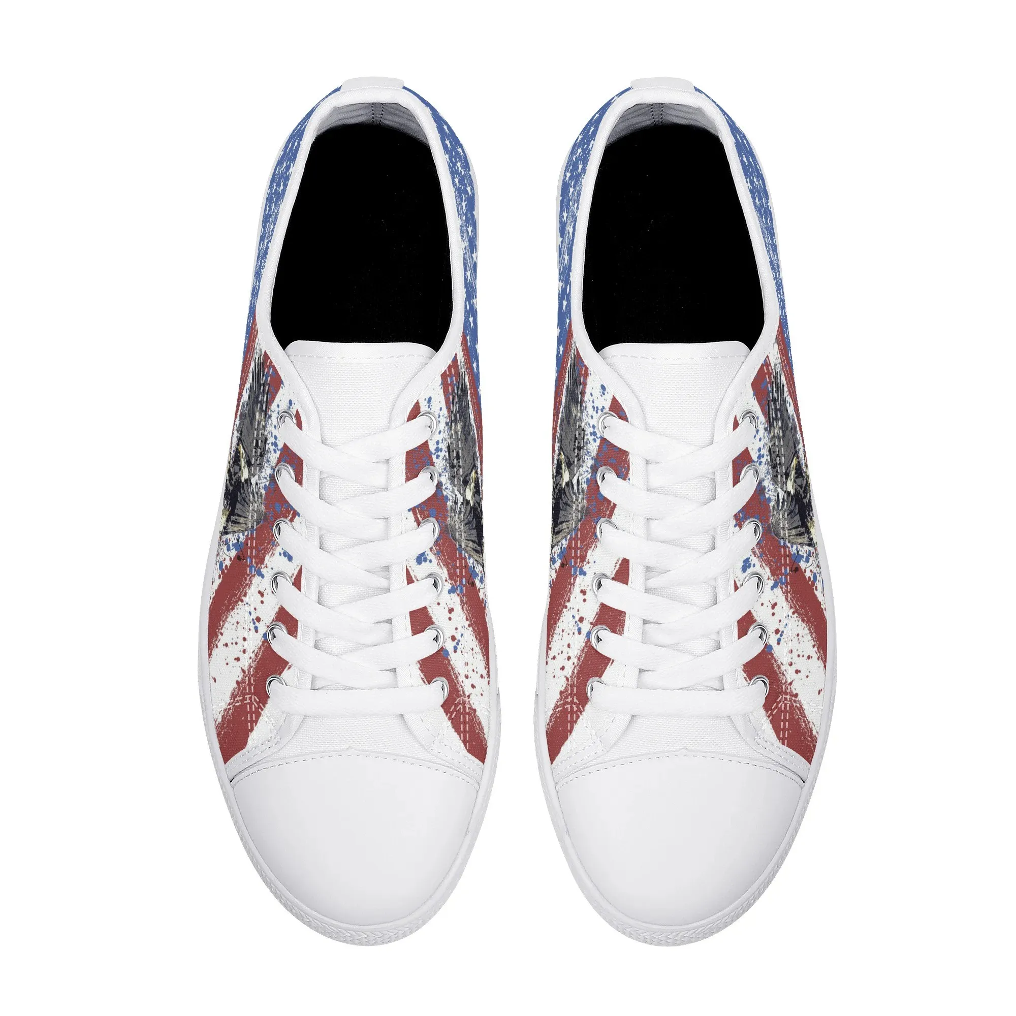 Personalized Grunge American Flag Shoes | Custom Name Distressed Eagle Low Top Canvas Sneakers | Patriotic US Military Gift