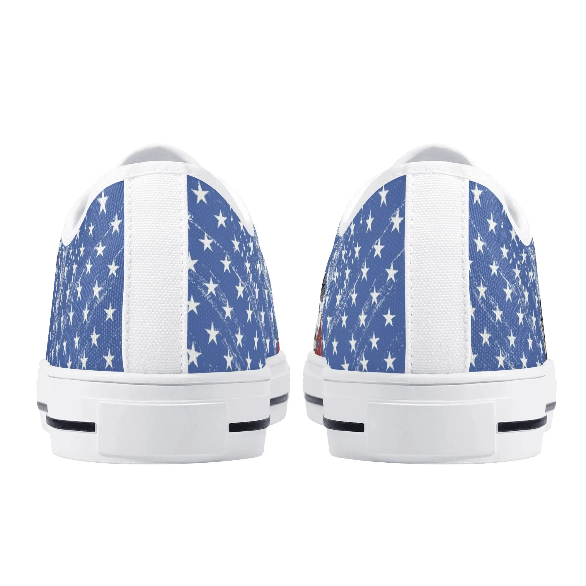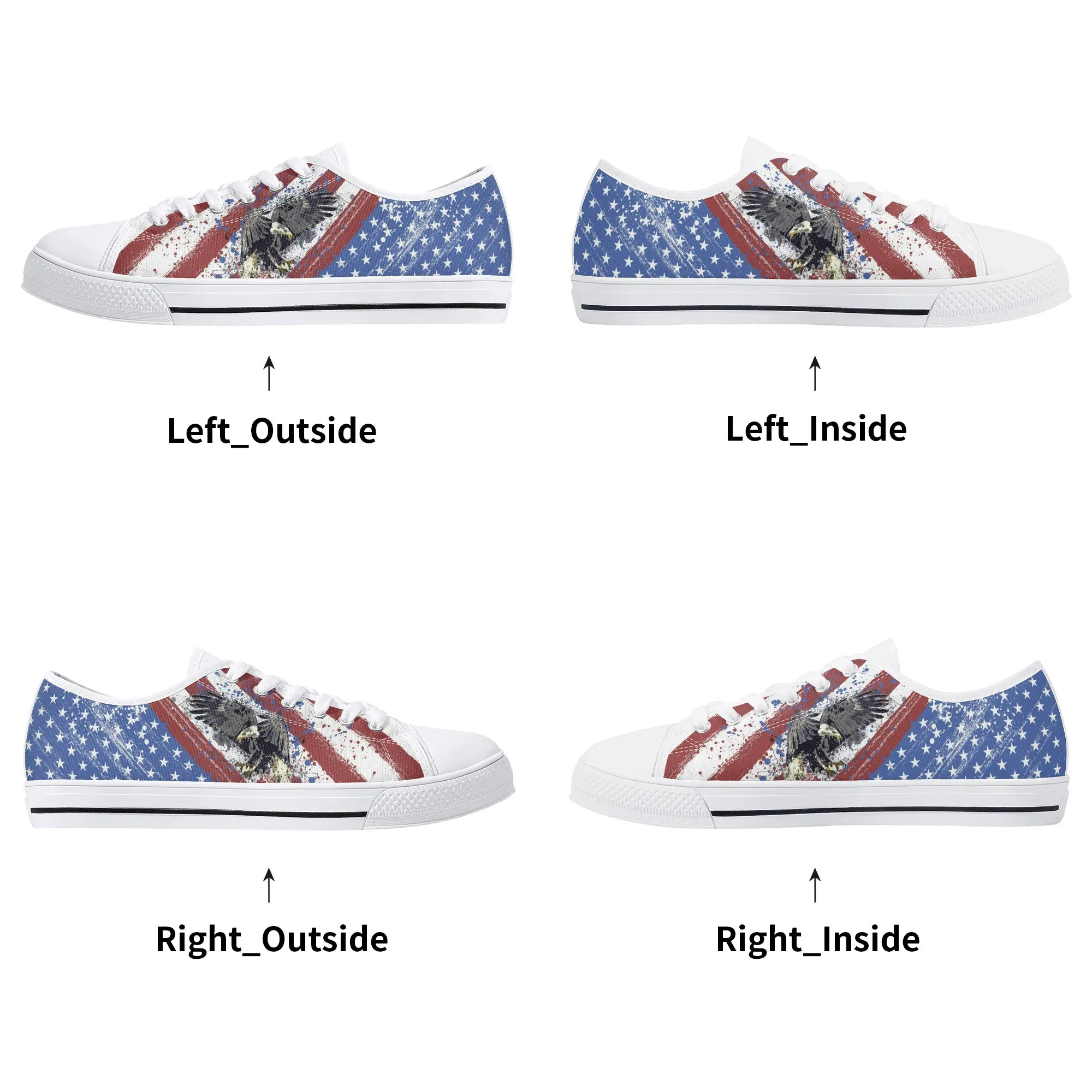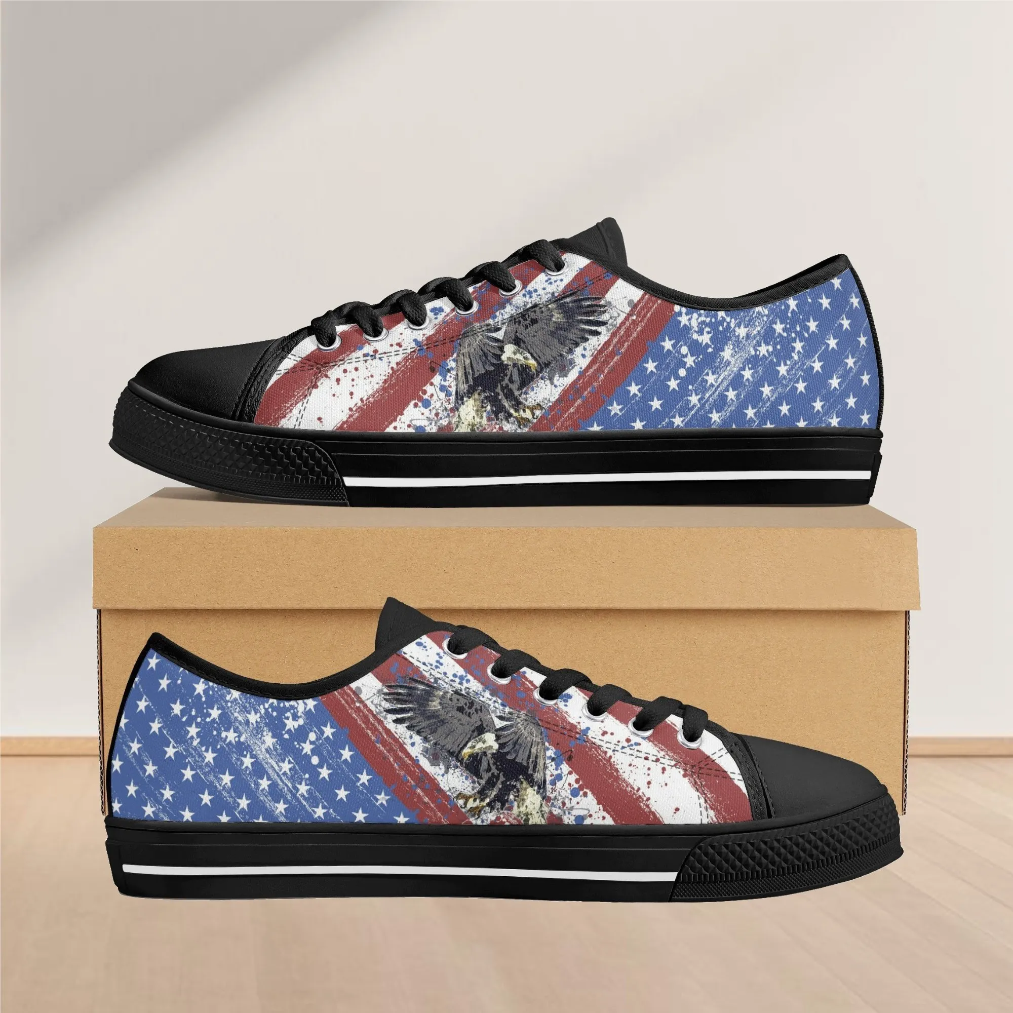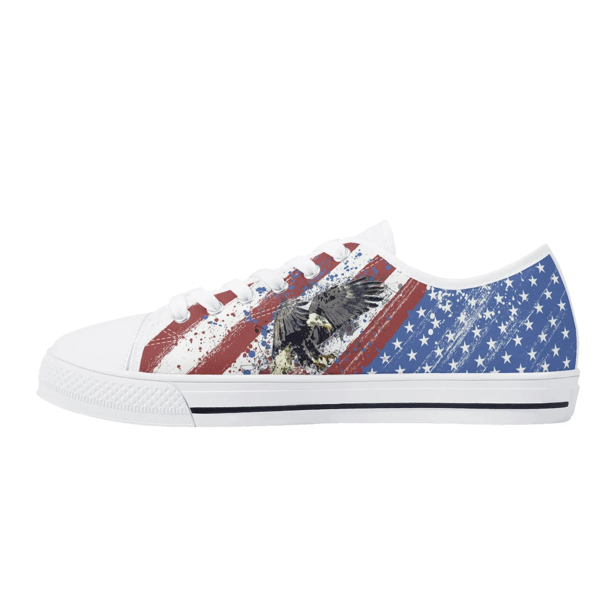 Personalized Grunge American Flag Shoes | Custom Name Distressed Eagle Low Top Canvas Sneakers | Patriotic US Military Gift