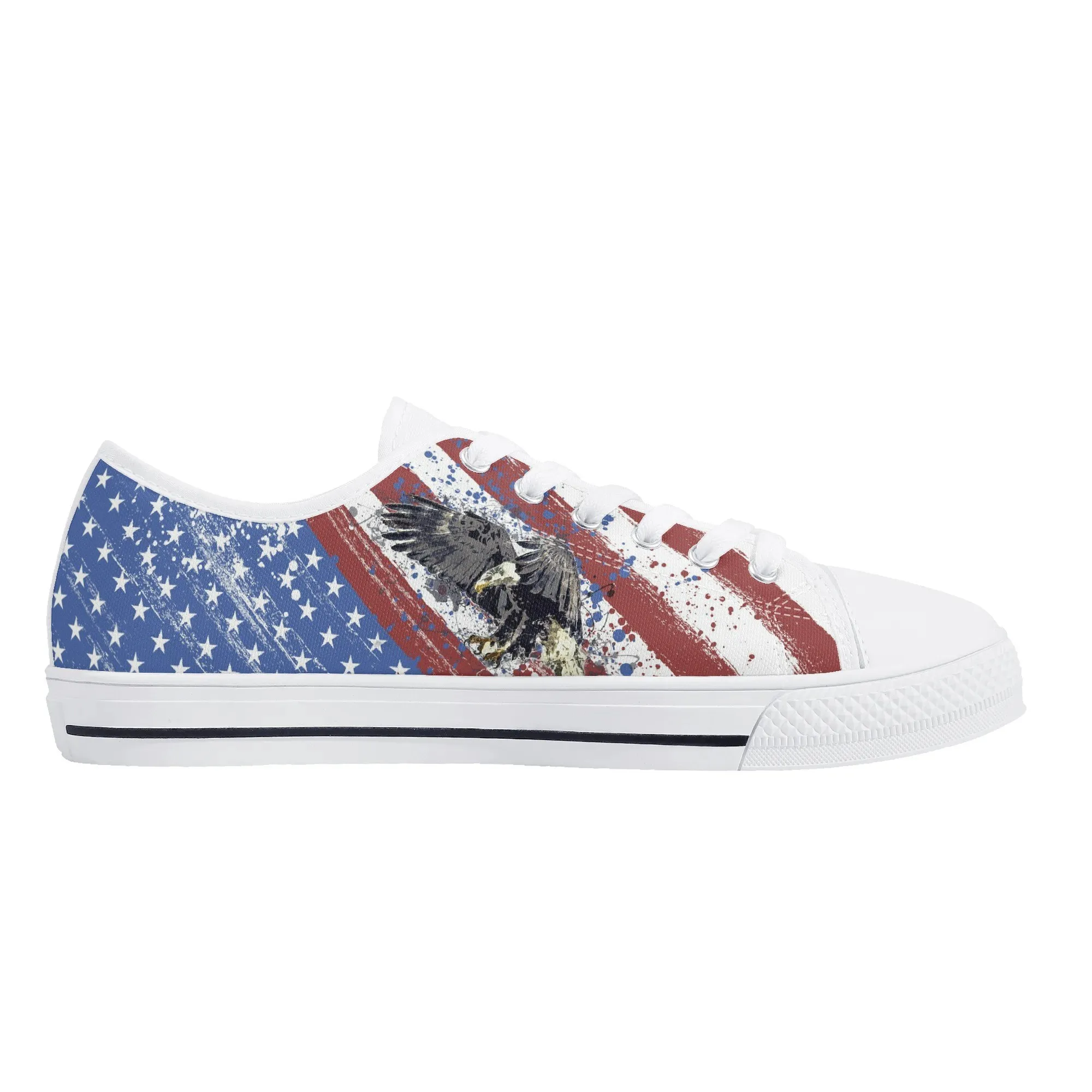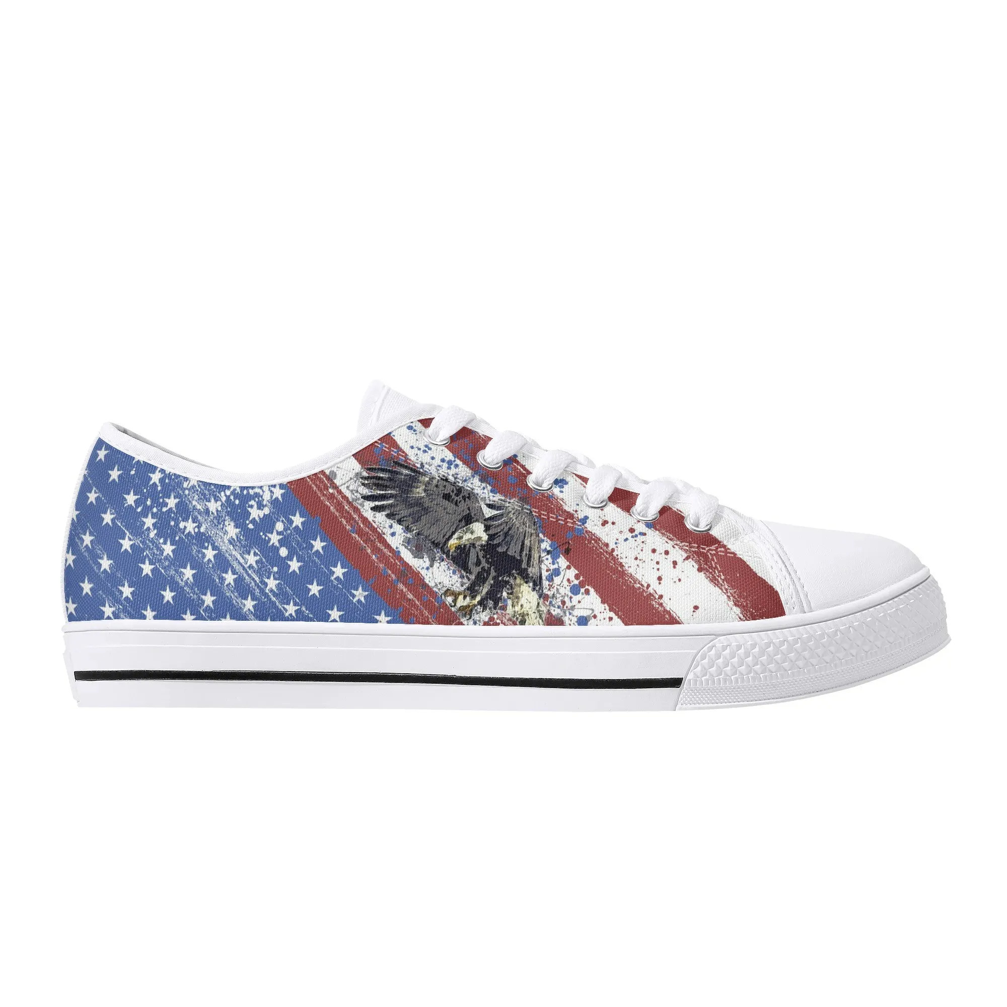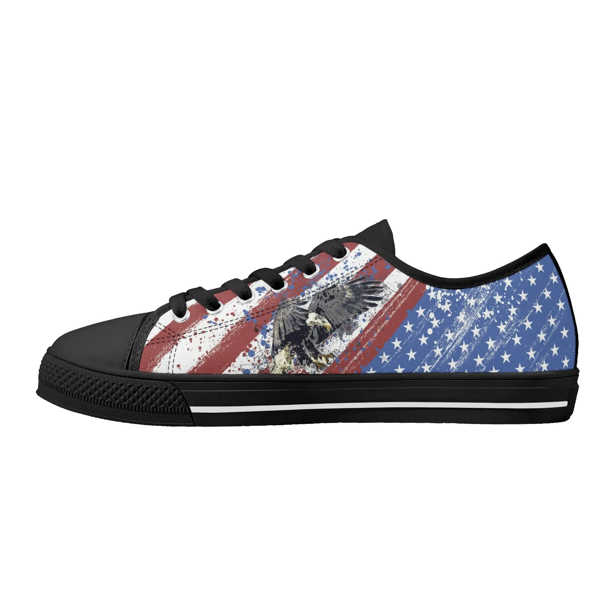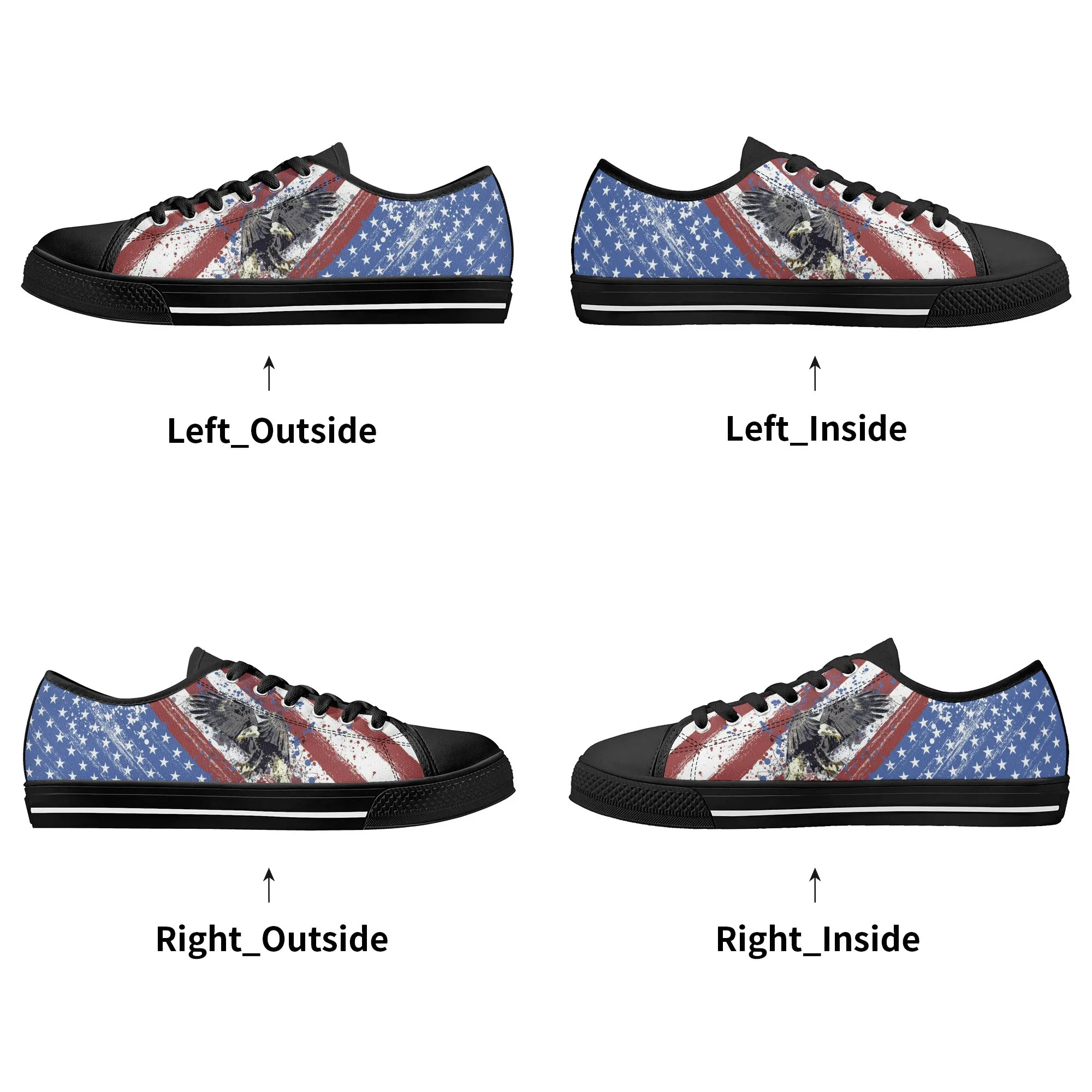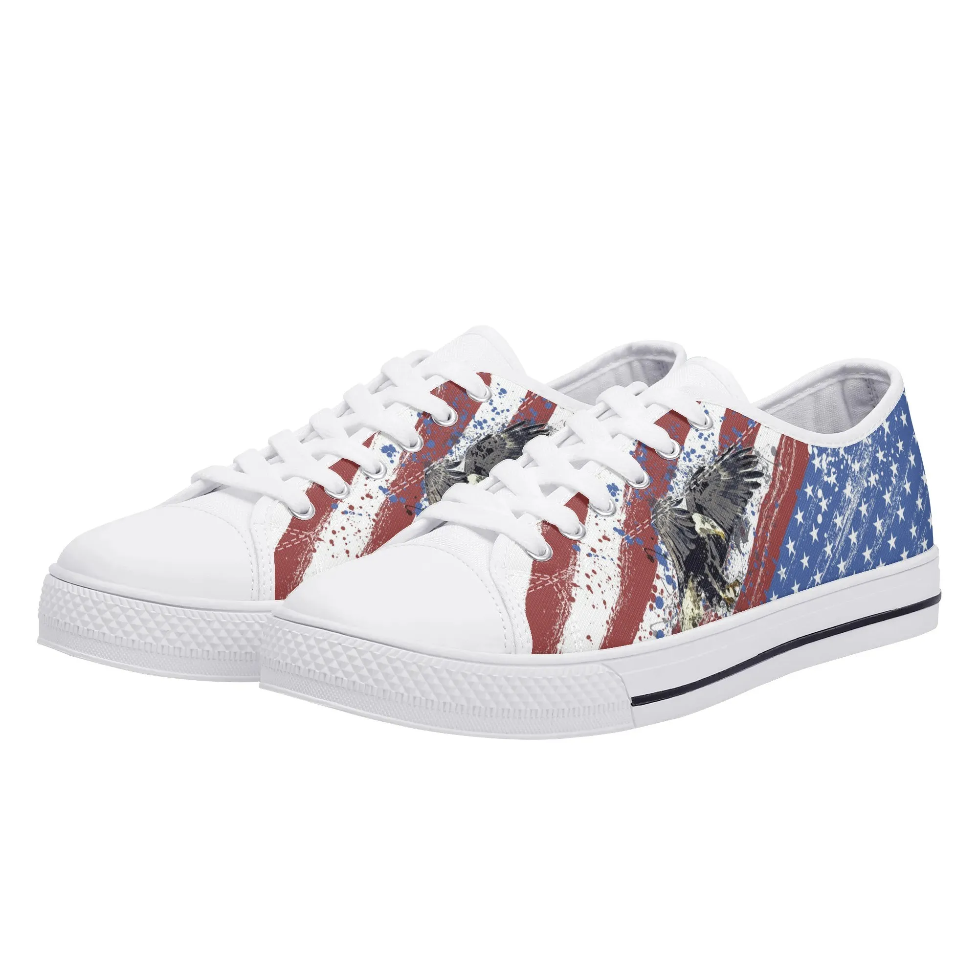 Personalized Grunge American Flag Shoes | Custom Name Distressed Eagle Low Top Canvas Sneakers | Patriotic US Military Gift