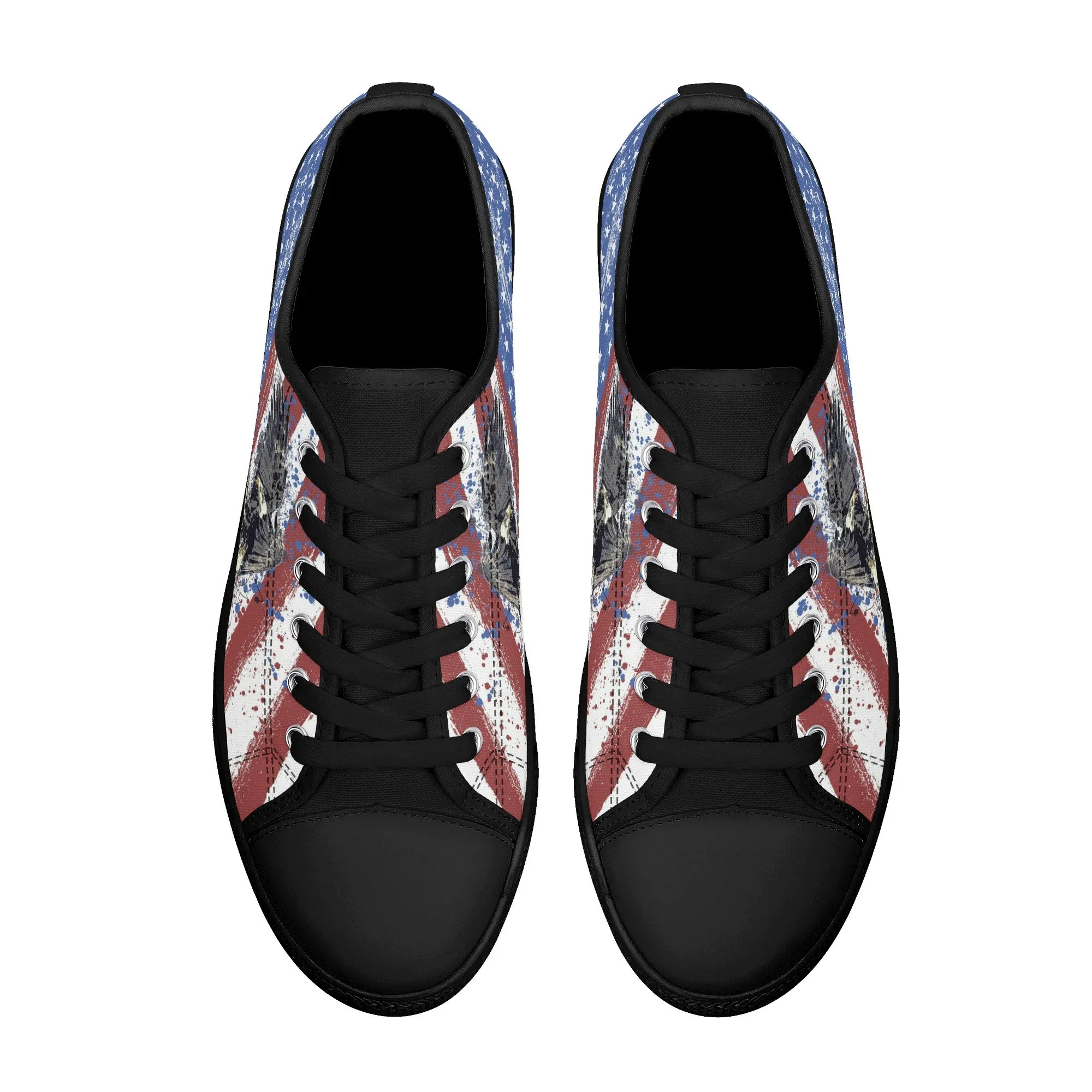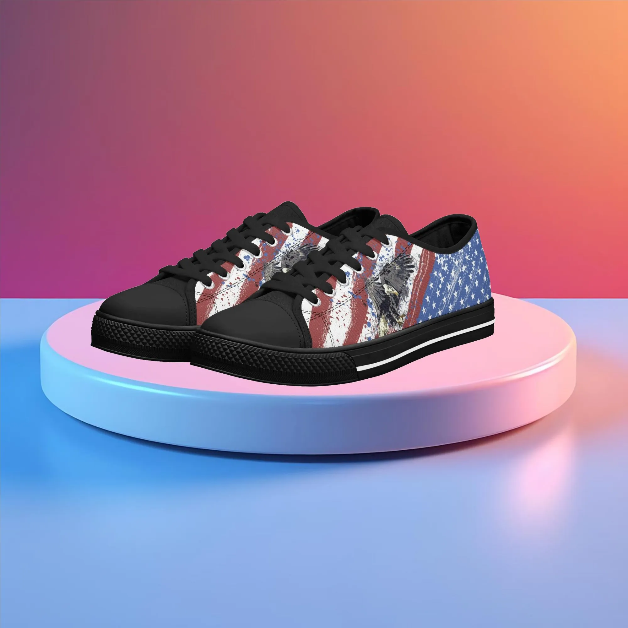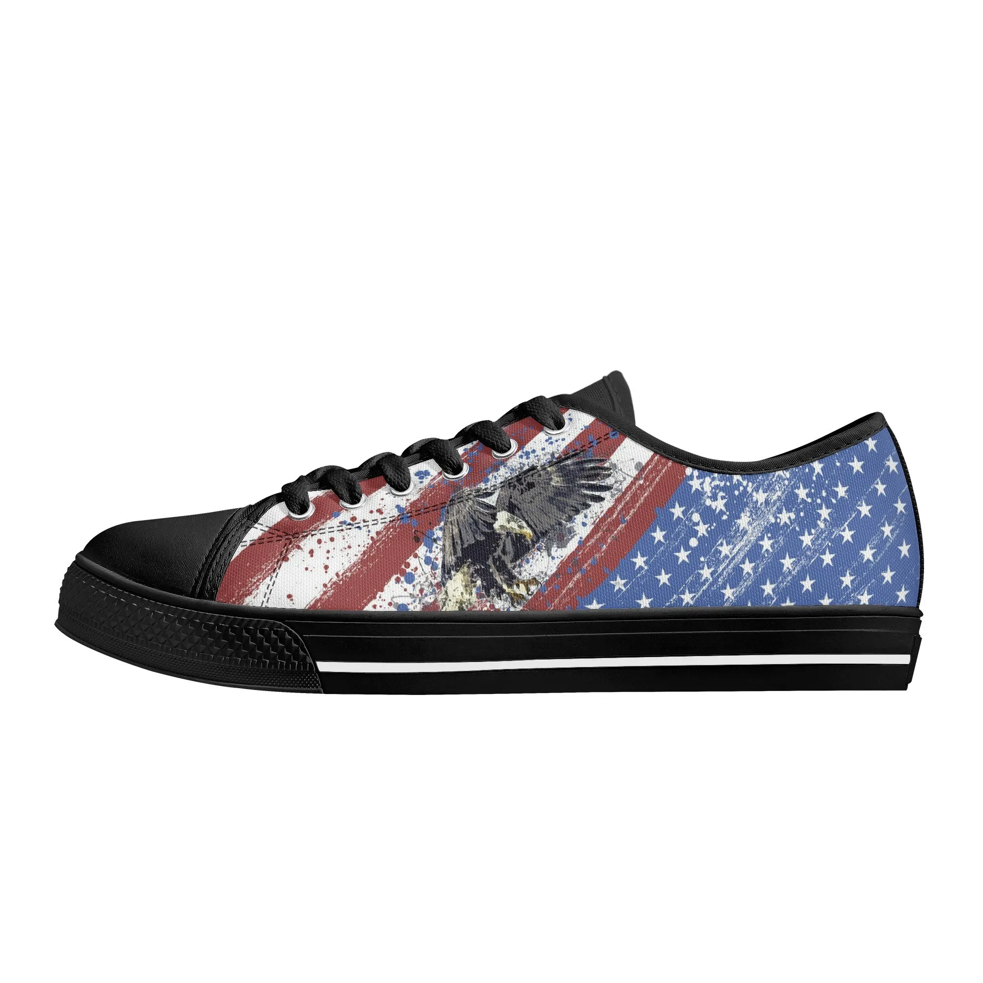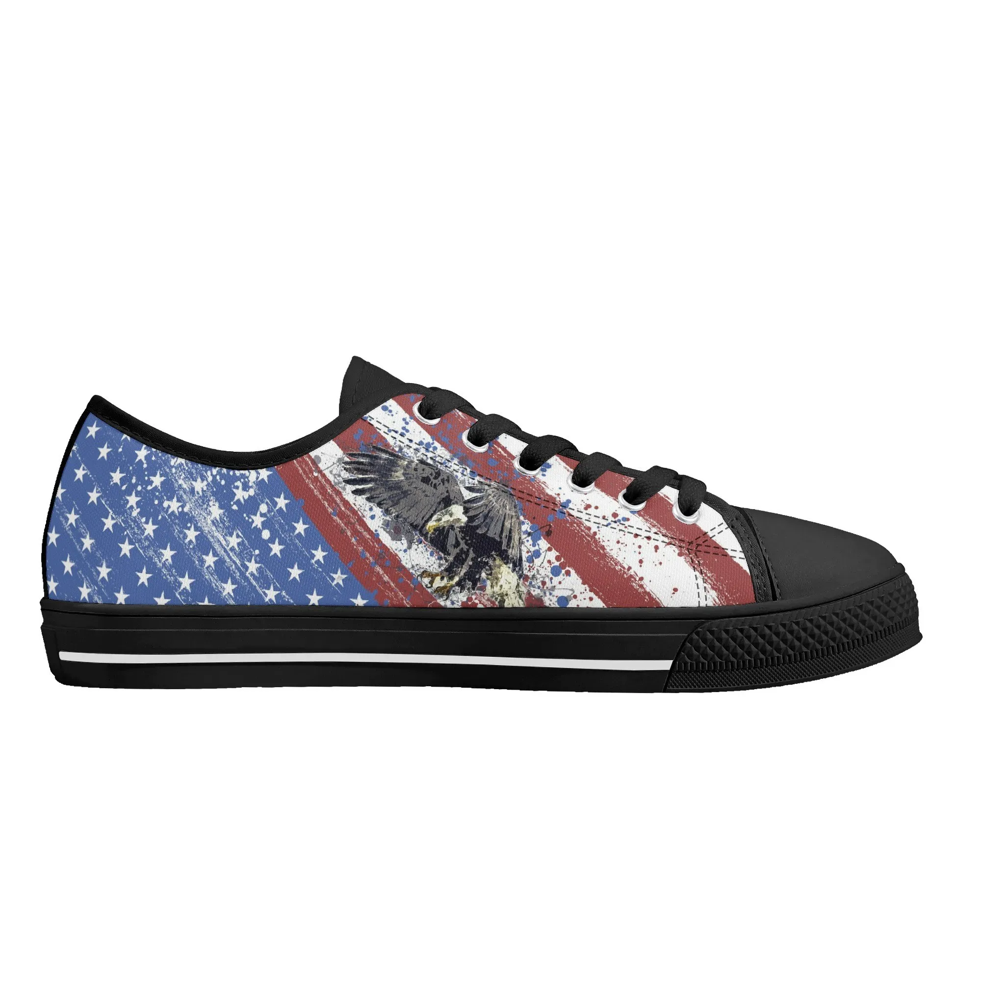 Personalized Grunge American Flag Shoes | Custom Name Distressed Eagle Low Top Canvas Sneakers | Patriotic US Military Gift