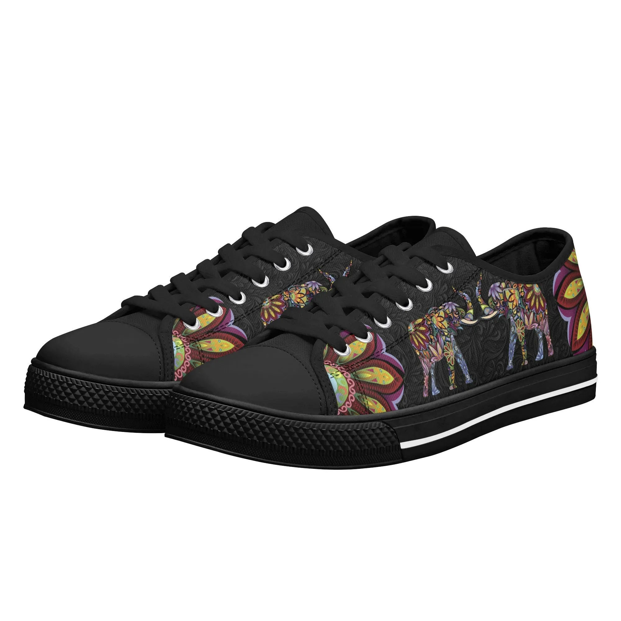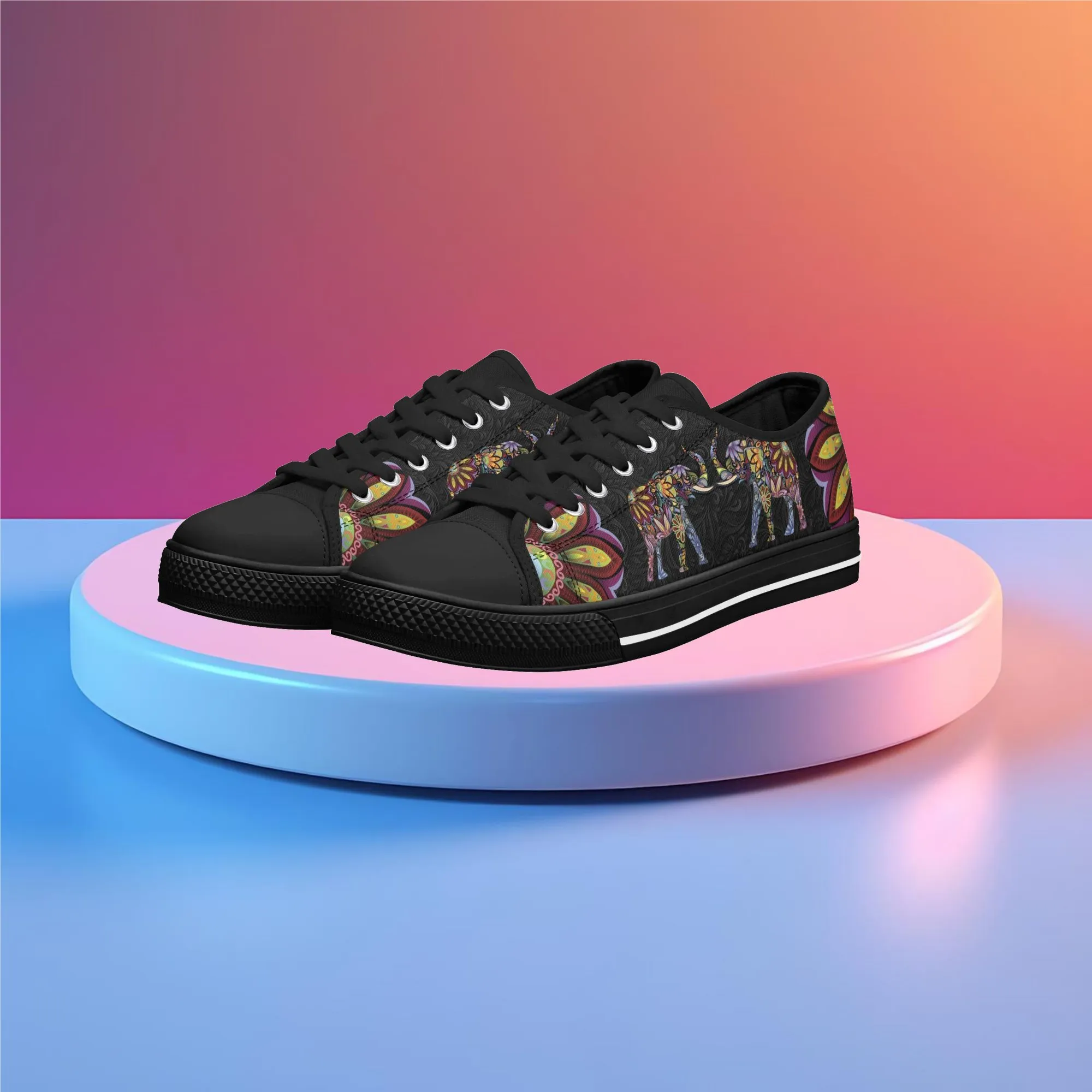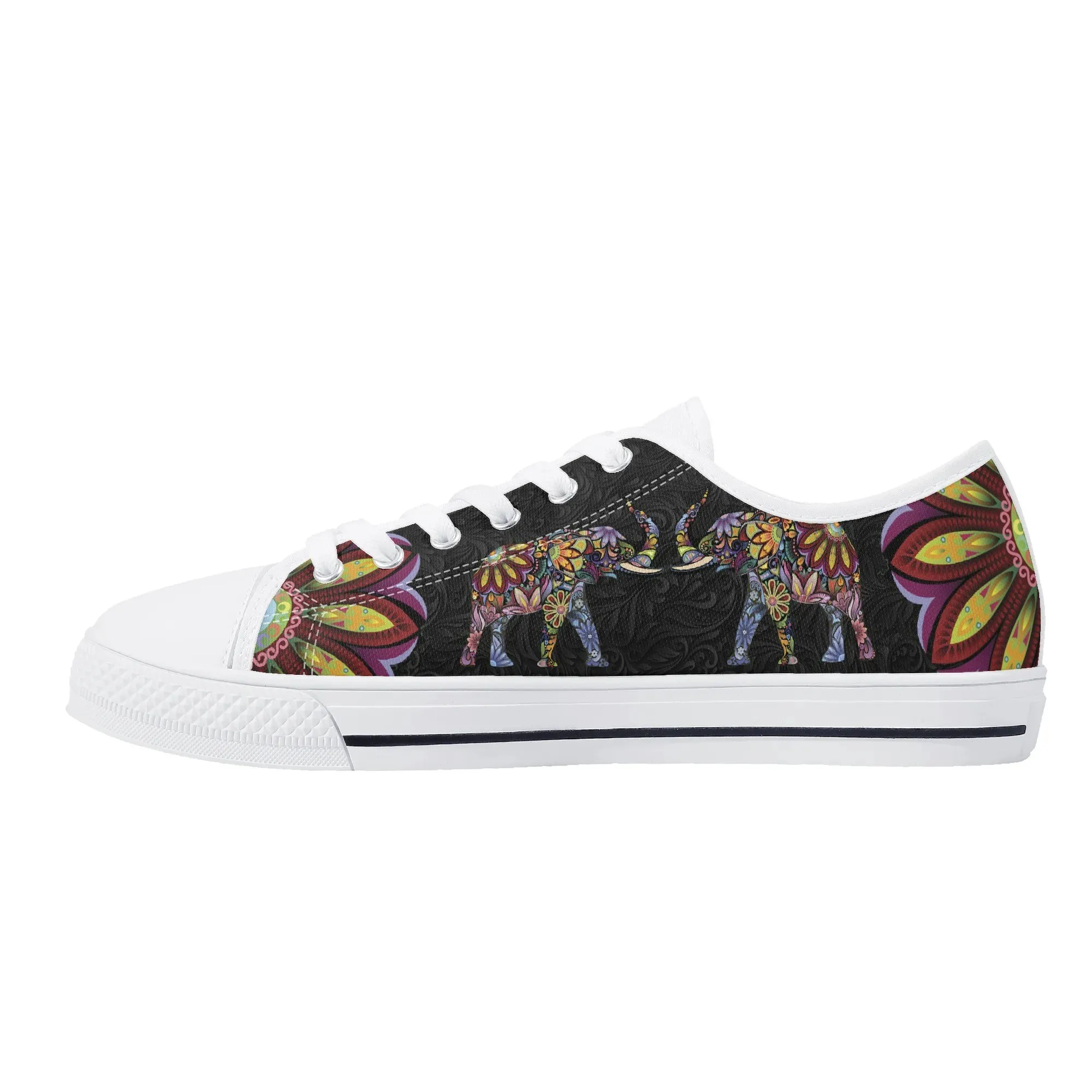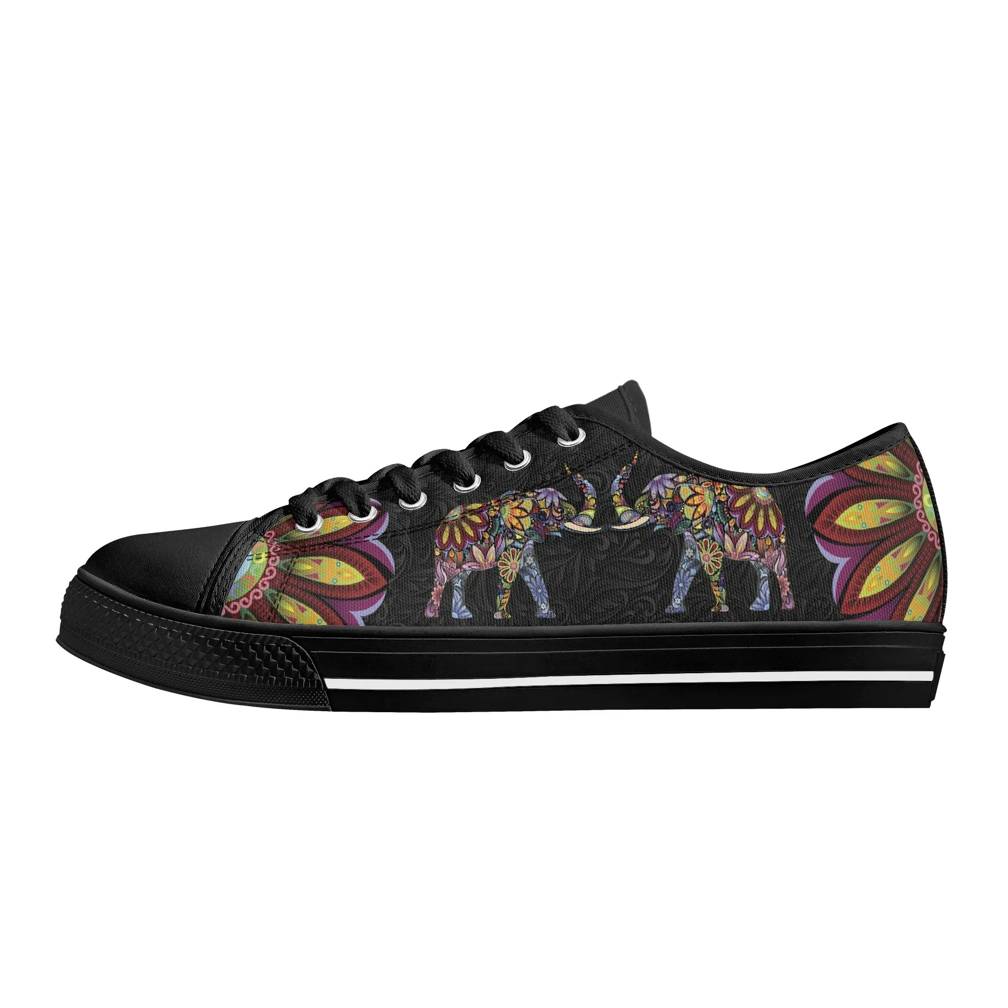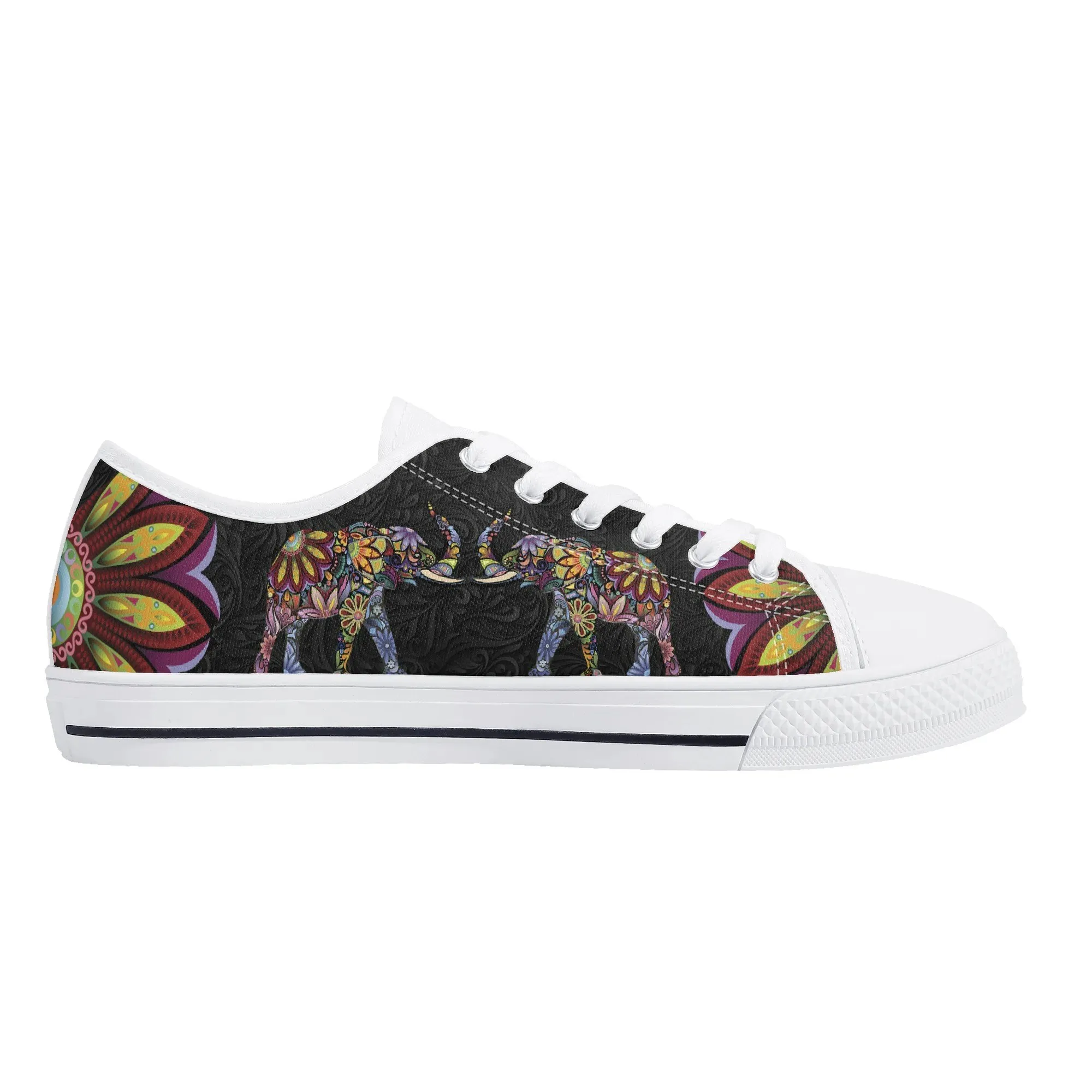 Walk with grace and spiritual style in these vibrant Mandala Elephant Low Top Canvas Shoes! Featuring highly detailed elephant figures intricately decorated with colorful, geometric mandala patterns, these sneakers are set against a dark background with striking floral/mandala accents. They are the perfect accessory for fans of Boho fashion, spiritual symbolism, and Hindu-inspired art. Honor your spirit animal or simply make a unique style statement by customizing these shoes with a name, mantra, or short text!