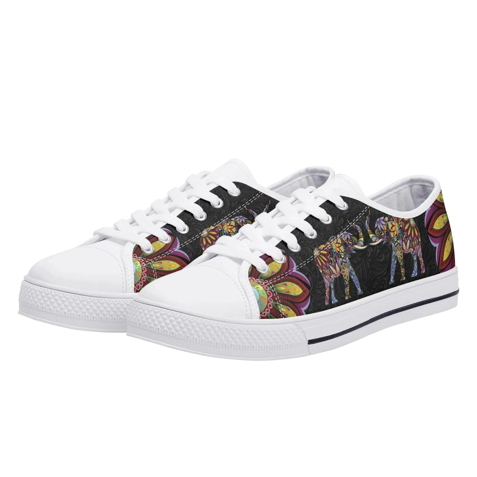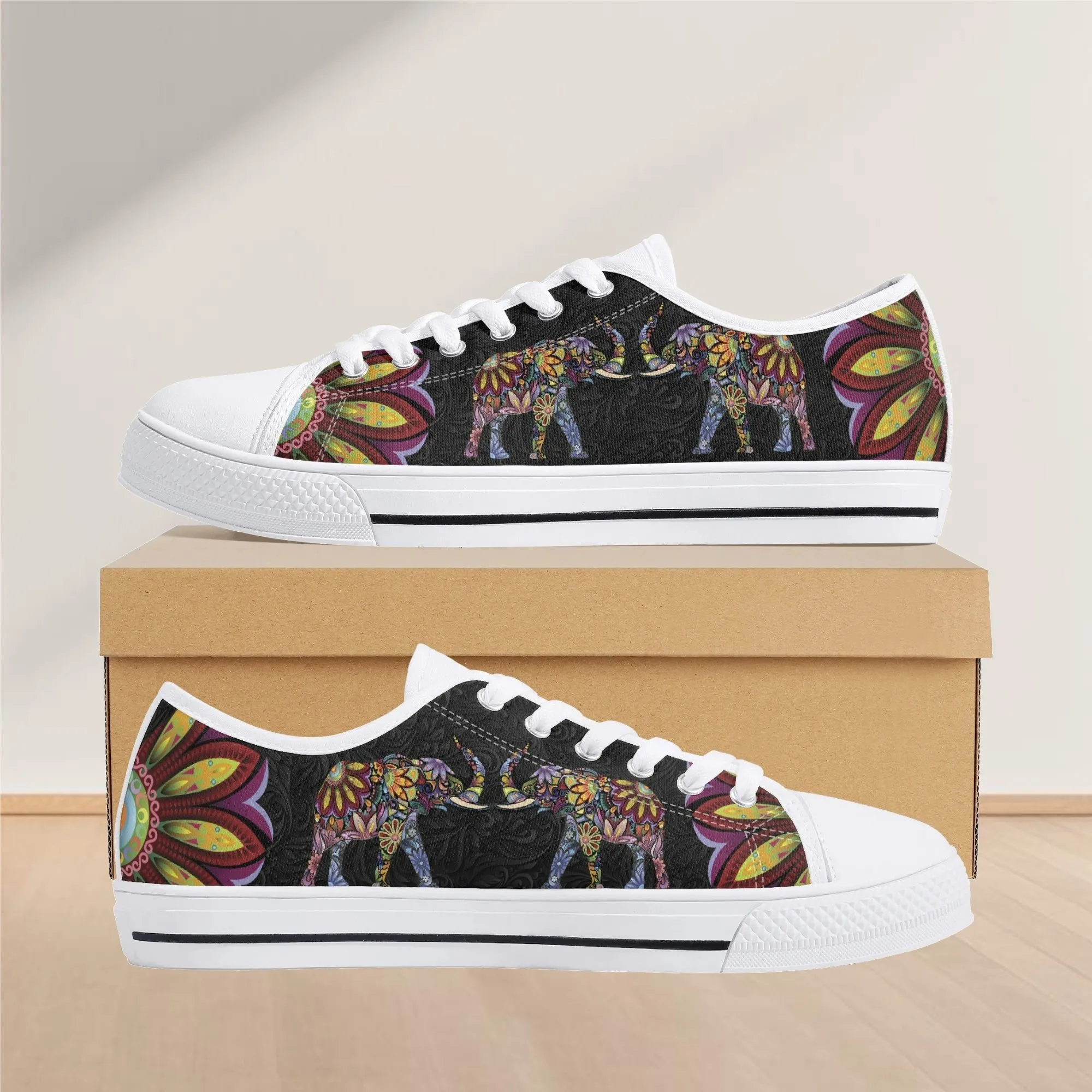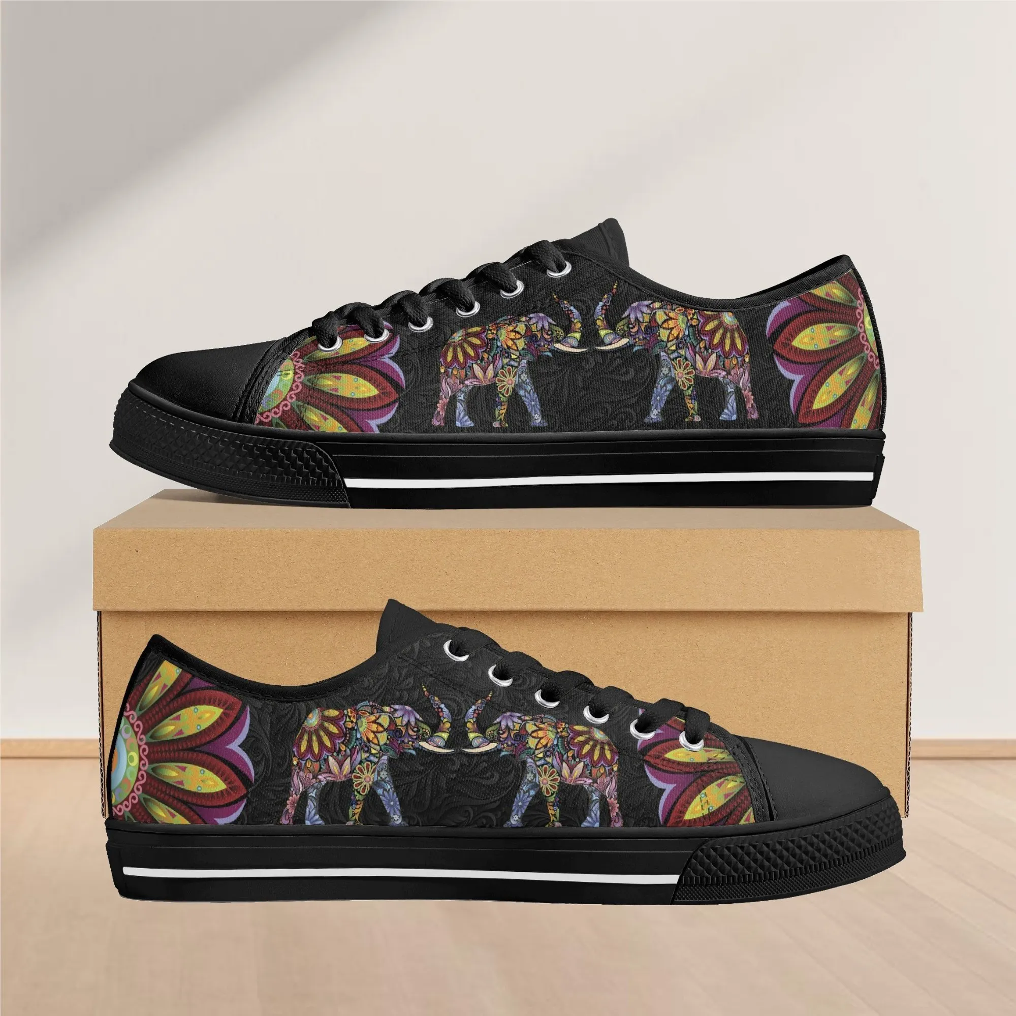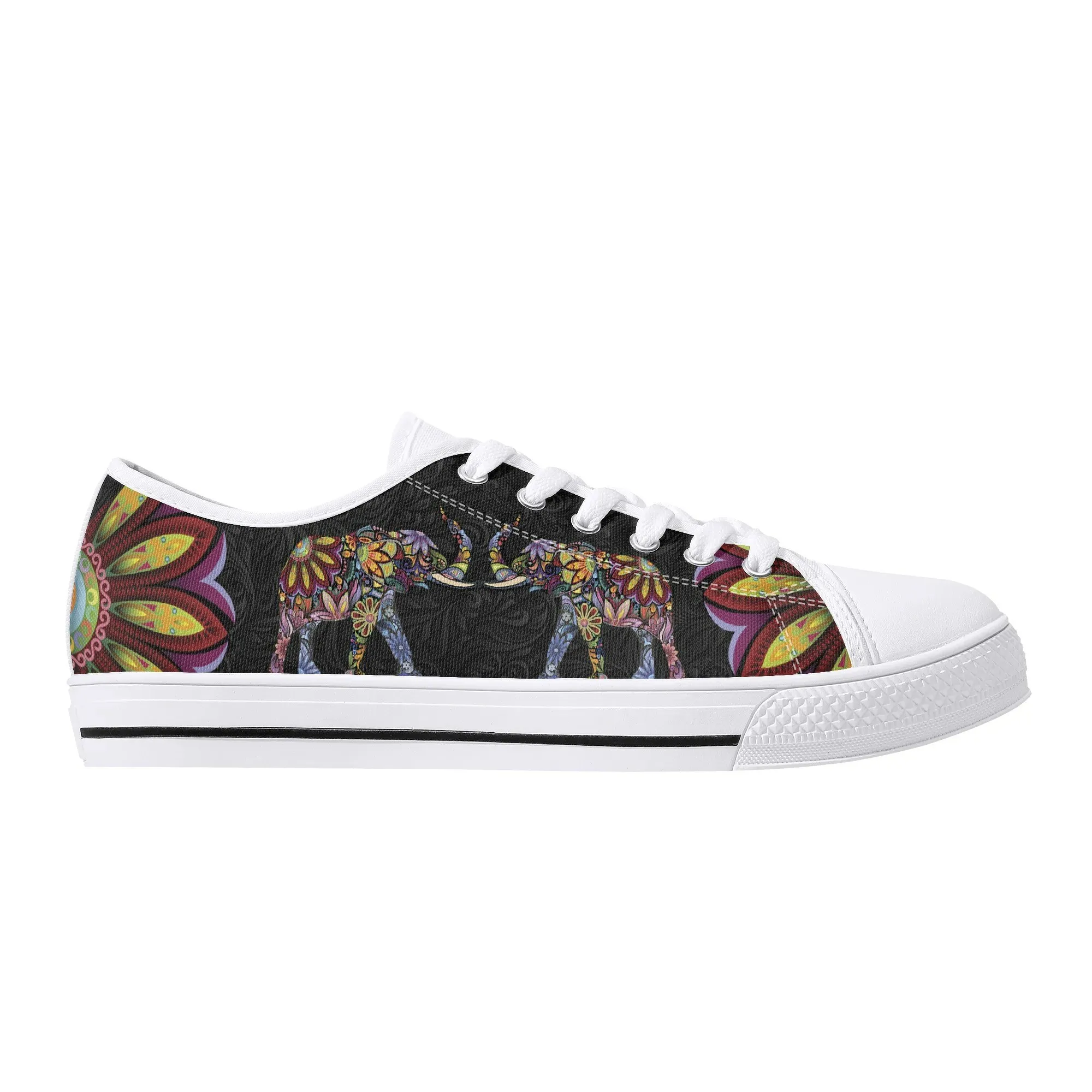 Walk with grace and spiritual style in these vibrant Mandala Elephant Low Top Canvas Shoes! Featuring highly detailed elephant figures intricately decorated with colorful, geometric mandala patterns, these sneakers are set against a dark background with striking floral/mandala accents. They are the perfect accessory for fans of Boho fashion, spiritual symbolism, and Hindu-inspired art. Honor your spirit animal or simply make a unique style statement by customizing these shoes with a name, mantra, or short text!