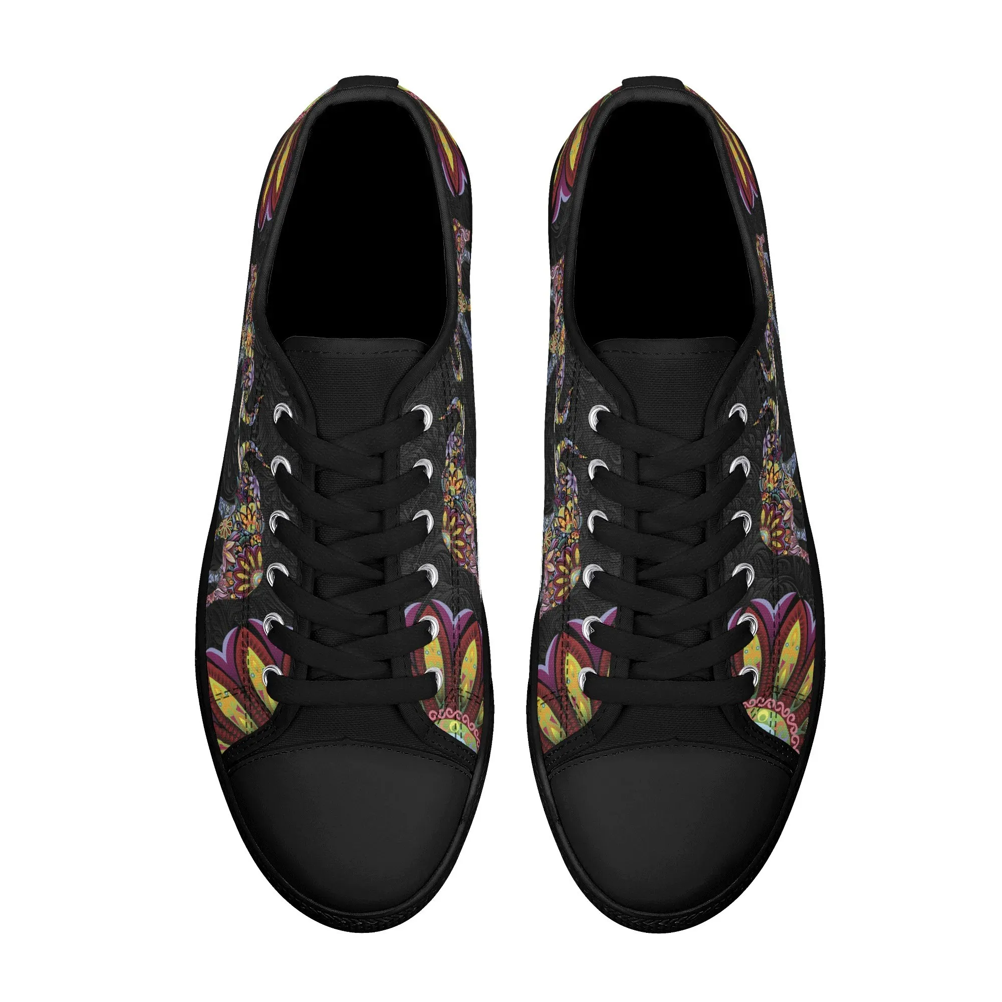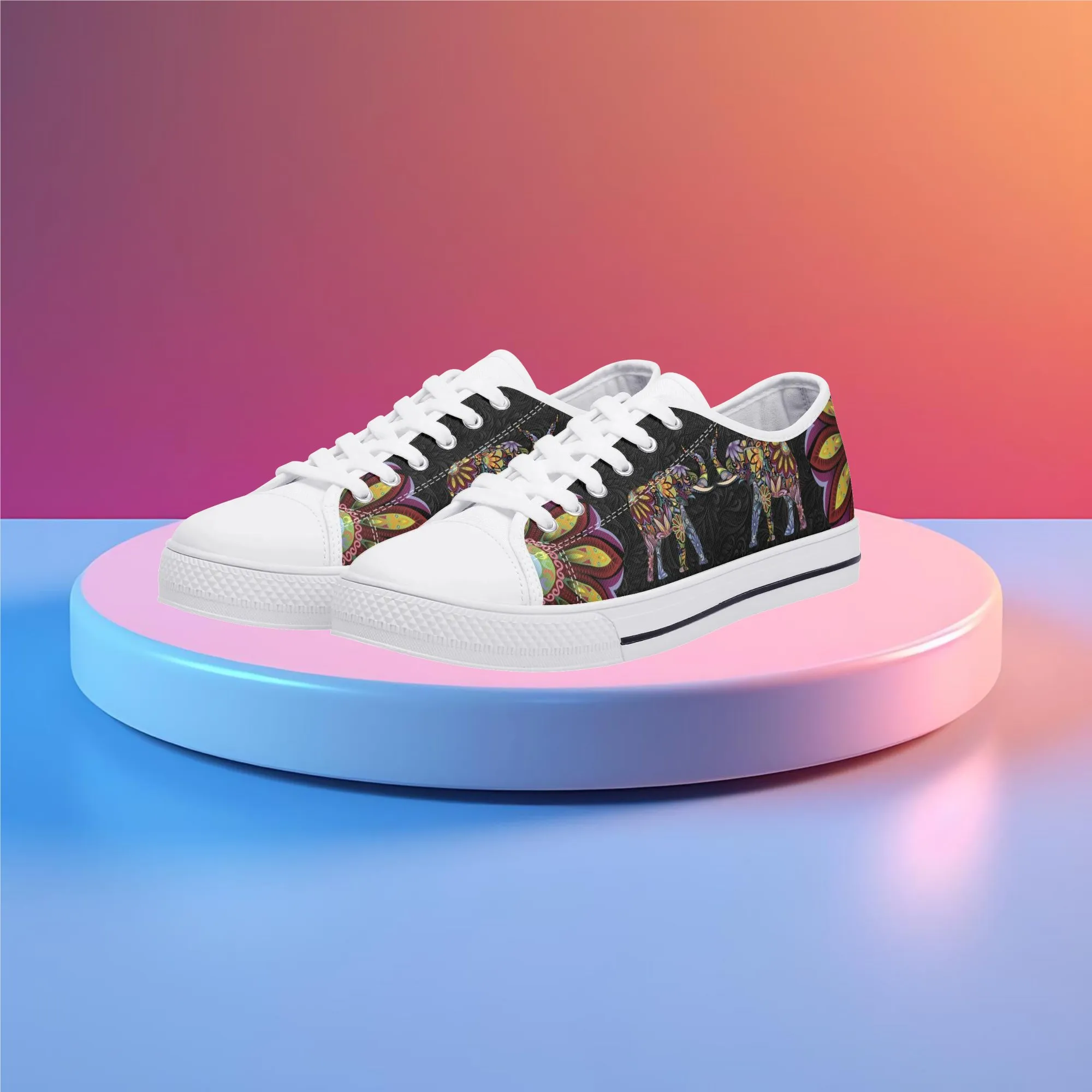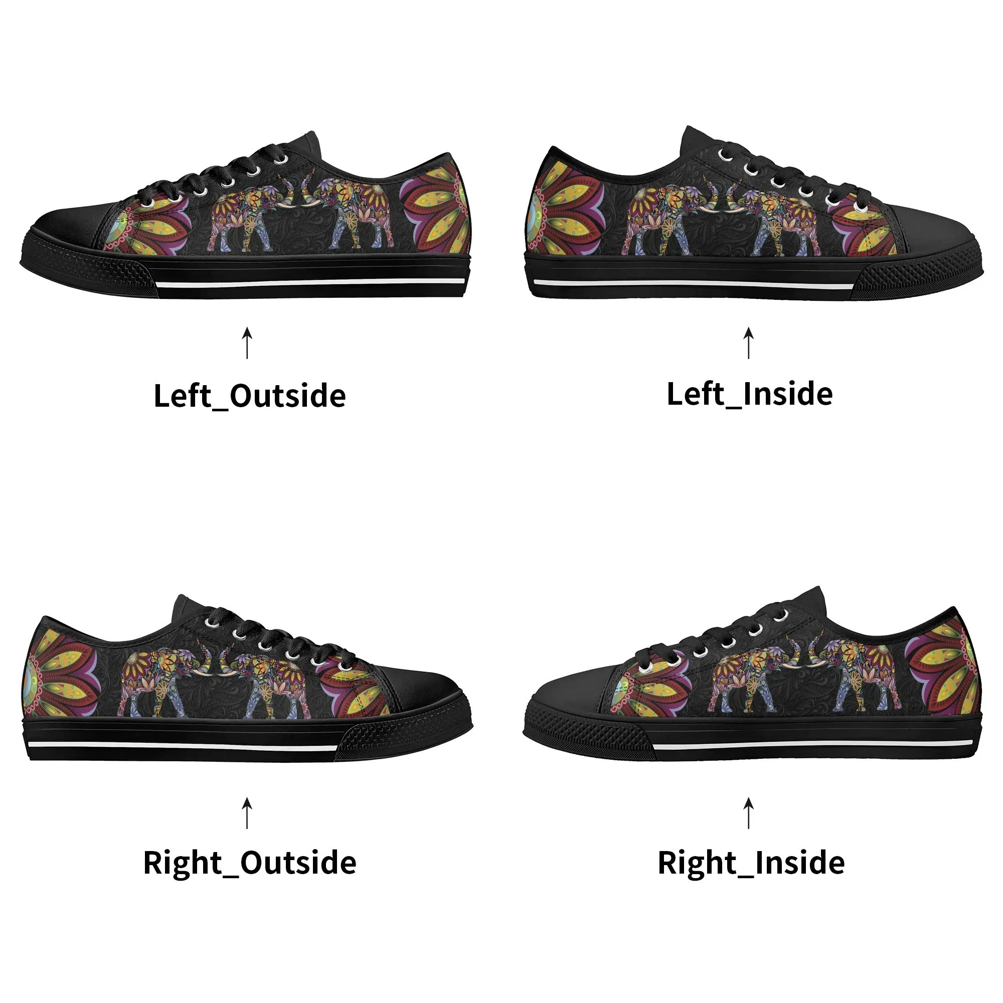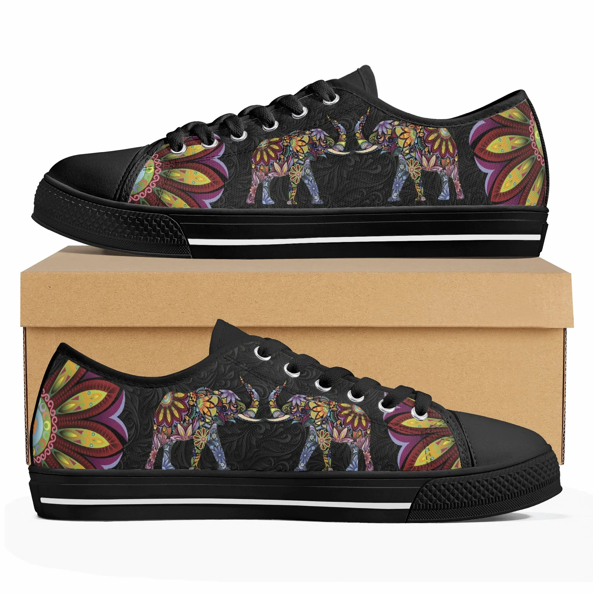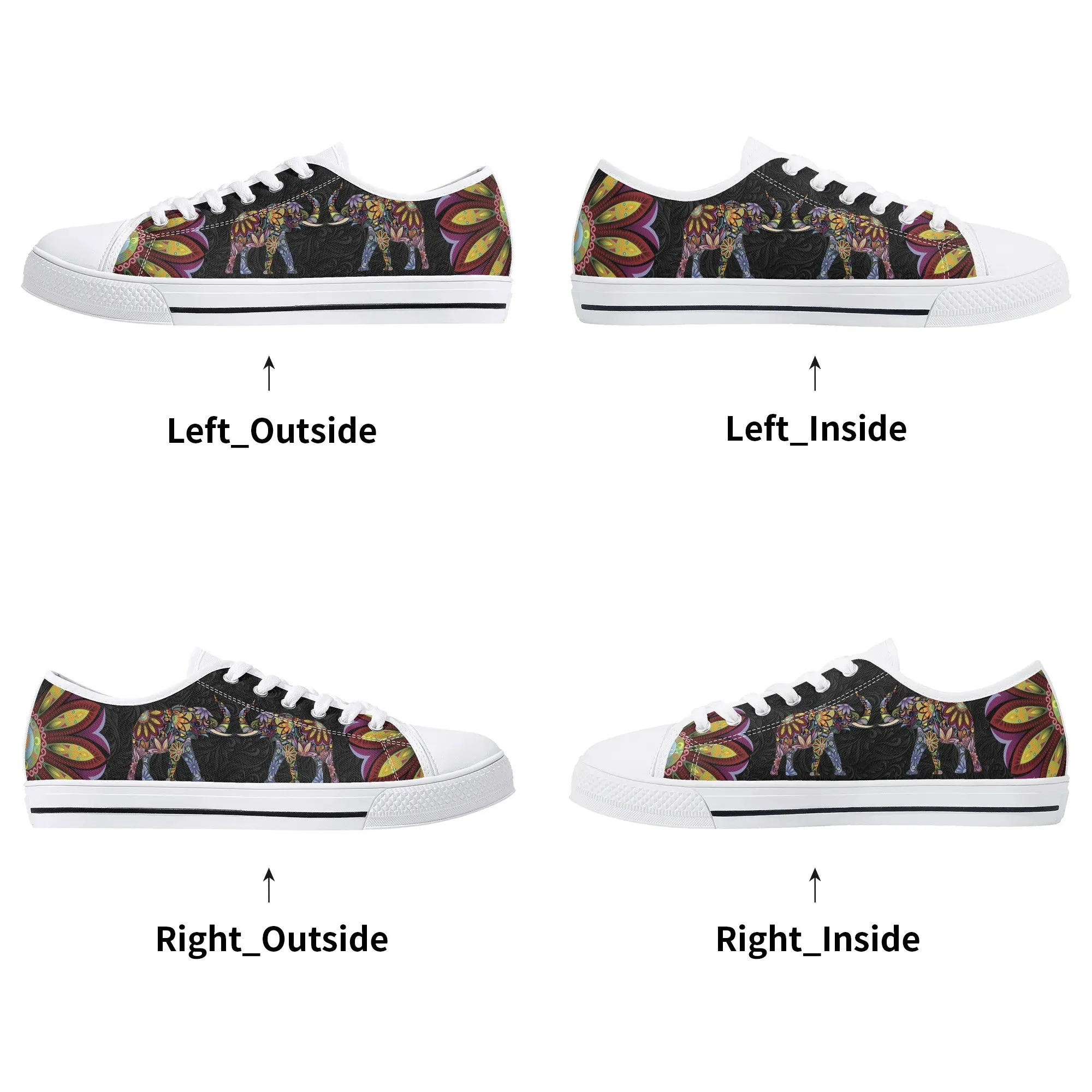 Walk with grace and spiritual style in these vibrant Mandala Elephant Low Top Canvas Shoes! Featuring highly detailed elephant figures intricately decorated with colorful, geometric mandala patterns, these sneakers are set against a dark background with striking floral/mandala accents. They are the perfect accessory for fans of Boho fashion, spiritual symbolism, and Hindu-inspired art. Honor your spirit animal or simply make a unique style statement by customizing these shoes with a name, mantra, or short text!