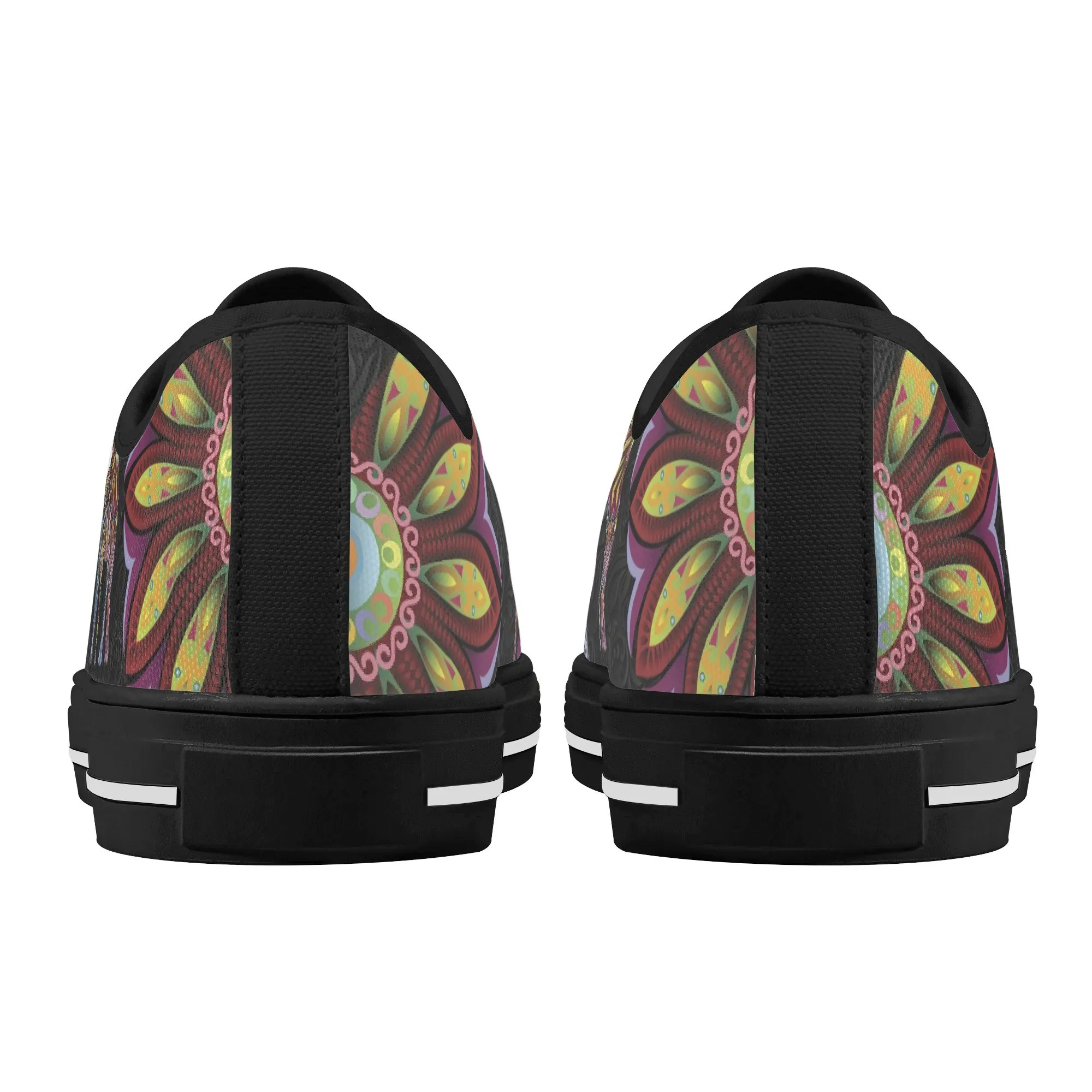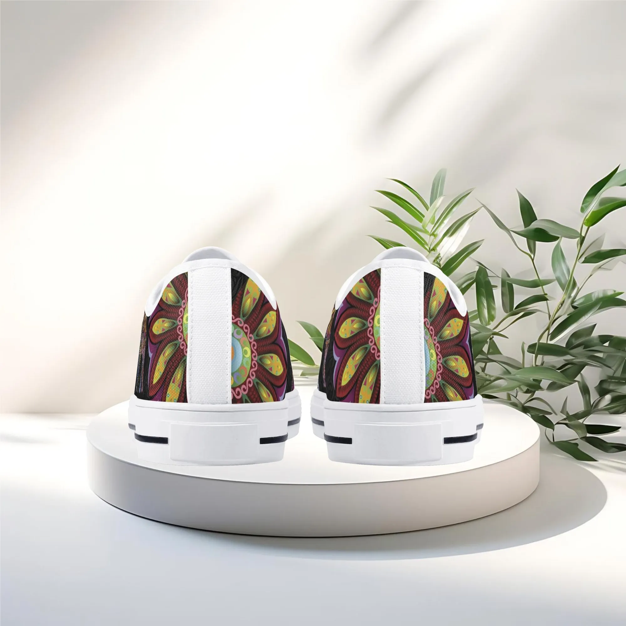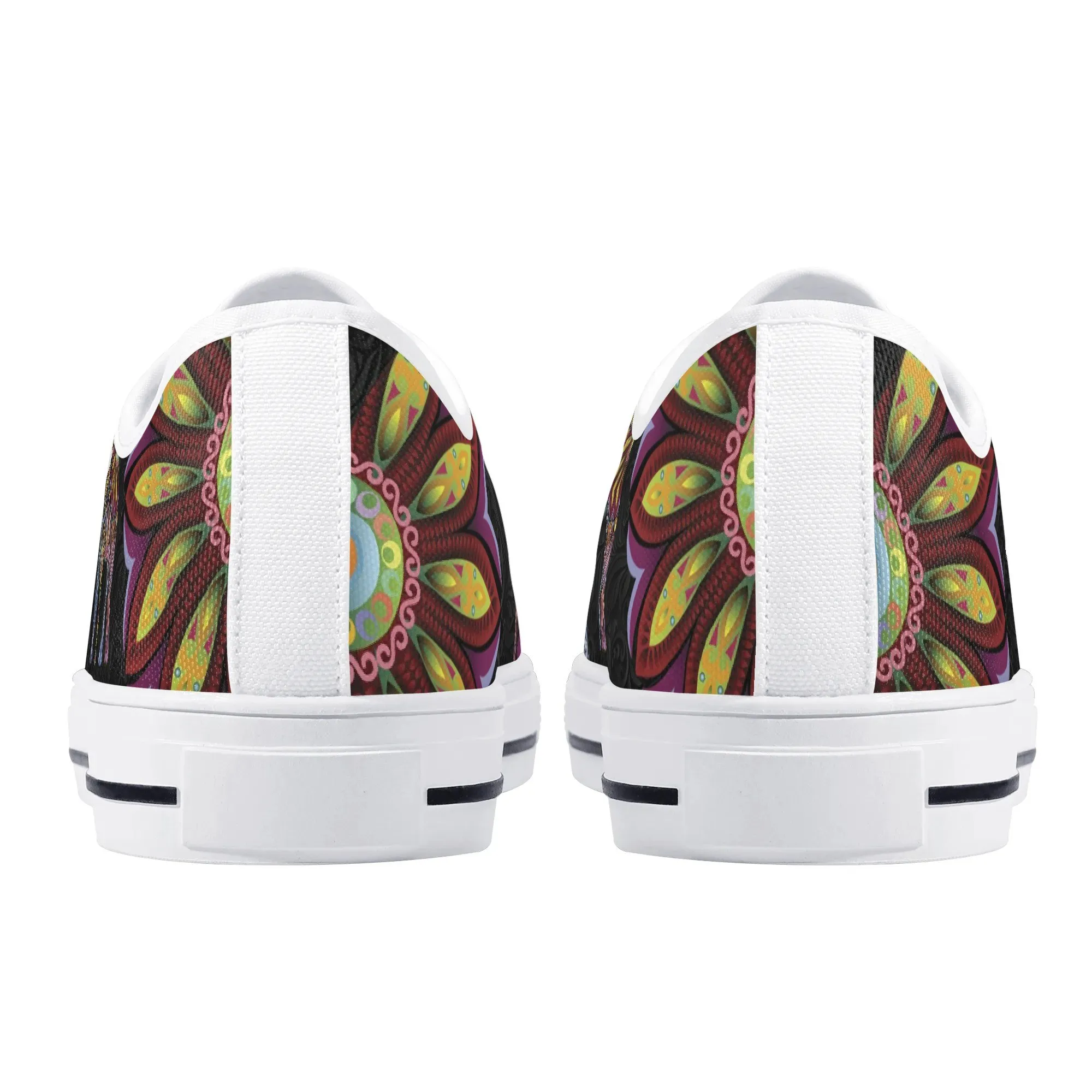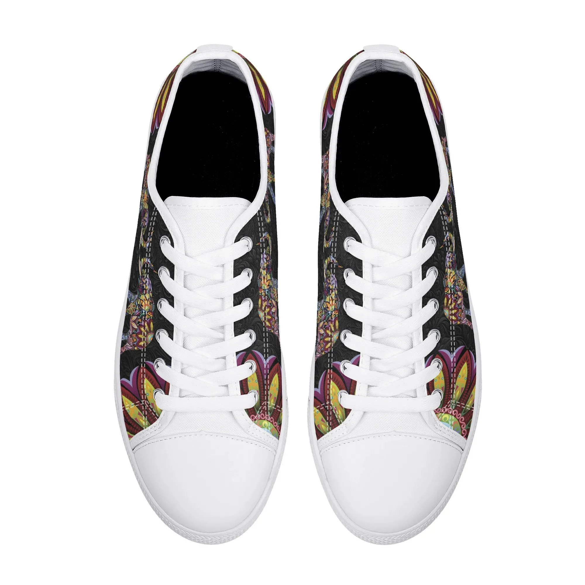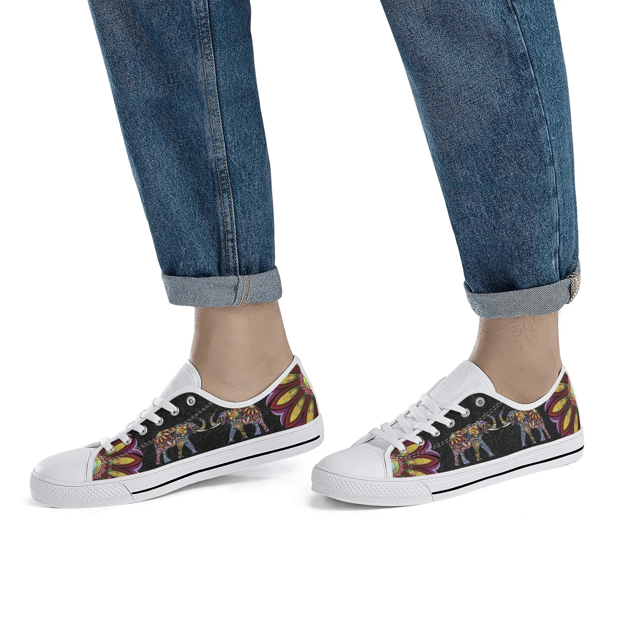 Walk with grace and spiritual style in these vibrant Mandala Elephant Low Top Canvas Shoes! Featuring highly detailed elephant figures intricately decorated with colorful, geometric mandala patterns, these sneakers are set against a dark background with striking floral/mandala accents. They are the perfect accessory for fans of Boho fashion, spiritual symbolism, and Hindu-inspired art. Honor your spirit animal or simply make a unique style statement by customizing these shoes with a name, mantra, or short text!