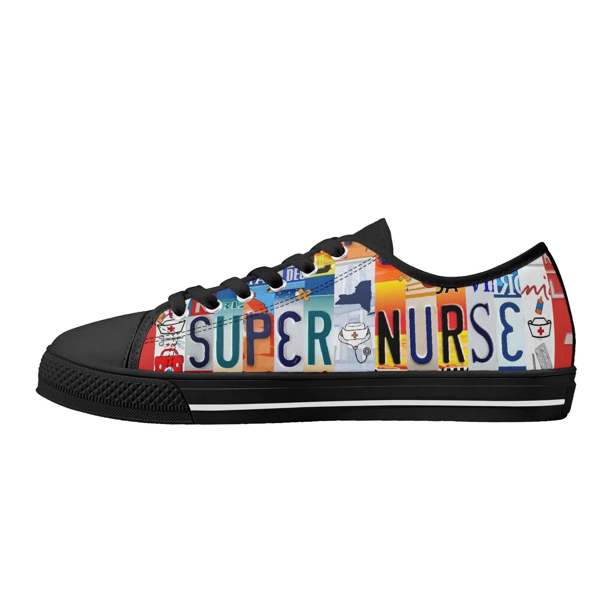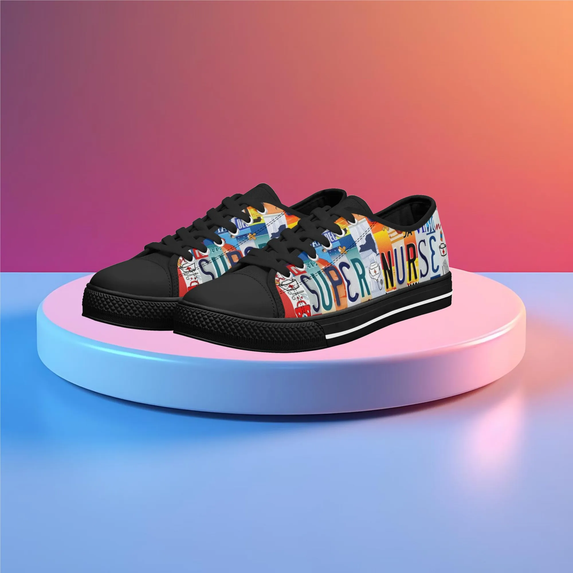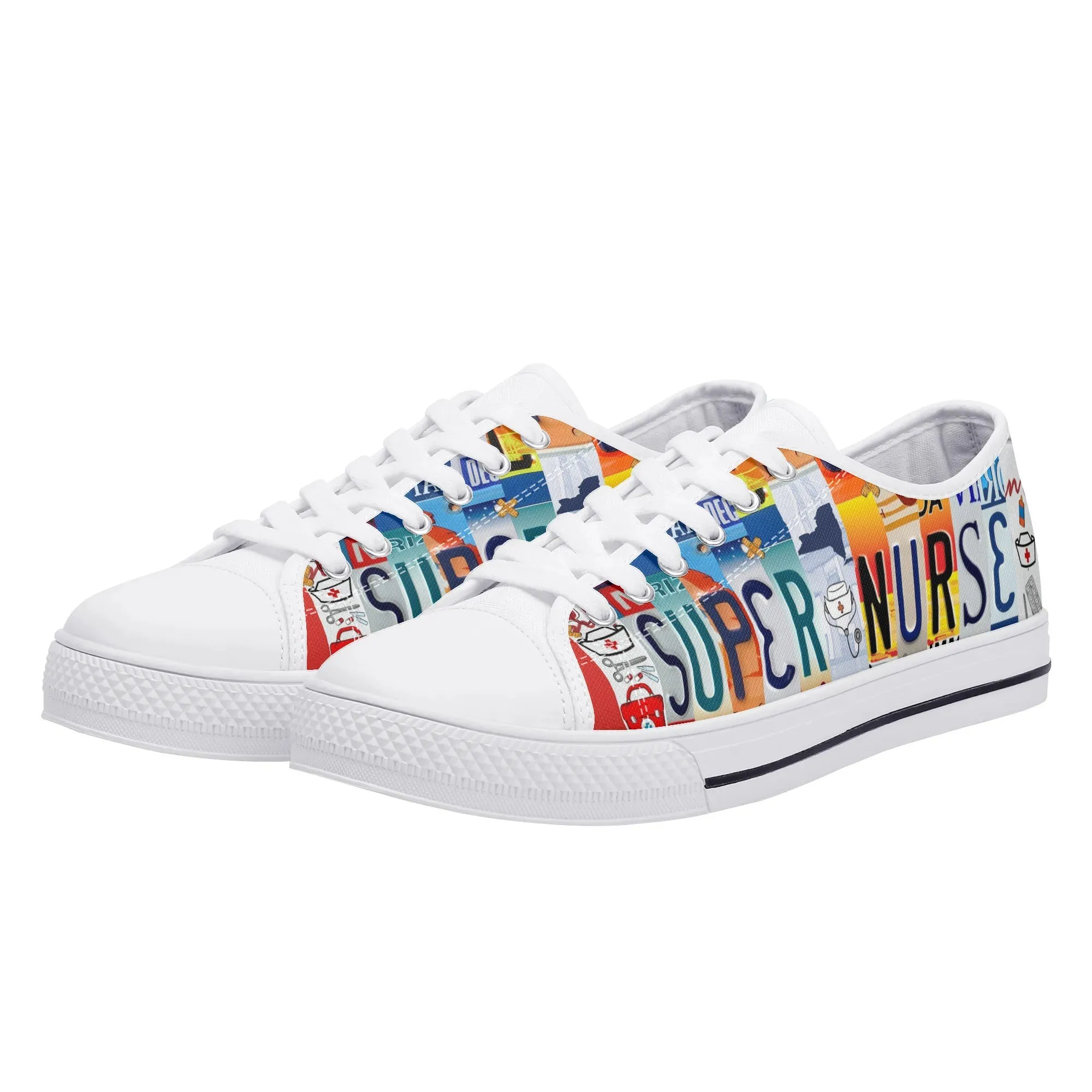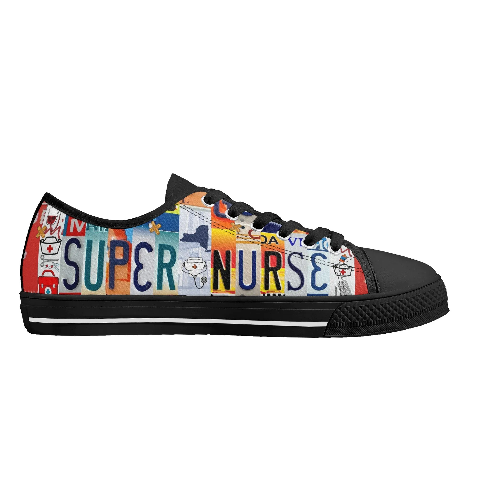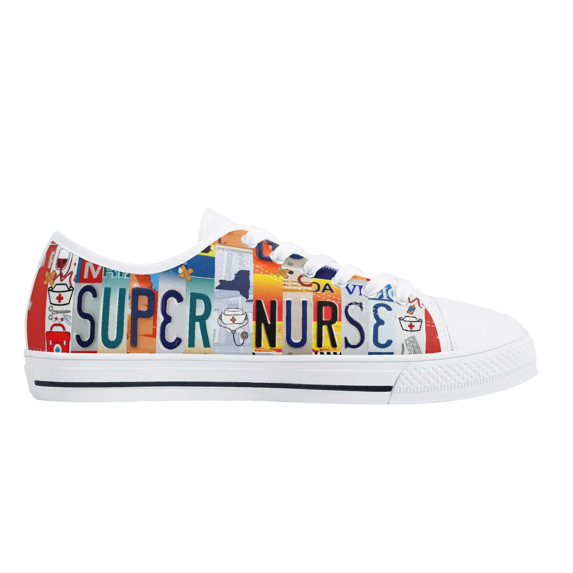 Show off your medical pride with these fantastic “SUPER NURSE” Low Top Canvas Shoes! Featuring a bold, colorful license plate art graphic with symbols of the healthcare profession, these sneakers are the perfect way to honor a dedicated nurse or medical student. Designed for comfortable, long-shift wear, they make an unforgettable and highly appreciated gift for Nursing School Graduation, Nurse’s Week, or any occasion celebrating a healthcare hero.