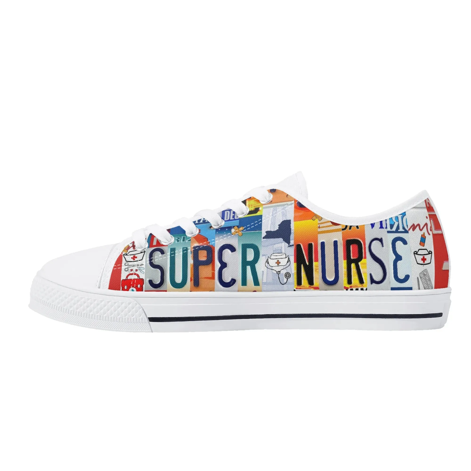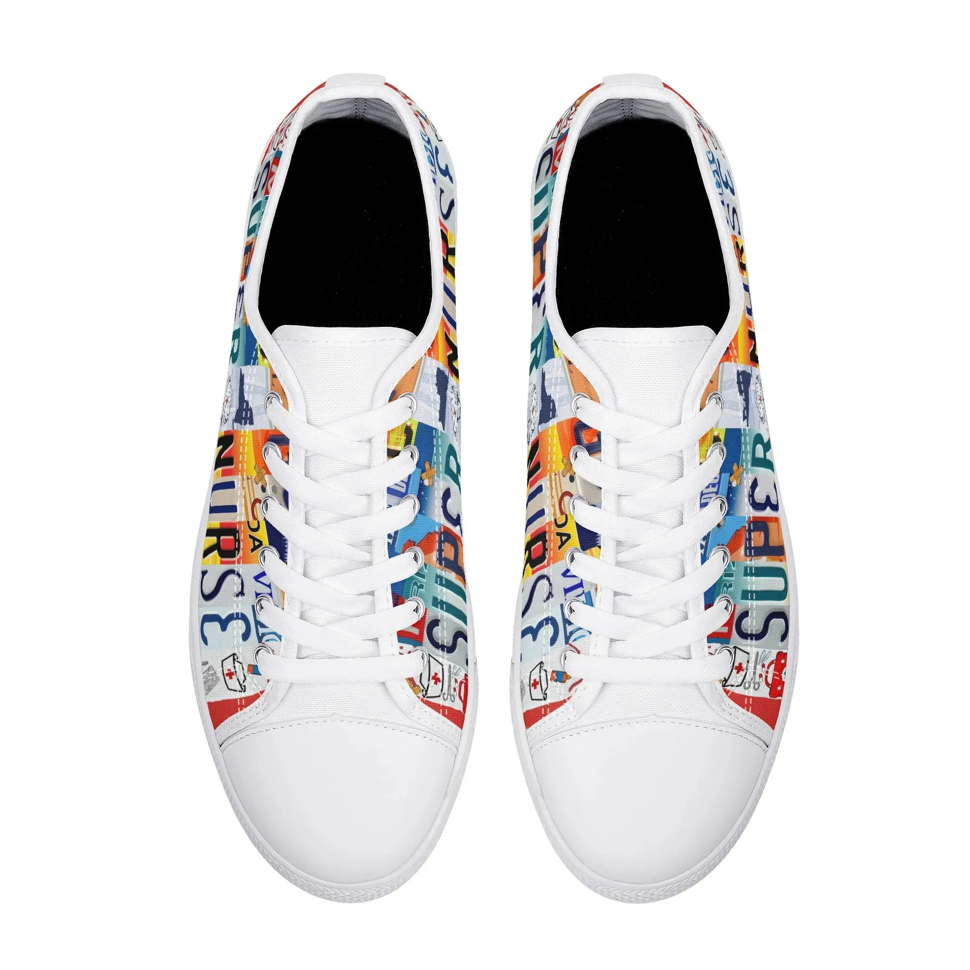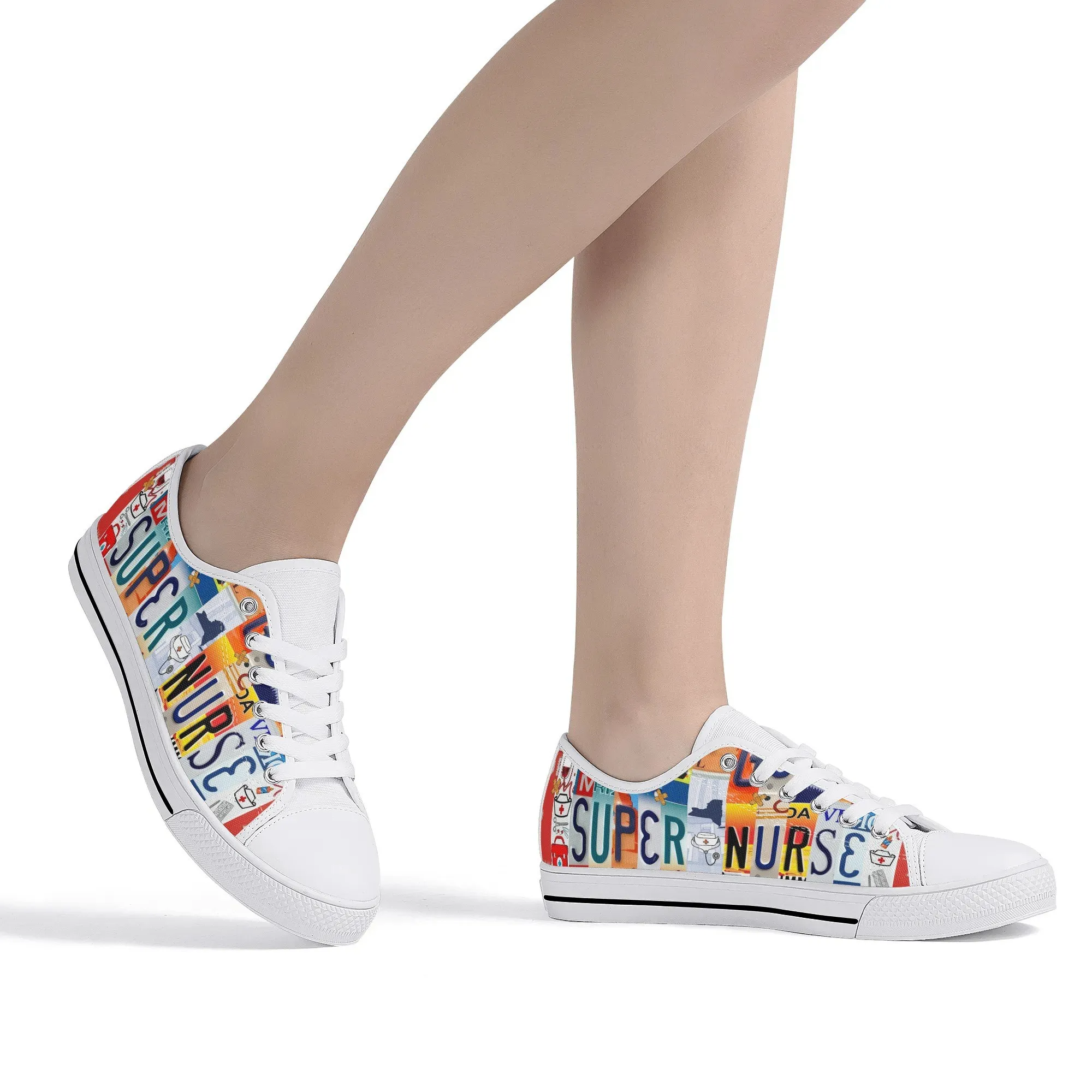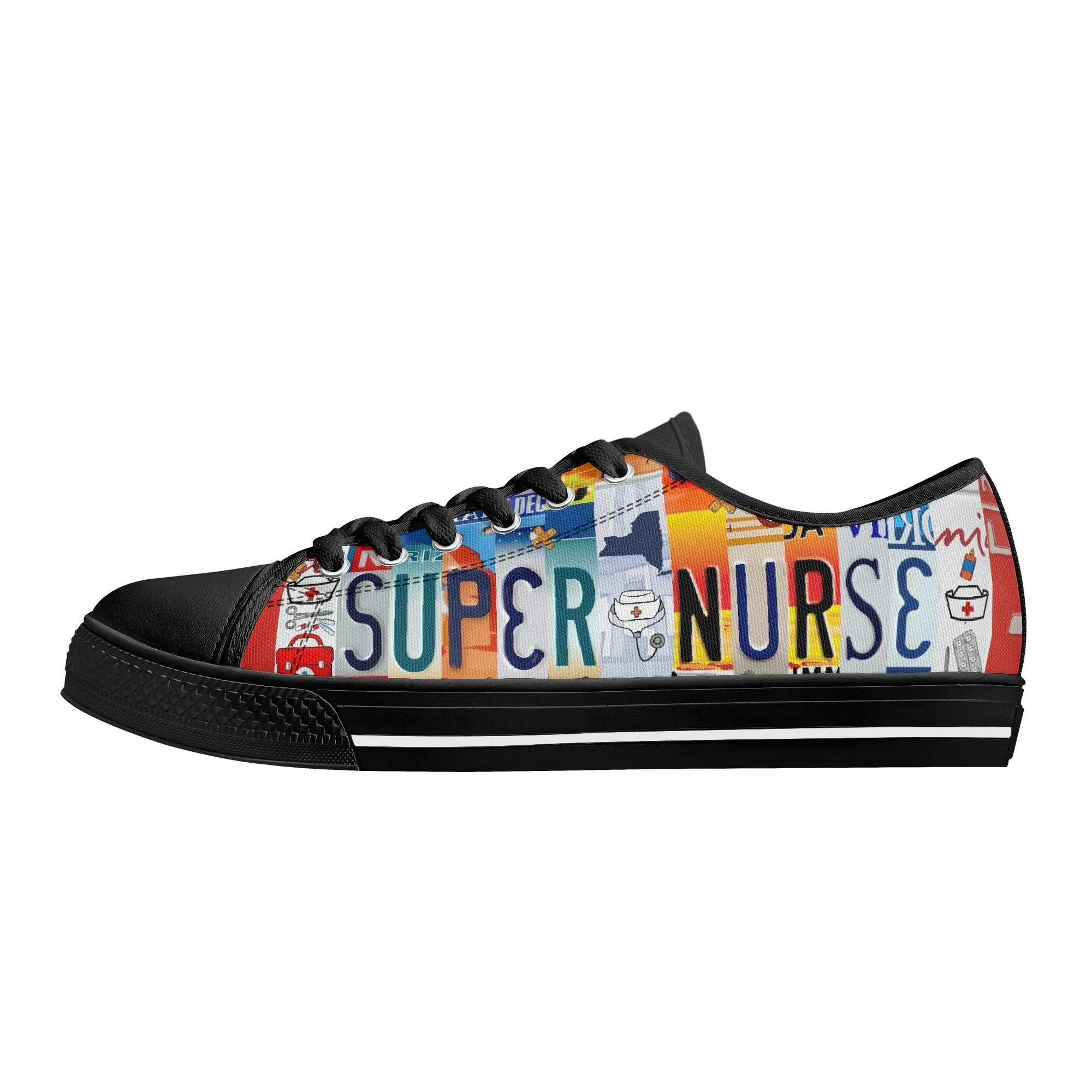 Show off your medical pride with these fantastic “SUPER NURSE” Low Top Canvas Shoes! Featuring a bold, colorful license plate art graphic with symbols of the healthcare profession, these sneakers are the perfect way to honor a dedicated nurse or medical student. Designed for comfortable, long-shift wear, they make an unforgettable and highly appreciated gift for Nursing School Graduation, Nurse’s Week, or any occasion celebrating a healthcare hero.