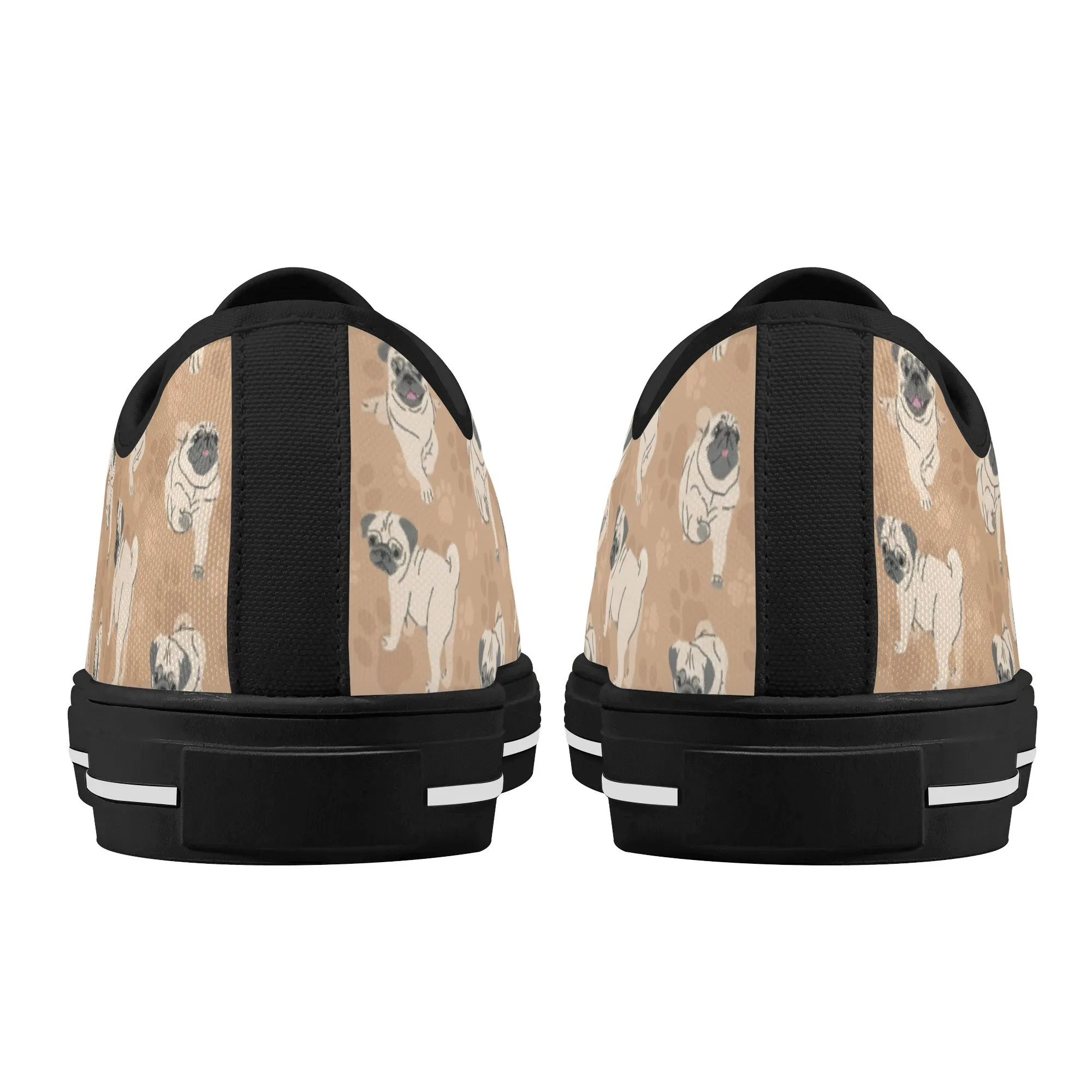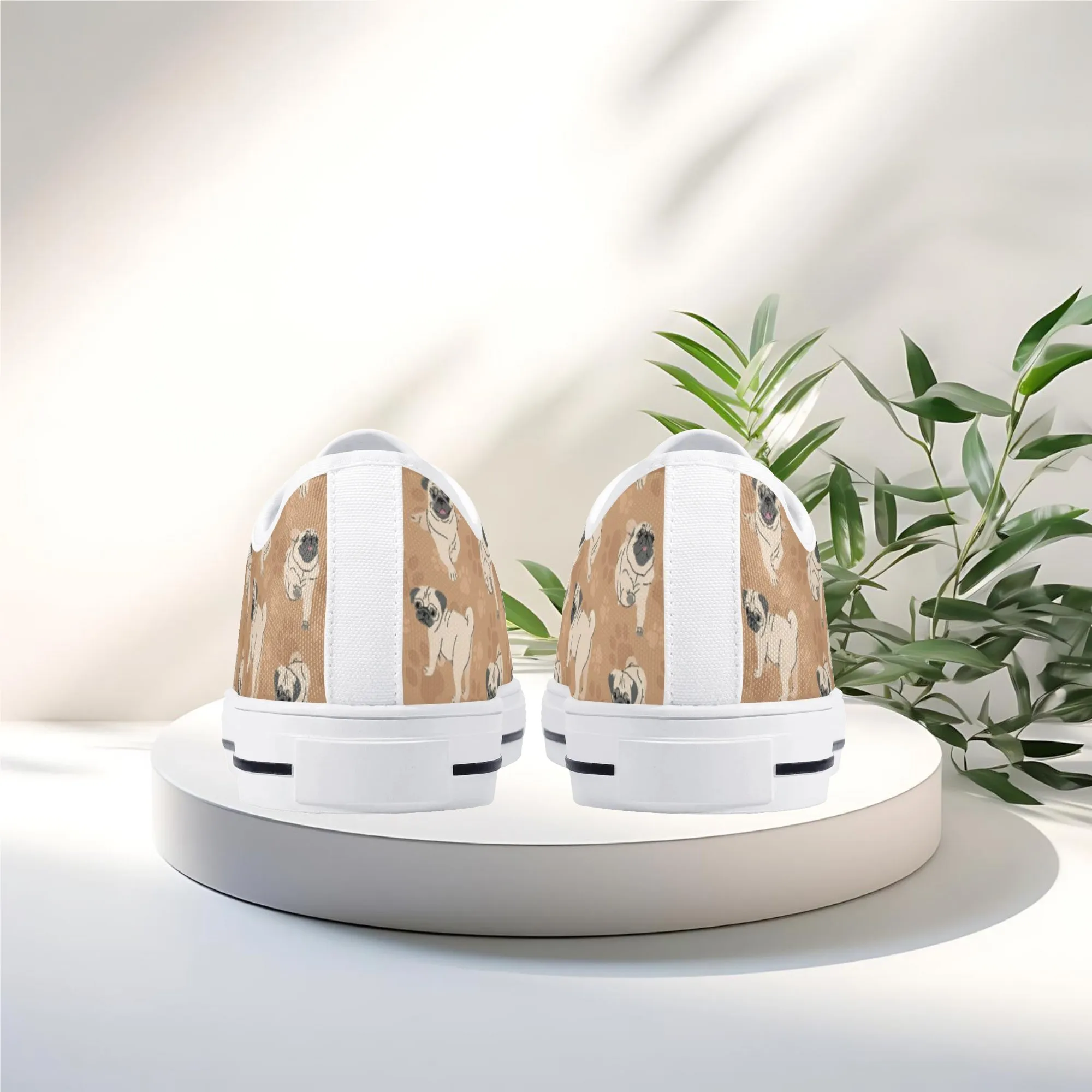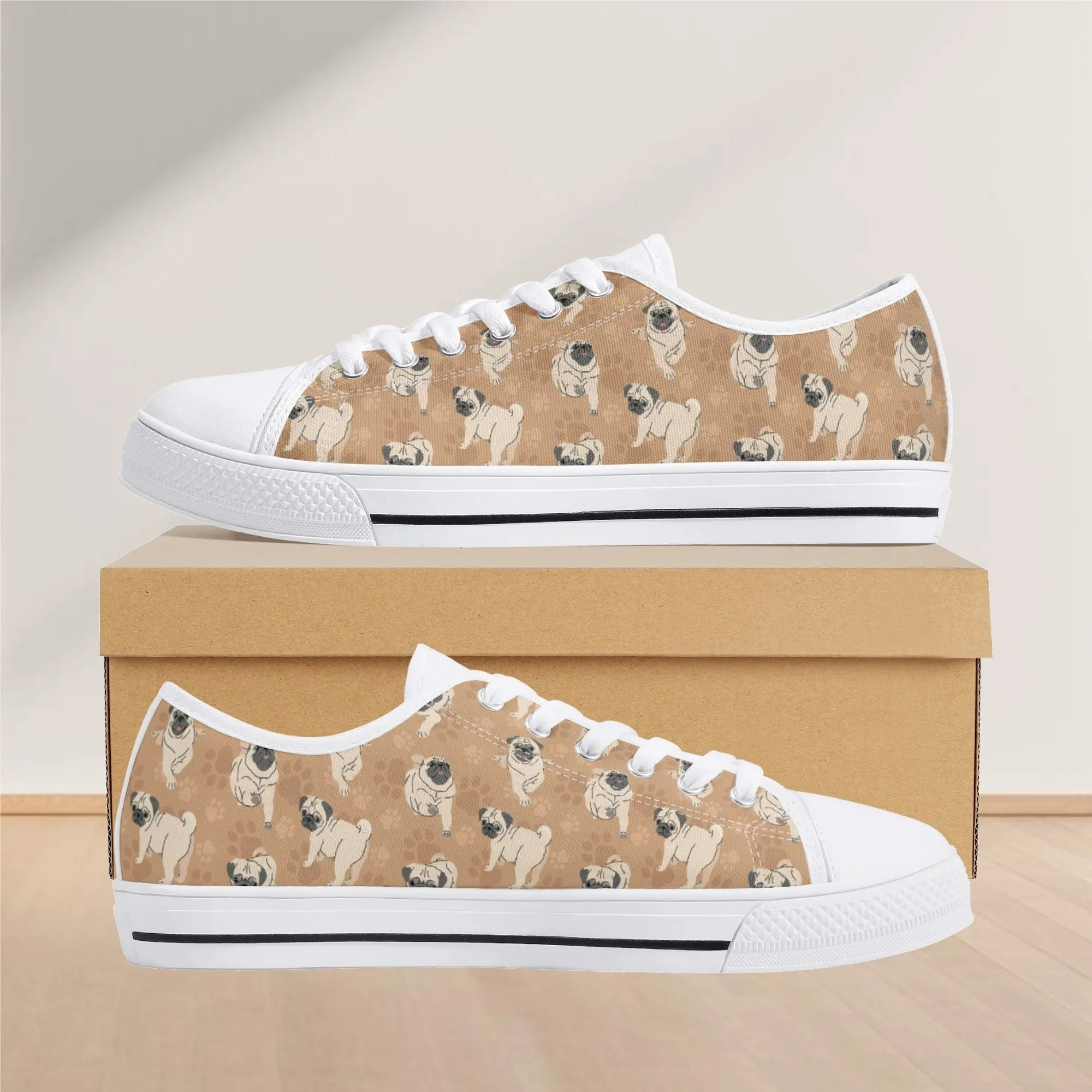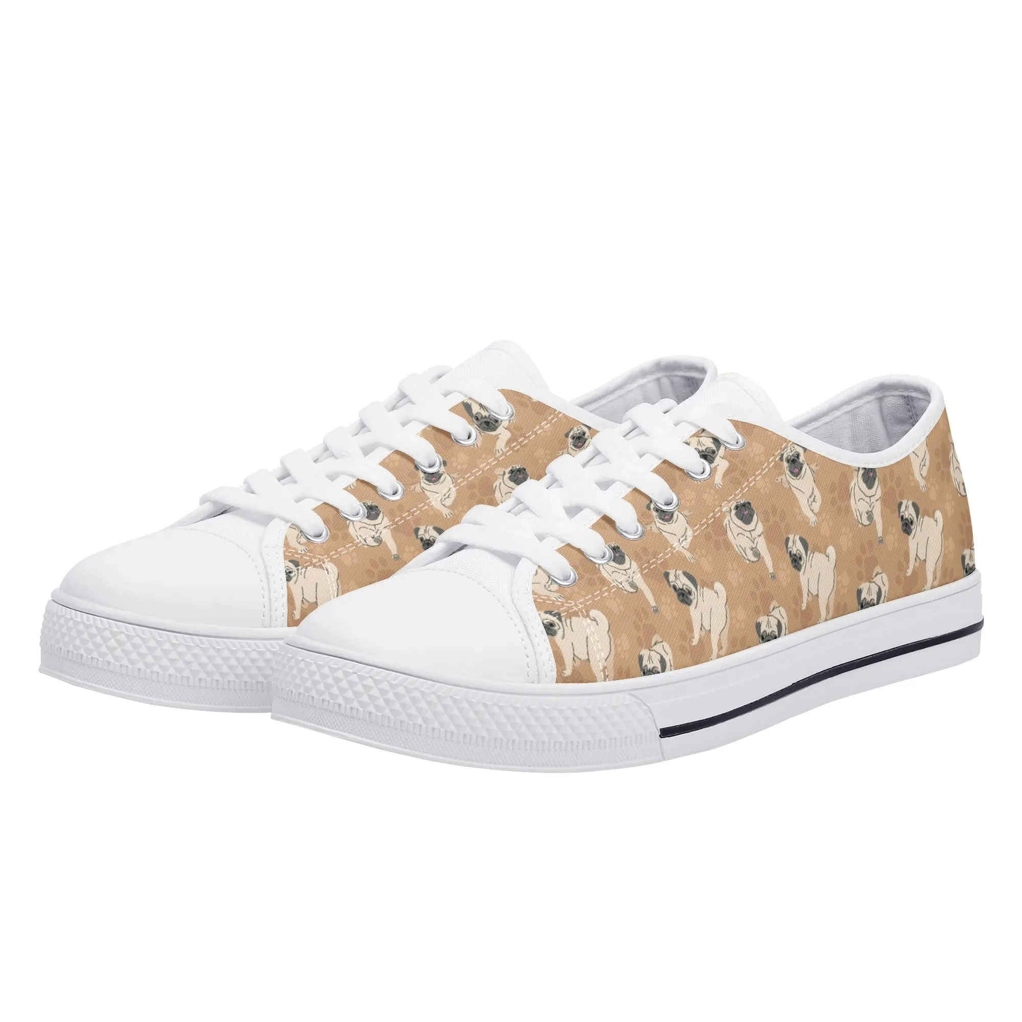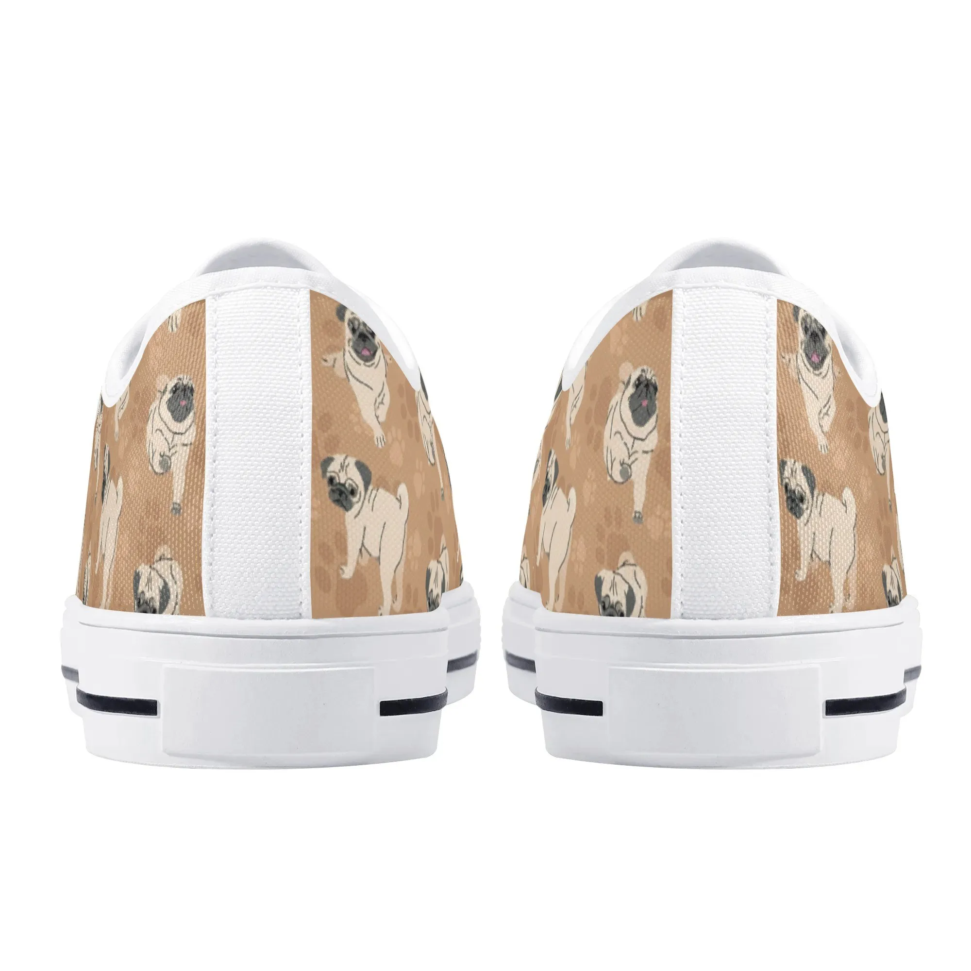 🐕 Step out with the adorable Fawn Pug on your feet with these delightful low-top canvas shoes featuring an all-over pattern of the expressive Pug breed set against a warm tan/beige background. This design is a fun and stylish way for Pug owners, small dog enthusiasts, and anyone who loves this famously charming breed to express their passion. These unisex sneakers are built for all-day comfort and lasting wear, making them the perfect casual footwear for daily wear and dog-related events.