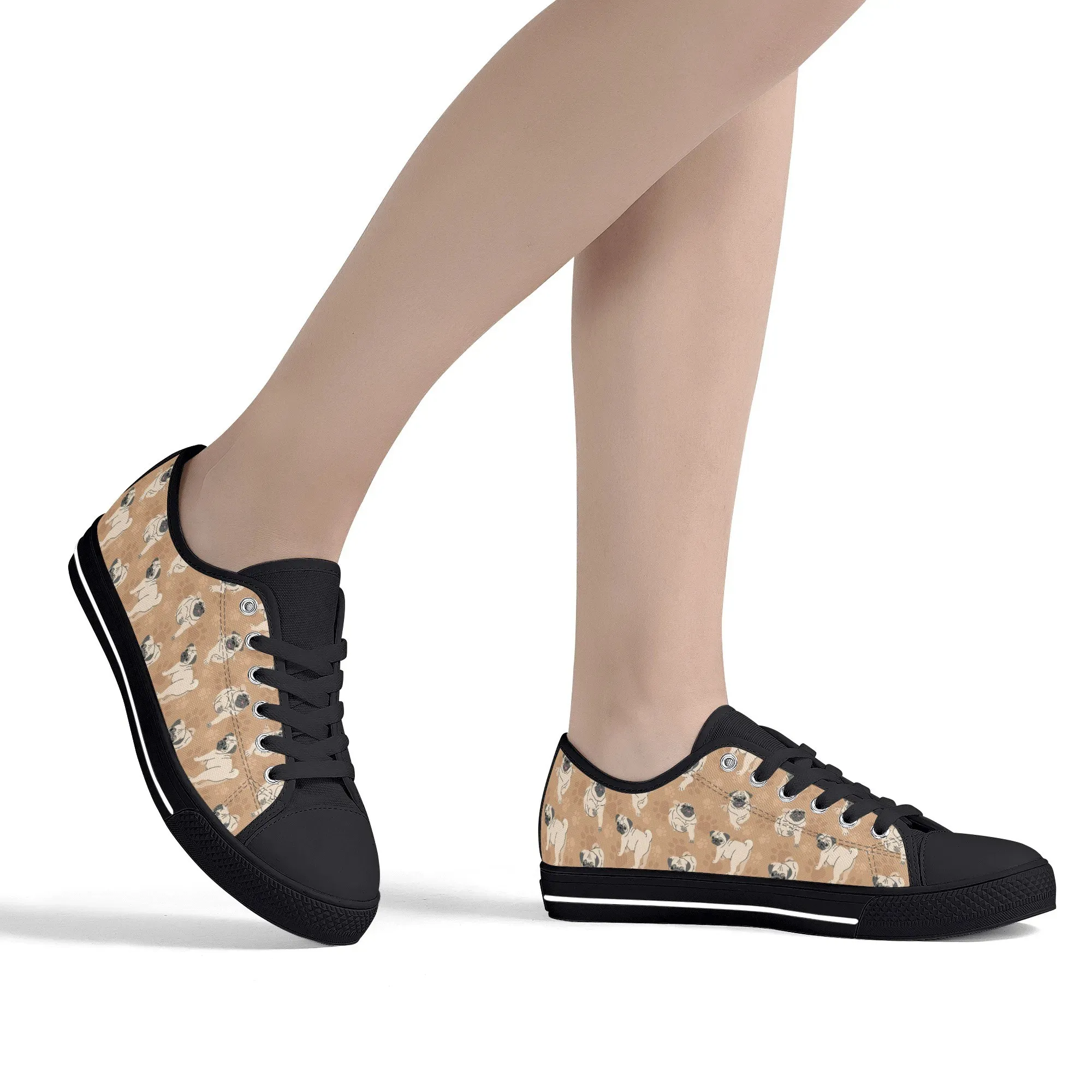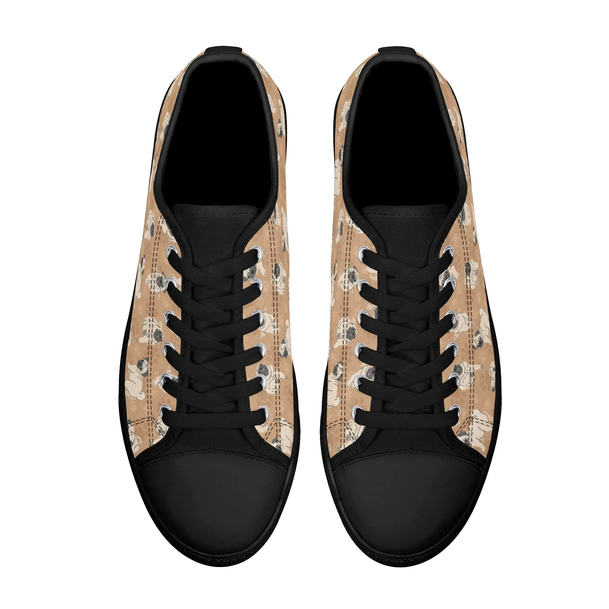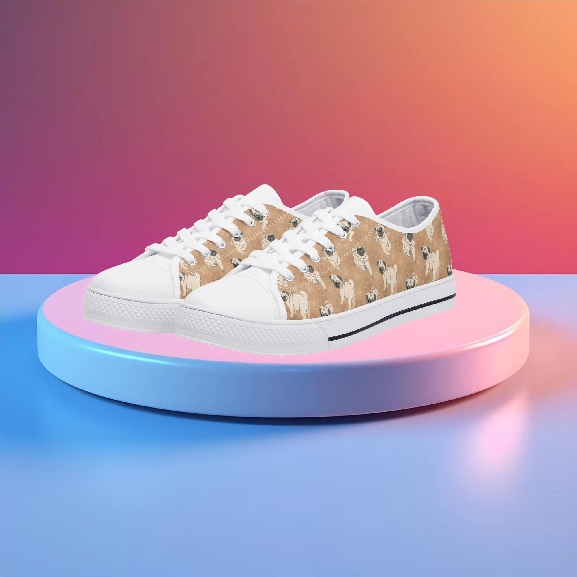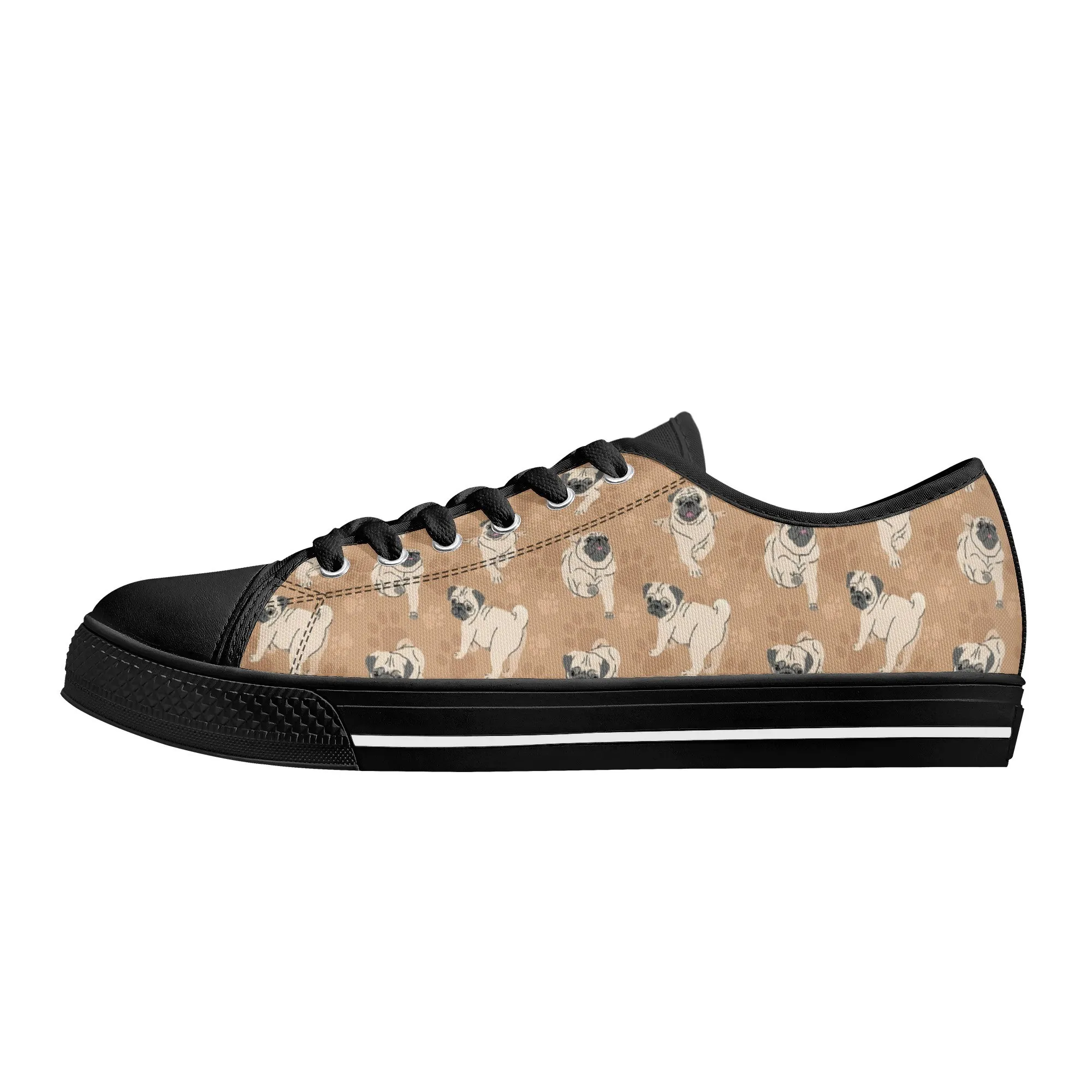 🐕 Step out with the adorable Fawn Pug on your feet with these delightful low-top canvas shoes featuring an all-over pattern of the expressive Pug breed set against a warm tan/beige background. This design is a fun and stylish way for Pug owners, small dog enthusiasts, and anyone who loves this famously charming breed to express their passion. These unisex sneakers are built for all-day comfort and lasting wear, making them the perfect casual footwear for daily wear and dog-related events.