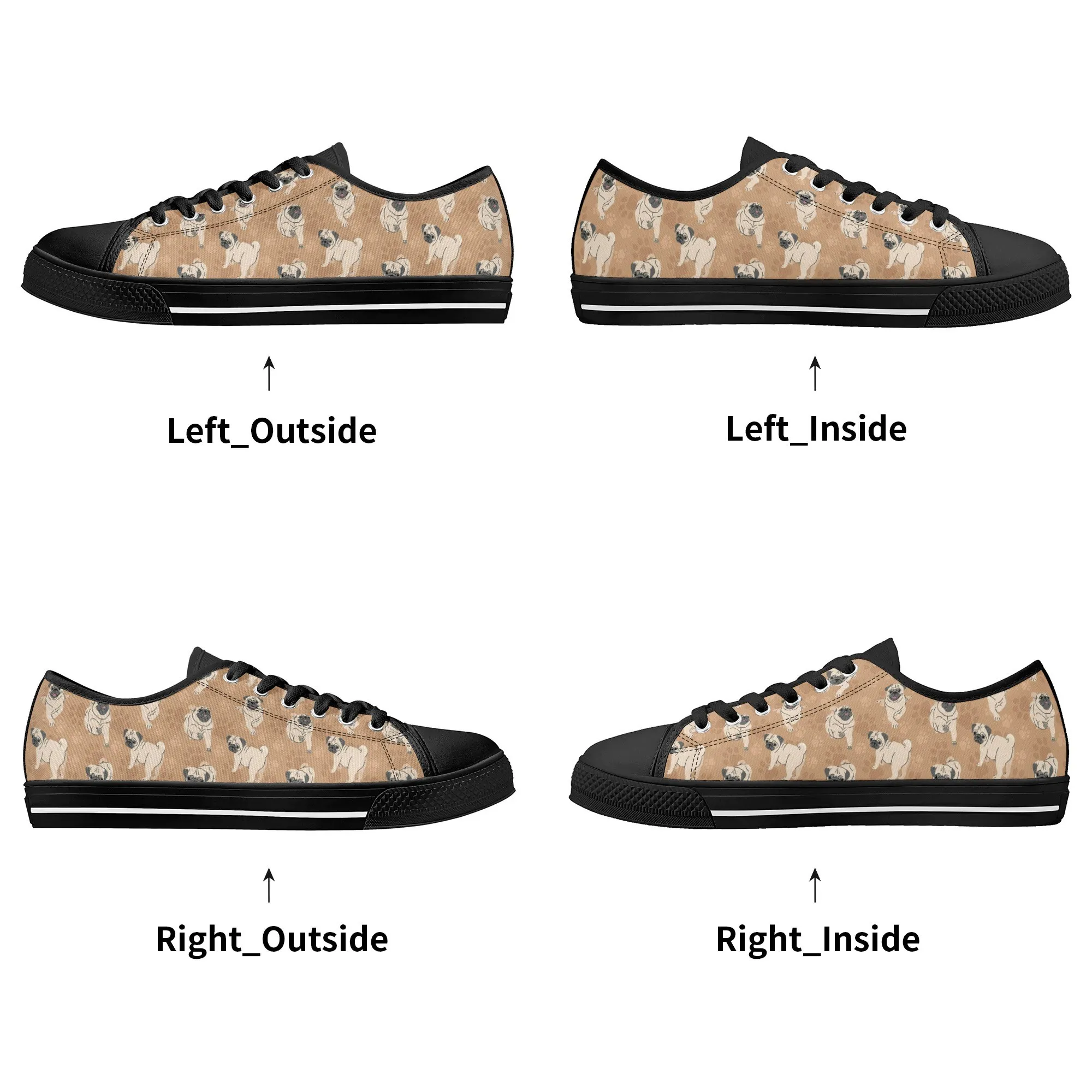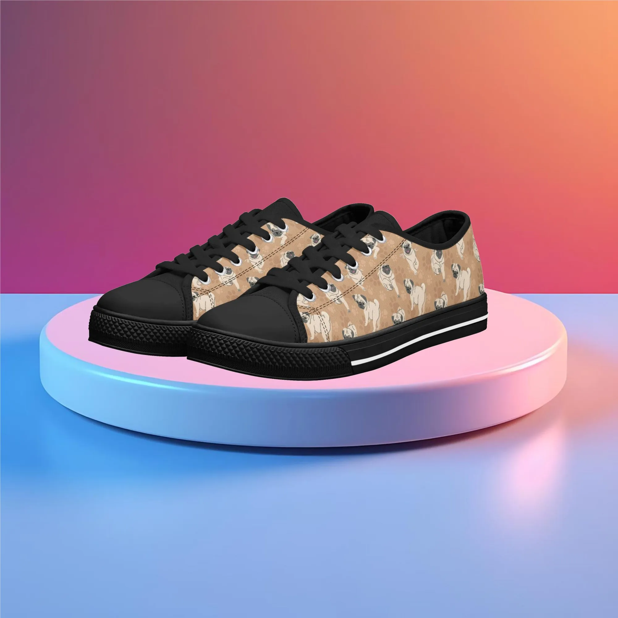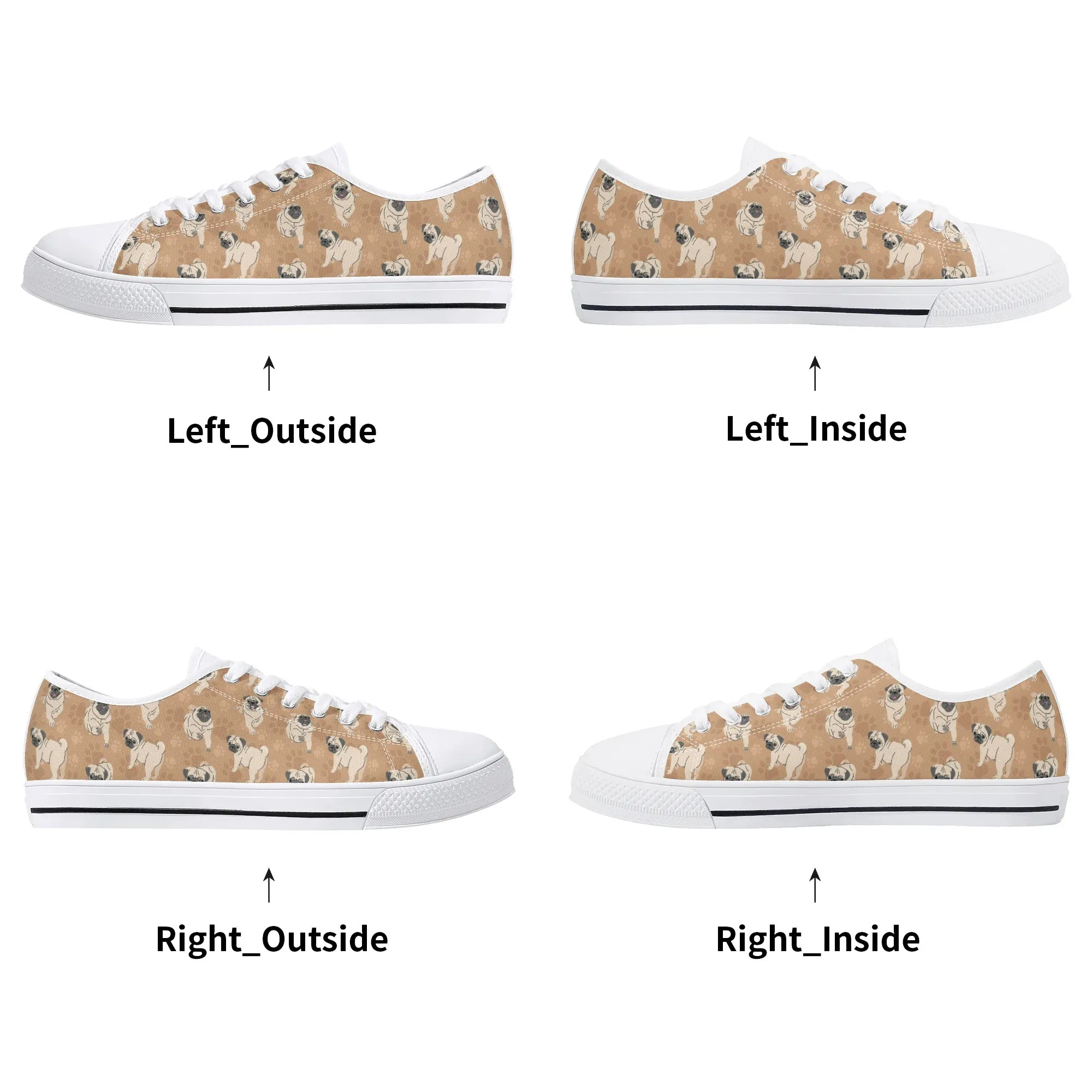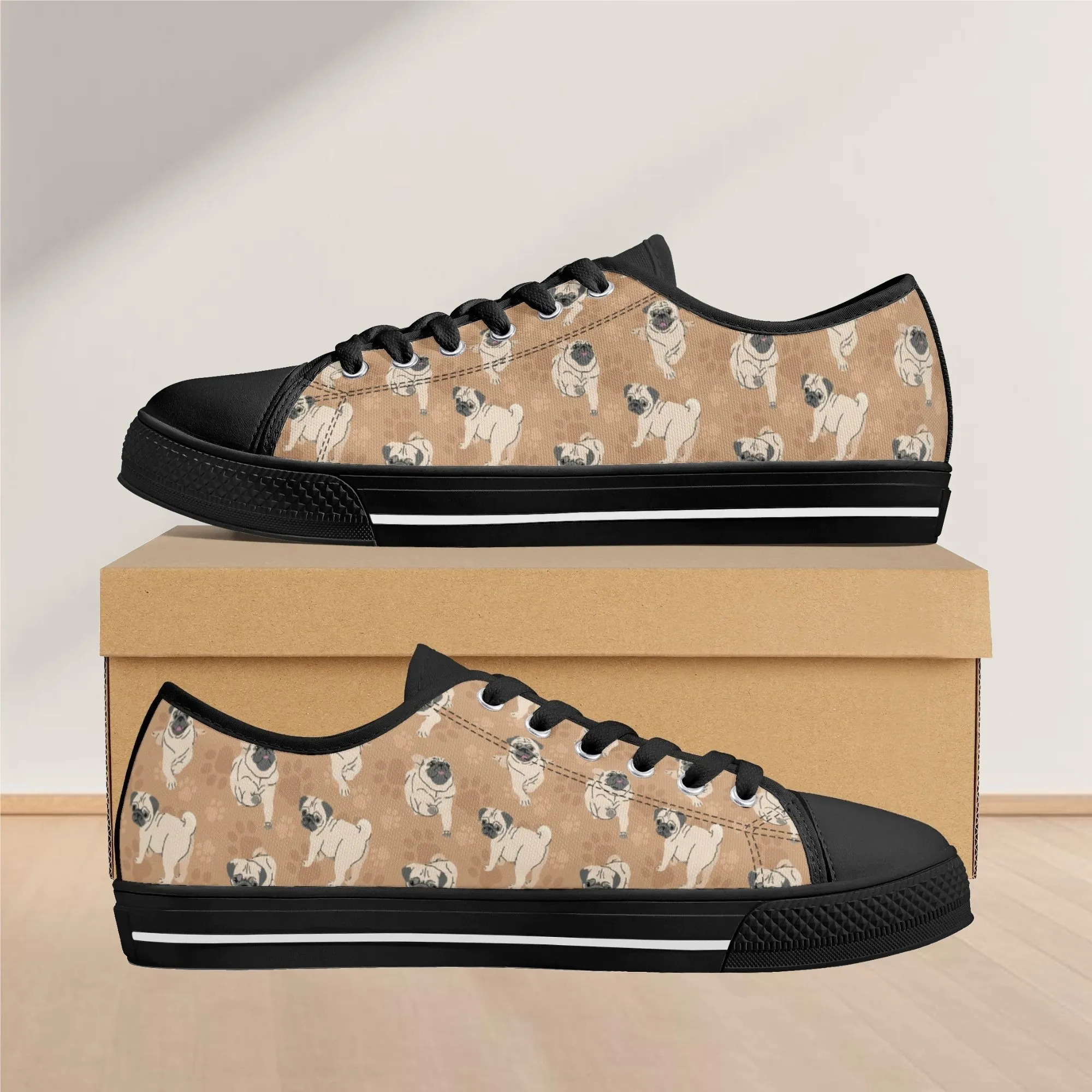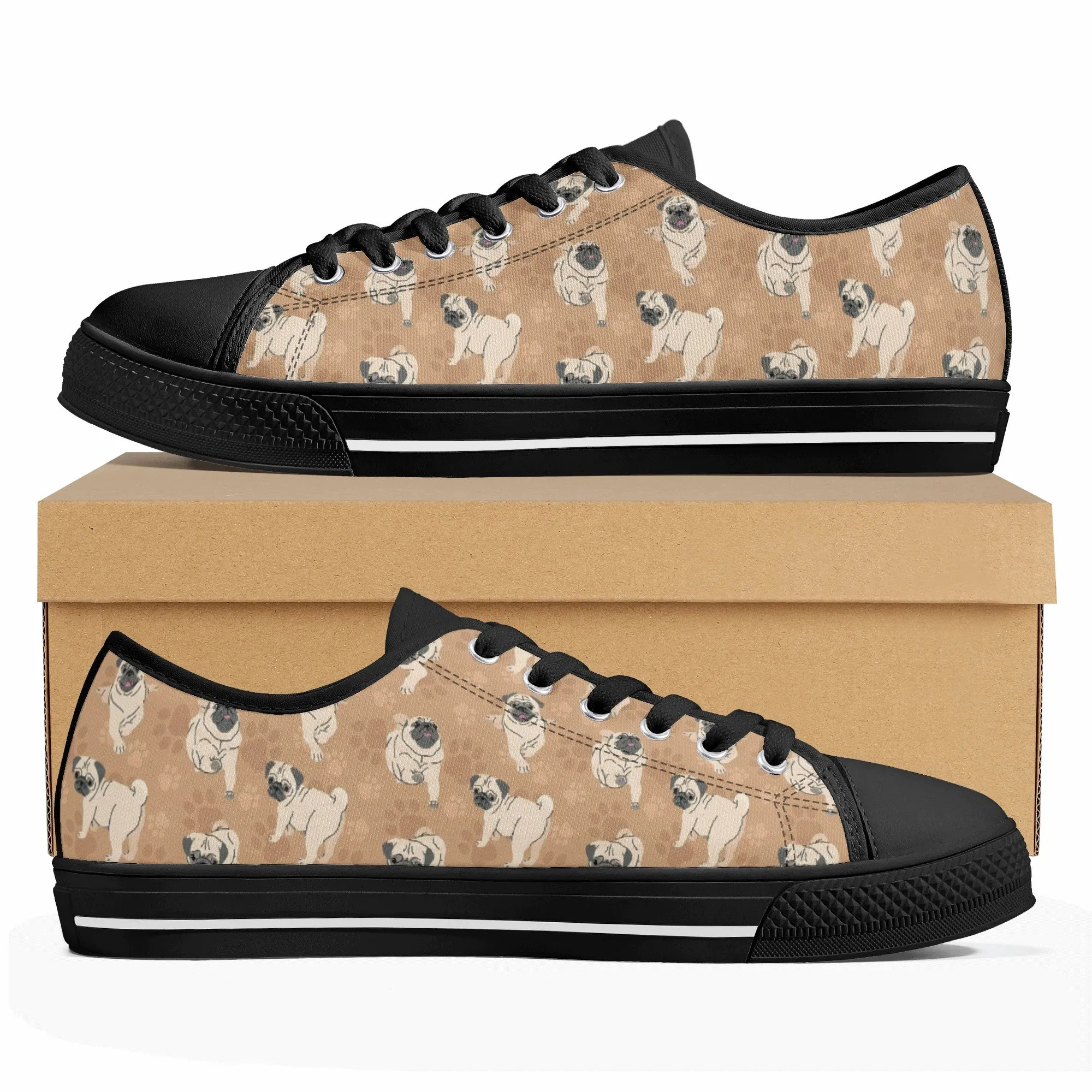 🐕 Step out with the adorable Fawn Pug on your feet with these delightful low-top canvas shoes featuring an all-over pattern of the expressive Pug breed set against a warm tan/beige background. This design is a fun and stylish way for Pug owners, small dog enthusiasts, and anyone who loves this famously charming breed to express their passion. These unisex sneakers are built for all-day comfort and lasting wear, making them the perfect casual footwear for daily wear and dog-related events.
