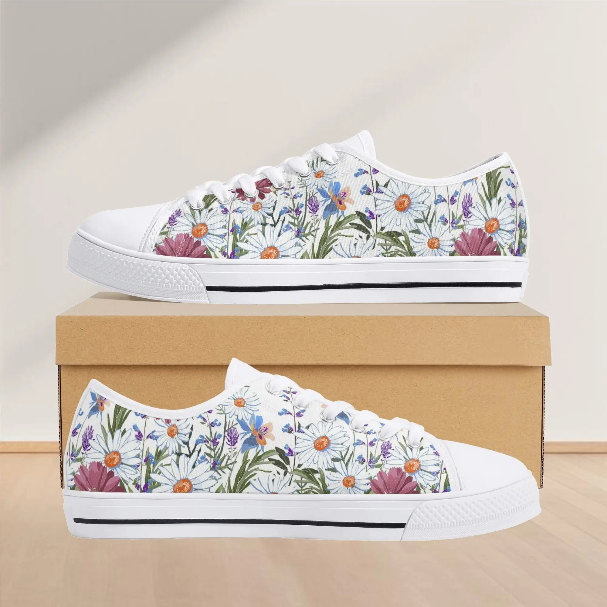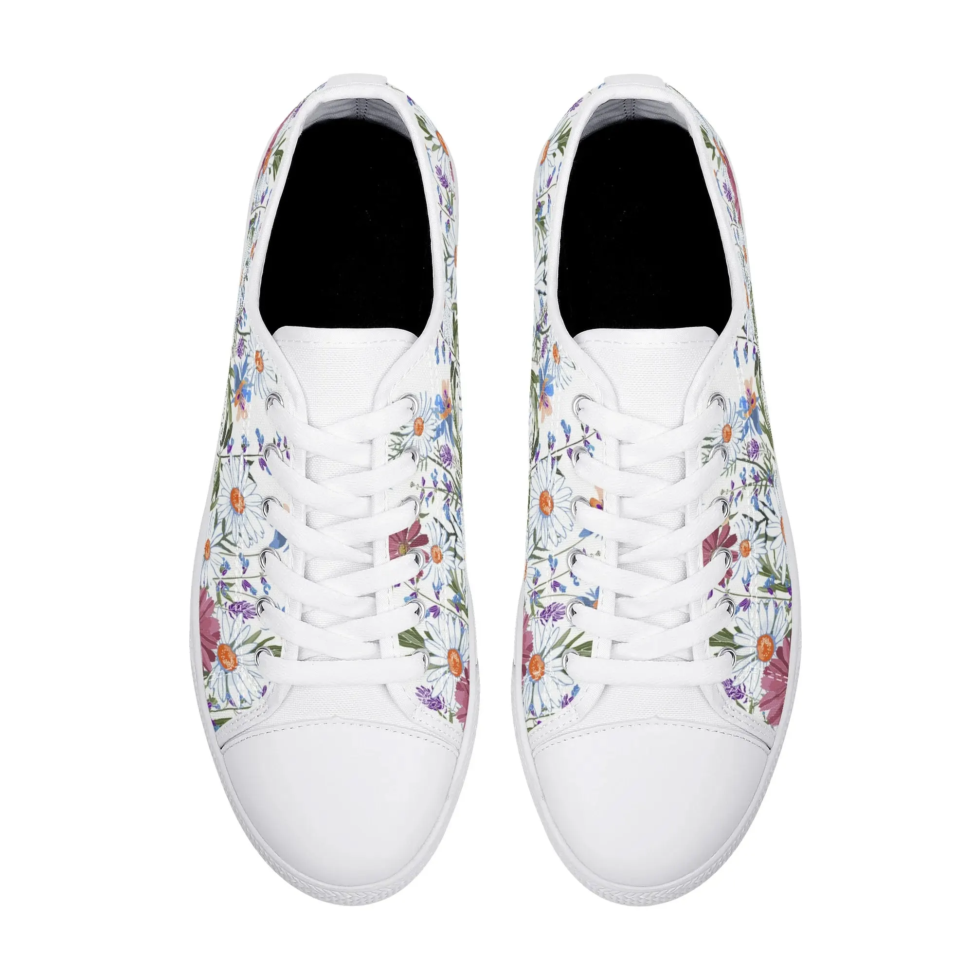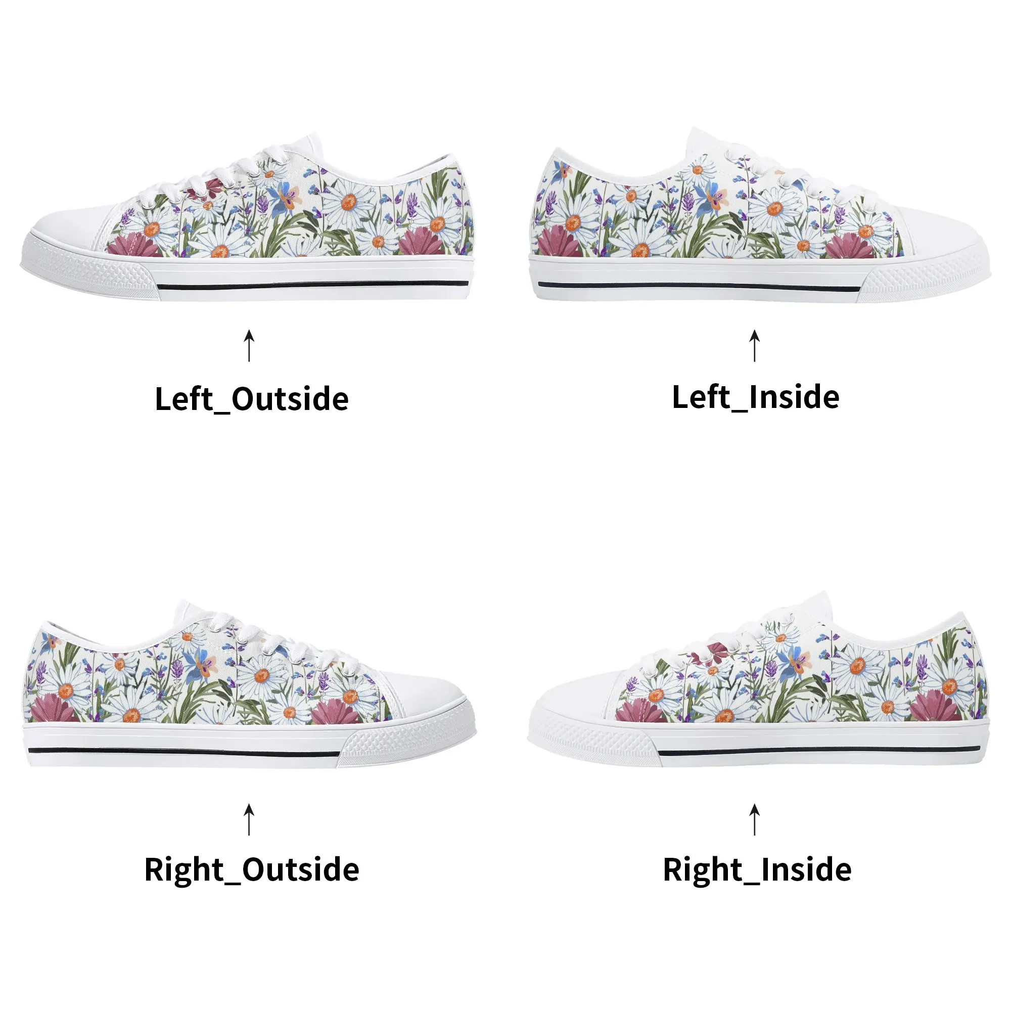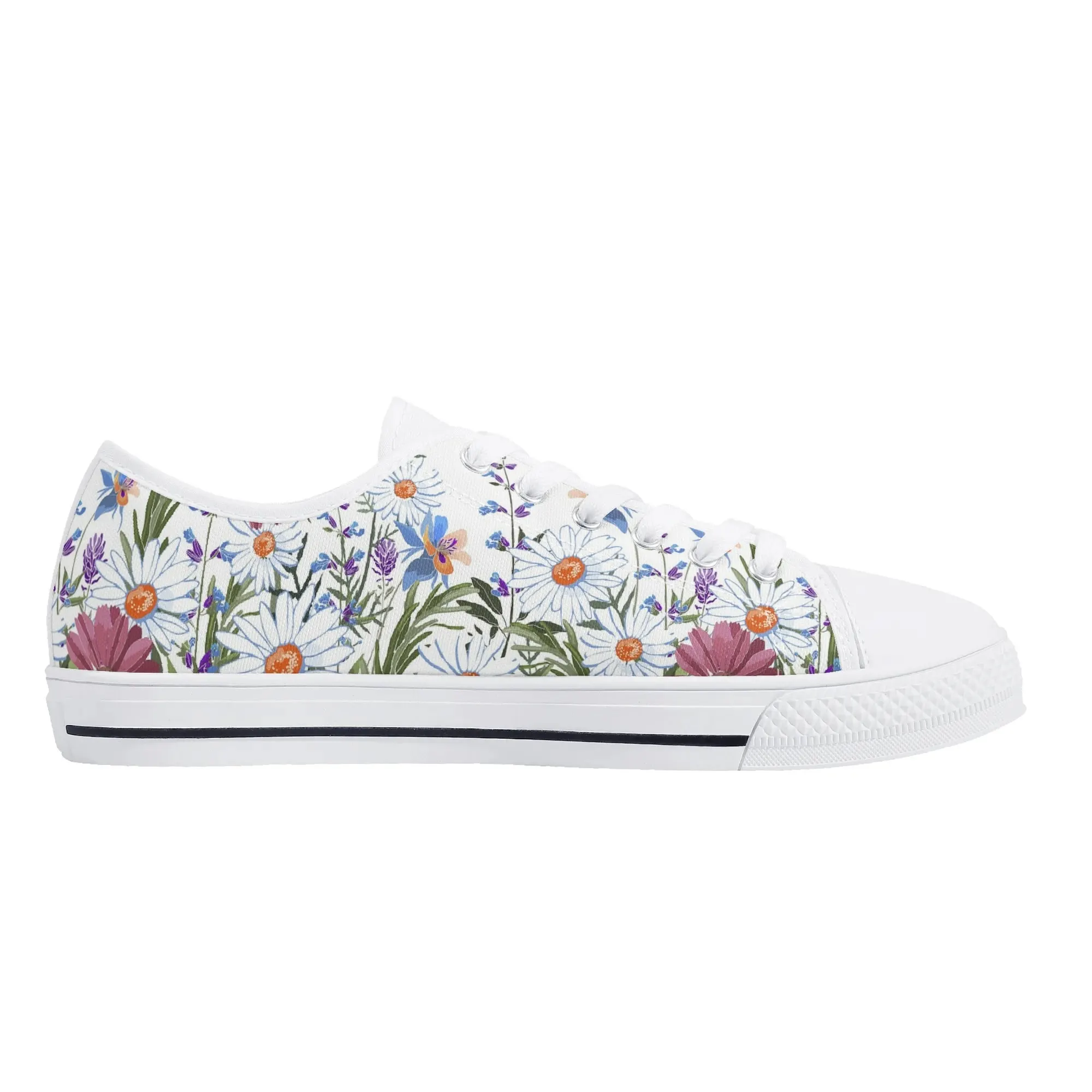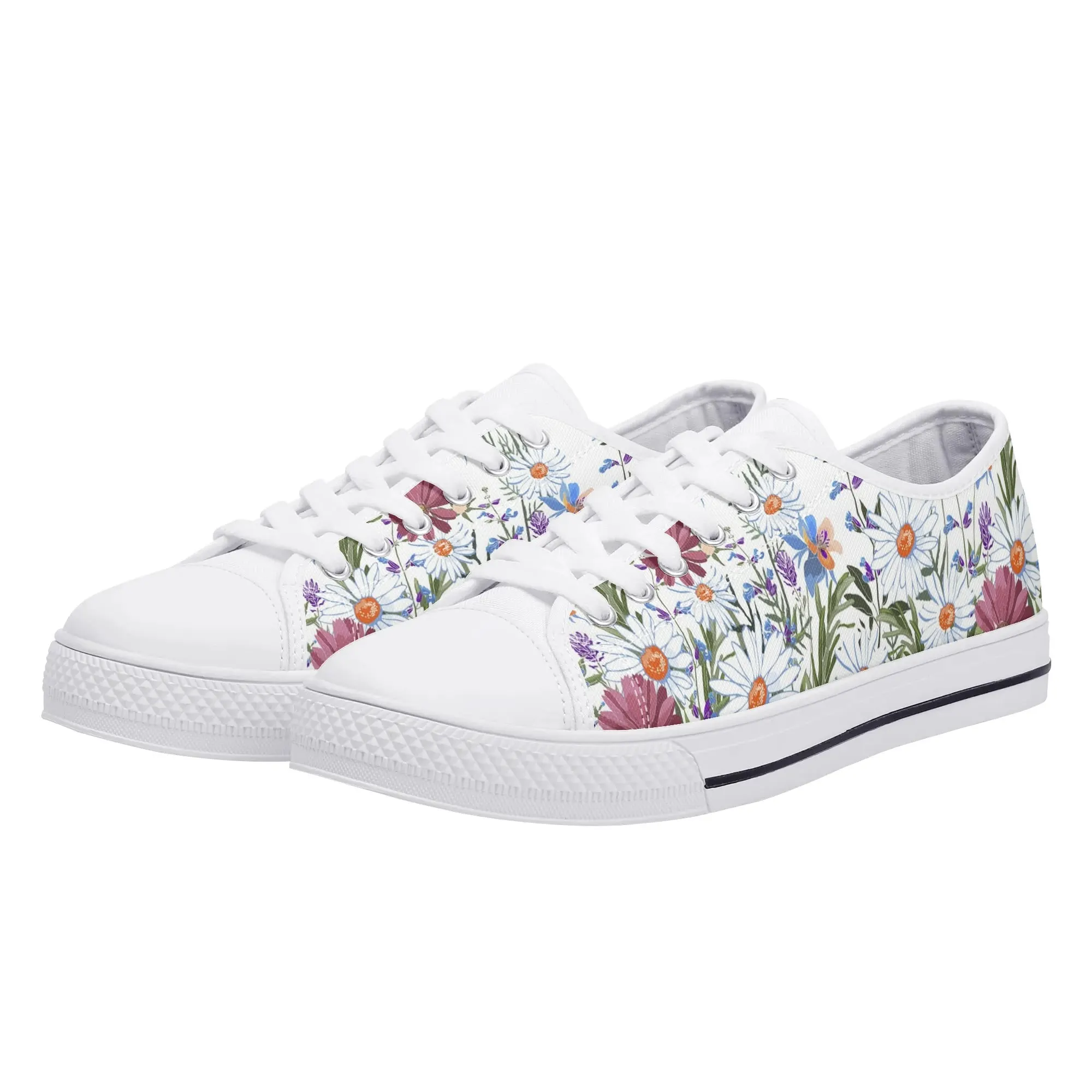 Wildflower Daisy Low Top Canvas Shoes, Cottagecore Garden Aesthetic Sneakers, White Floral Print Shoe, Spring Summer Footwear Gift